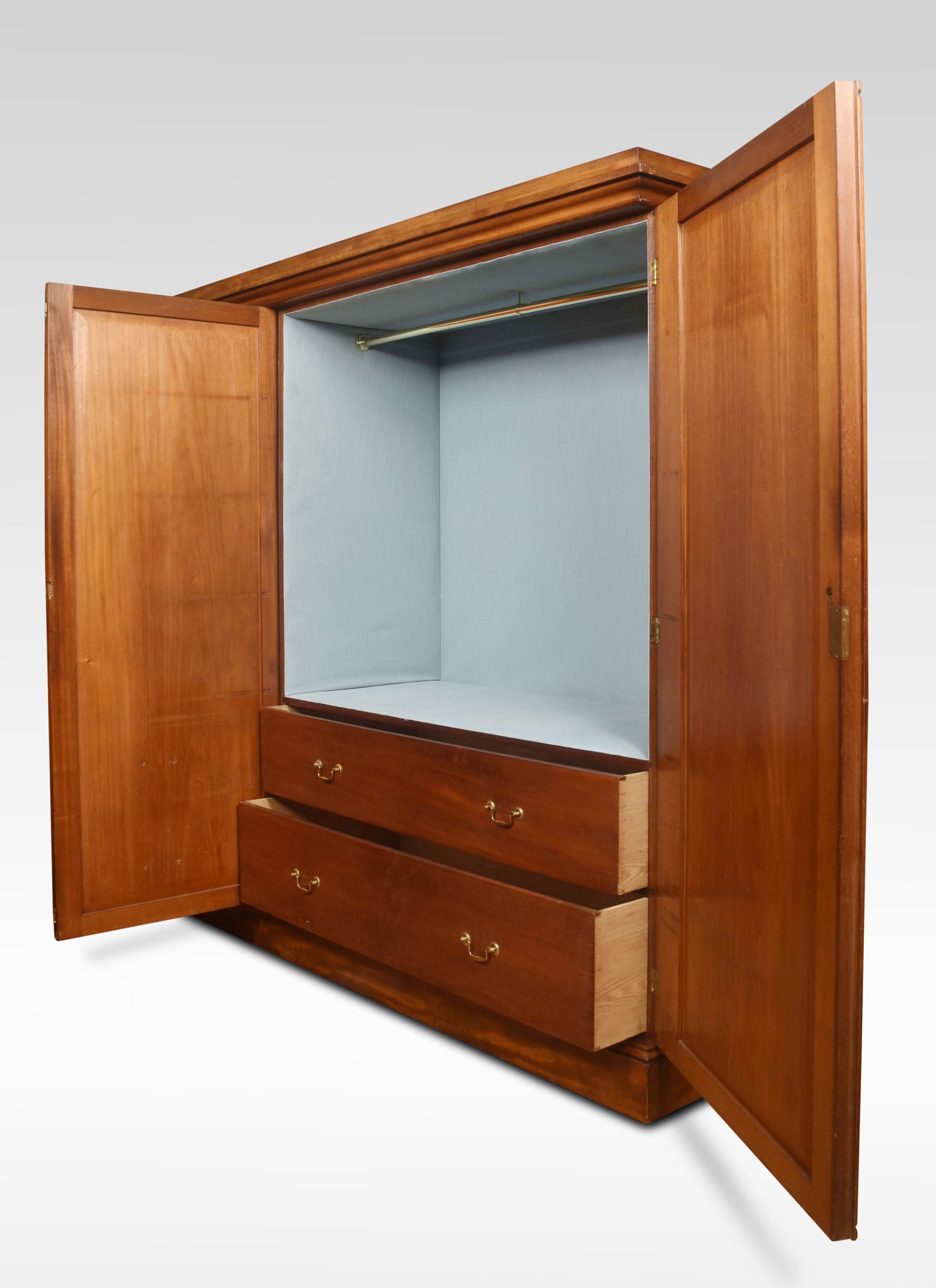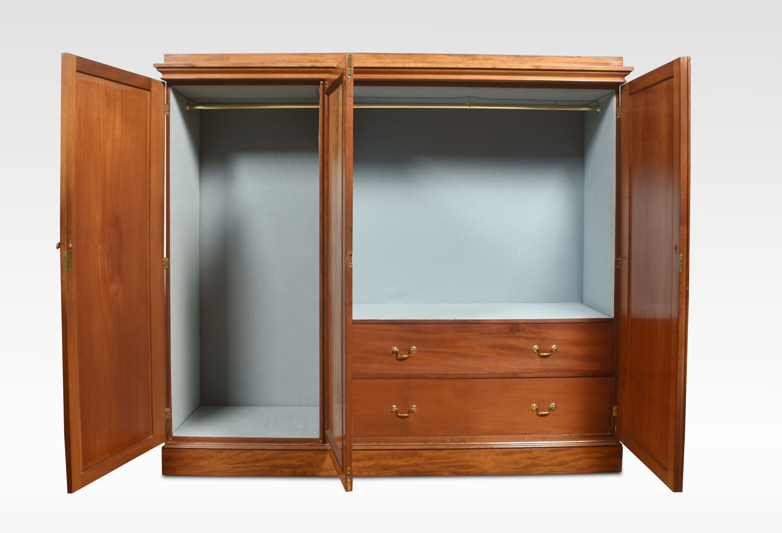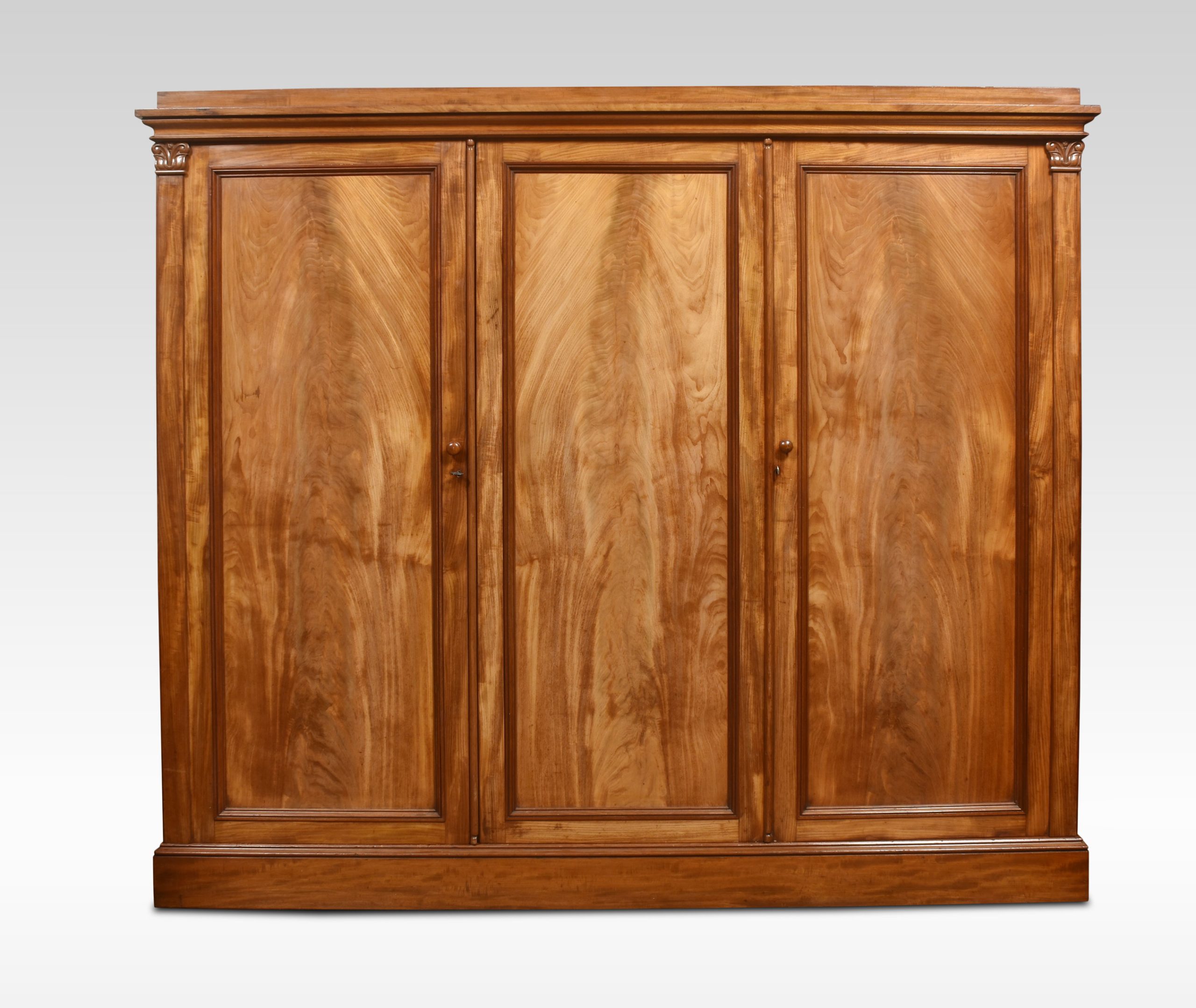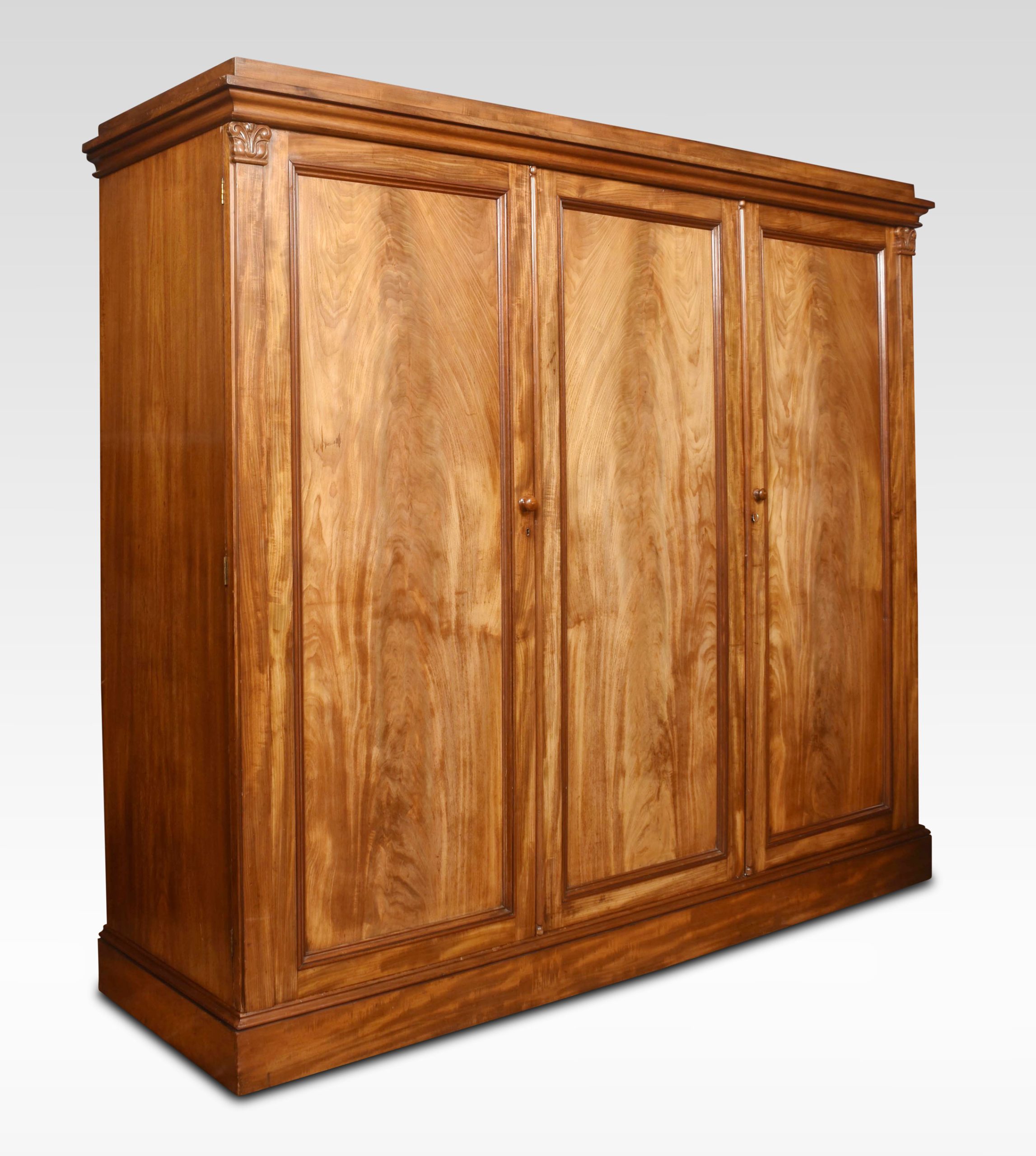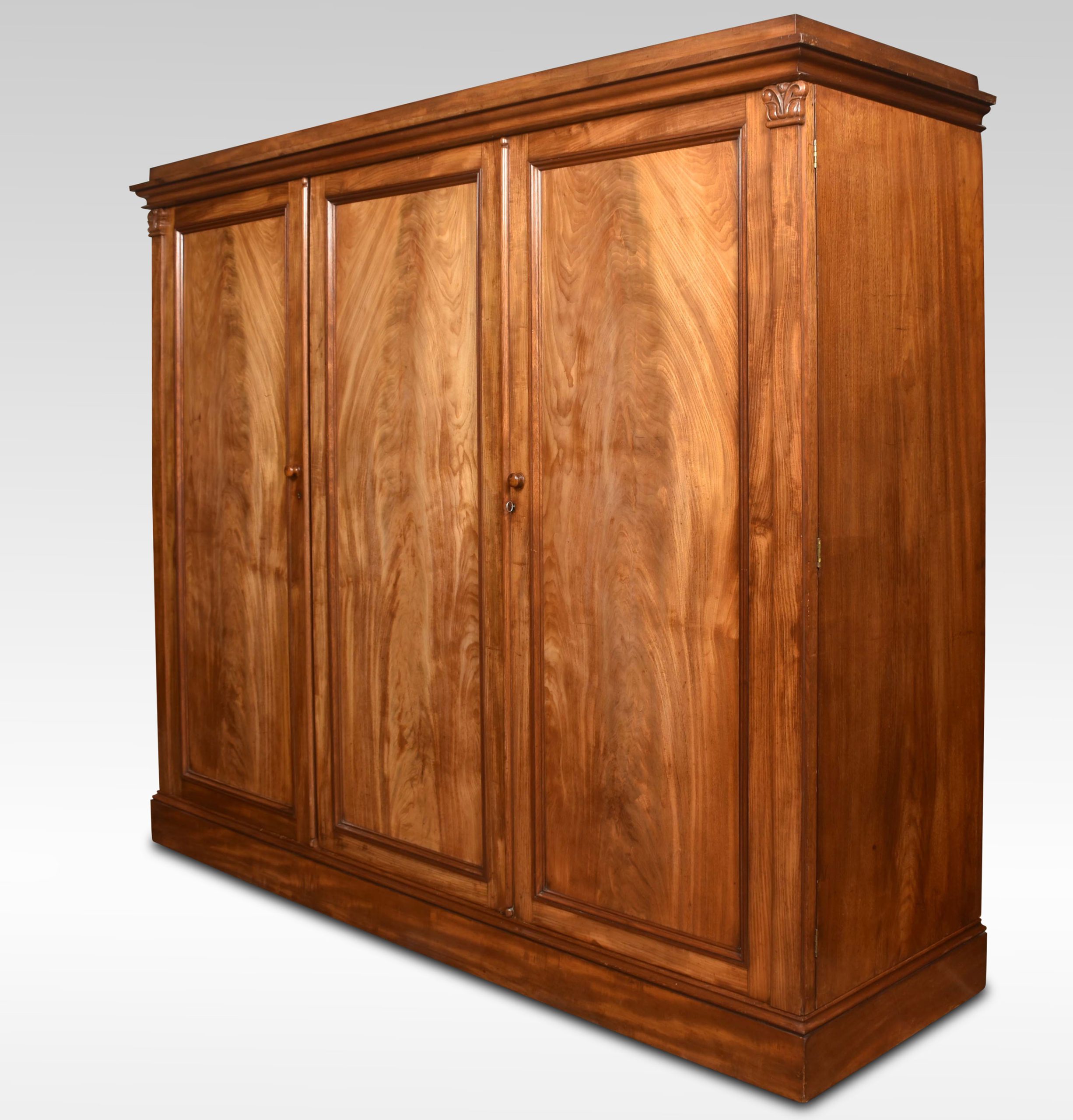 Mahogany three-door wardrobe, the moulded cornice above three long panelled mahogany doors opening to reveal the large hanging and drawers to the base. All raised up on plinth.