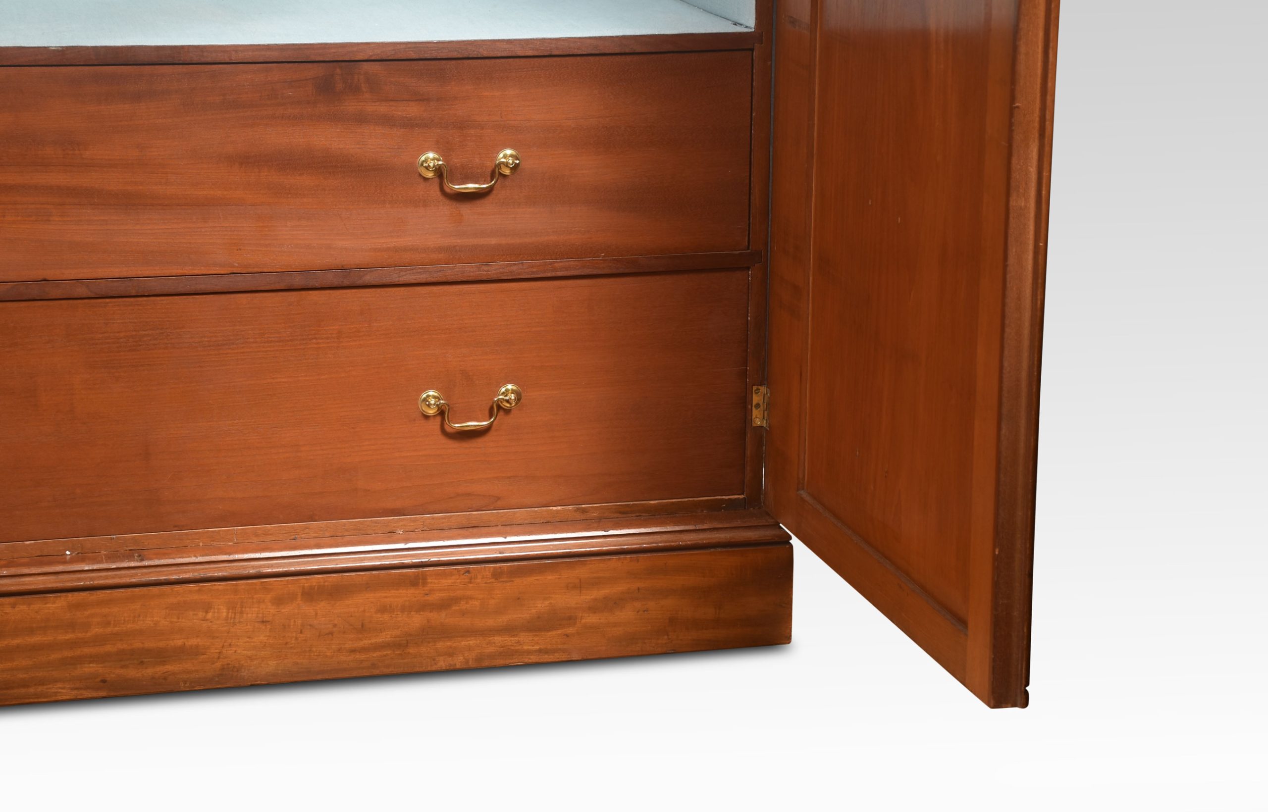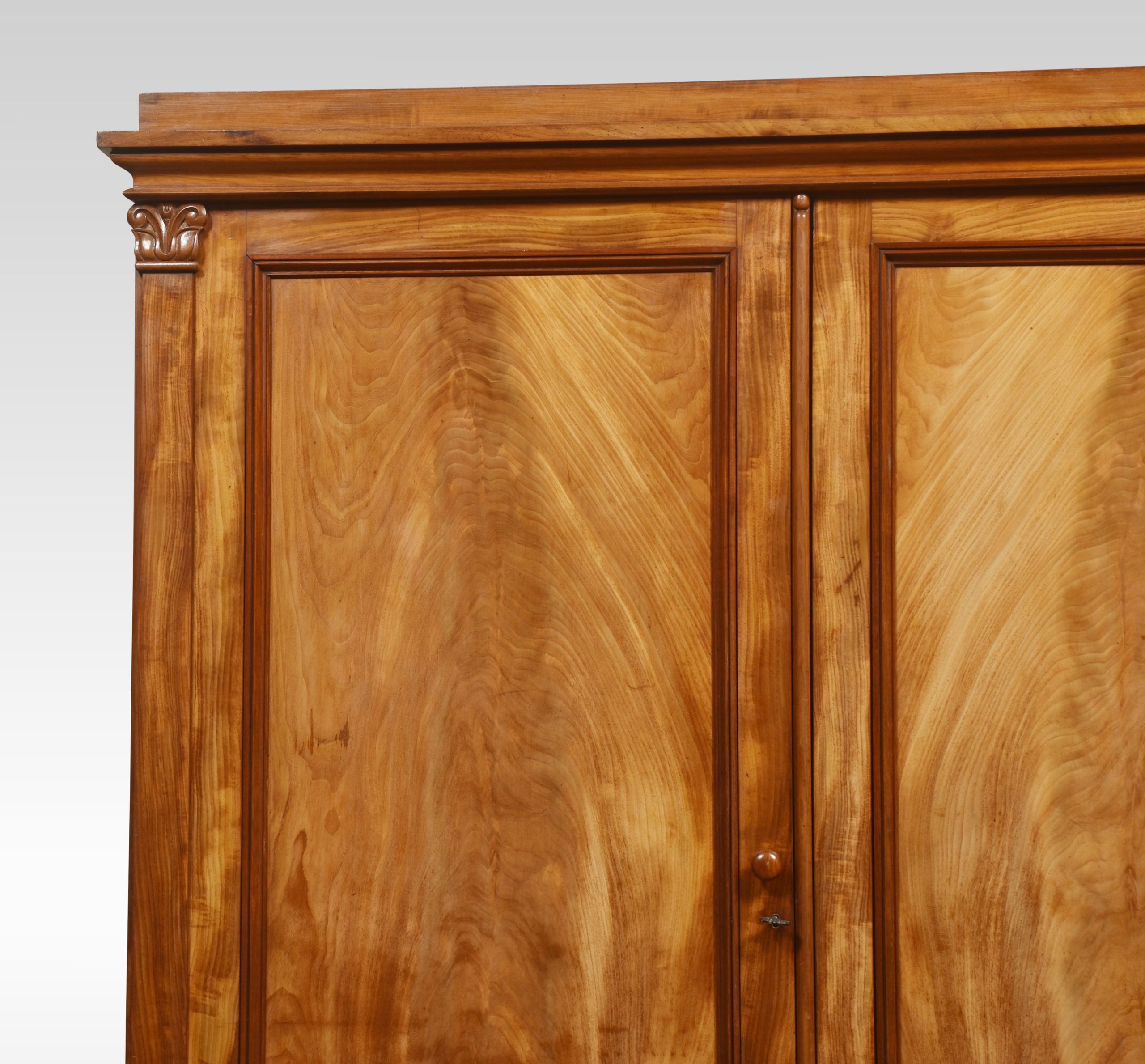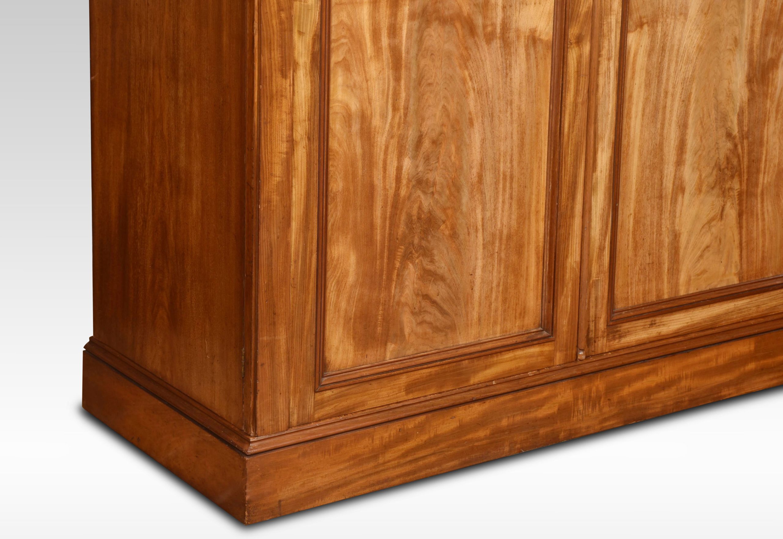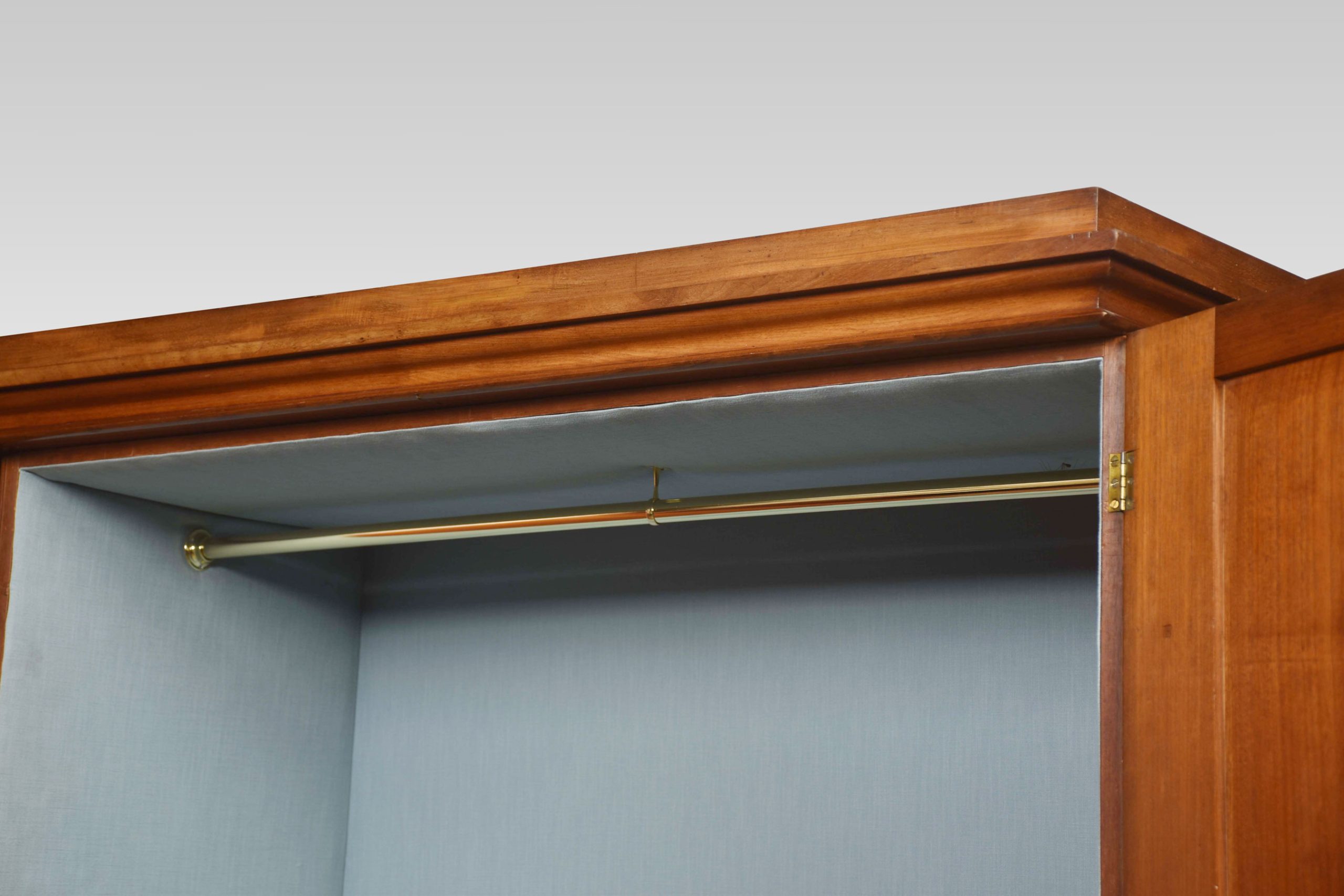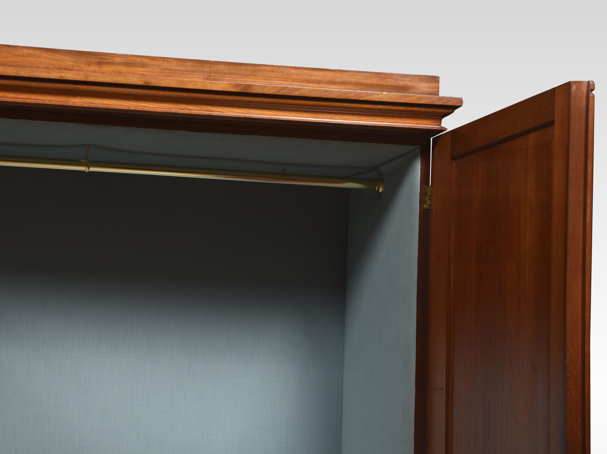 Mahogany three-door wardrobe, the moulded cornice above three long panelled mahogany doors opening to reveal the large hanging and drawers to the base. All raised up on plinth.