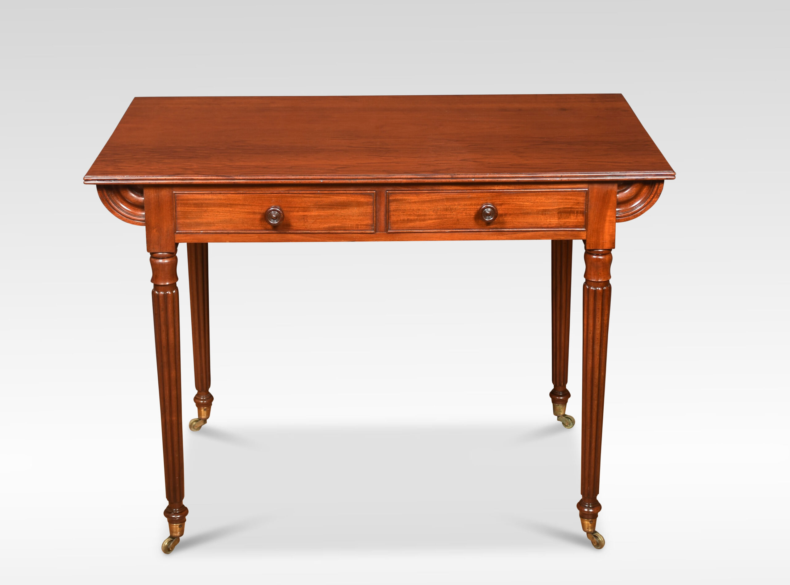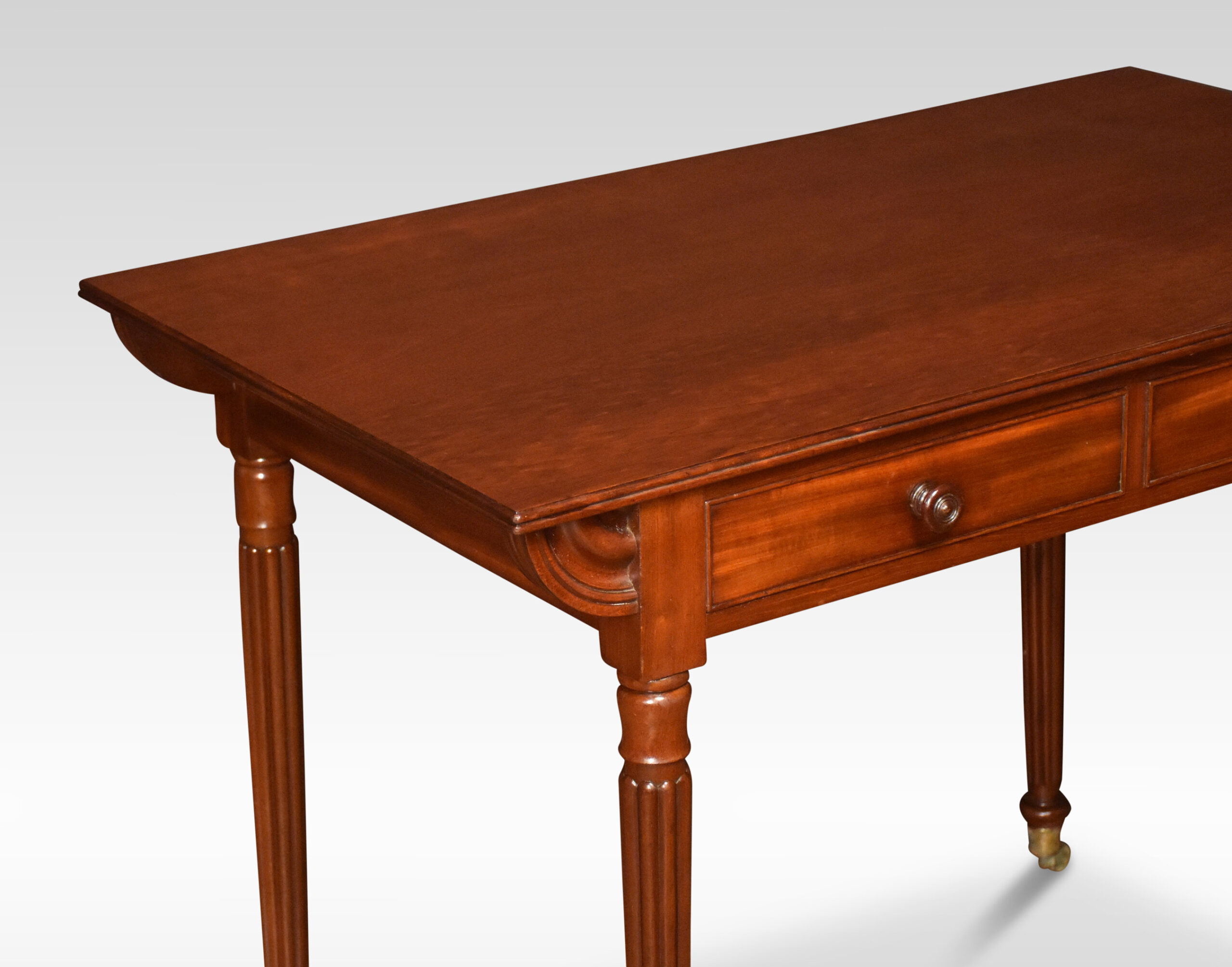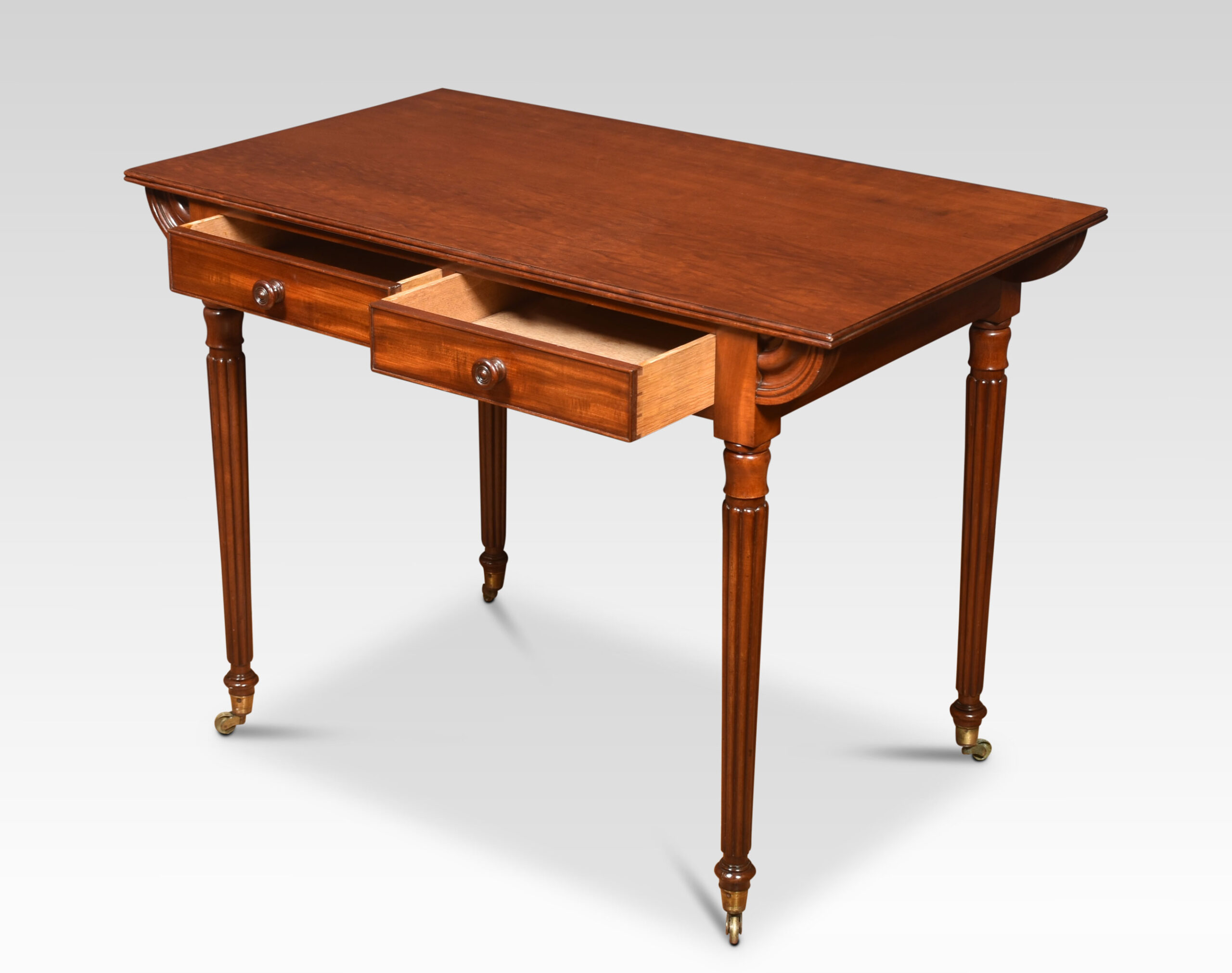 Mahogany writing/side table, the large rectangular top with moulded edge, above two frieze drawers and false draws to opposing side fitted with turned mahogany handles. Raised on reeded turned tapering legs with brass caps and castors.