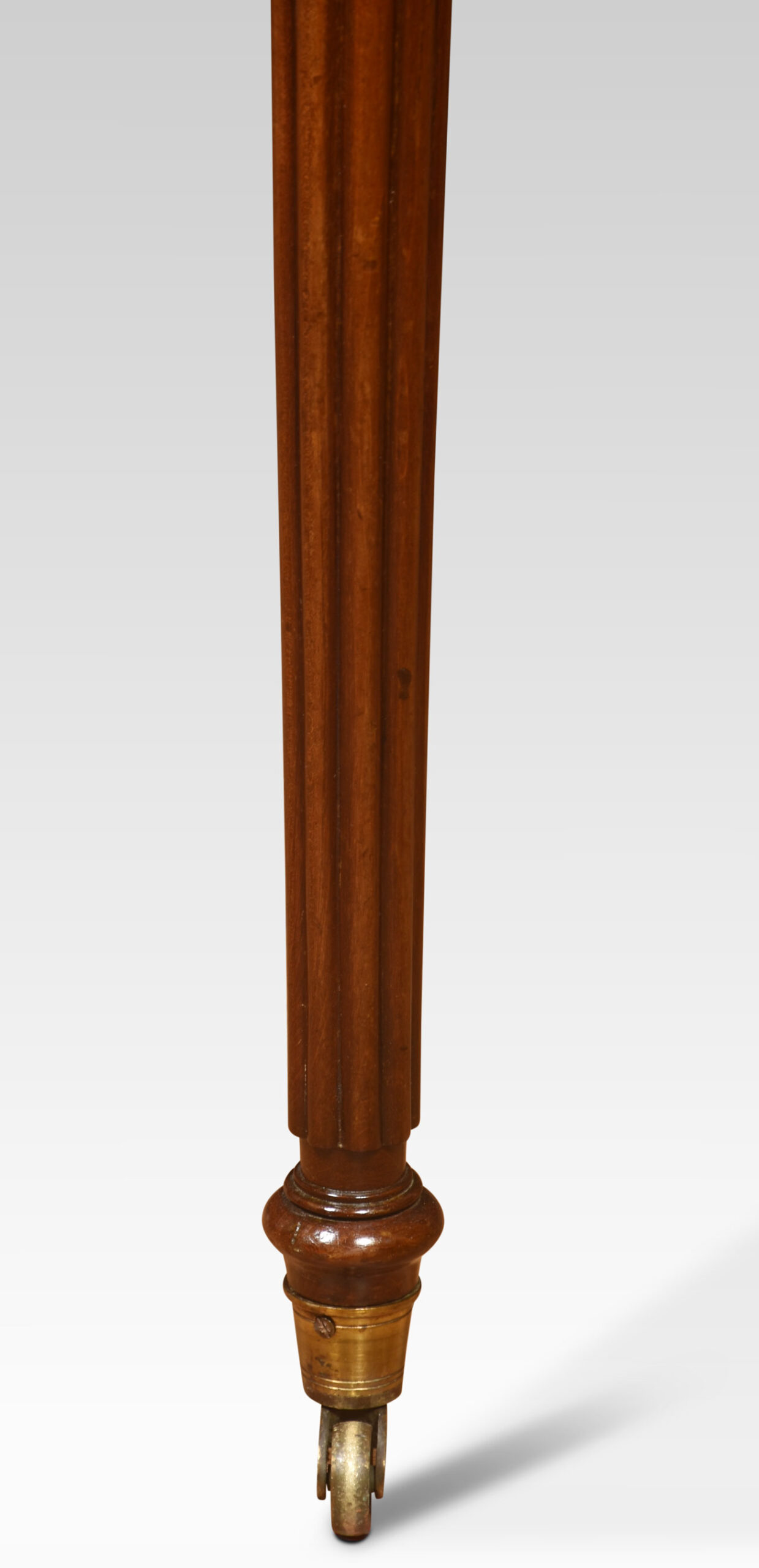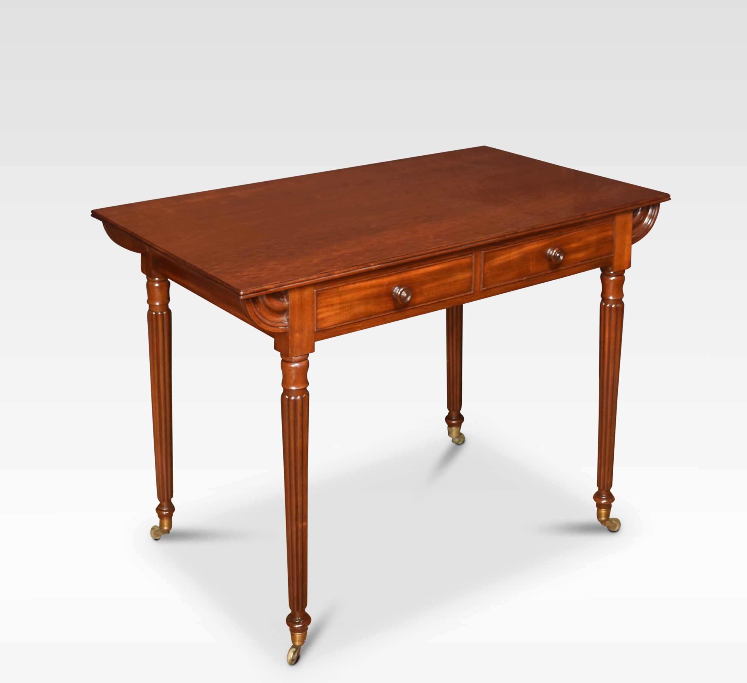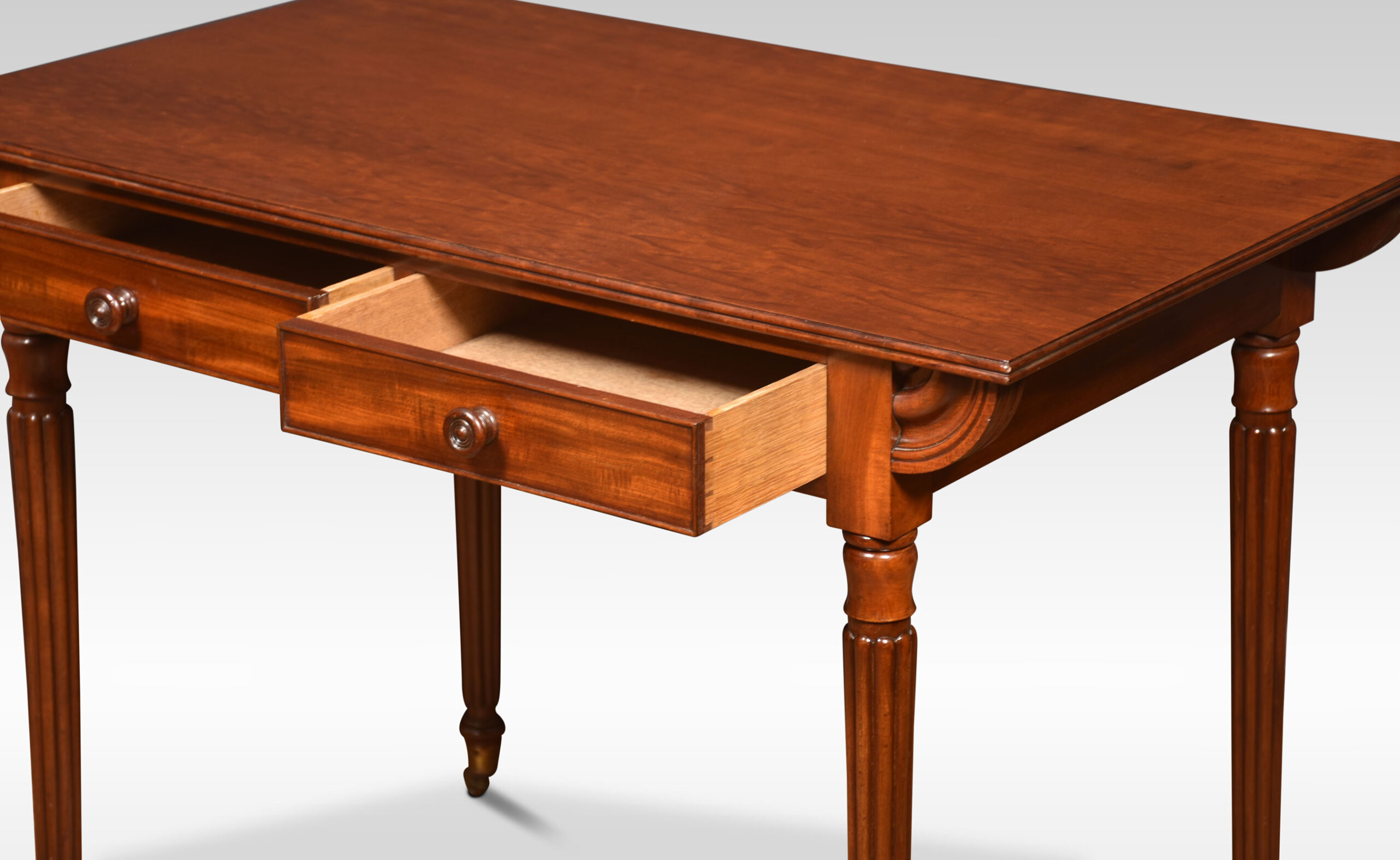 Mahogany writing/side table, the large rectangular top with moulded edge, above two frieze drawers and false draws to opposing side fitted with turned mahogany handles. Raised on reeded turned tapering legs with brass caps and castors.
