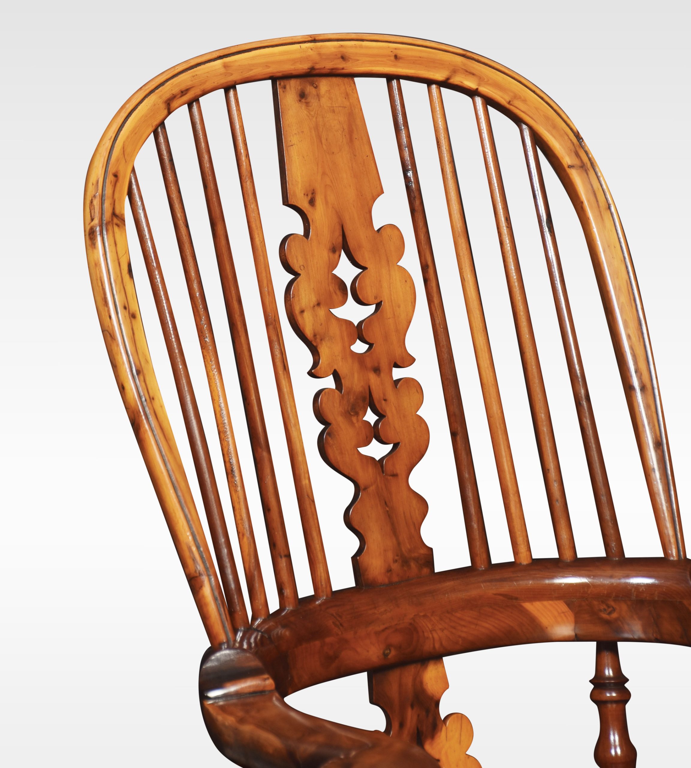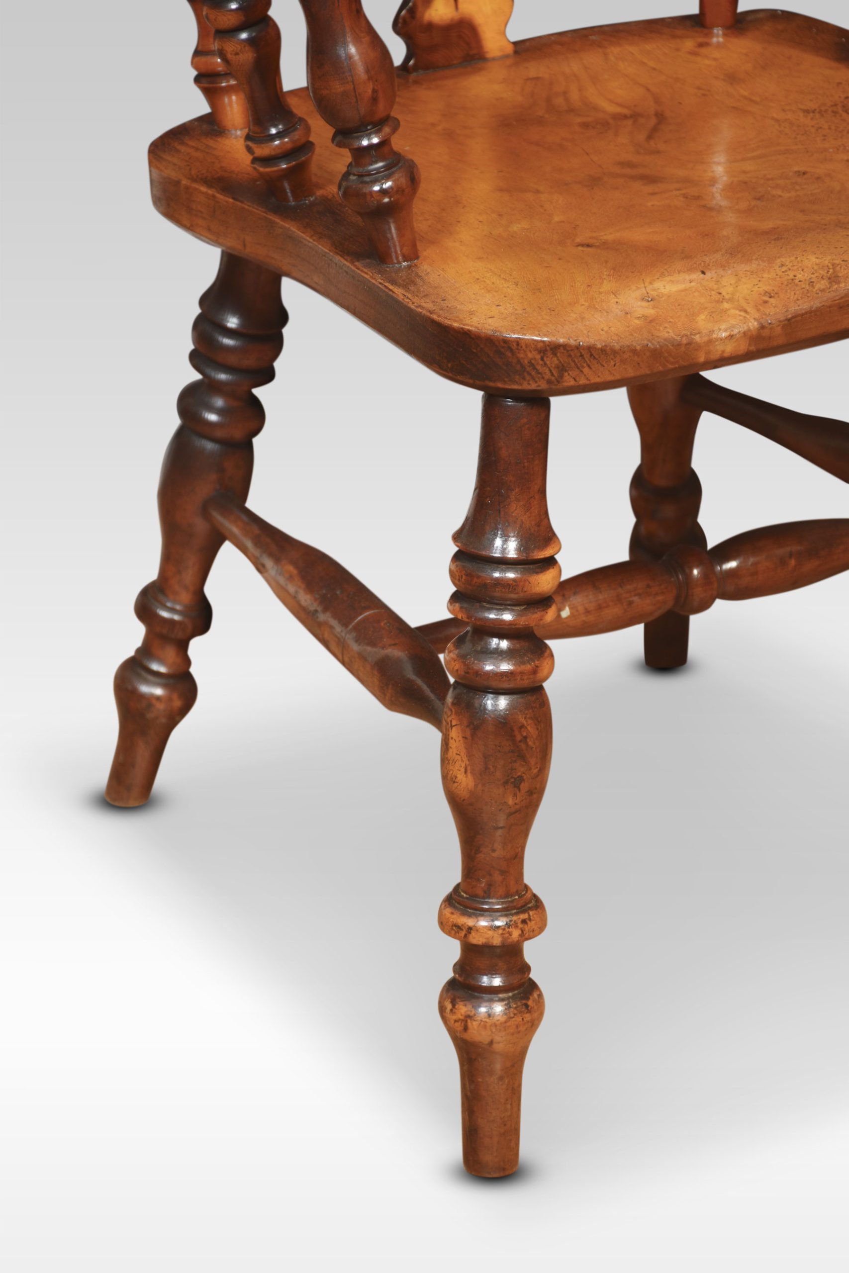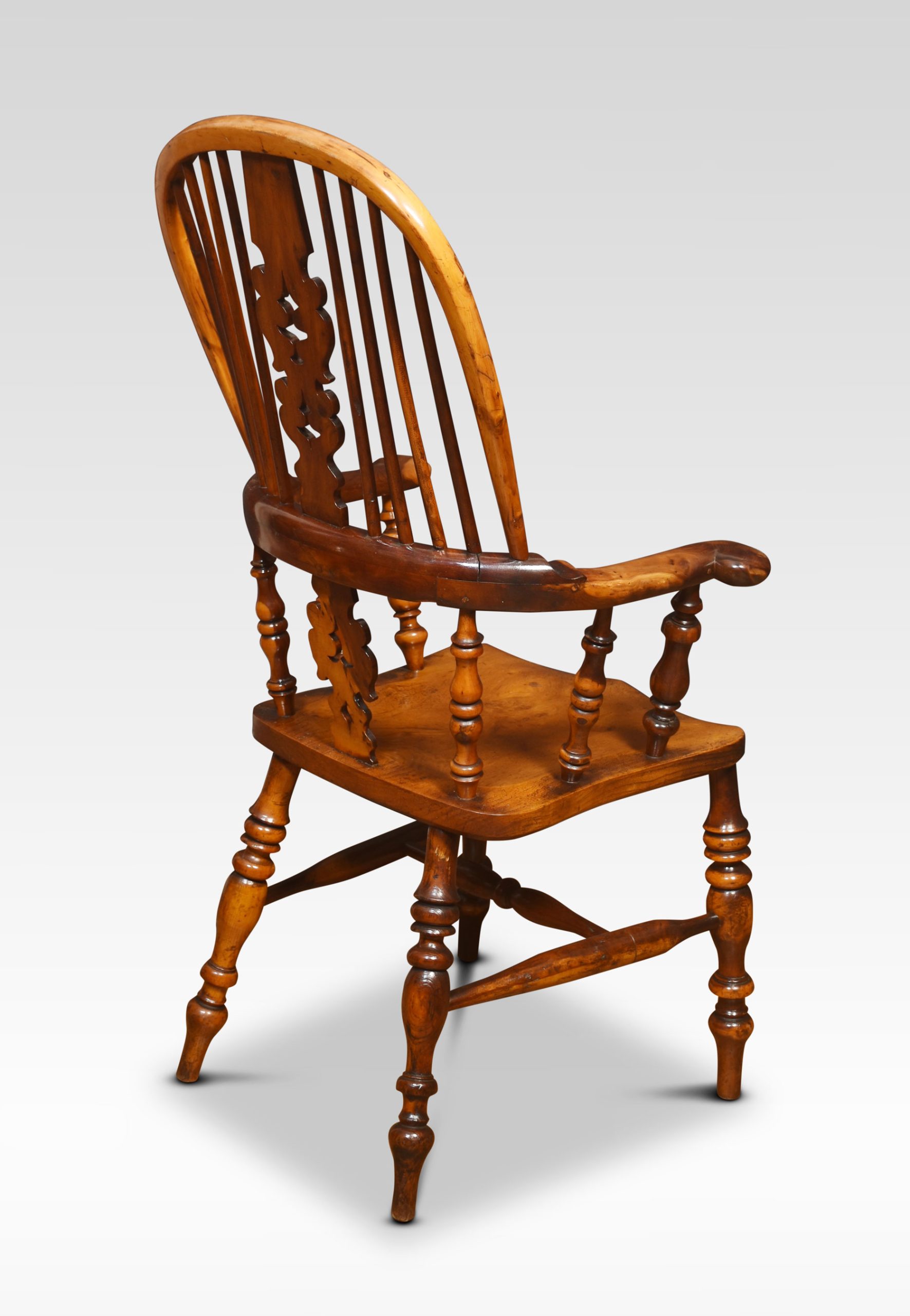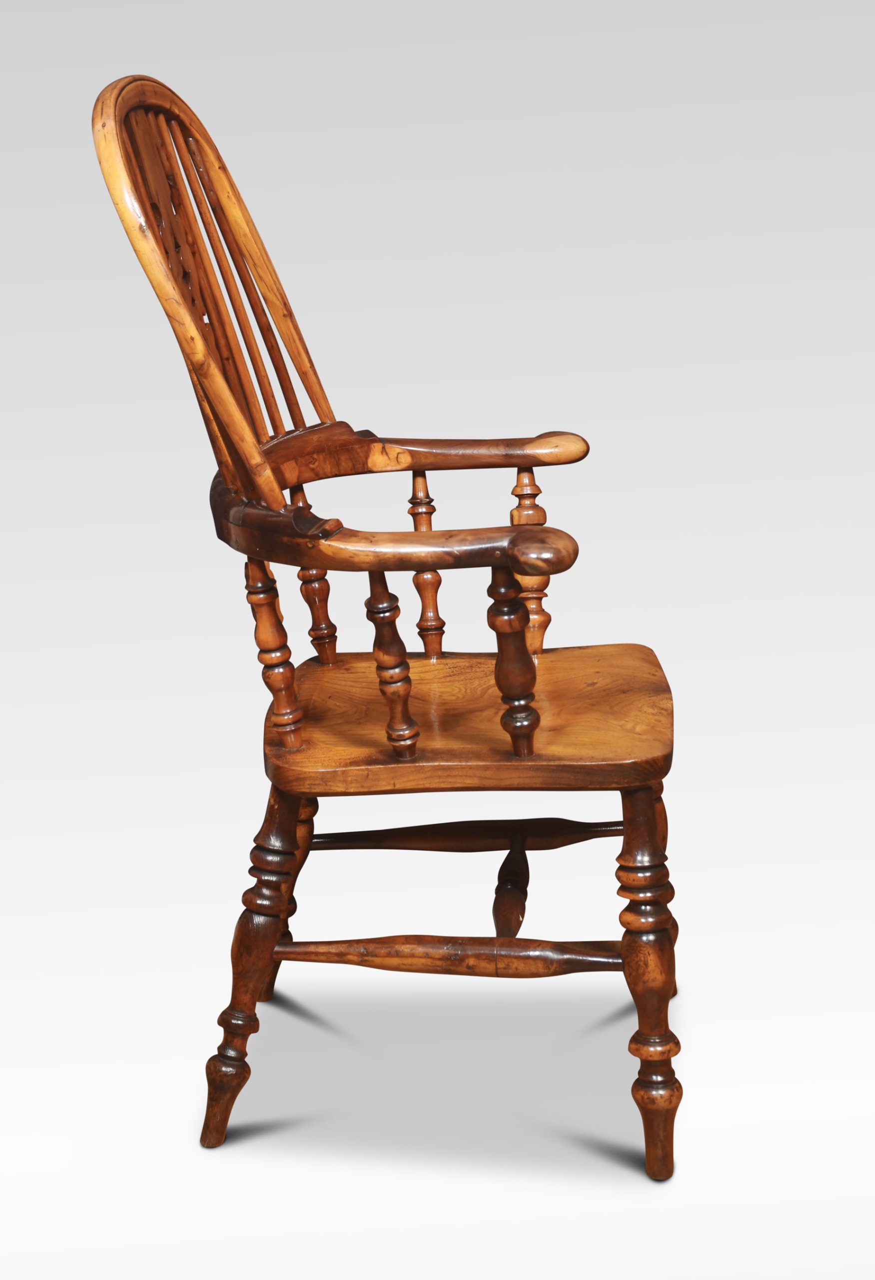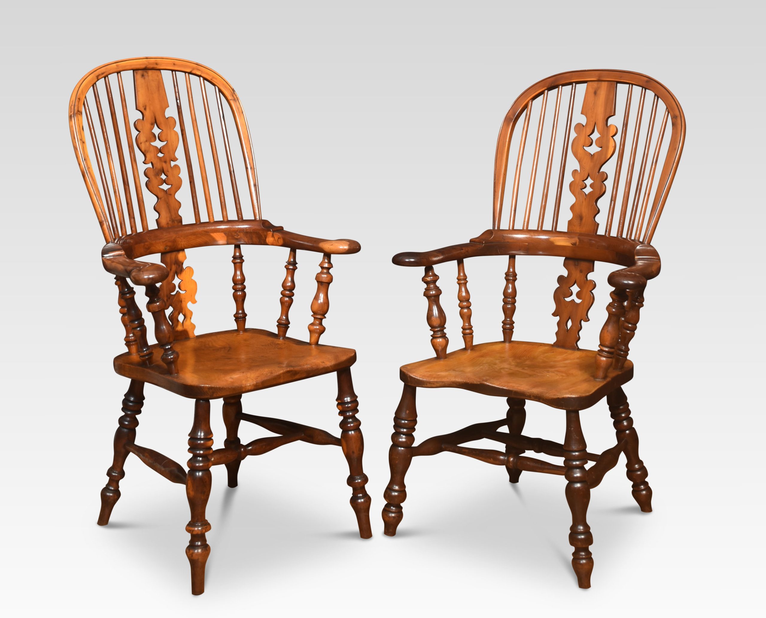 Matched set of six 19th century yew wood broad arm Windsor chairs, the hoop backs with a pierced and shaped central splat above ash and elm seats surrounded by broad arms. Raised up on turned legs united by stretchers.
