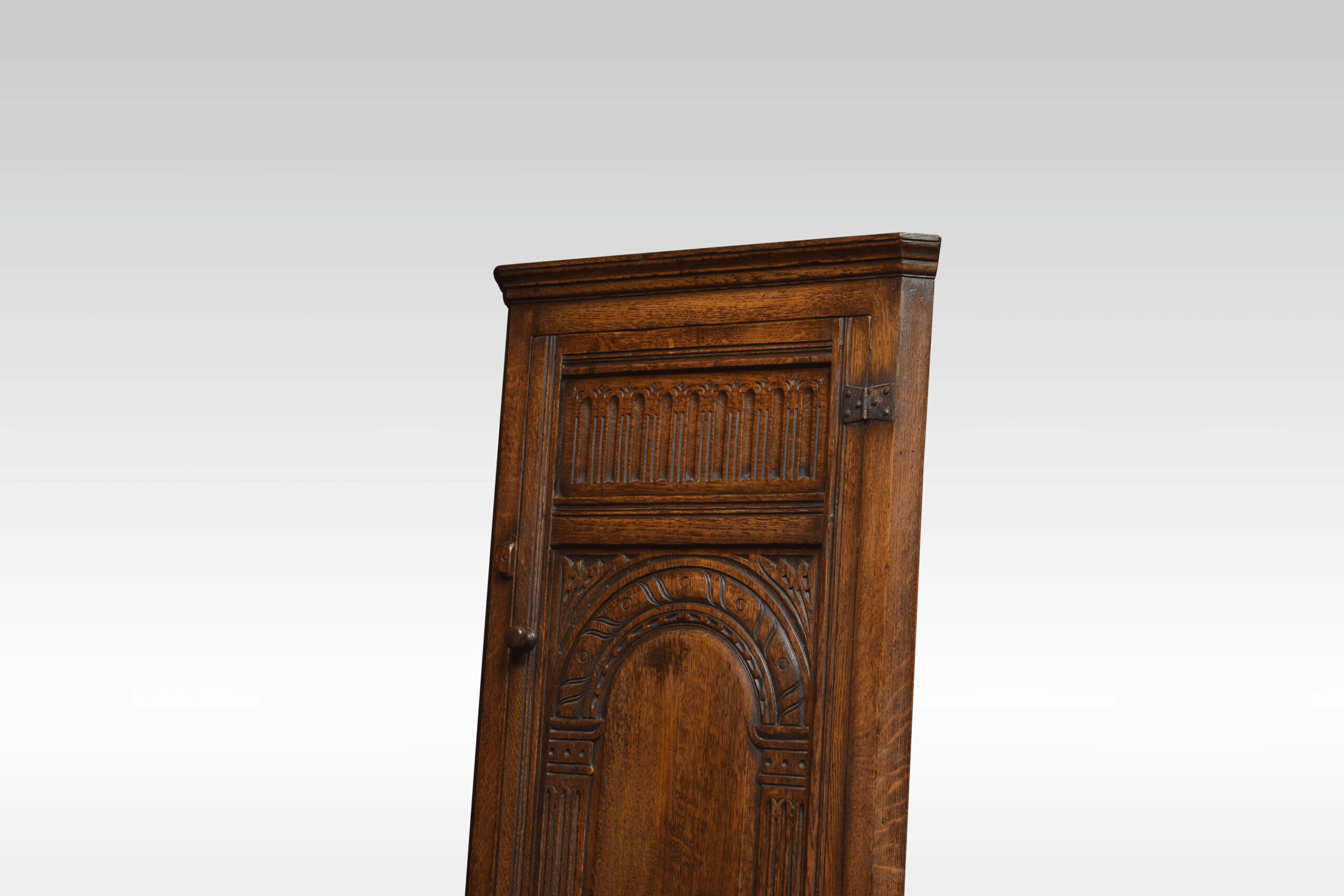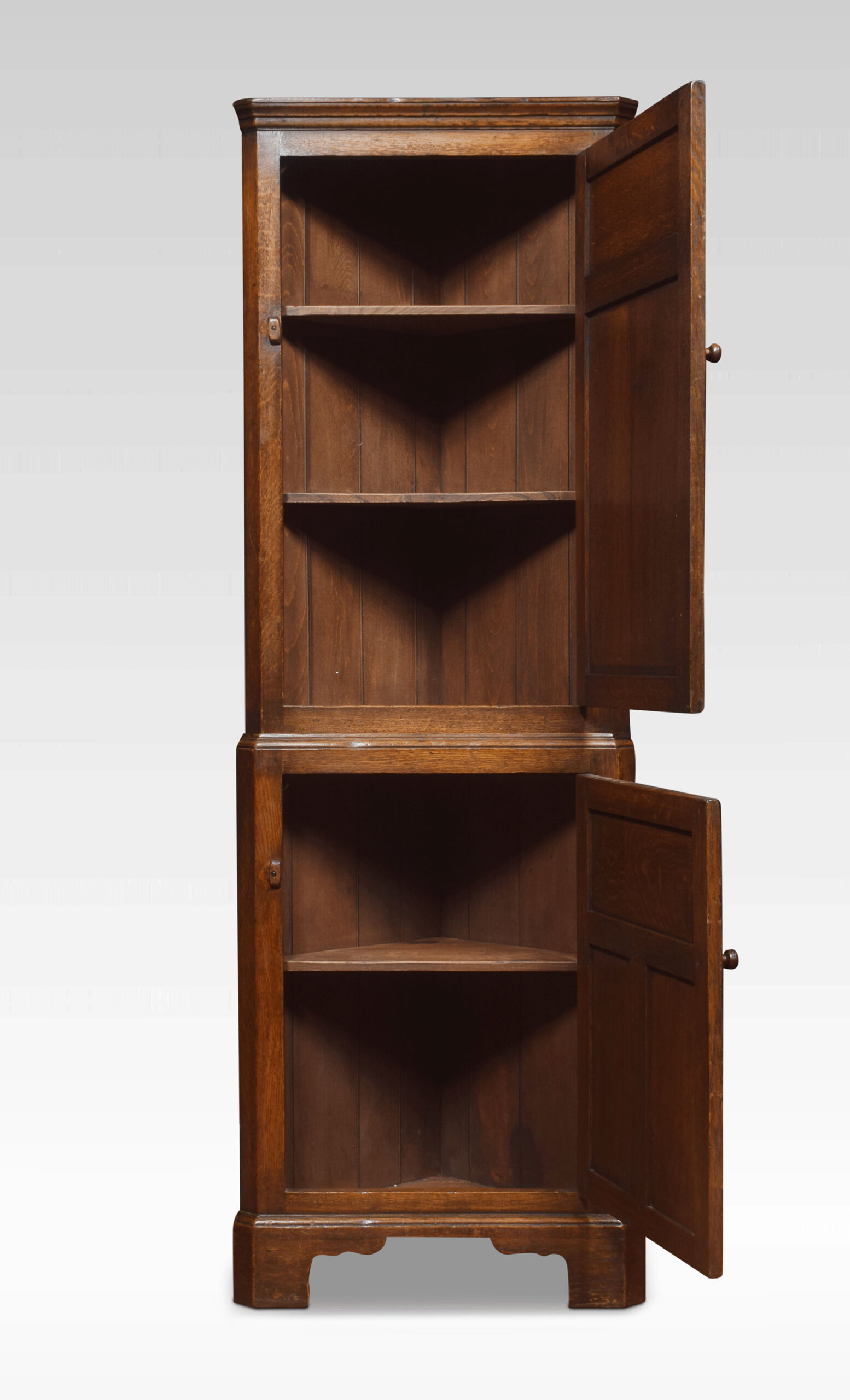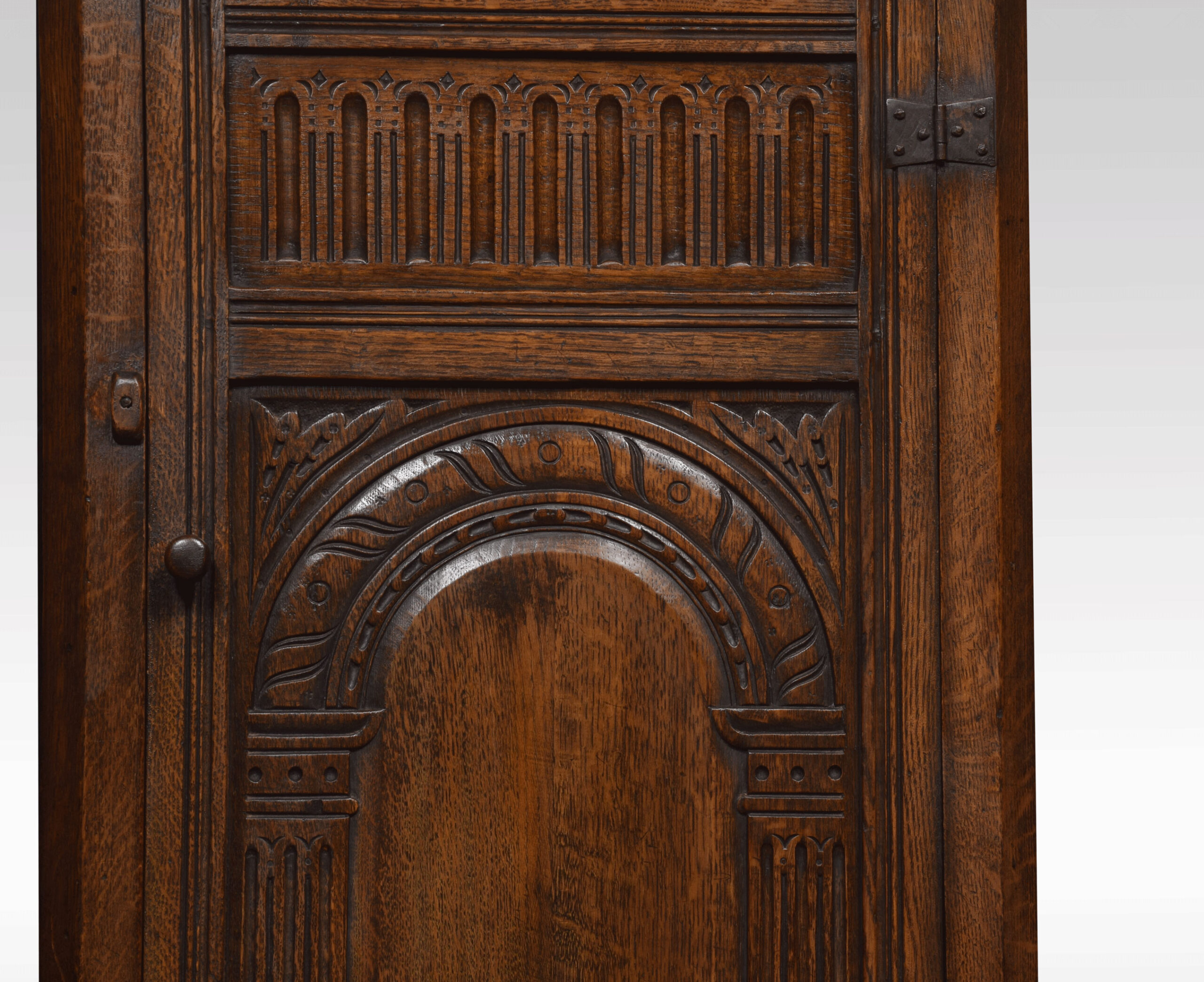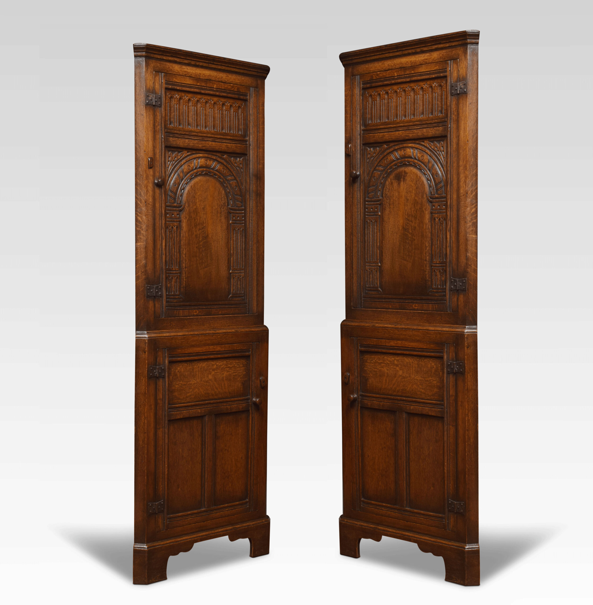 Near pair of oak corner cupboards, the carved frieze above an arched top door with four-panel door below, opening to reveal an arrangement of shelves. All raised up on block feet.