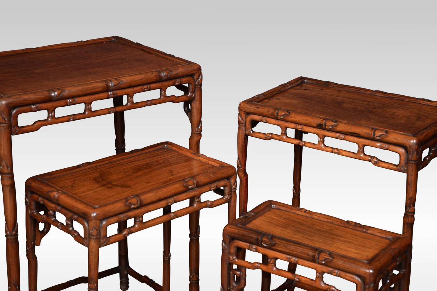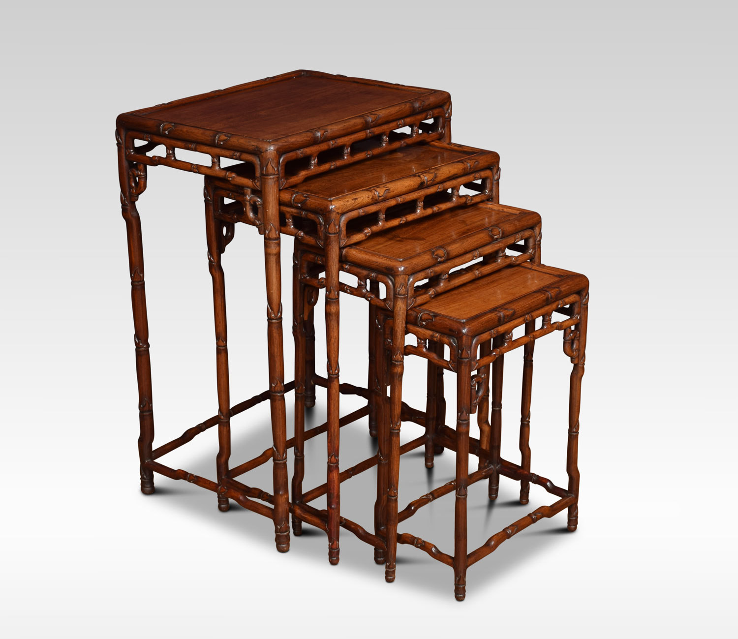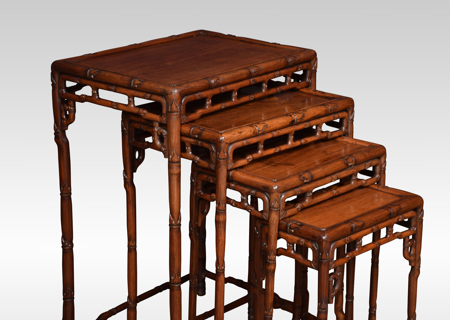 A nest of four rosewood tables having rectangular tops and pierced friezes. Raised up on faux bamboo legs with conforming stretchers.