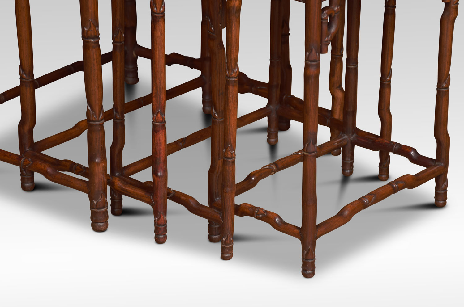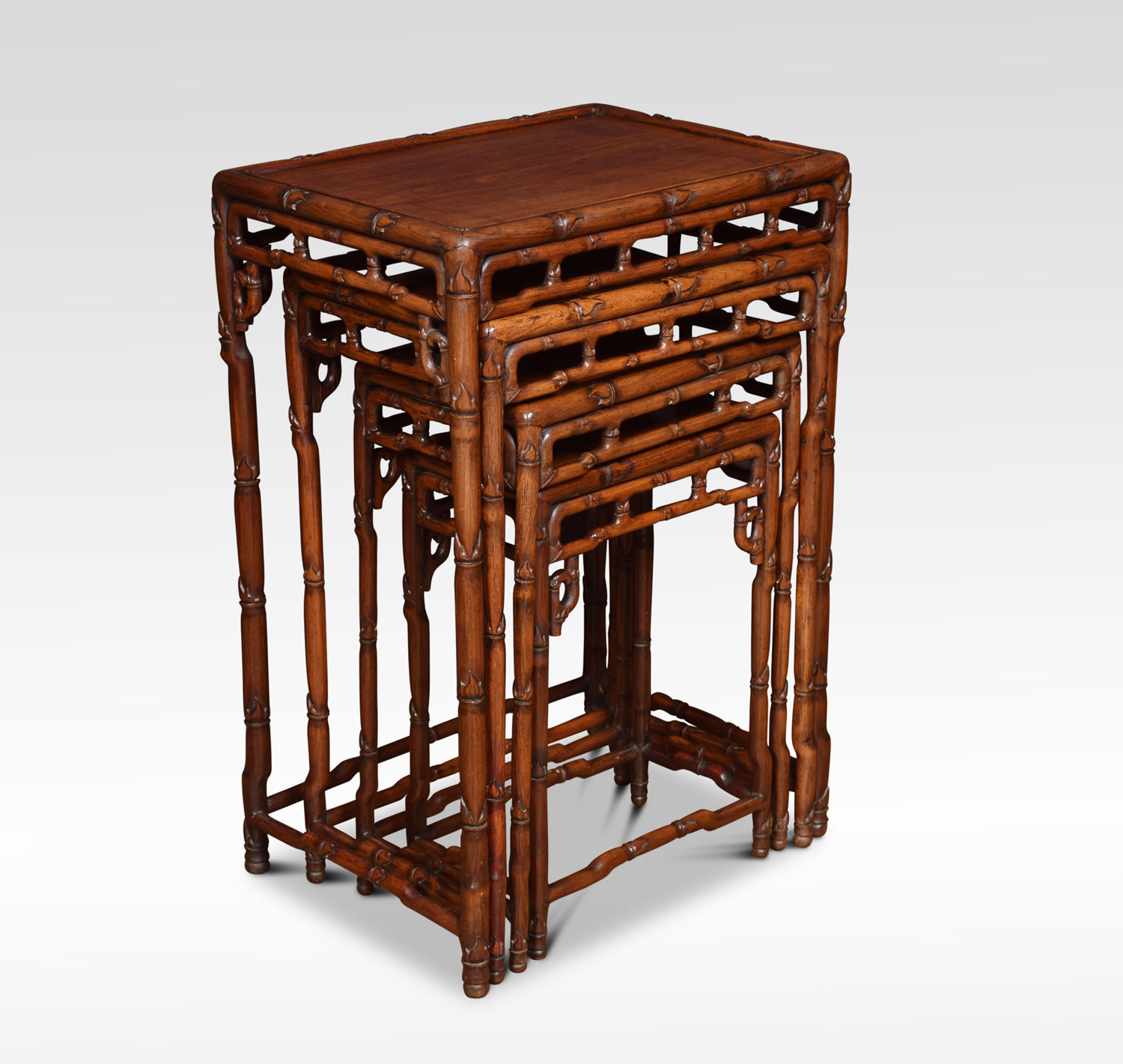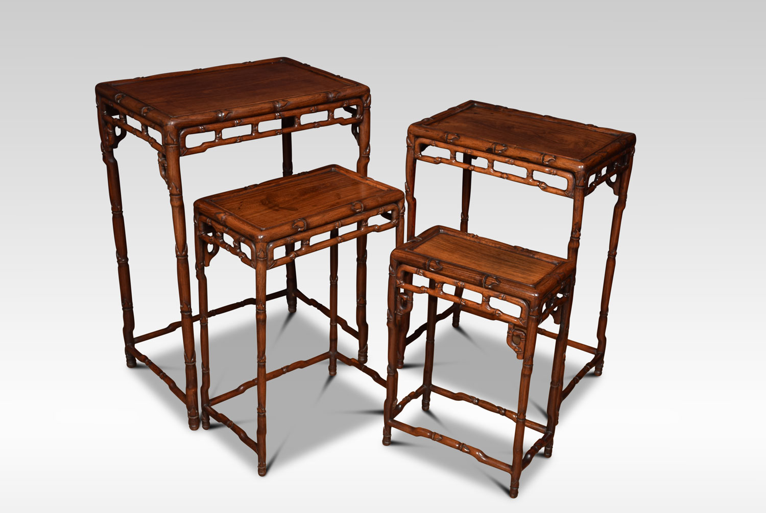 A nest of four rosewood tables having rectangular tops and pierced friezes. Raised up on faux bamboo legs with conforming stretchers.