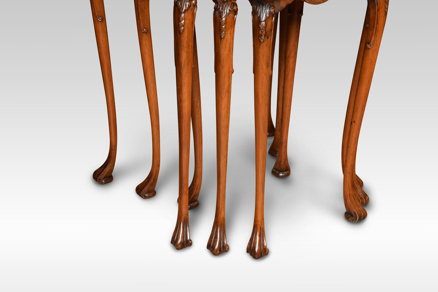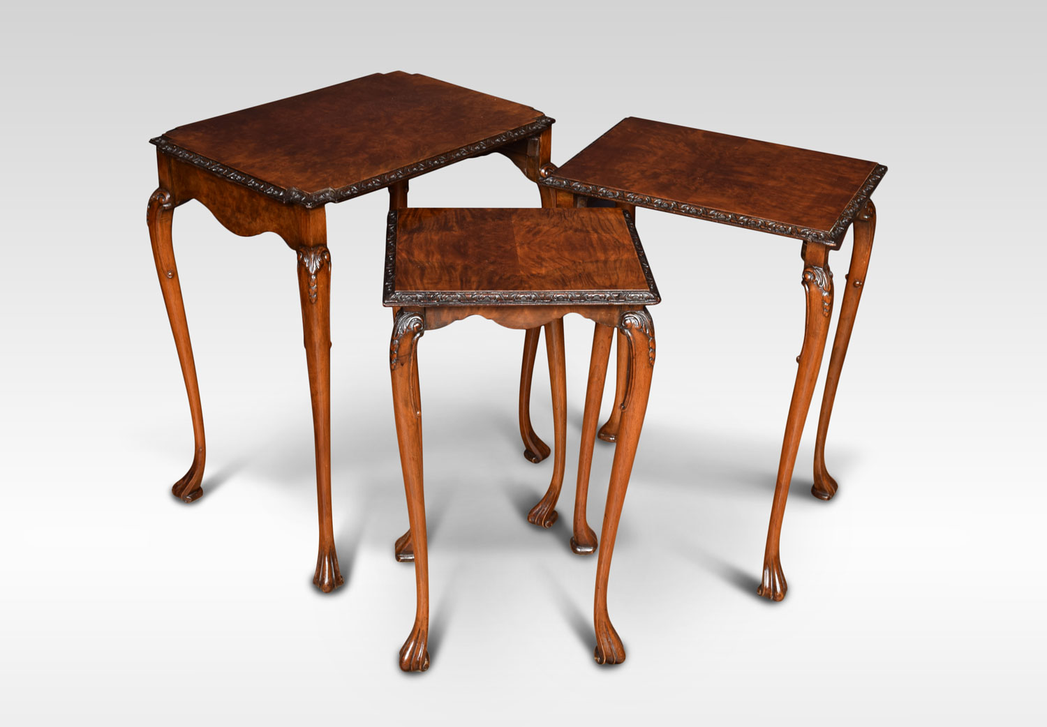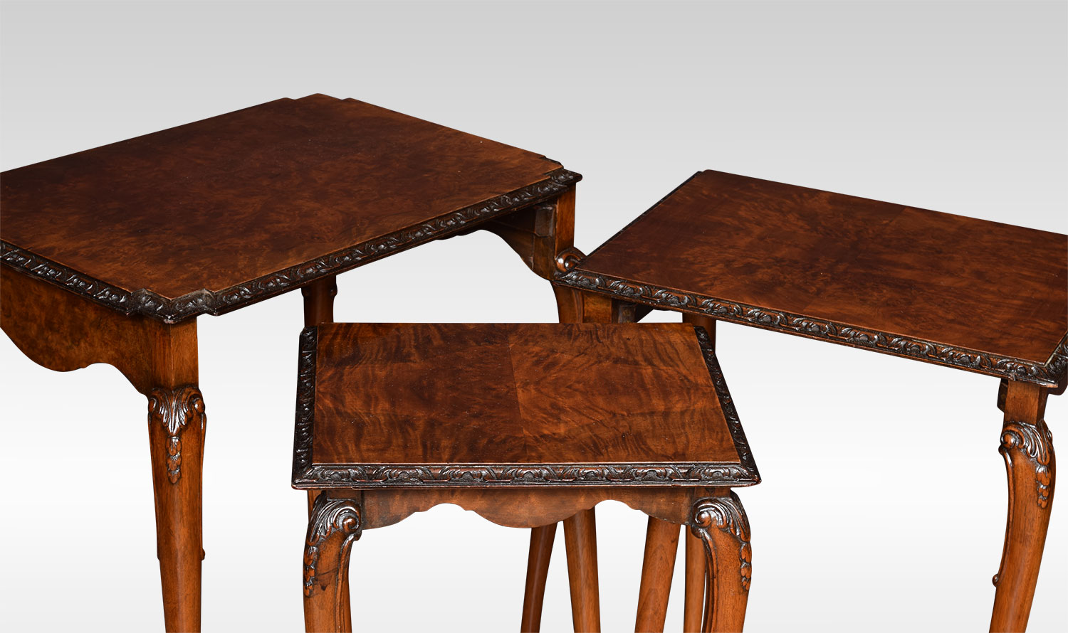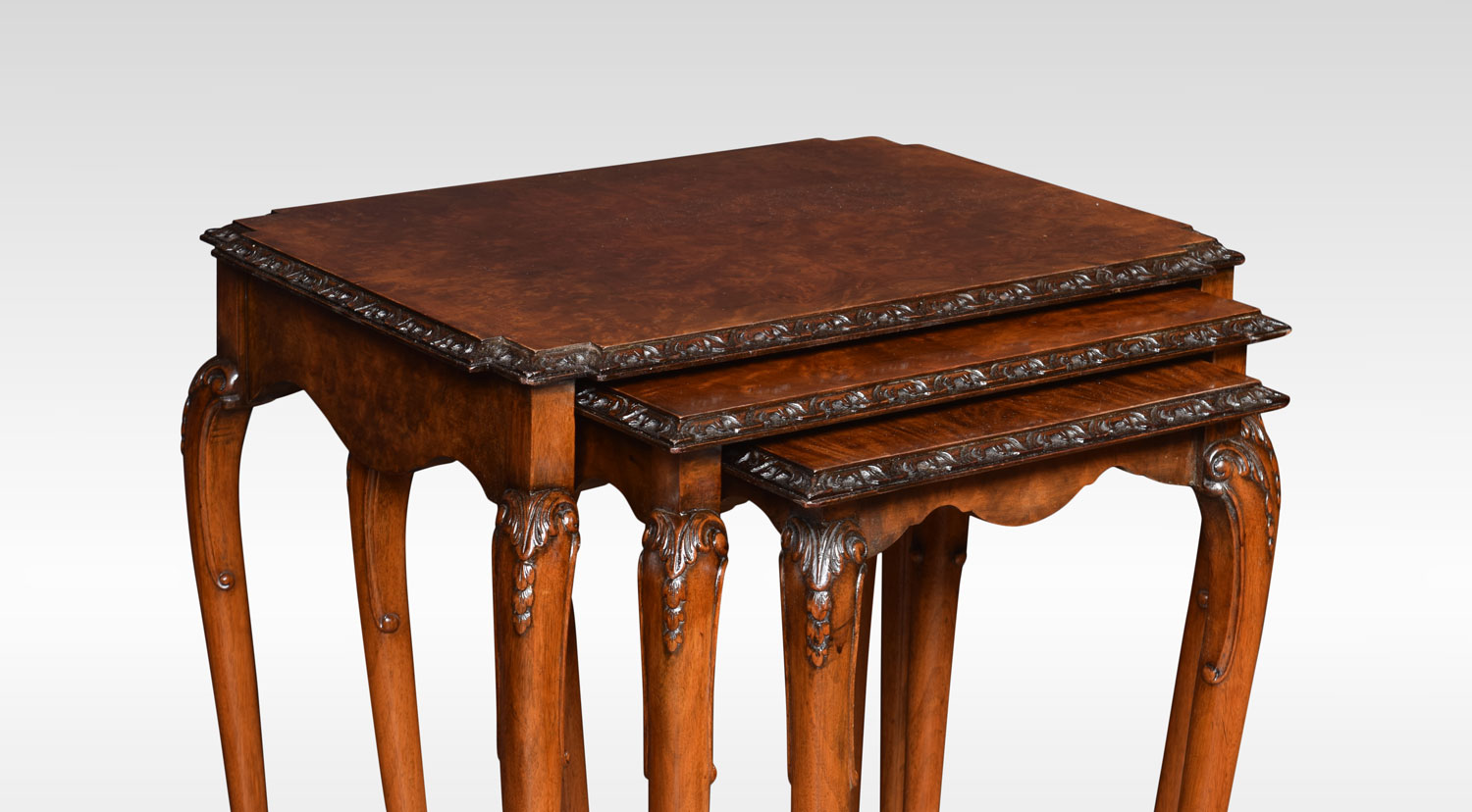 A nest of three burr walnut tables, having rectangular tops with carved moulded edge, raised up on slender acanthus capped cabriole support terminating in scrolling feet.