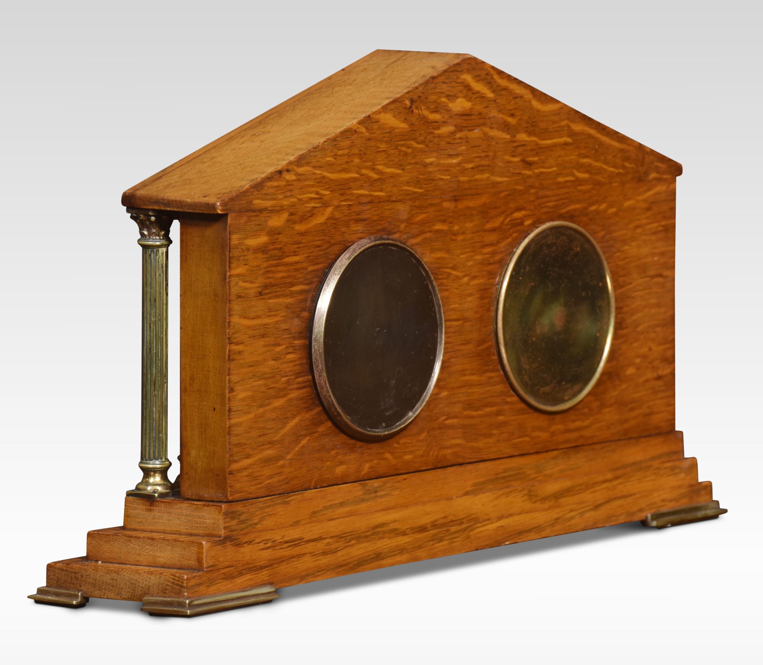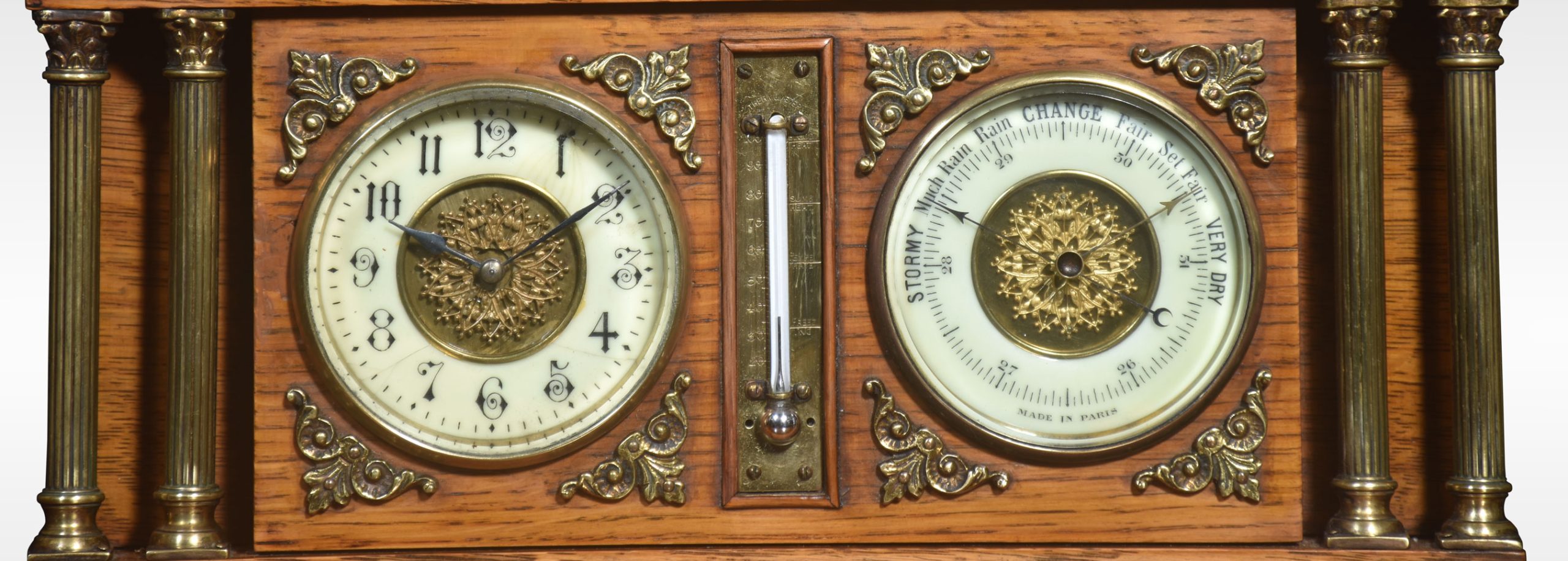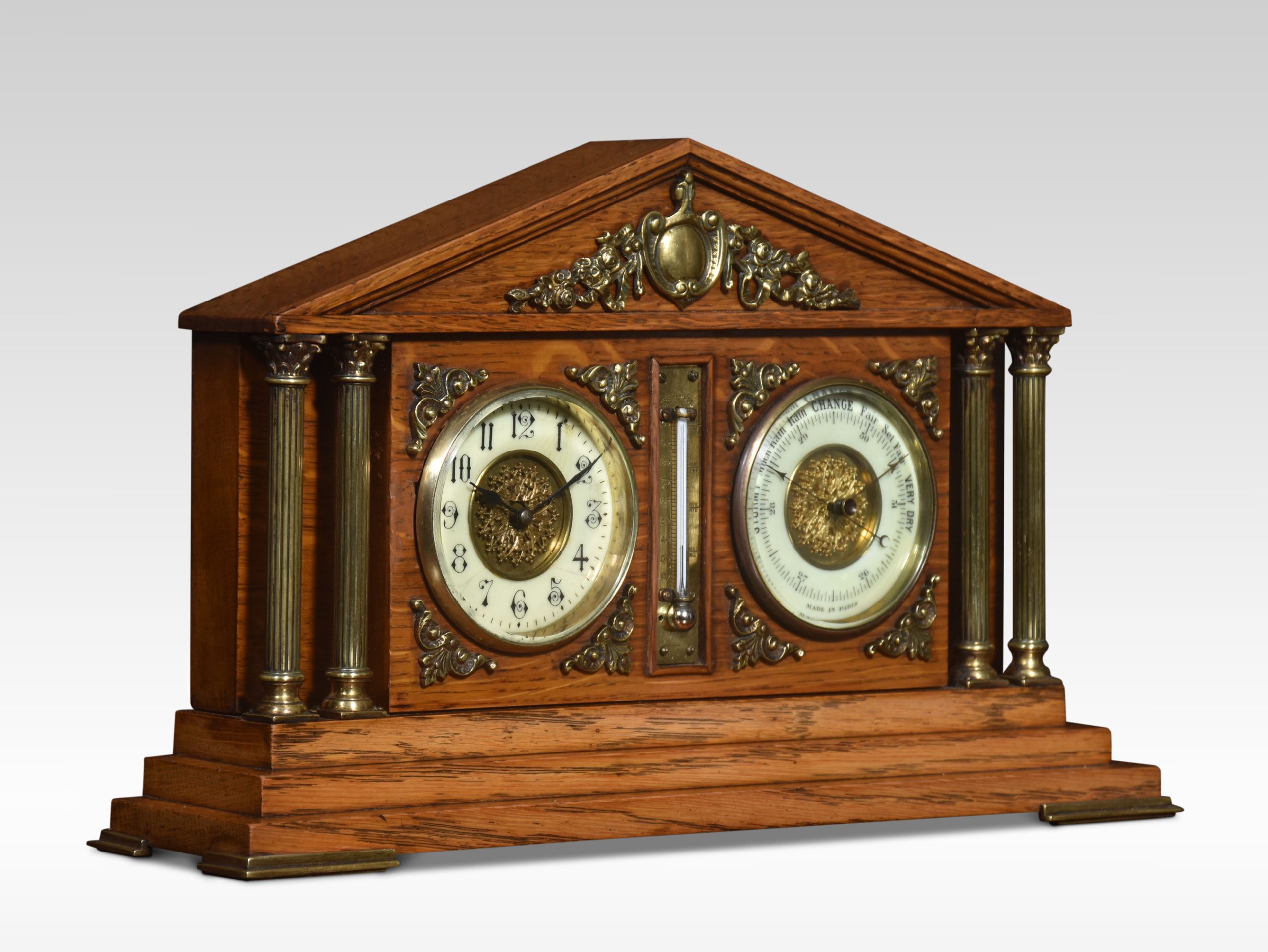 Oak architectural desk clock and barometer, of temple form with ceramic dials, centred with a thermometer and within double Corinthian brass columns. All raised up on a stepped base.