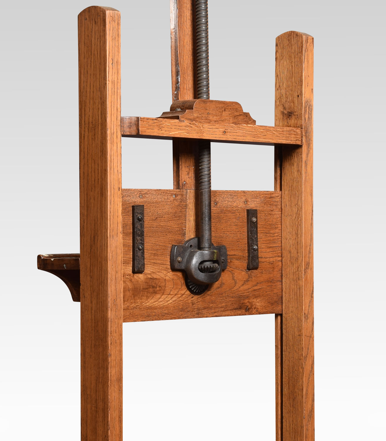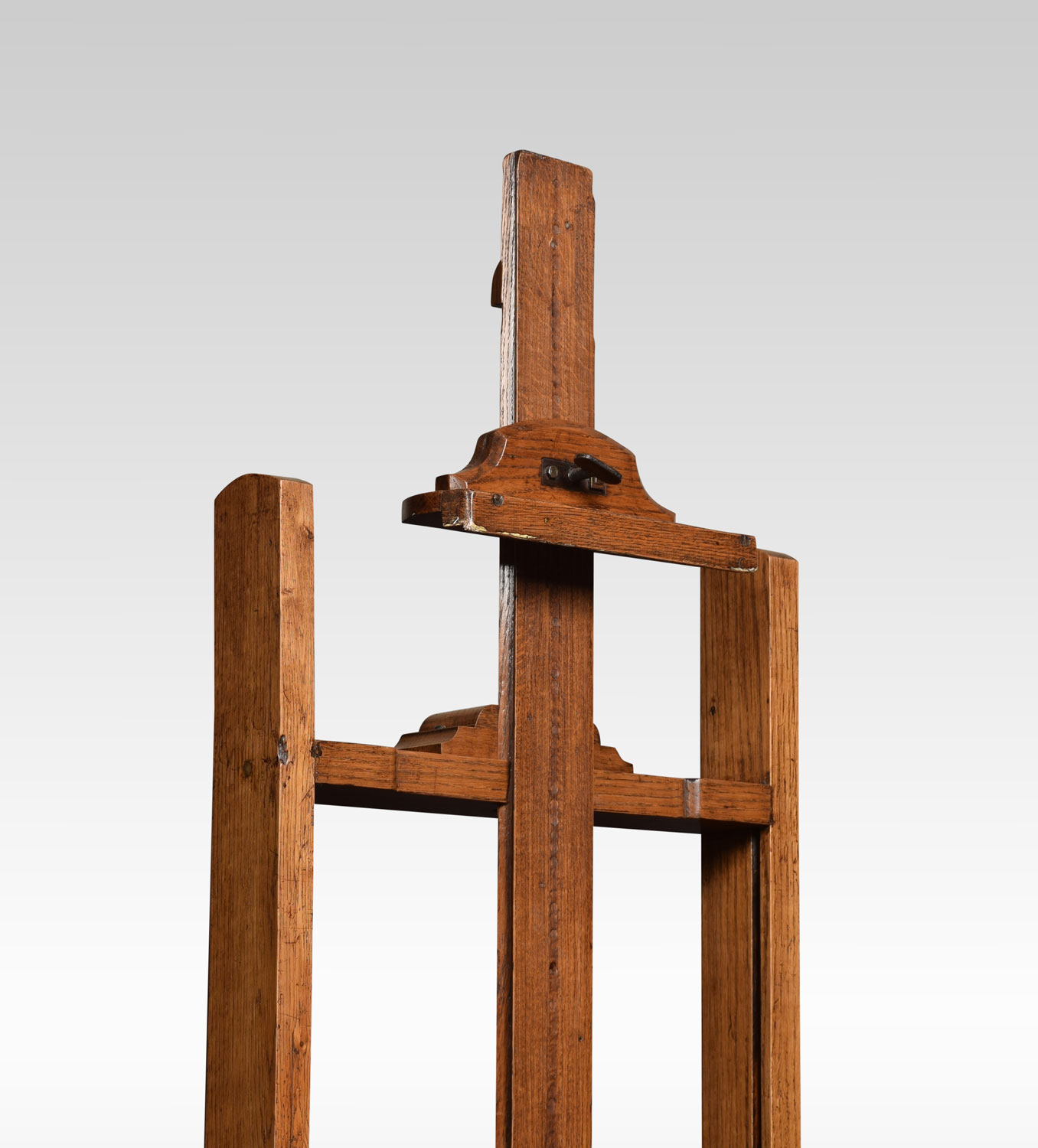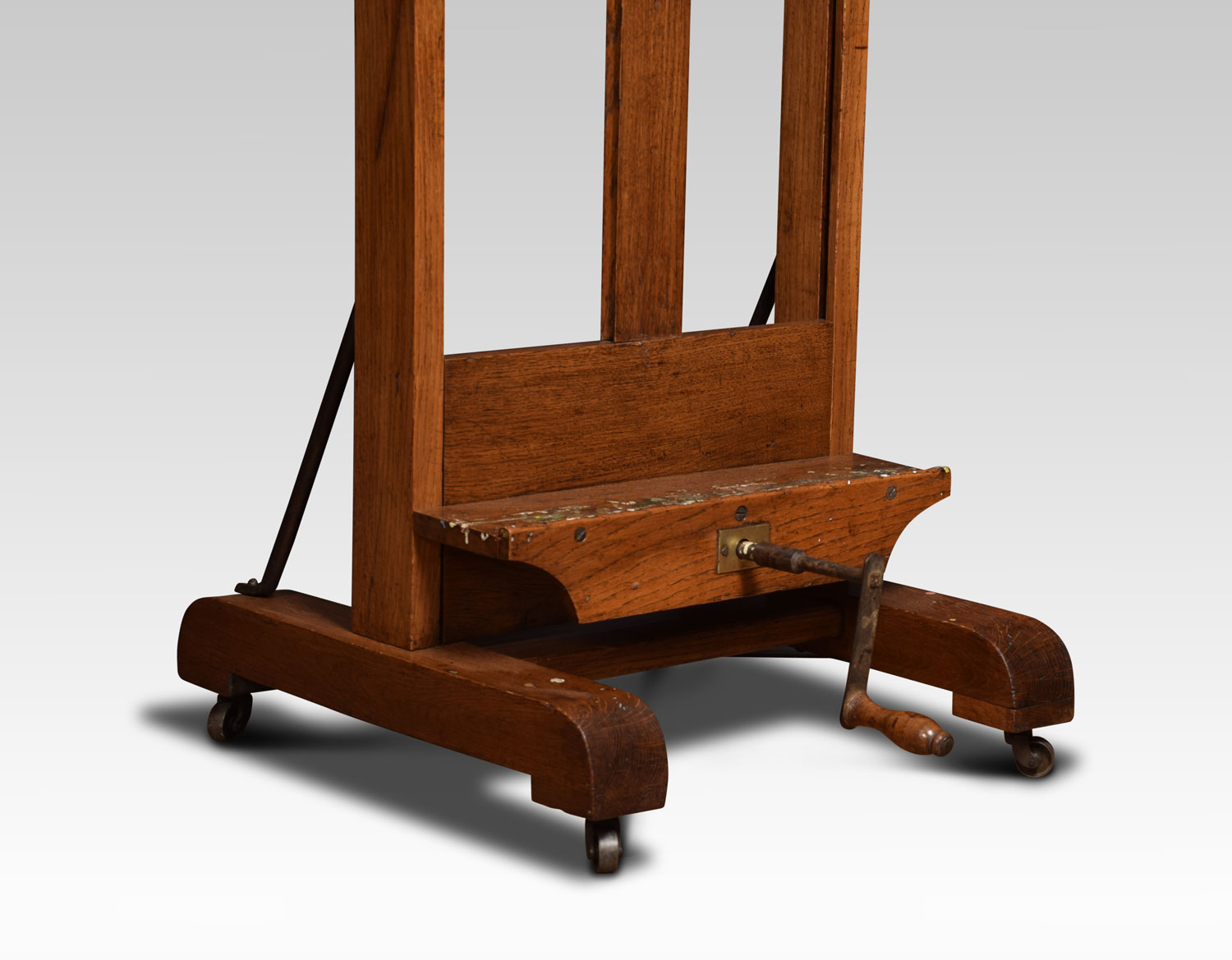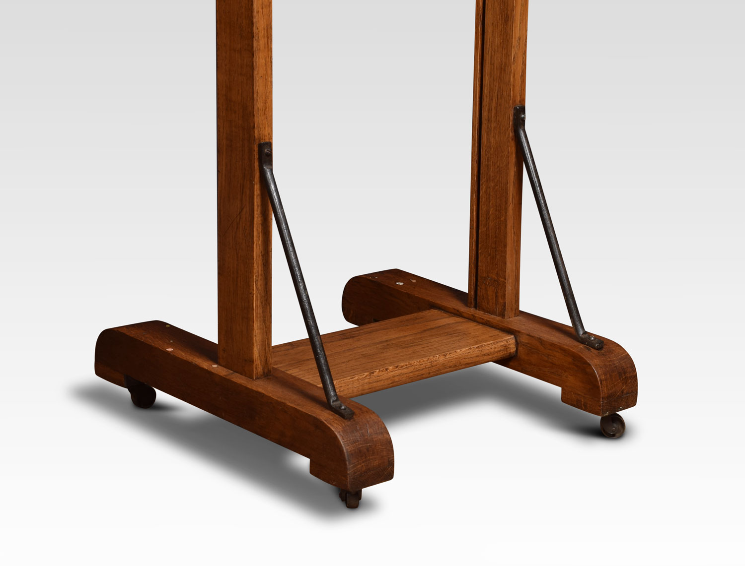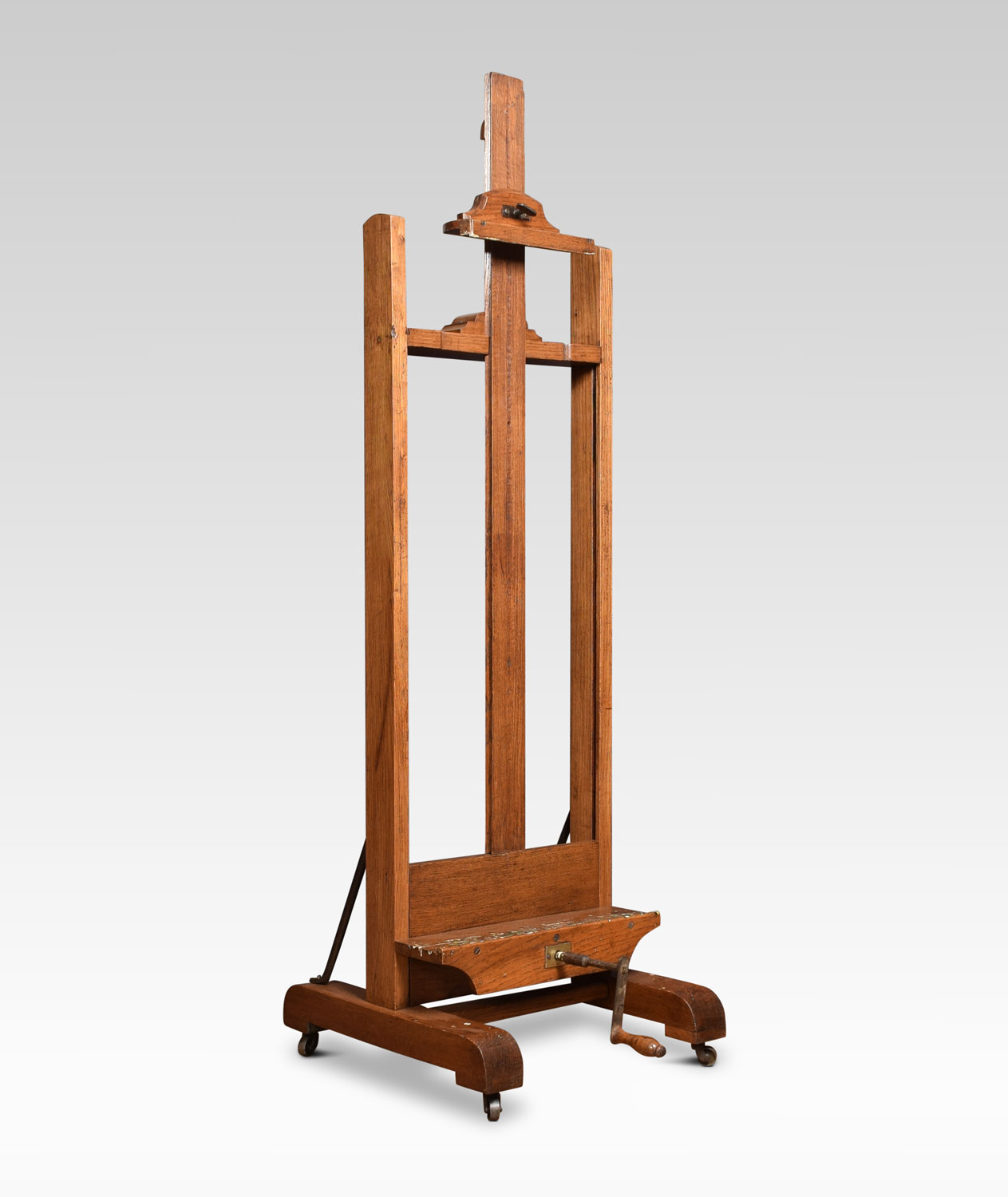 Oak artist’s adjustable studio easel raised up on trestle base terminating in casters.