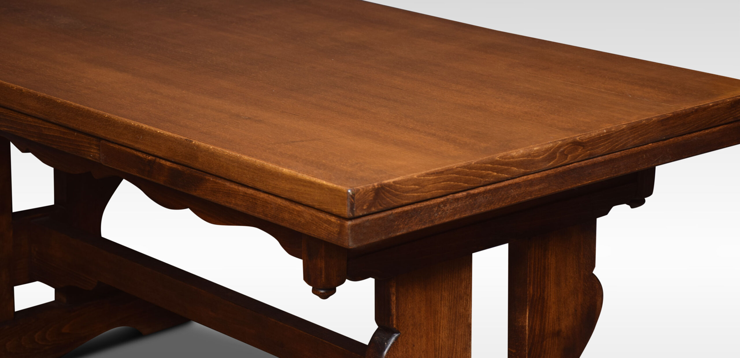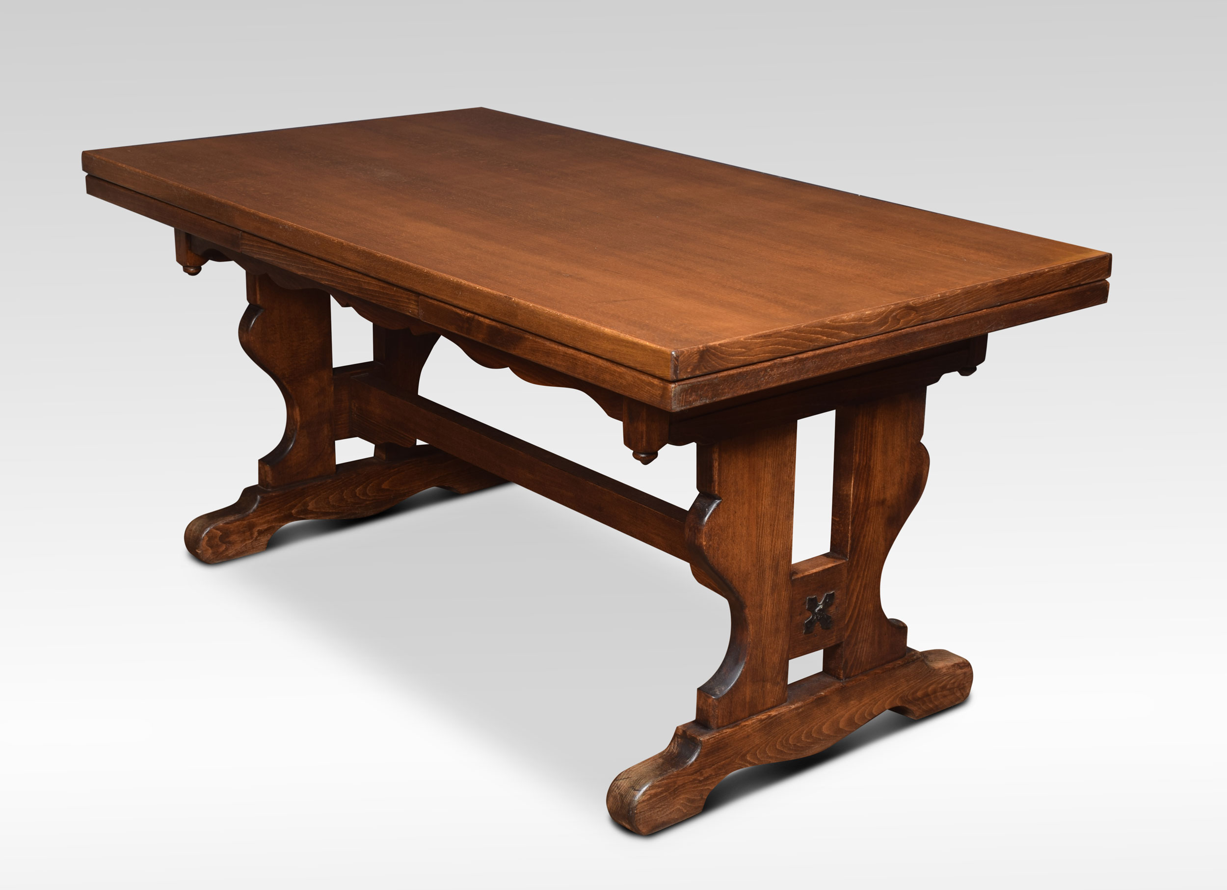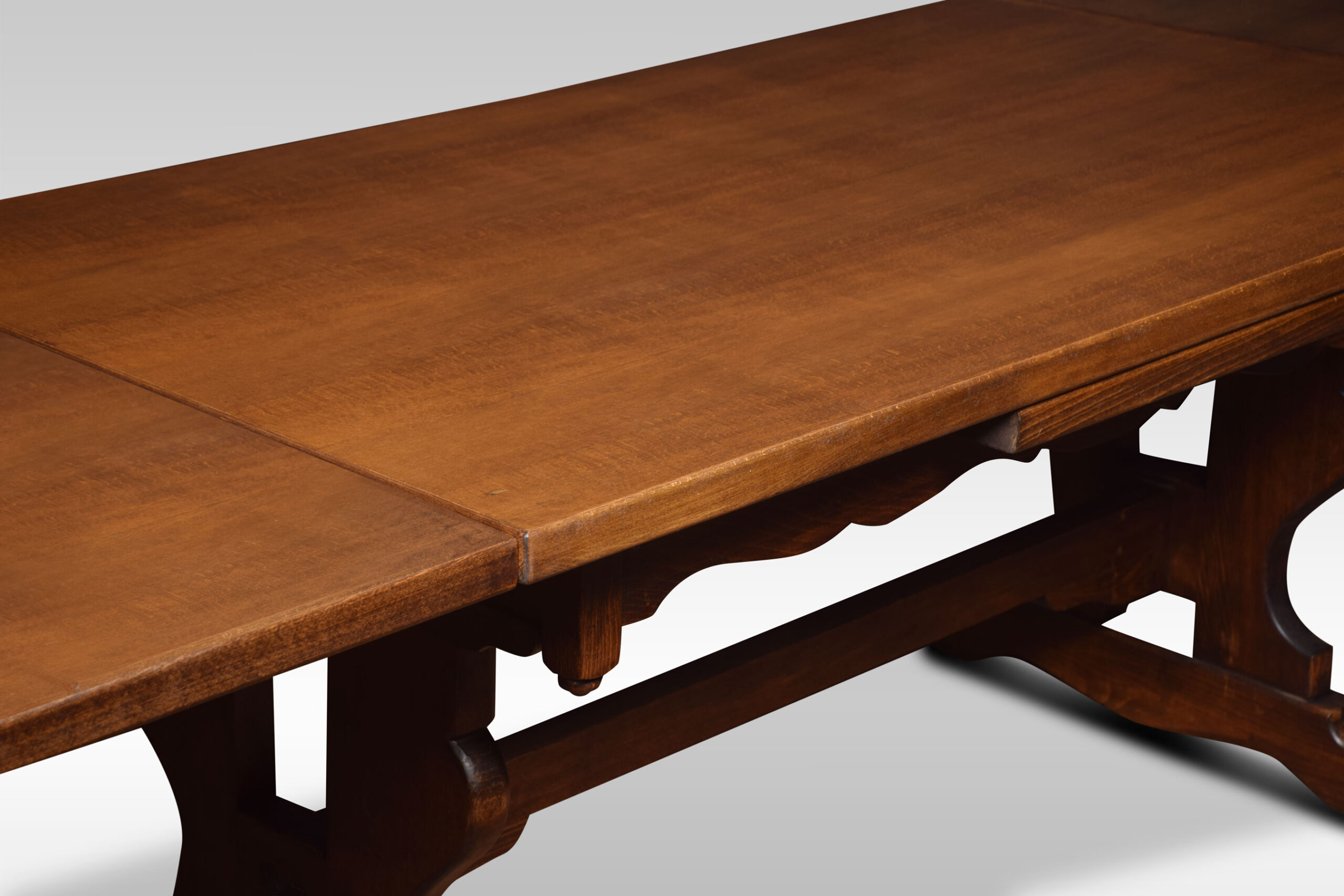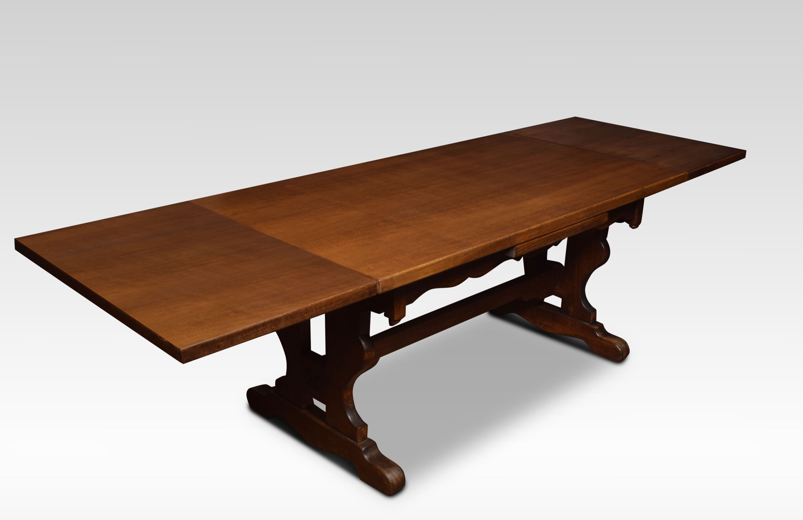 Oak draw leaf refectory table, the rectangular oak top above two pull out ends, above platform scrolling end supports united by stretcher.