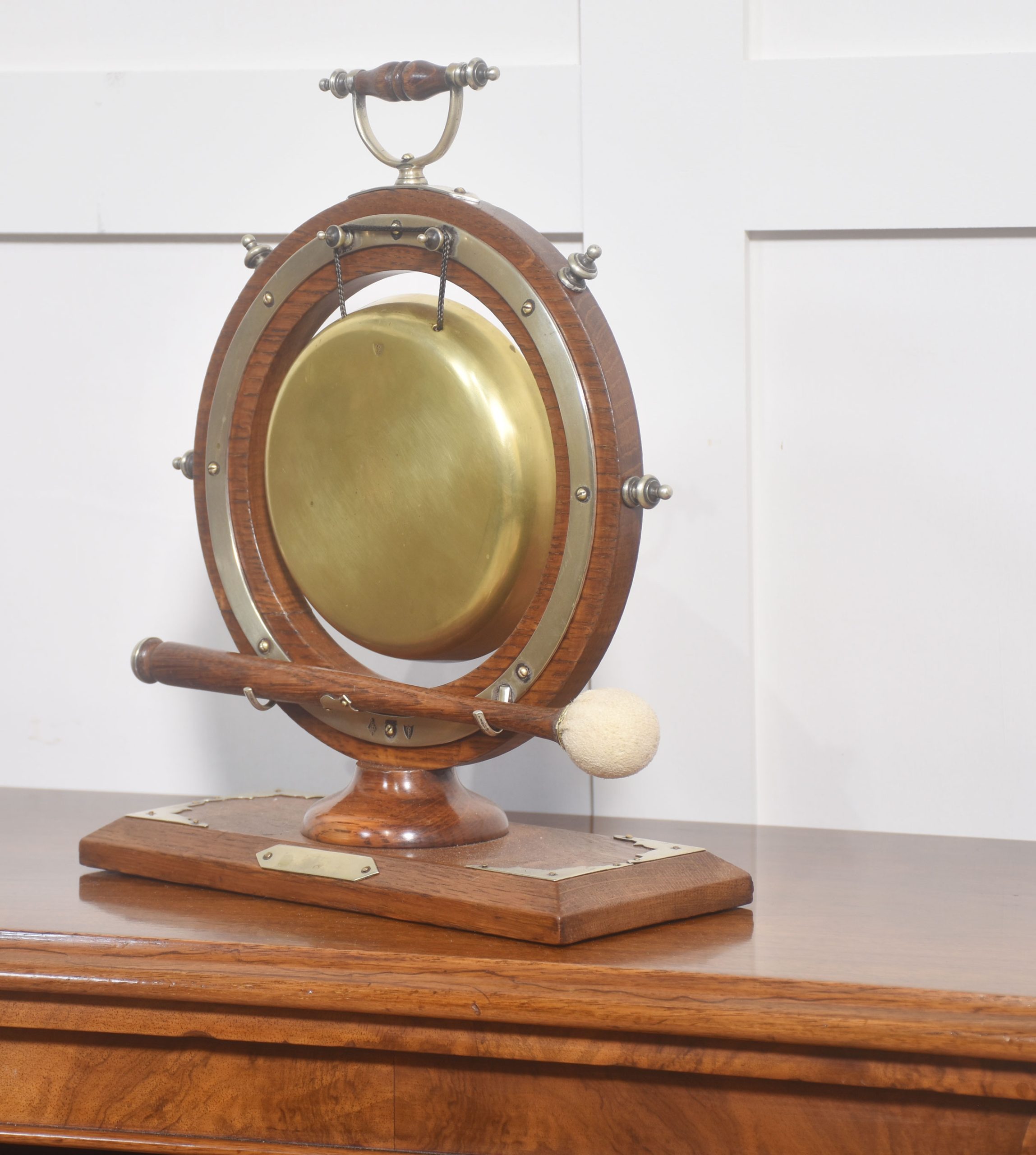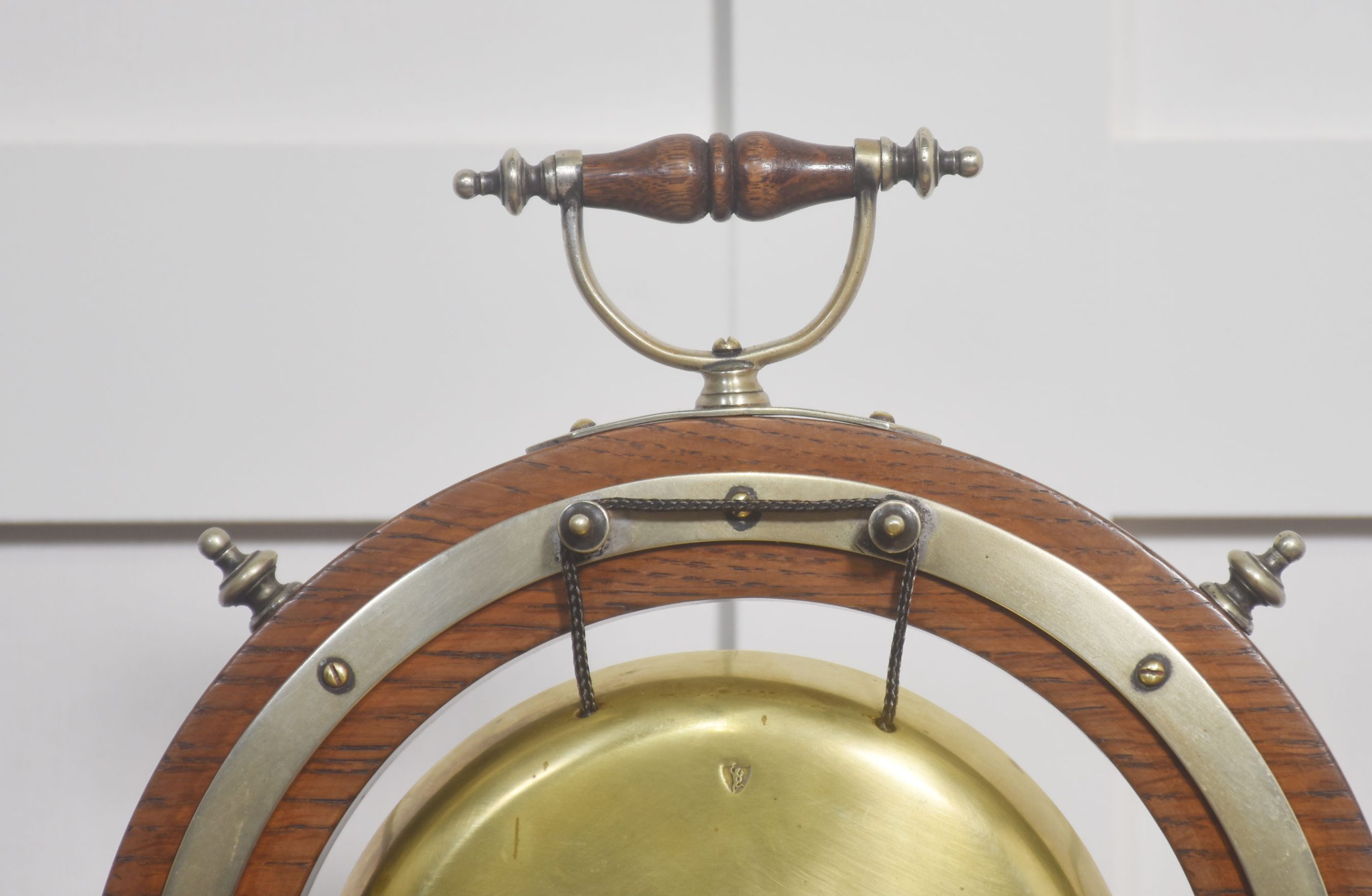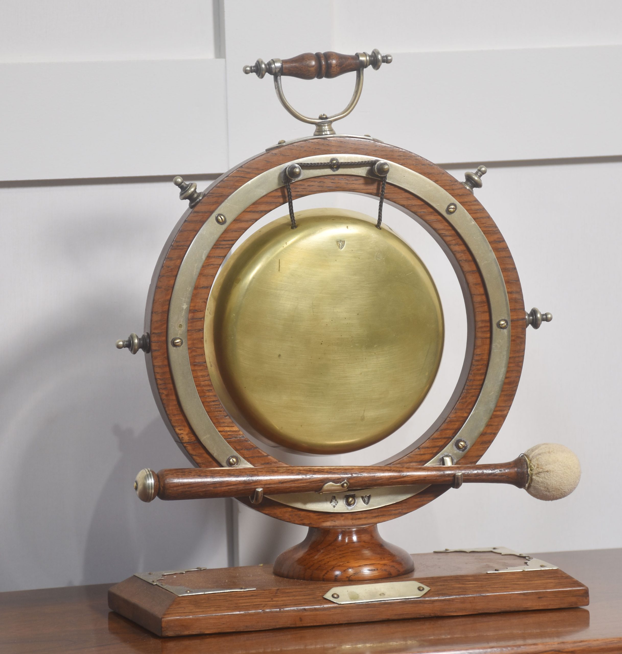 Oak-framed nautical dinner gong in the form of a ship’s wheel, having turned carrying handle above the original brass gong raised on a plinth base.
