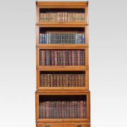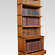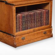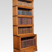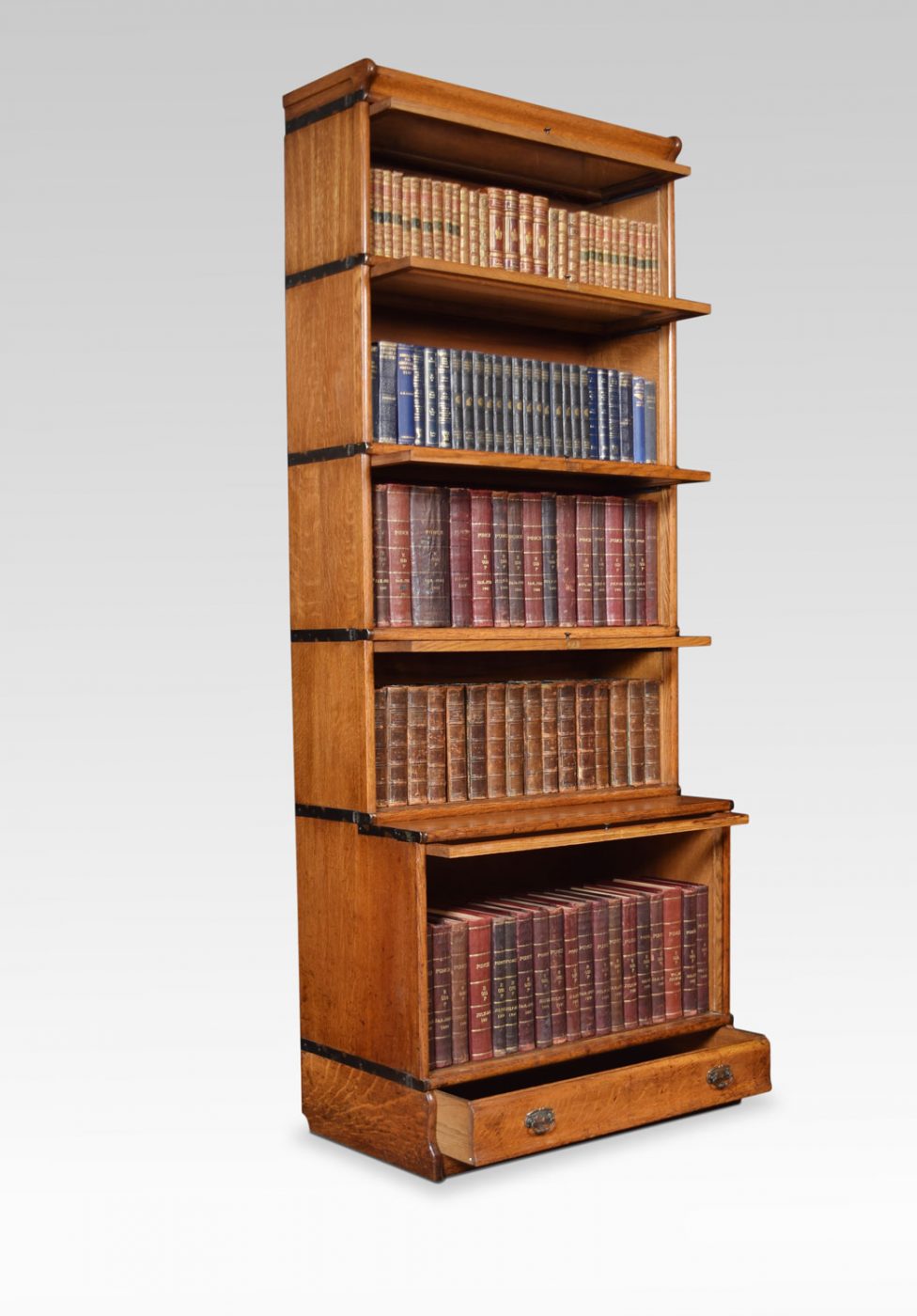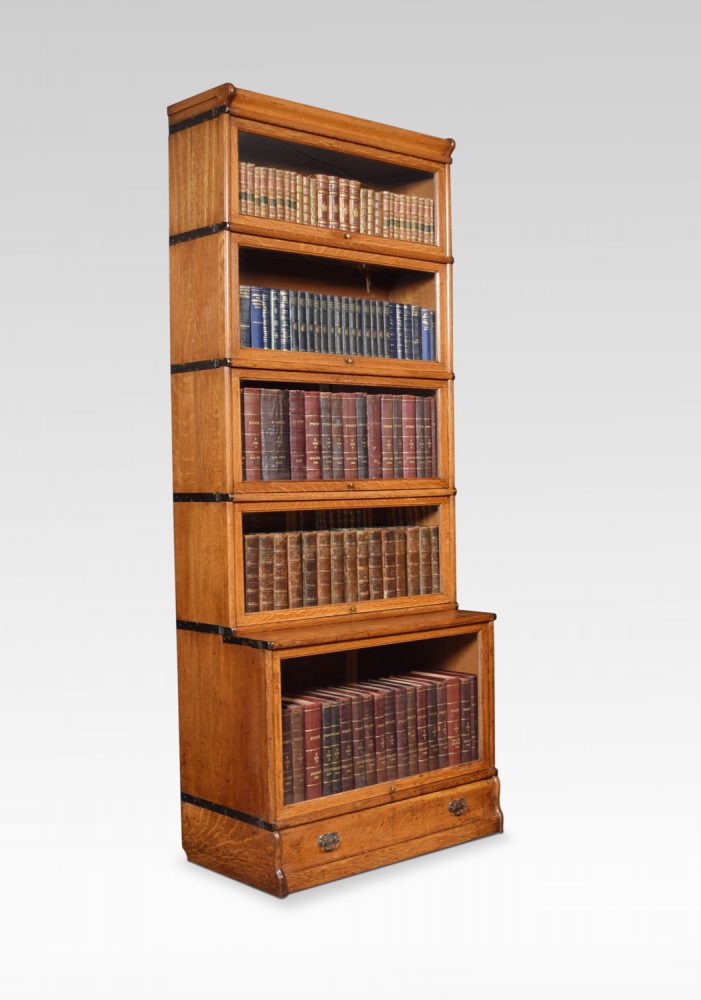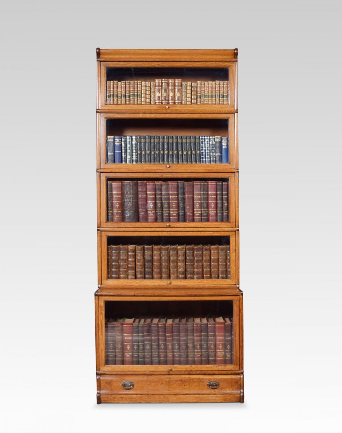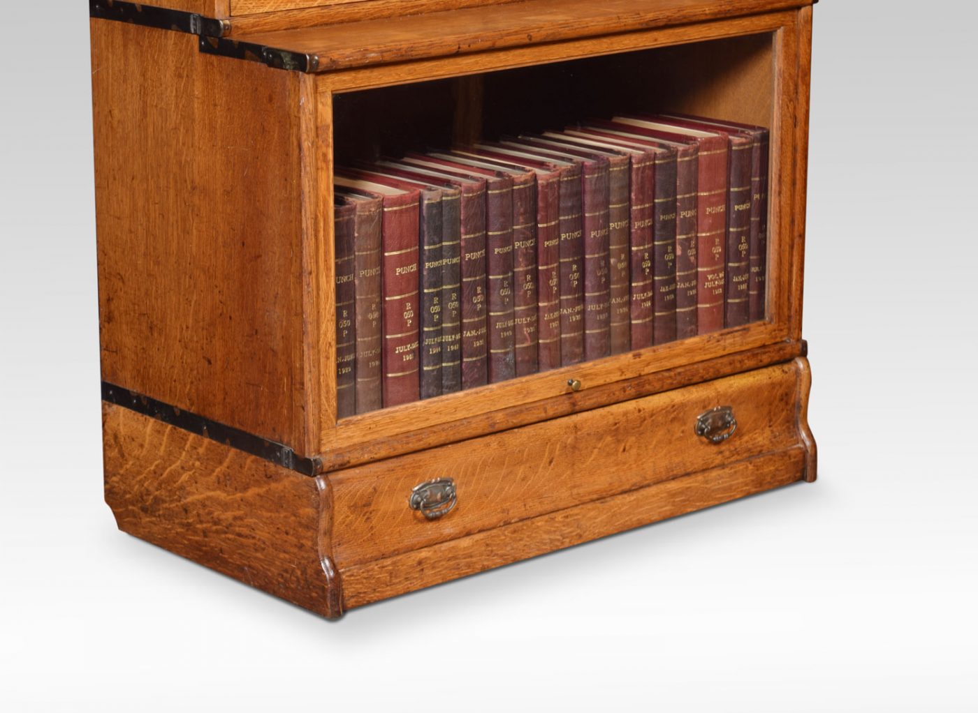 Oak five section bookcase, the moulded top above five graduated section fitted with glazed doors. All raised up on a plinth base with single long draw.