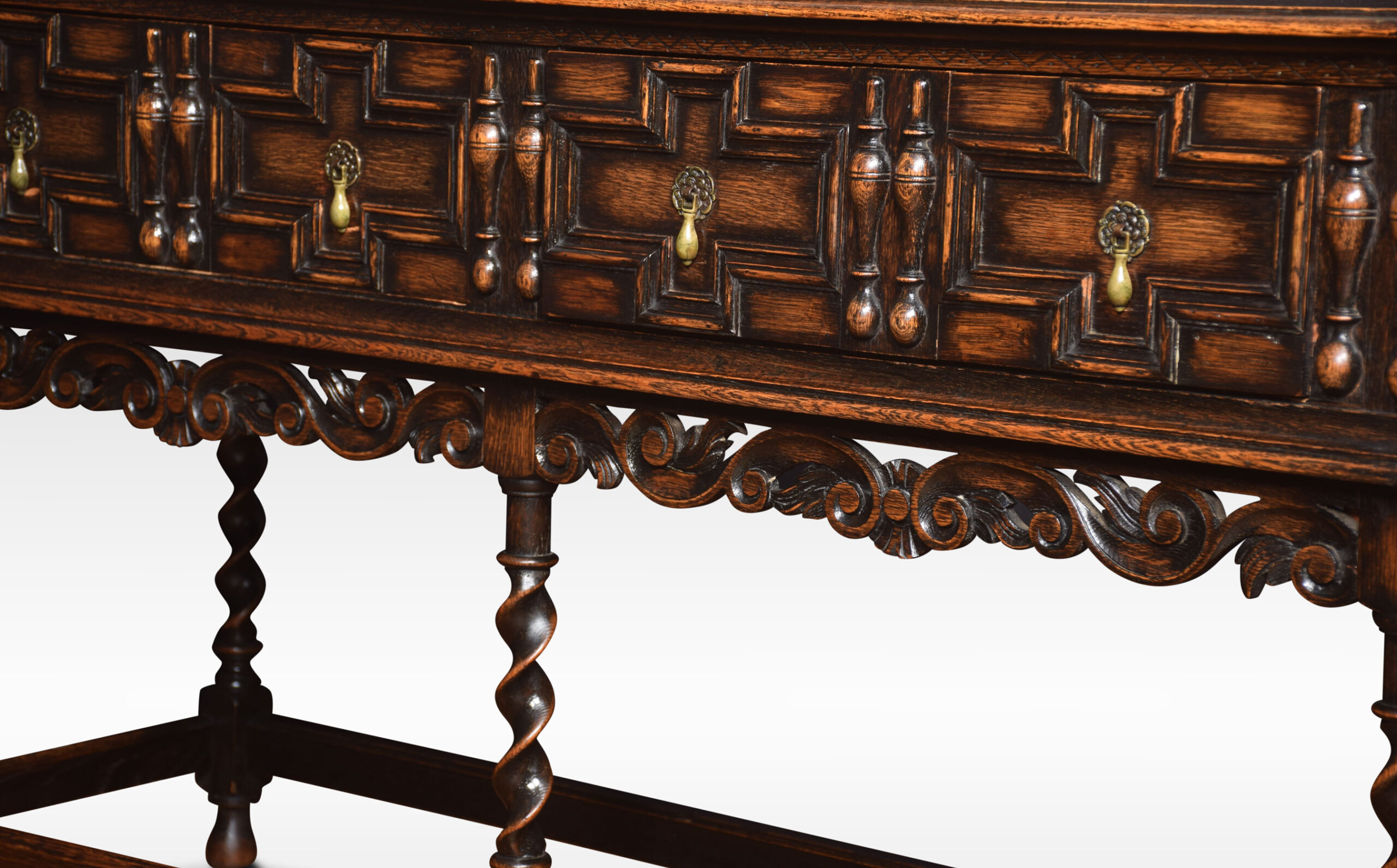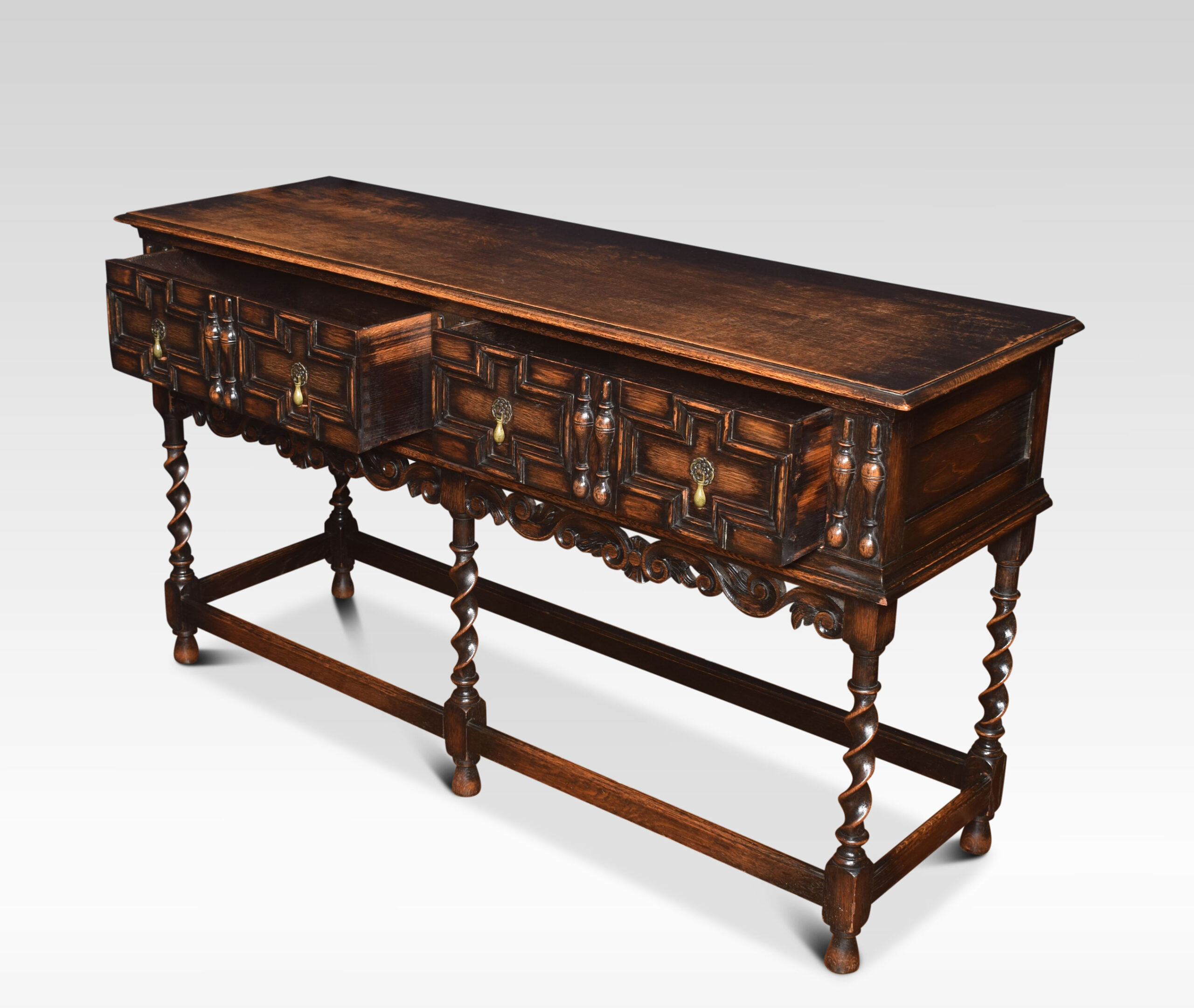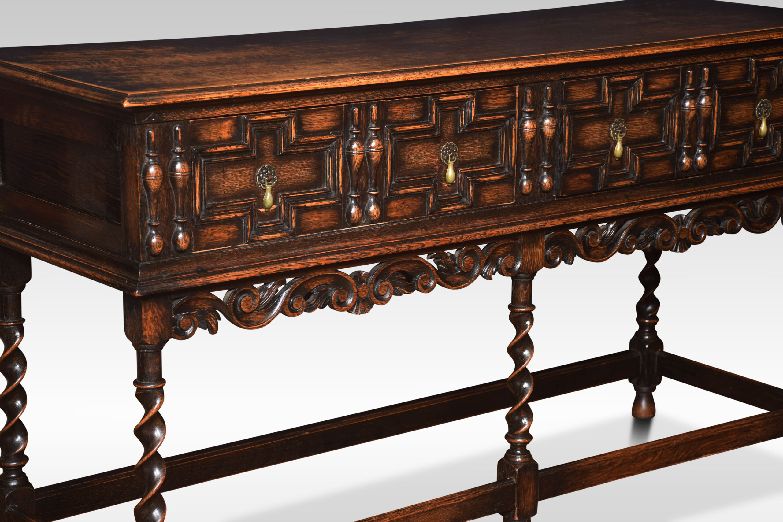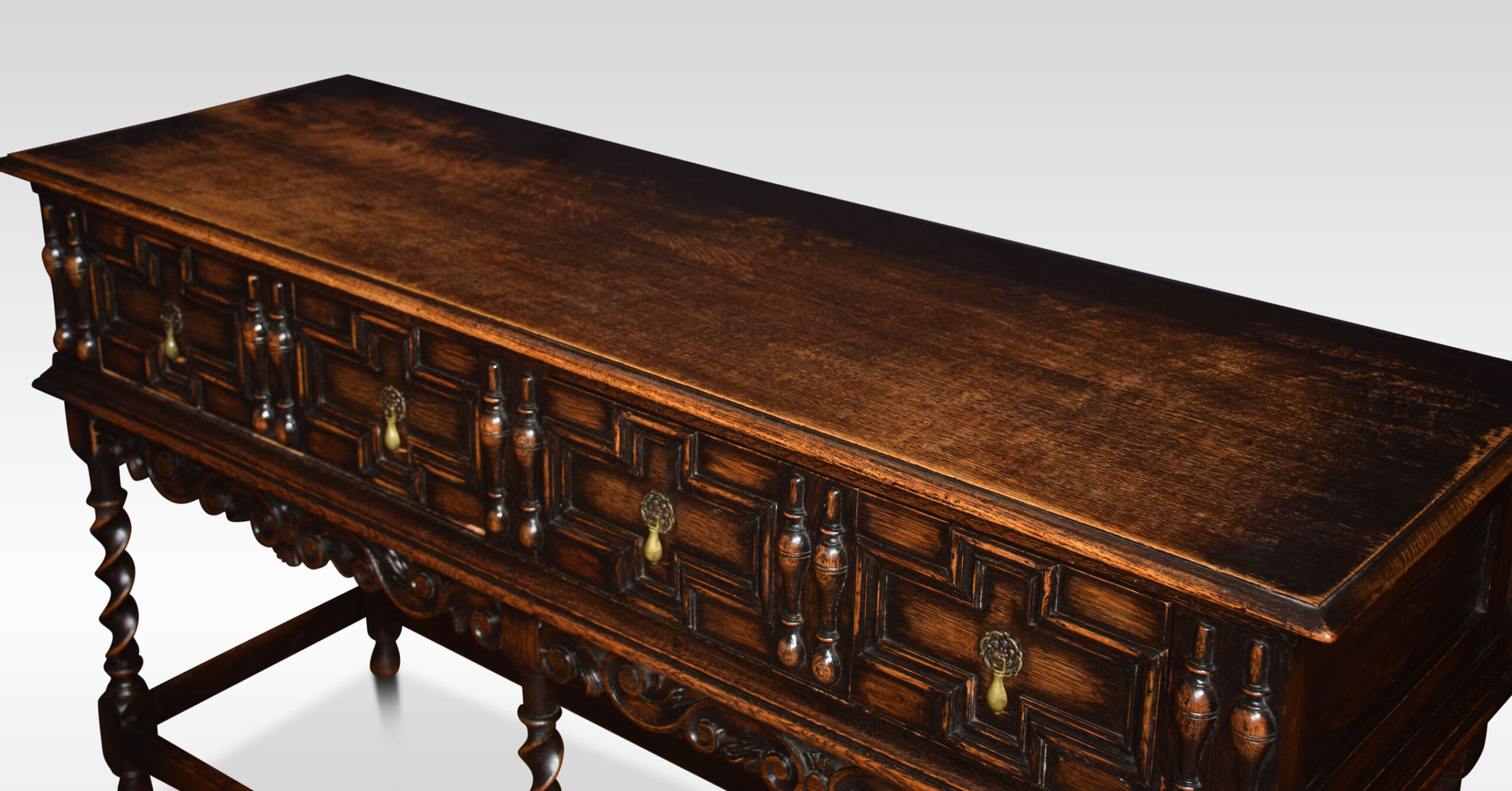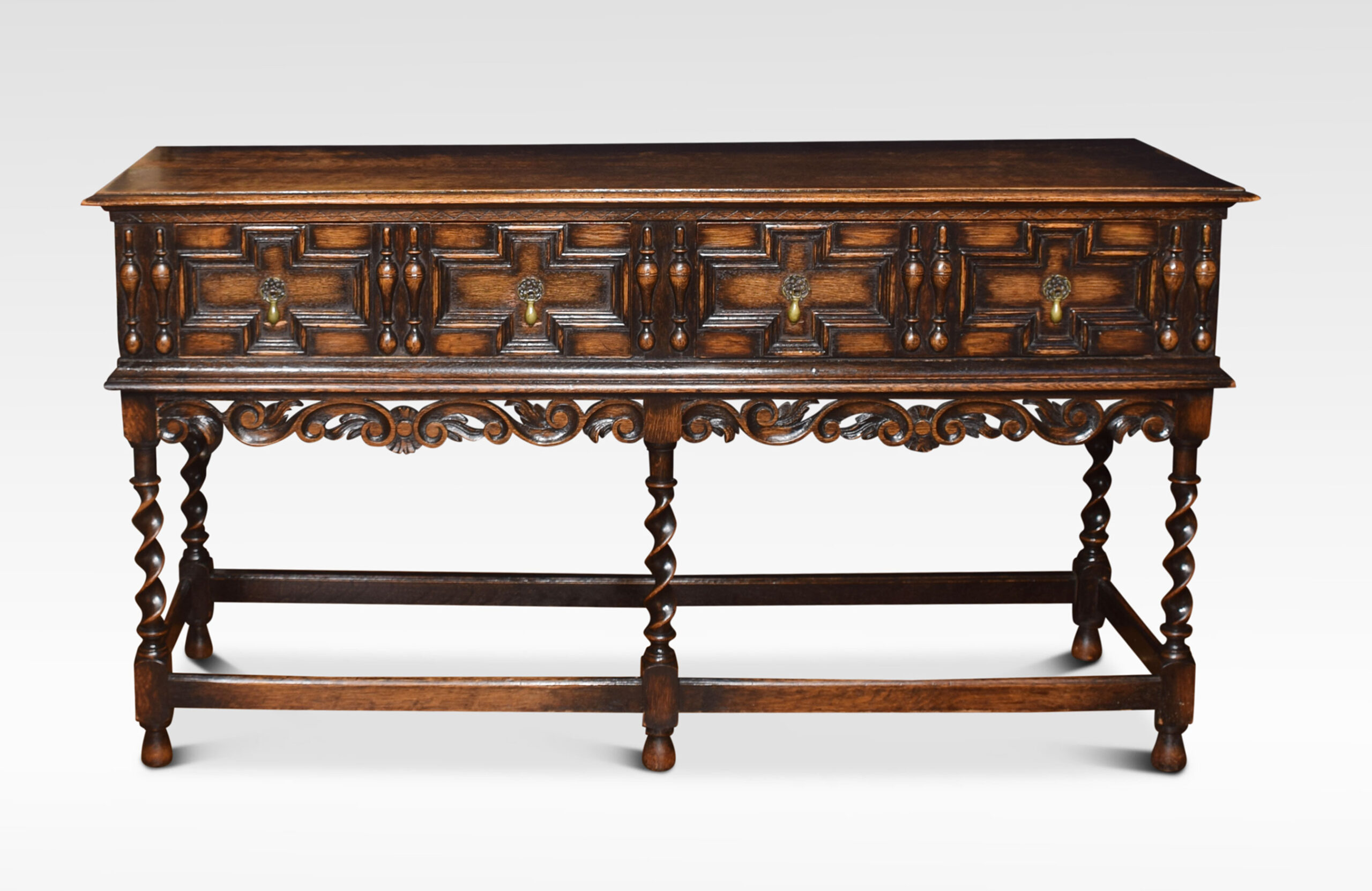Early 20th-century oak sideboard of Jacobean design, the large rectangular top with moulded edge above four freezes drawers with brass drop handles. All raised up on barley twist supports united by stretchers.