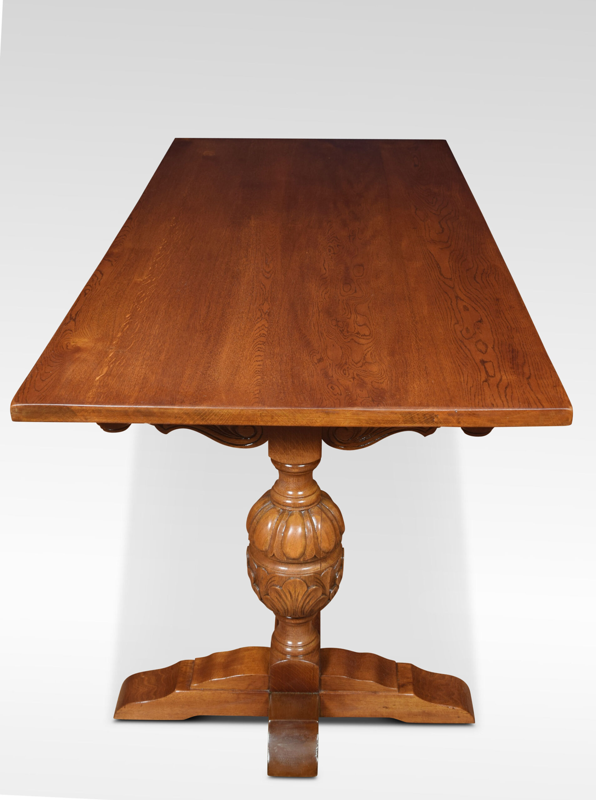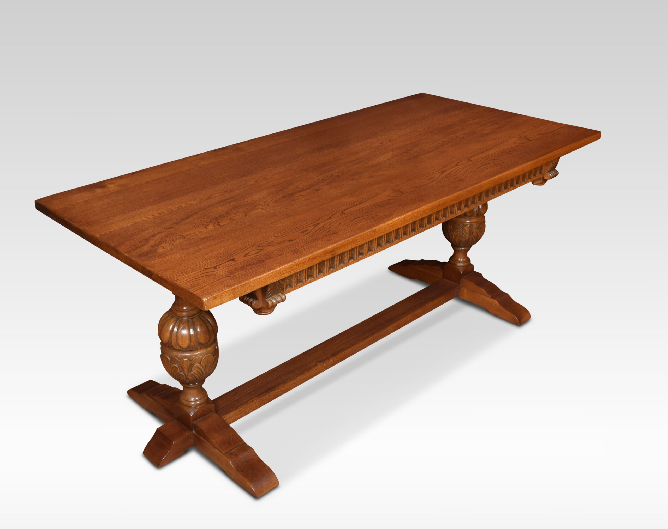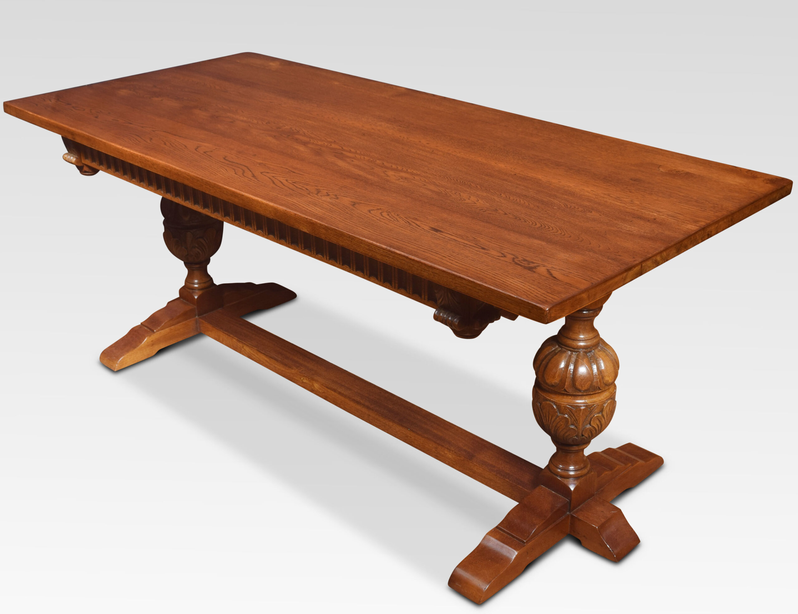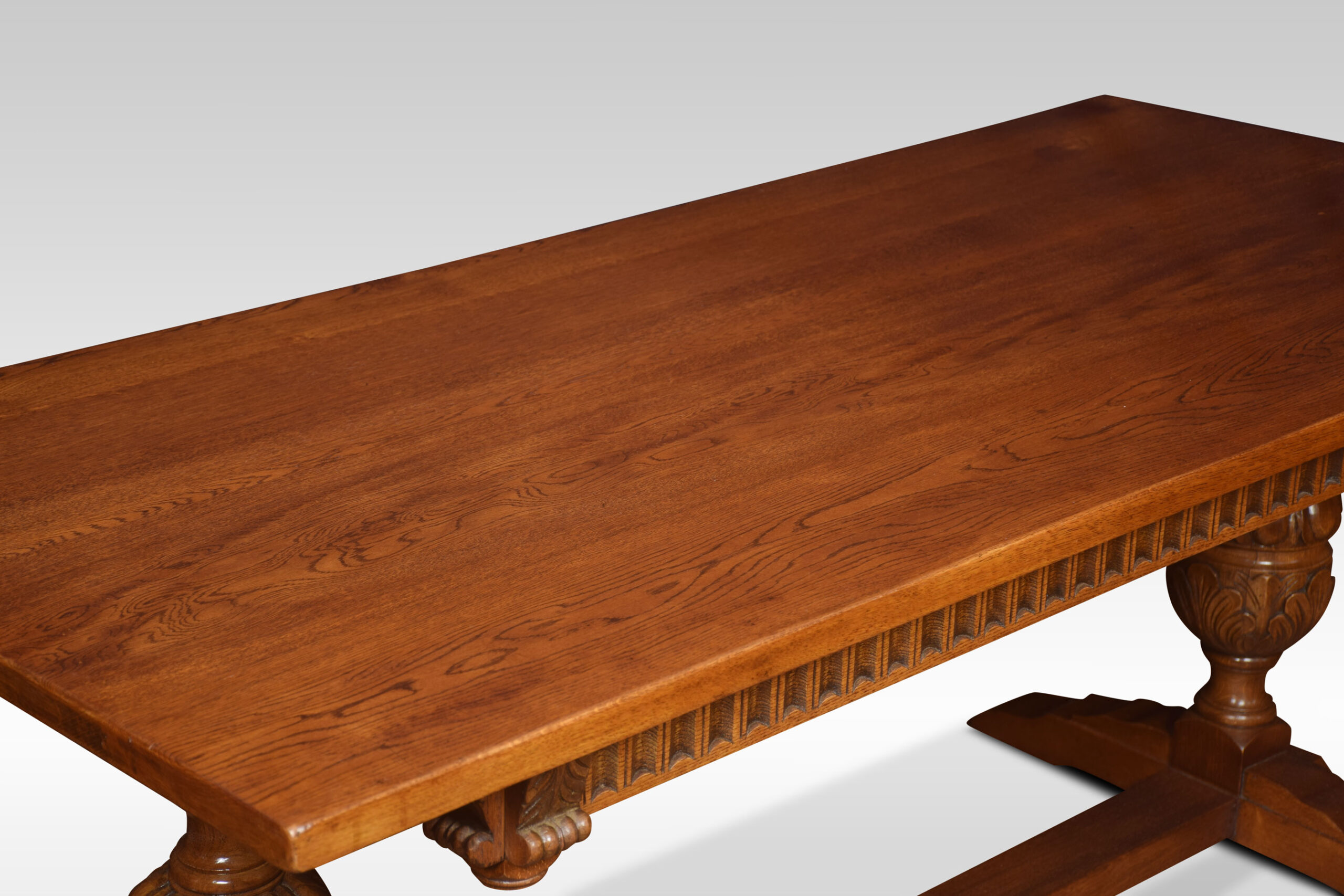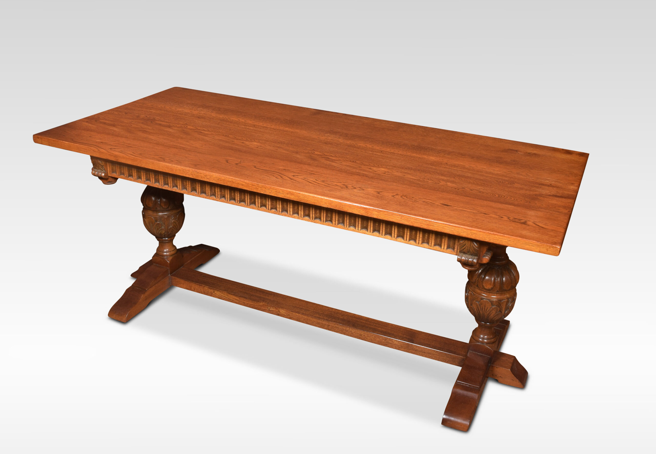 Oak refectory table, the rectangular solid oak top. Above carved bulbous cup and cover supports united by a stretcher.