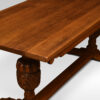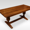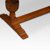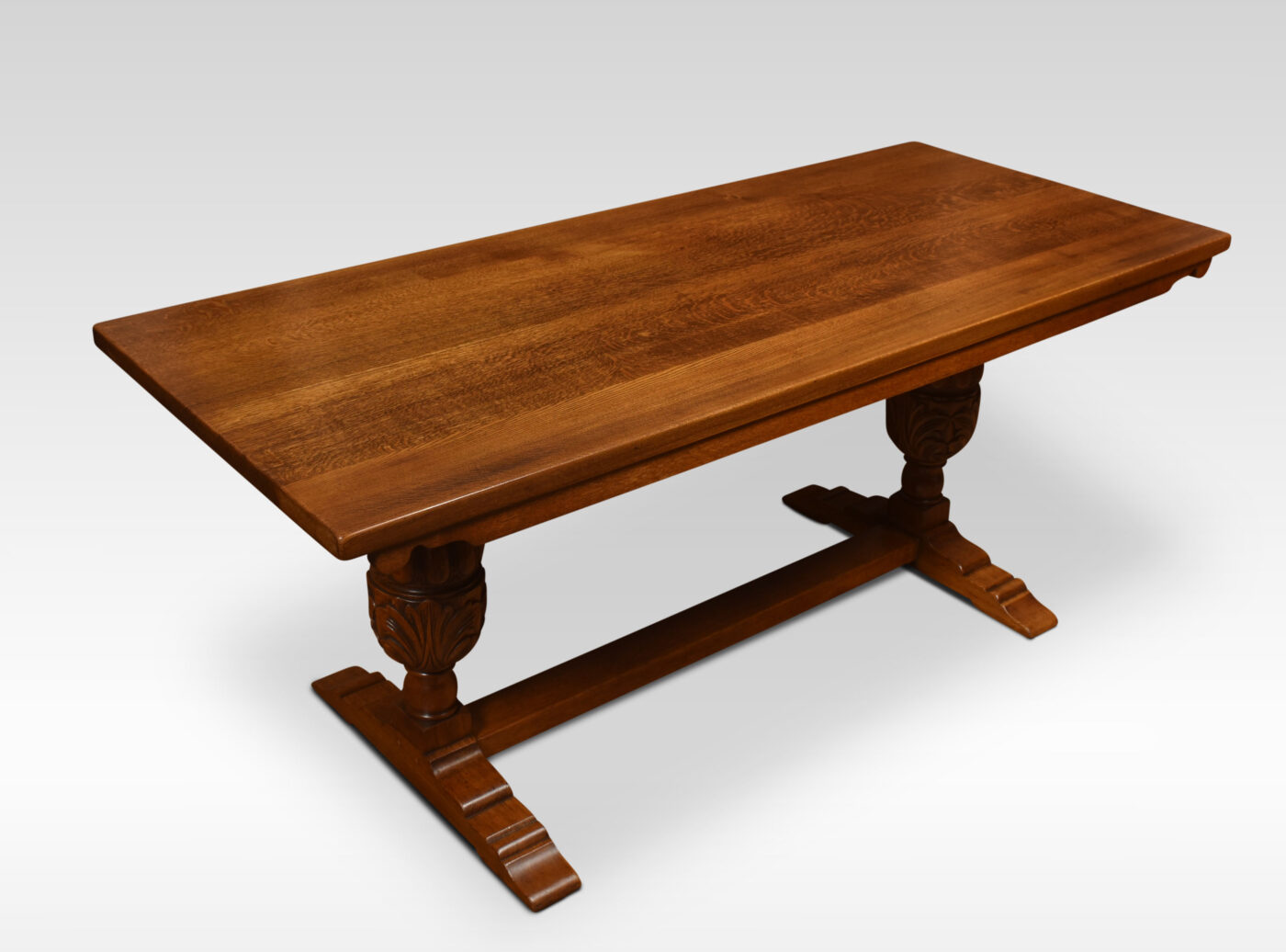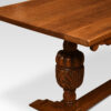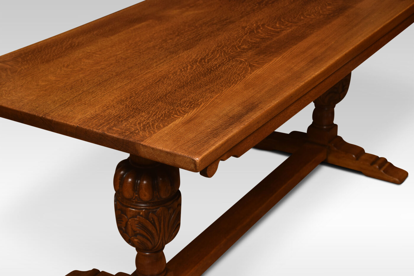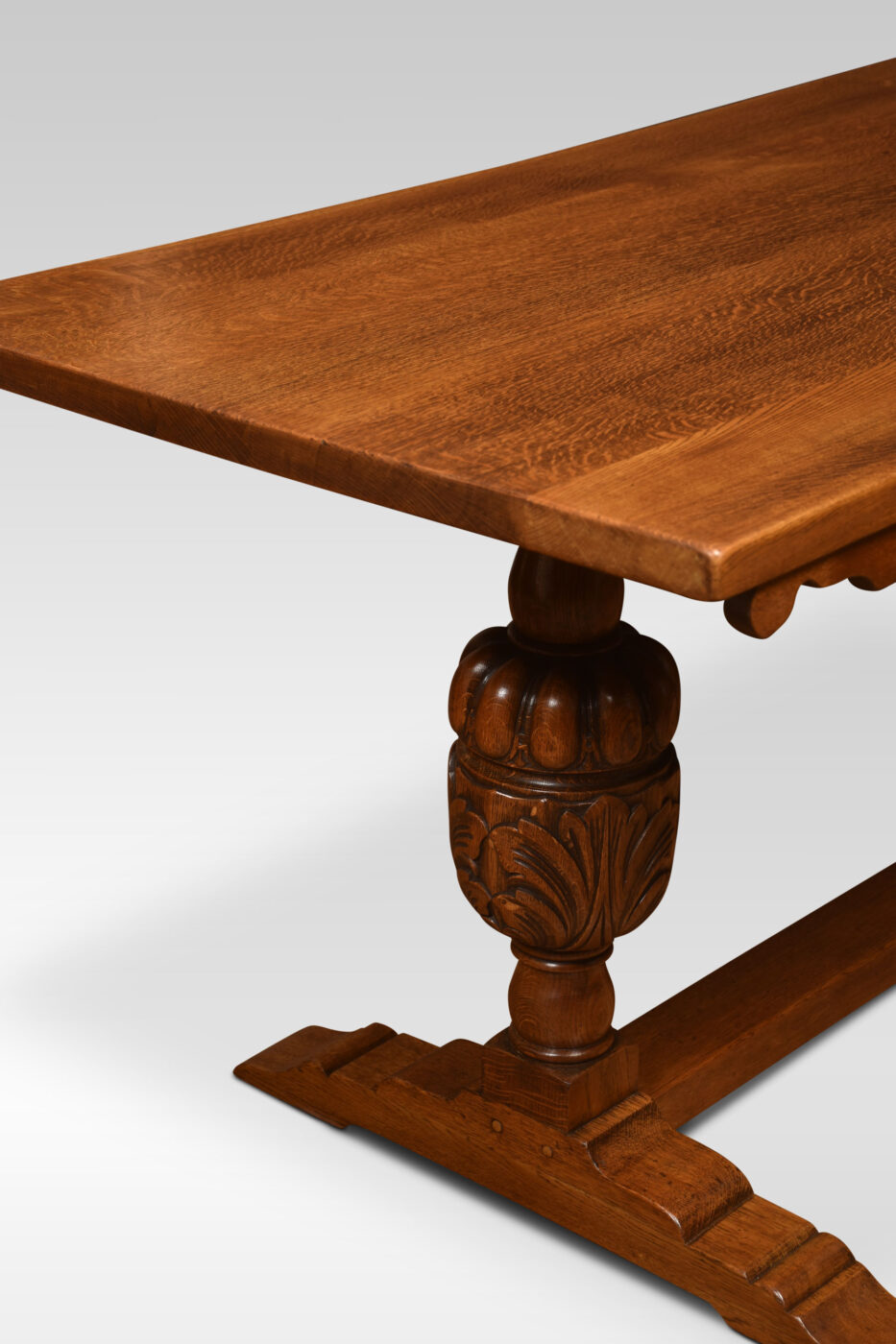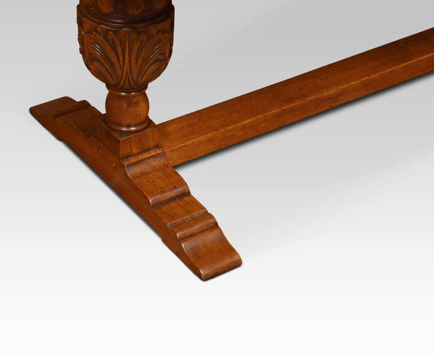 Oak refectory table, the rectangular solid oak top. Above carved bulbous cup and cover supports united by a stretcher.