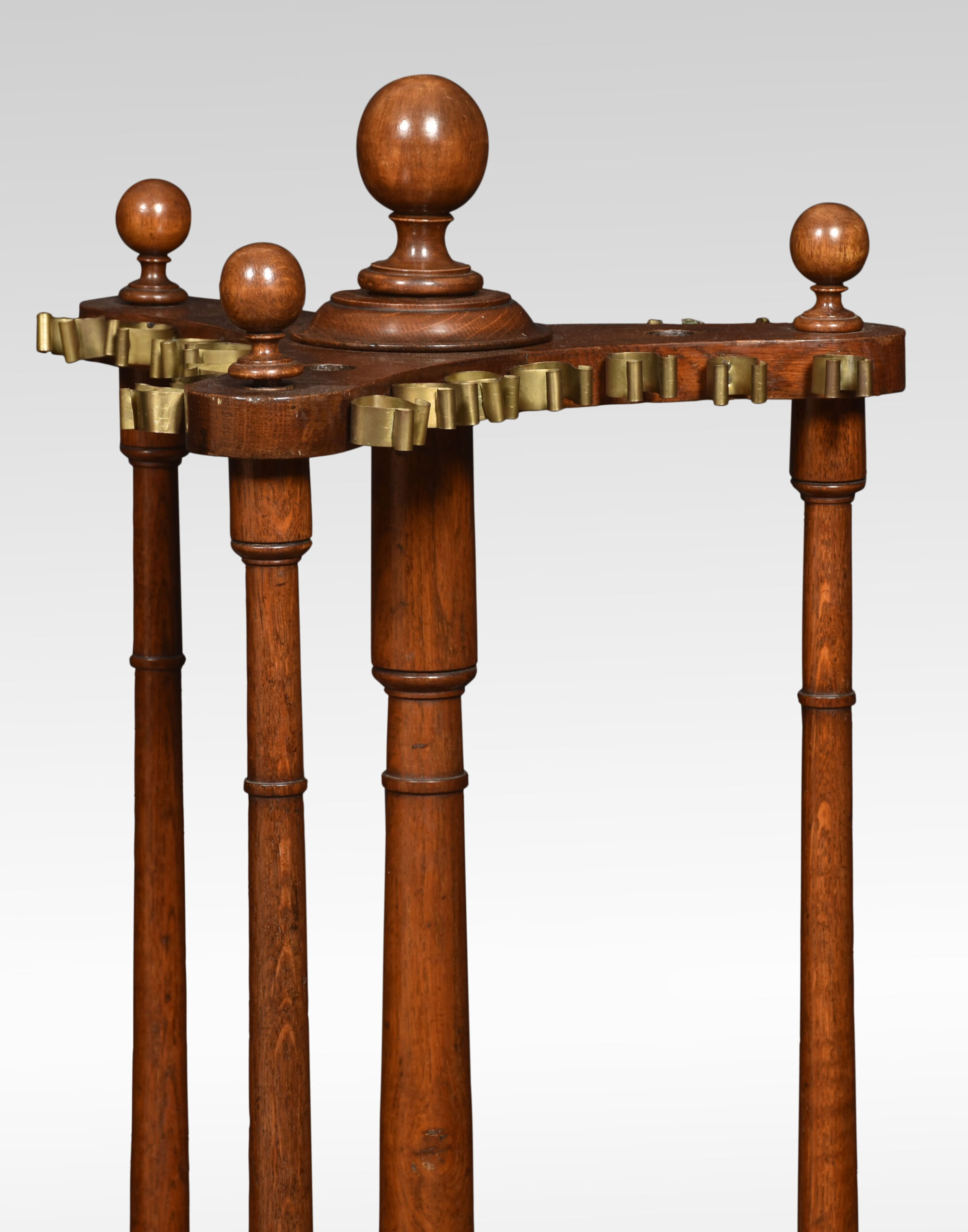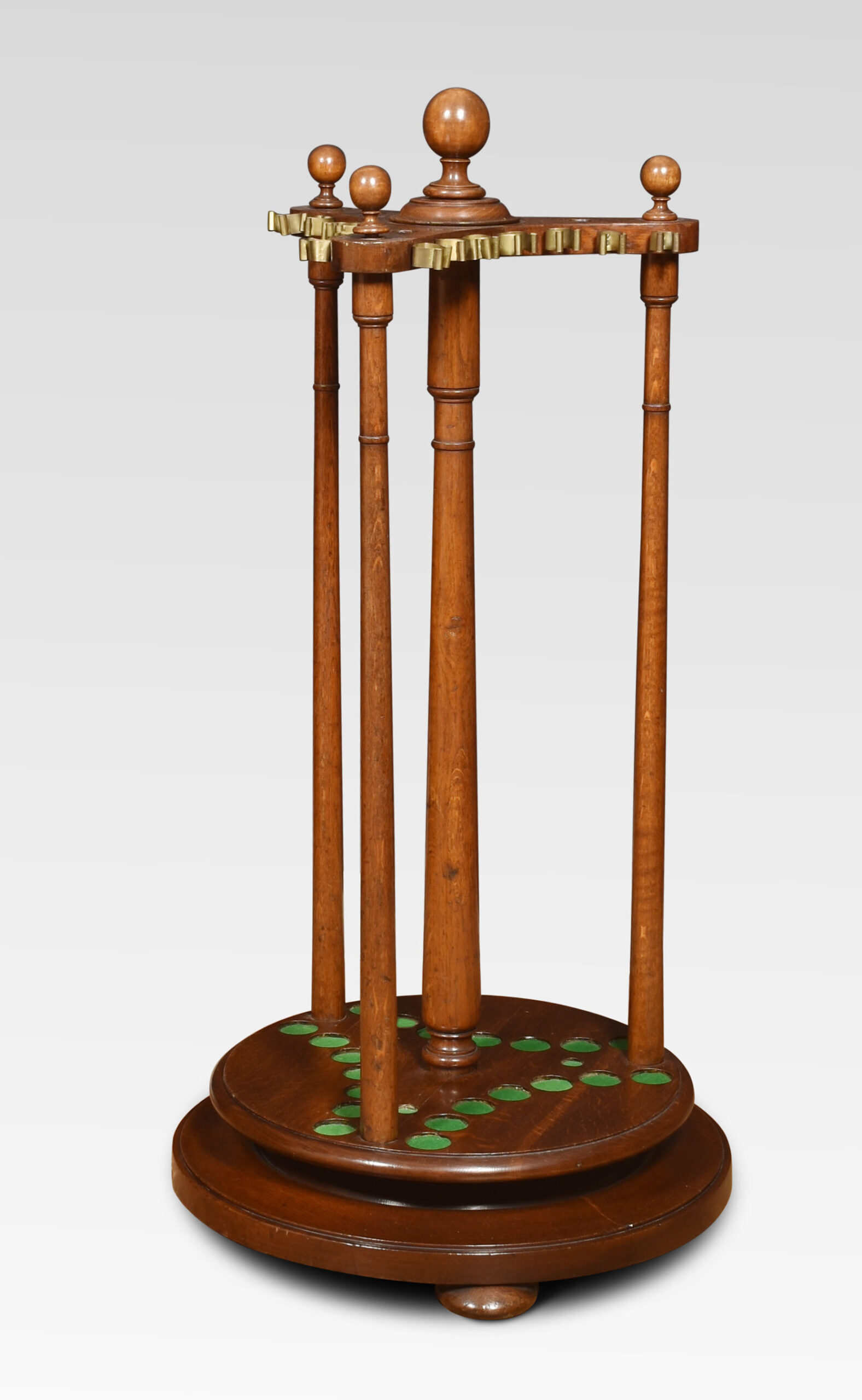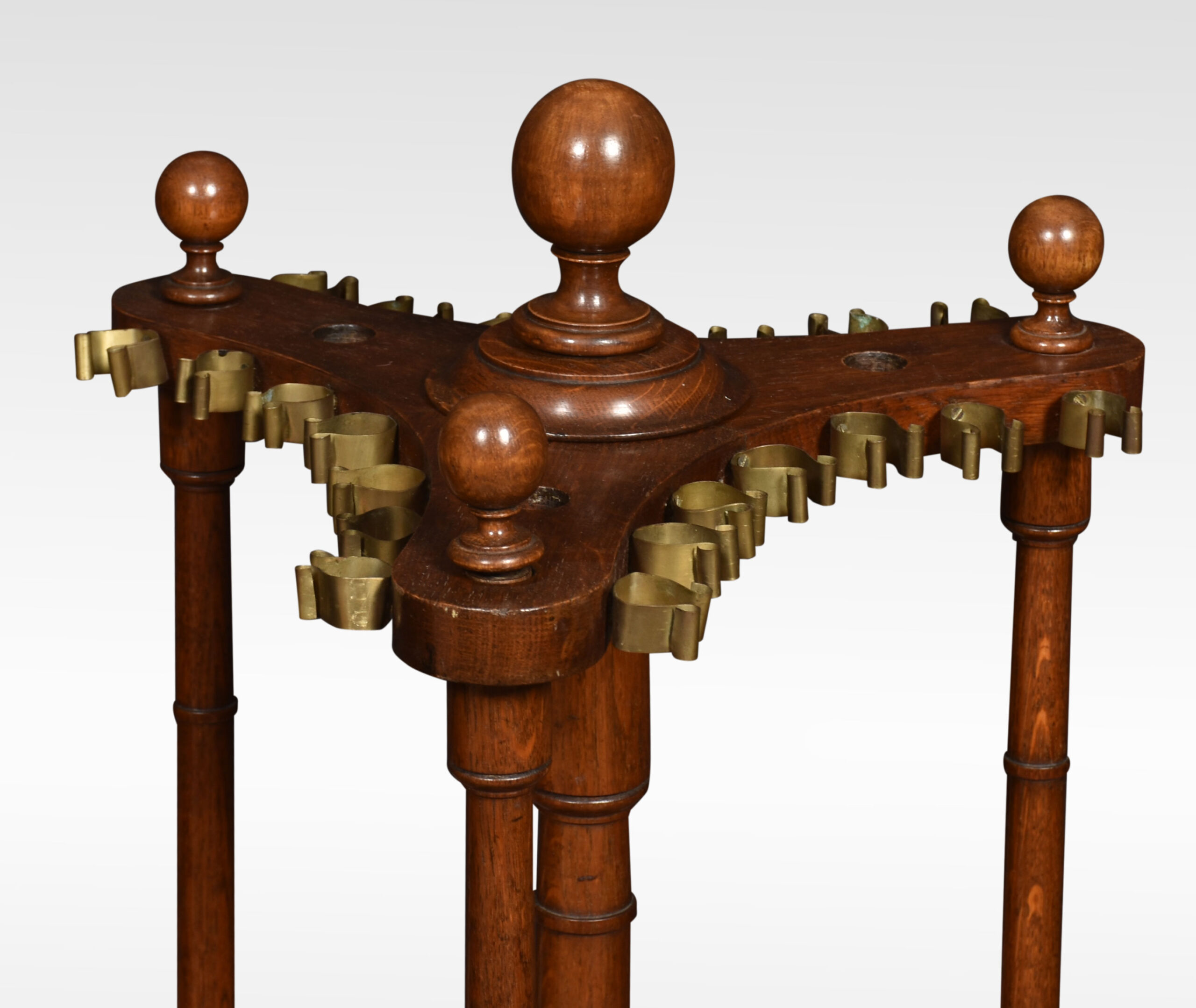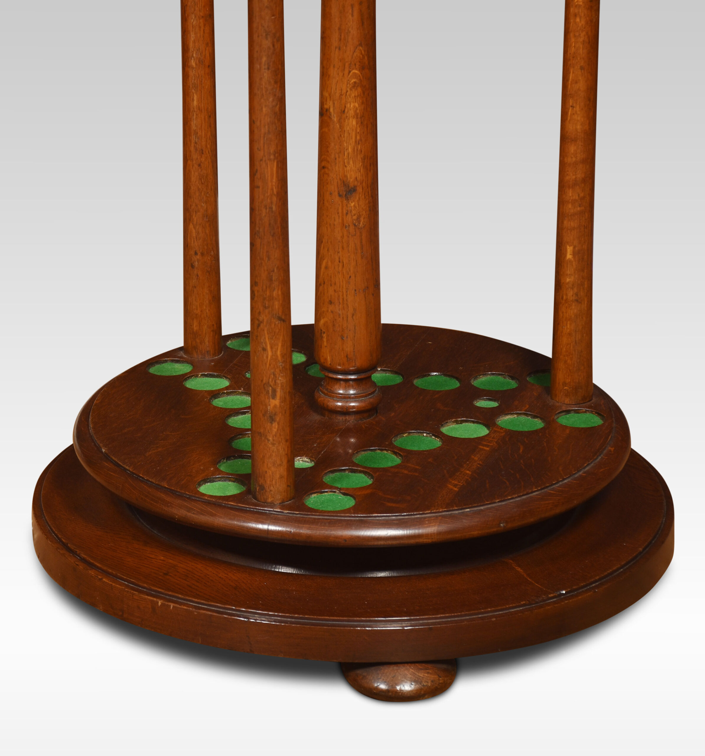 Oak cue stand, having central turned finial above cue rack accommodating 21 cues, all raised up on turned pillars and stepped base terminating in bun feet.