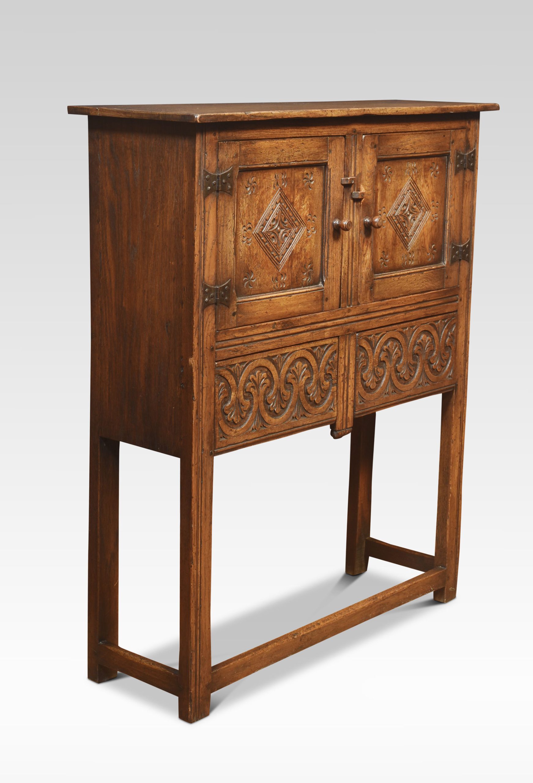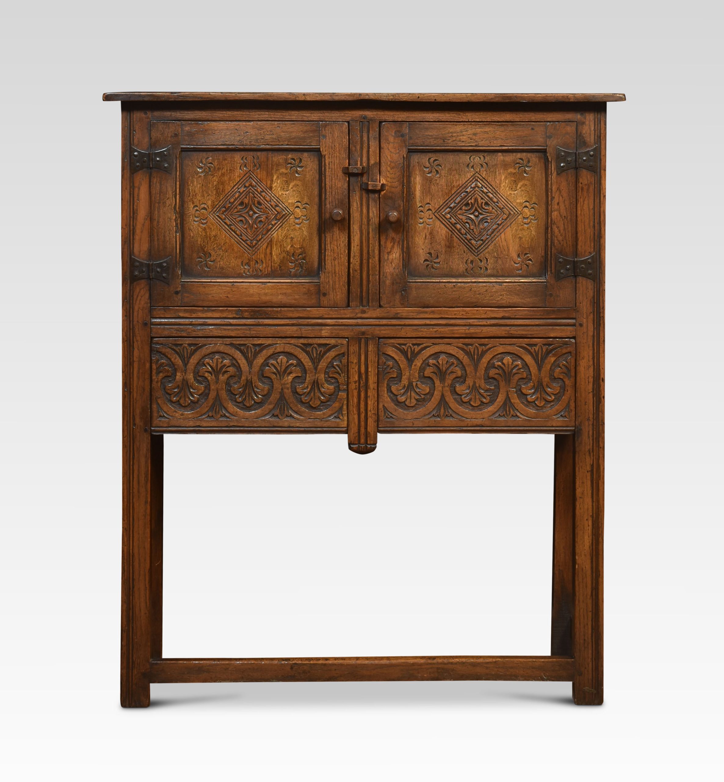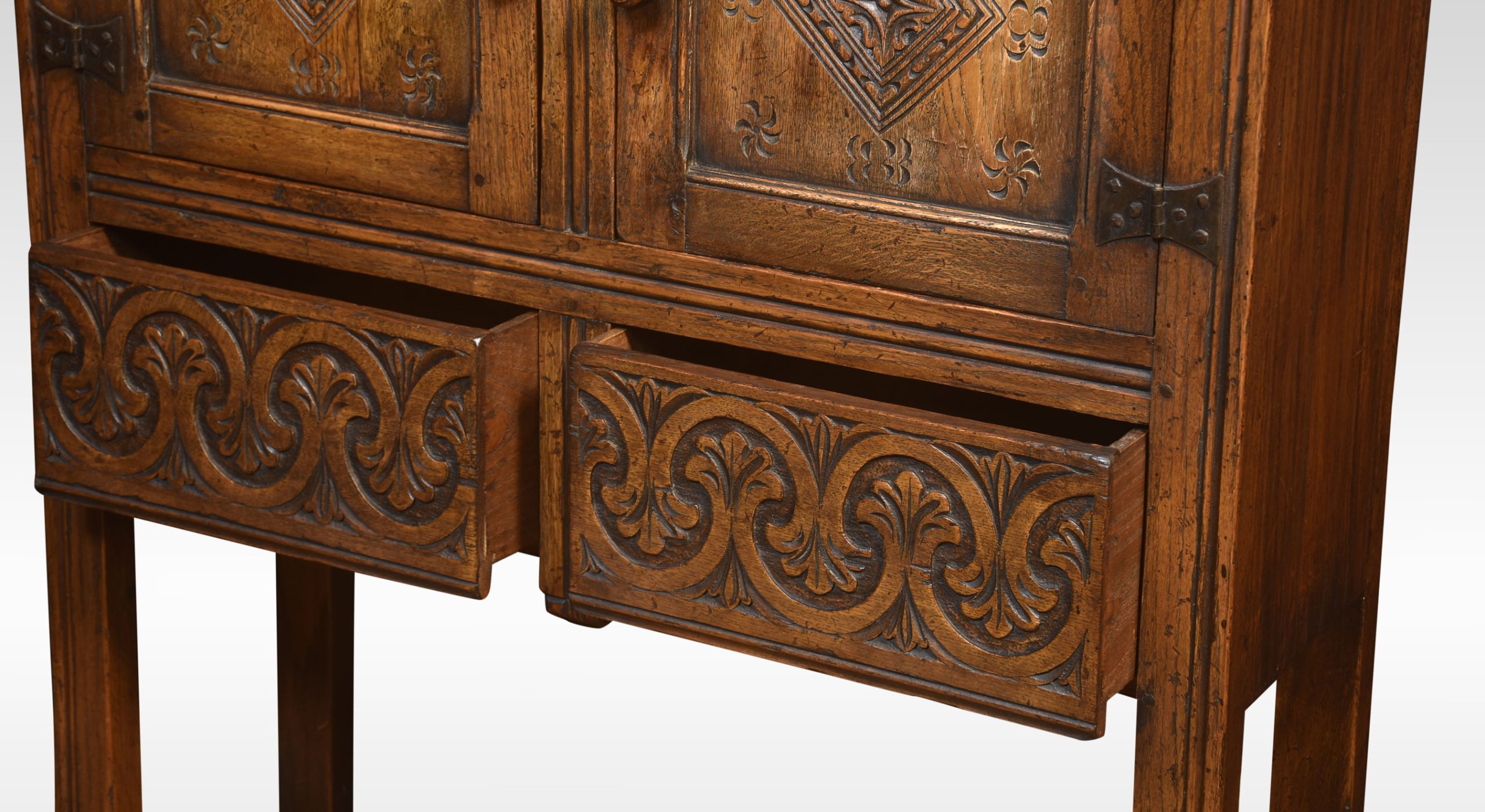 Oak cabinet the molded top above a pair of carved paneled doors with iron hinges, opening to reveal a large cupboard. The frieze is fitted with two drawers, all raised up on square supports united by stretchers.