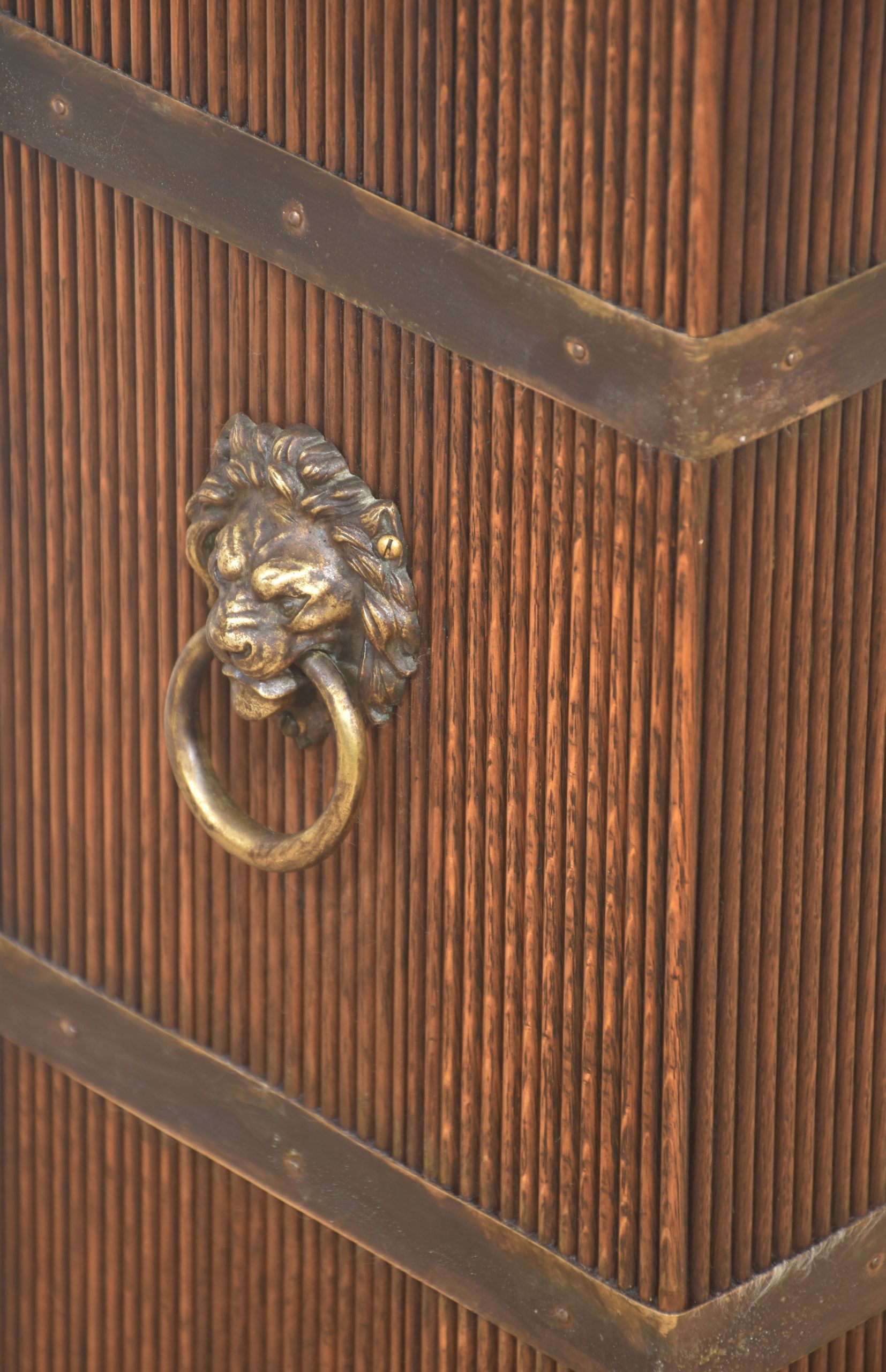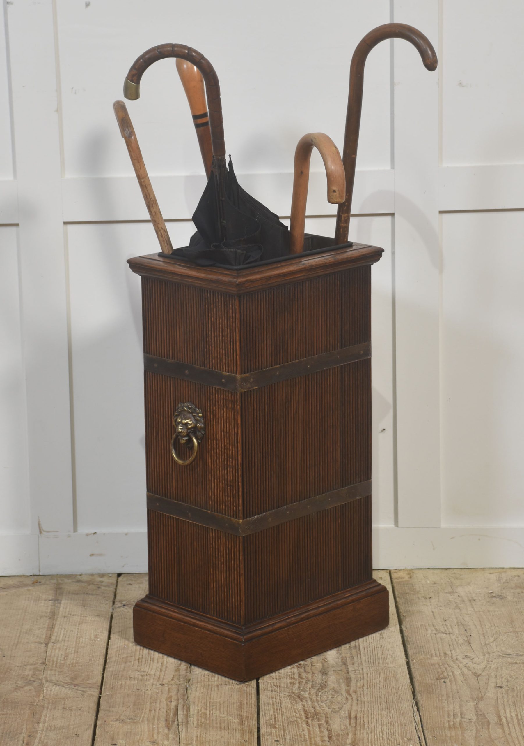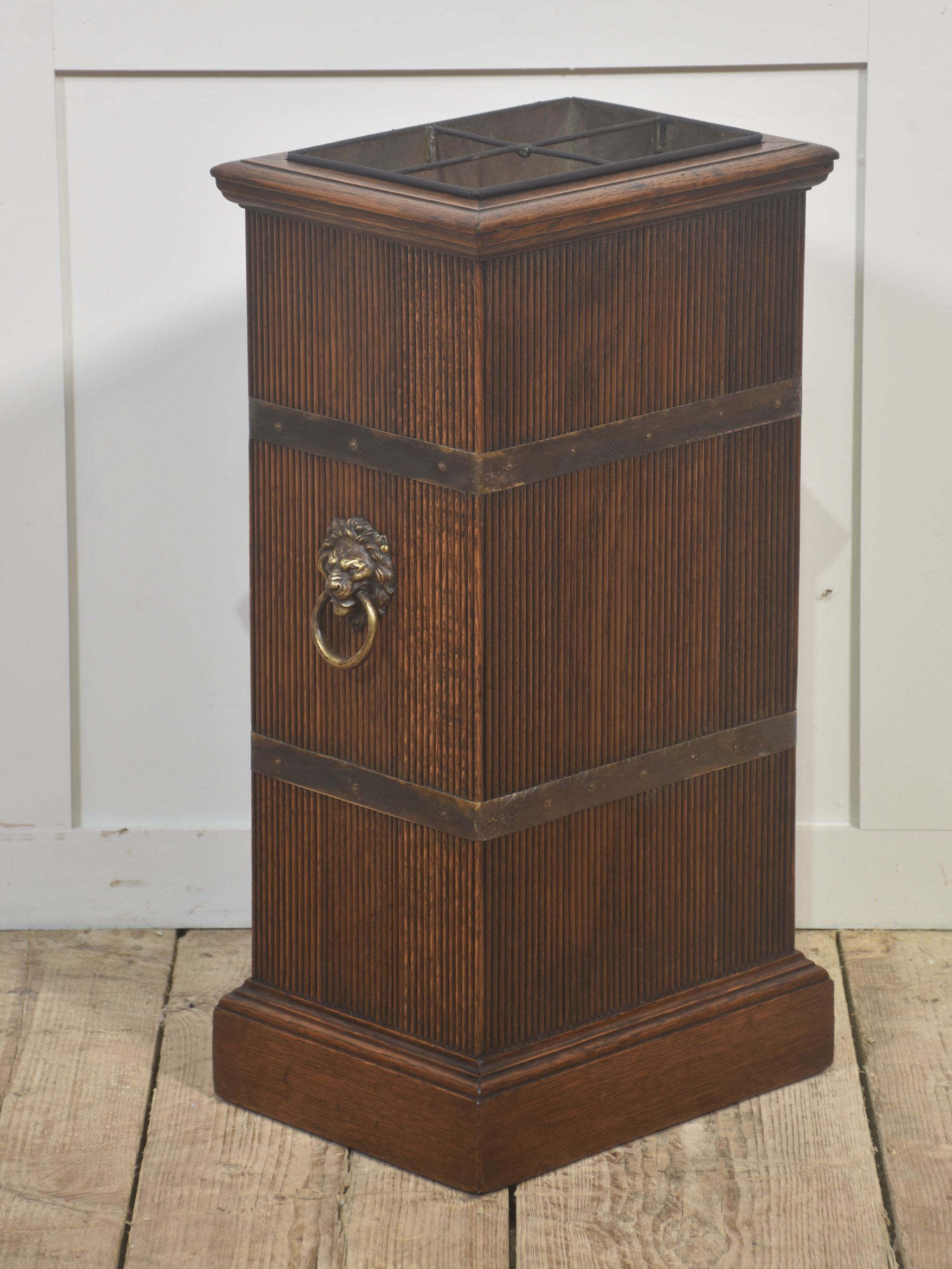A distinguished oak stick and umbrella stand, designed in a tall, four-sided form with finely reeded panelling on all faces. Two broad brass reinforcement bands encircle the body, each set with small rivets that give the piece a subtle industrial elegance. The standout feature is the cast-brass lion-mask mount on the front, complete with a hinged ring—an iconic decorative motif that adds grandeur and presence.