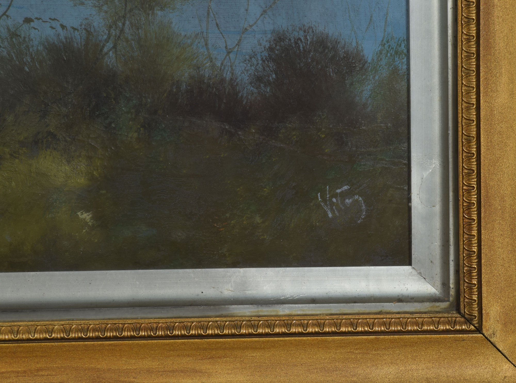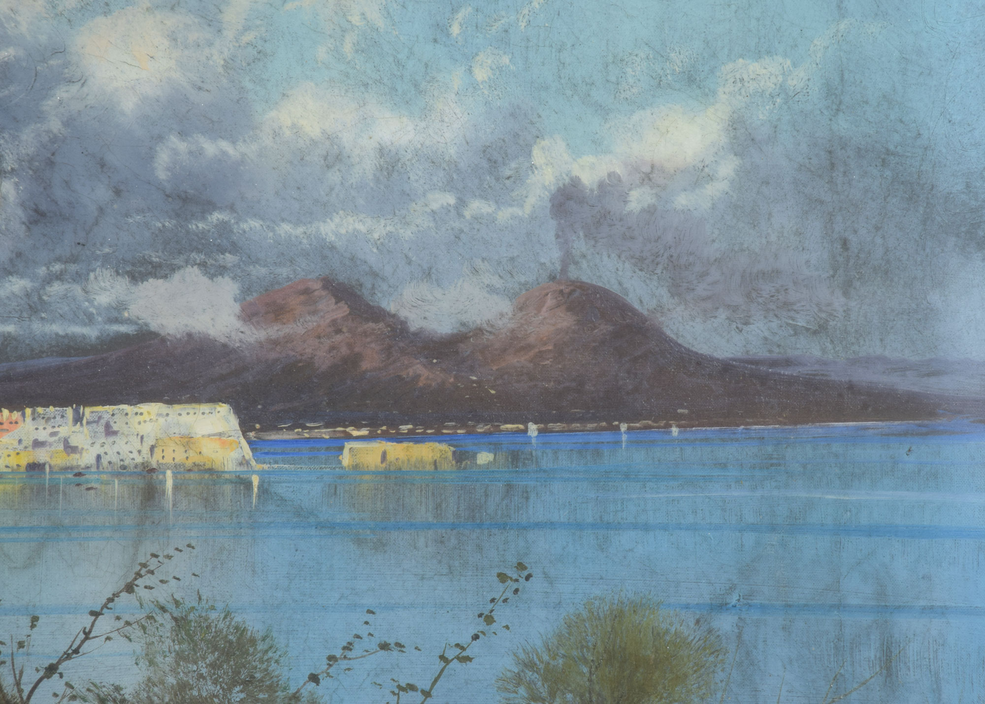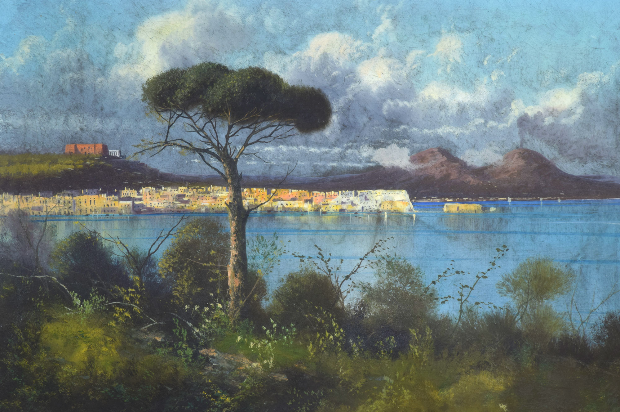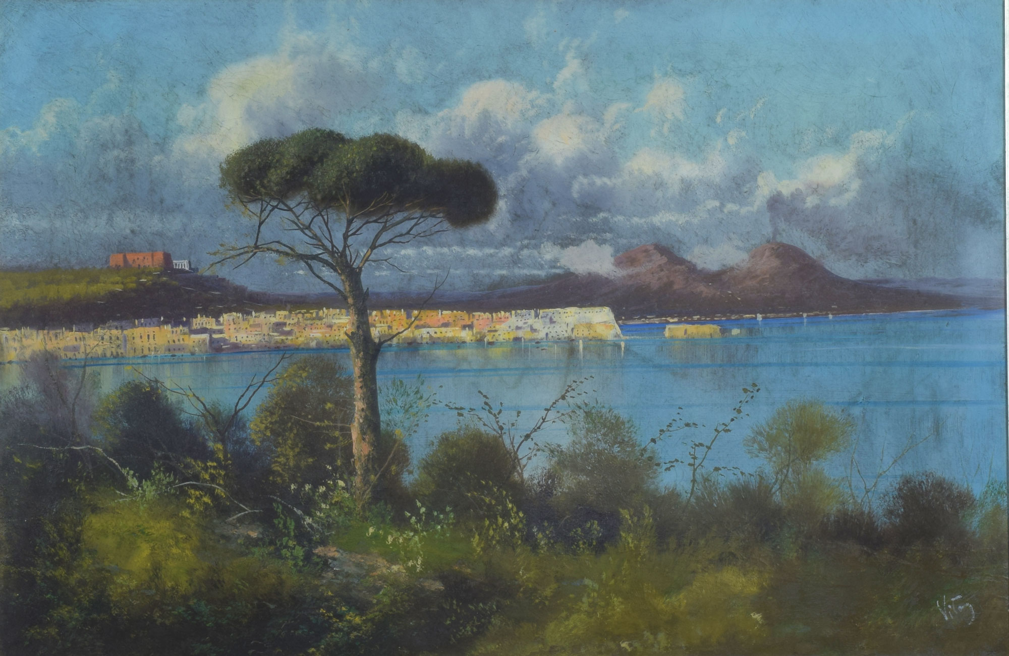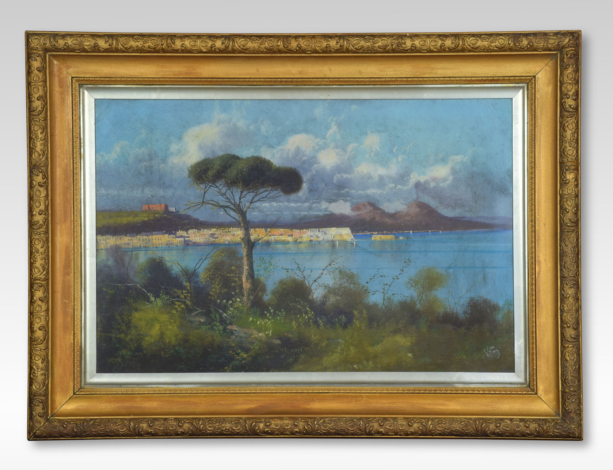Mediterranean oil on canvas depicting the Amalfi coast with Mount Vesuvius in the distance encased in gilt frame signed Vito.