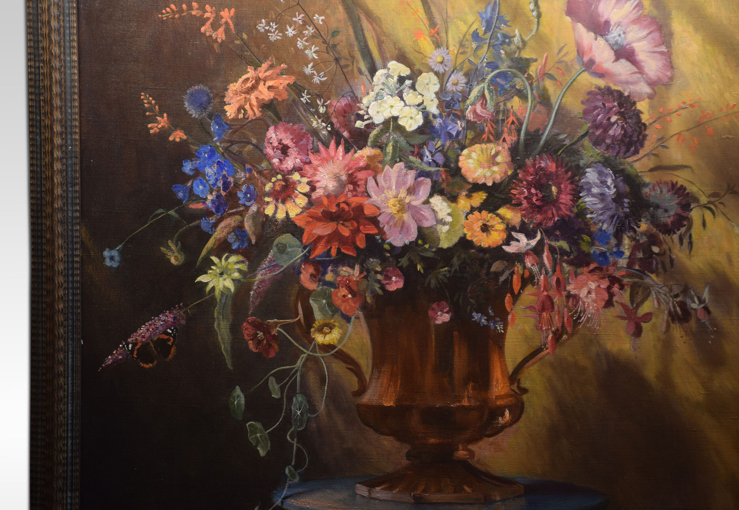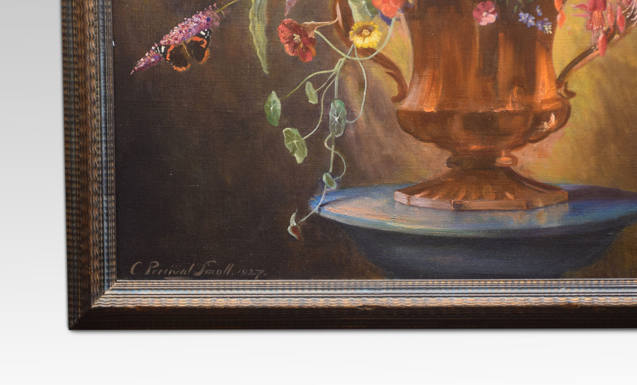 Oil on canvas depicting a still life of flowers in an urn signed Charles Percival Small.