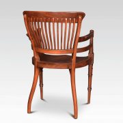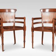 Pair of Aesthetic Movement armchairs by E W Godwin, for James Peddle. Having comb backs and open arms above a solid mahogany seats. All raised up on turned fluted front legs.