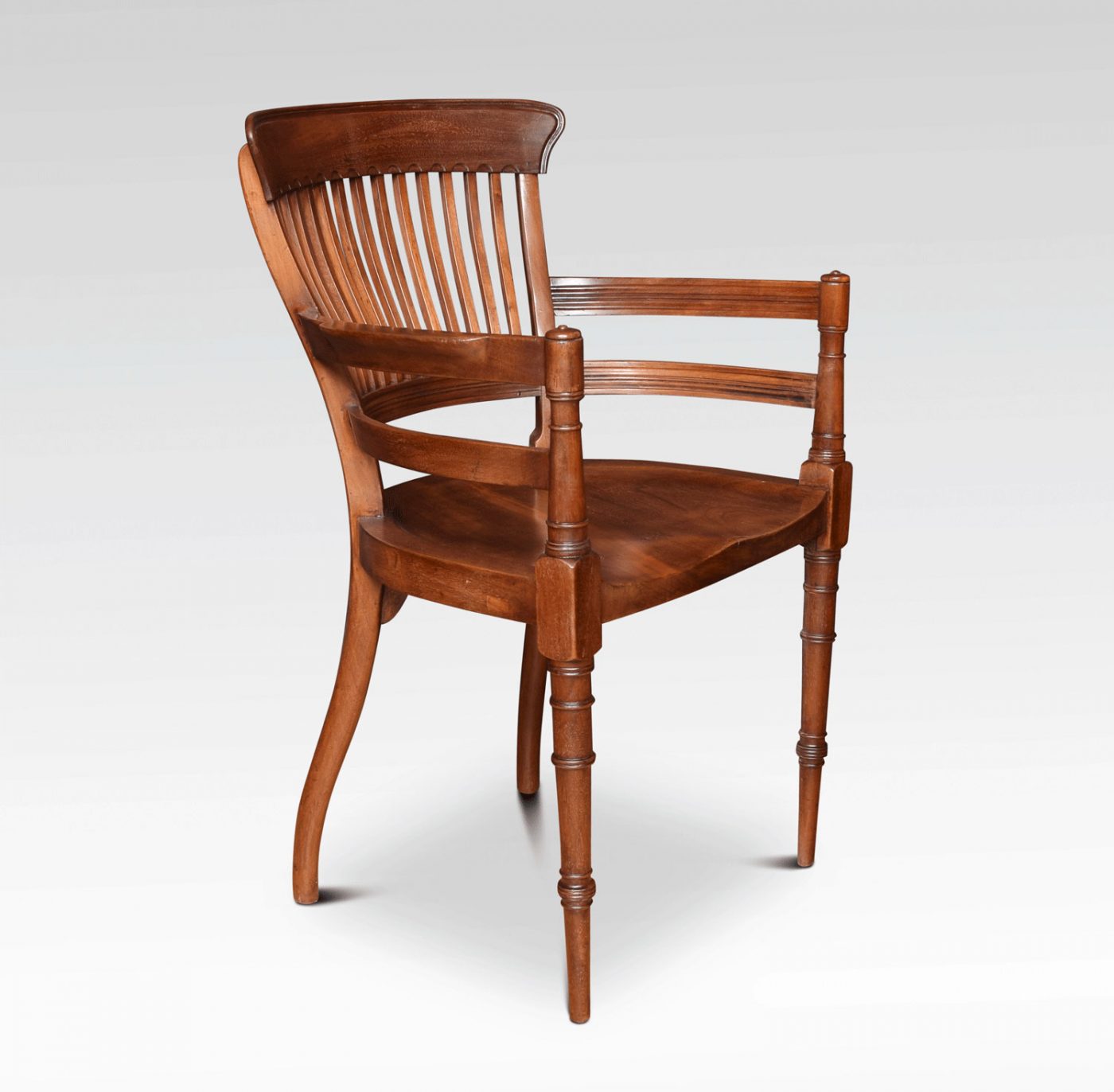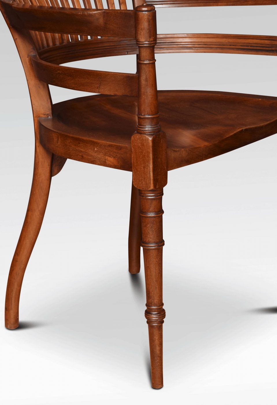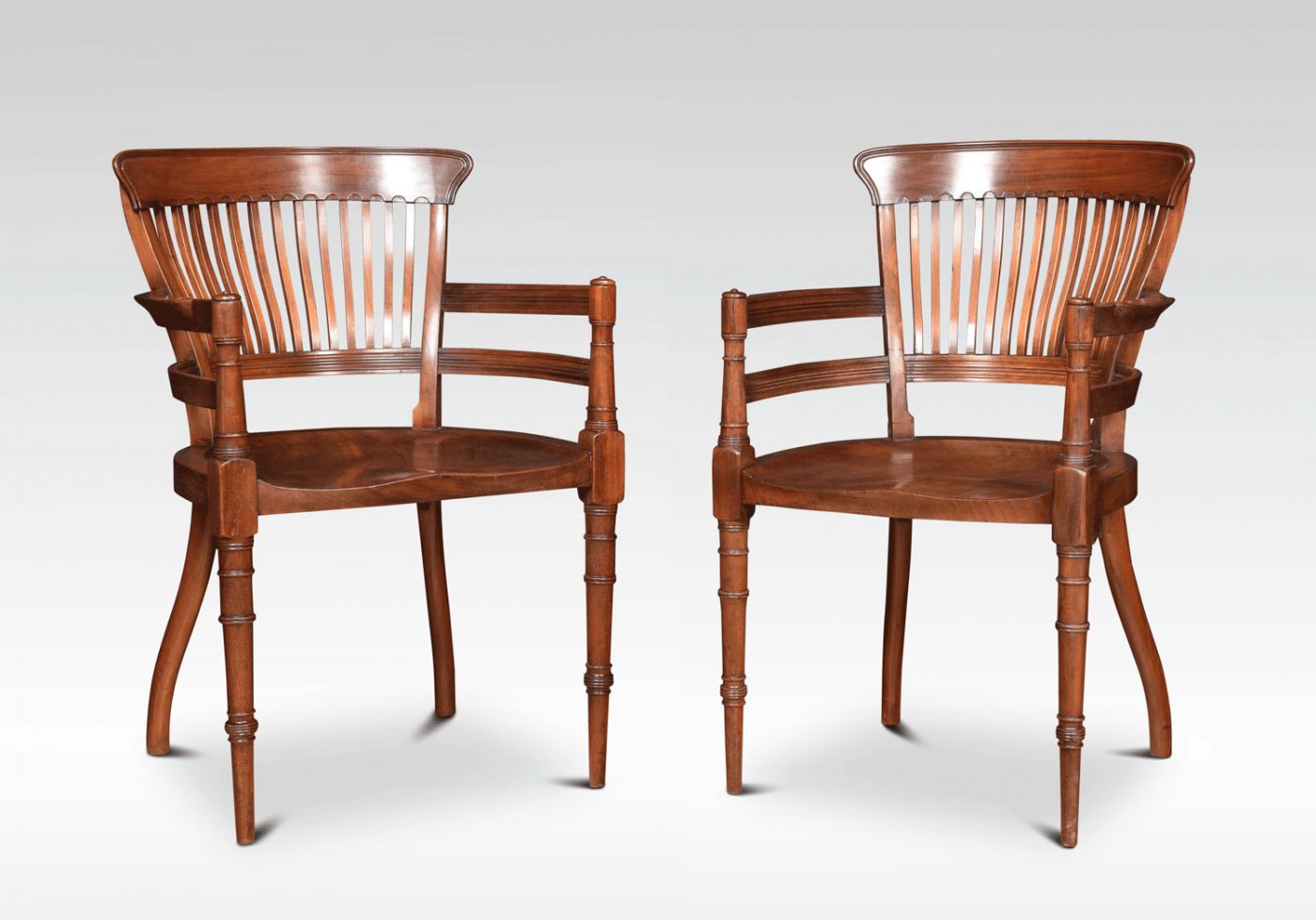 Pair of Aesthetic Movement armchairs by E W Godwin, for James Peddle. Having comb backs and open arms above a solid mahogany seats. All raised up on turned fluted front legs.