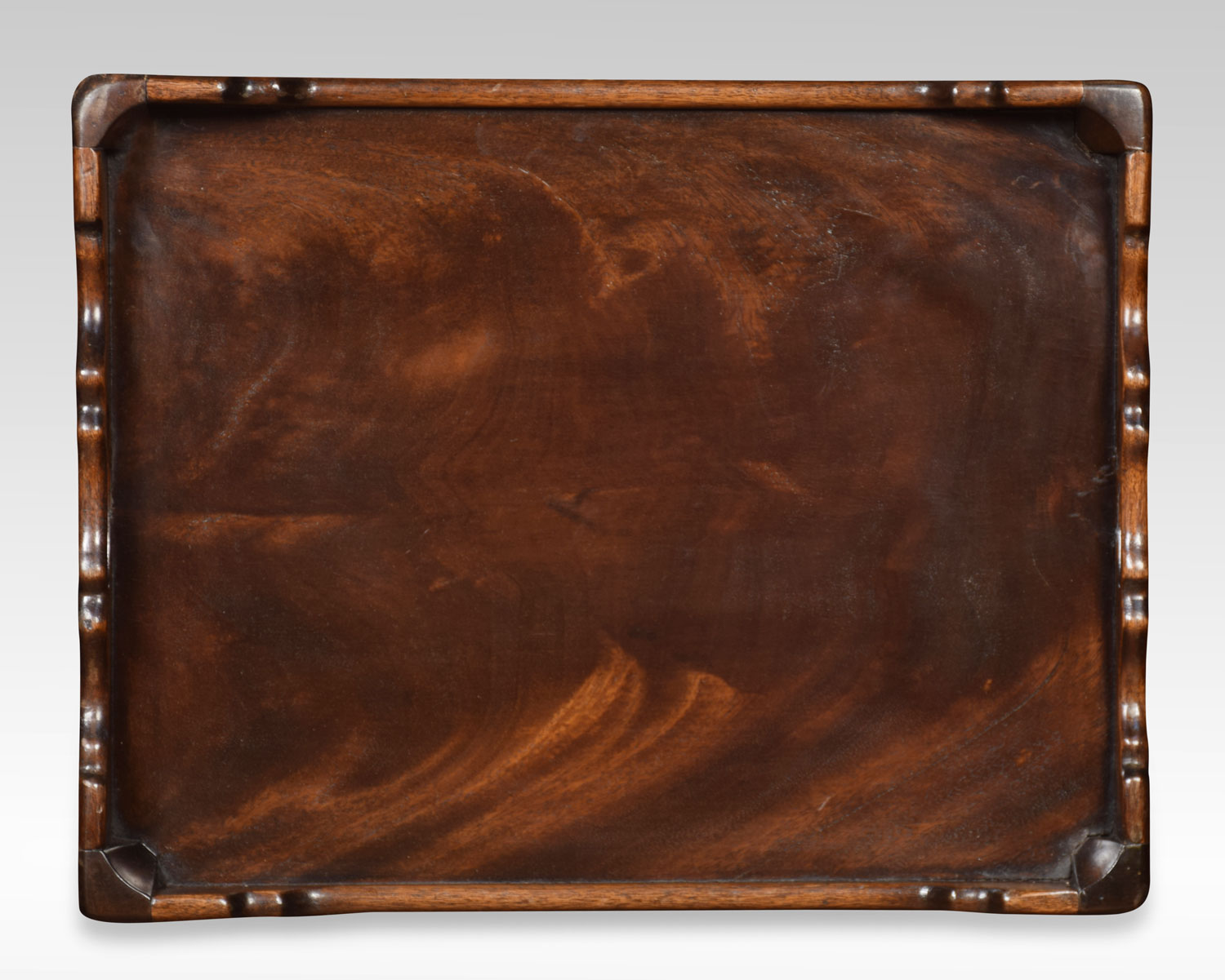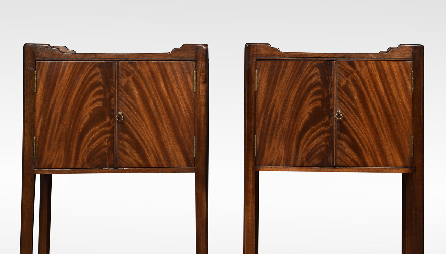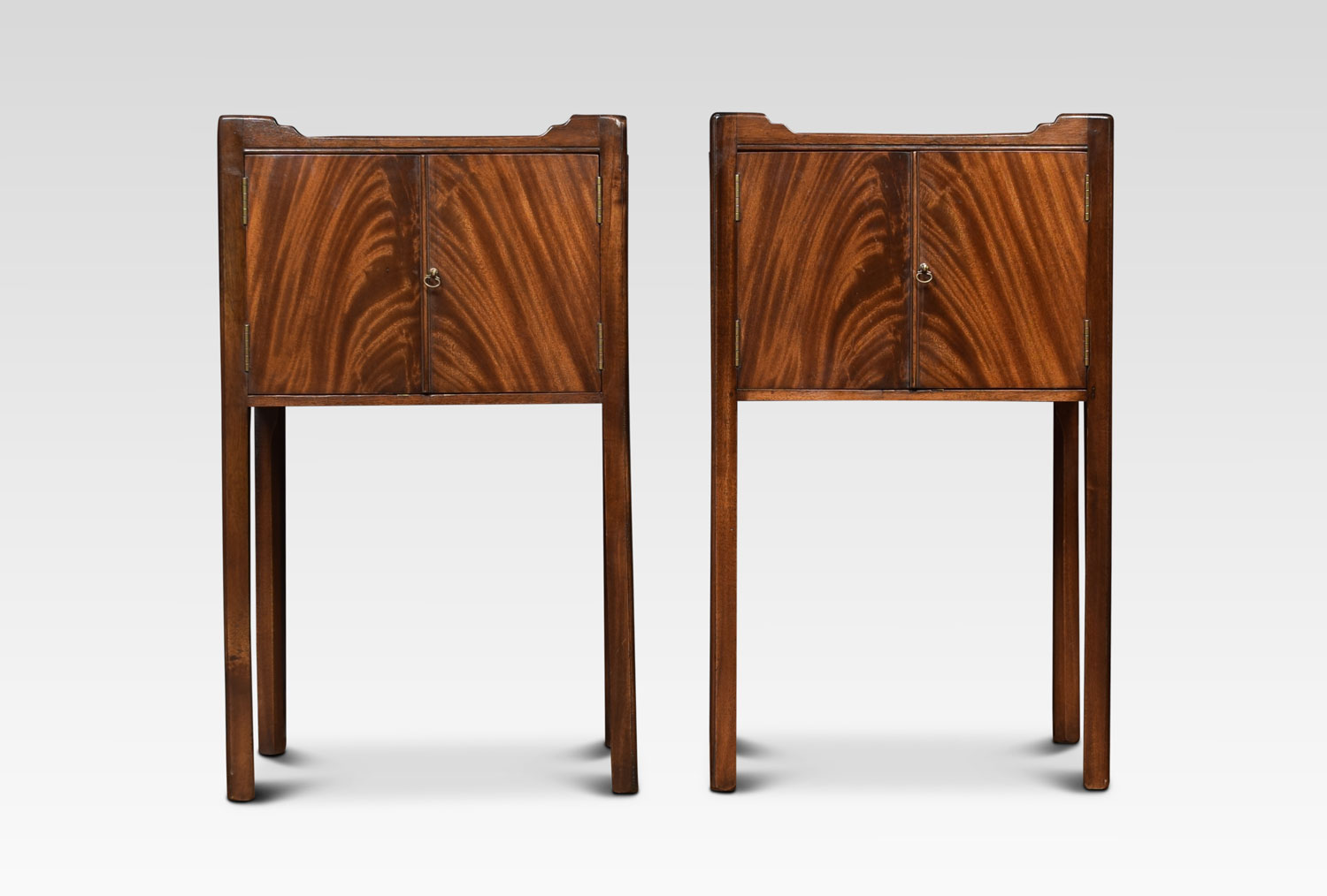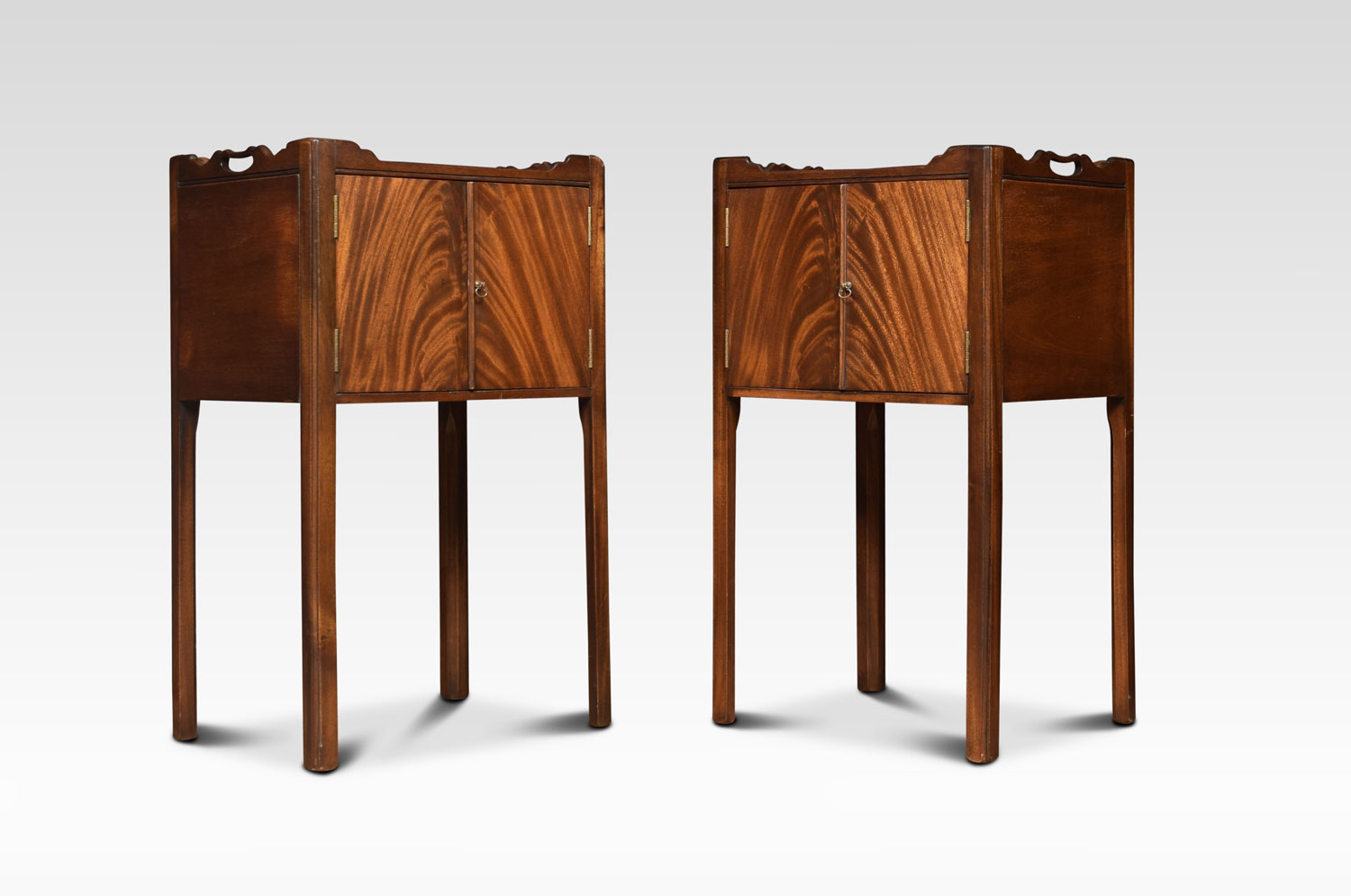 Pair of George III style mahogany bedside cupboards each with tray tops, above two flame mahogany doors. Raised up on chamfered square legs