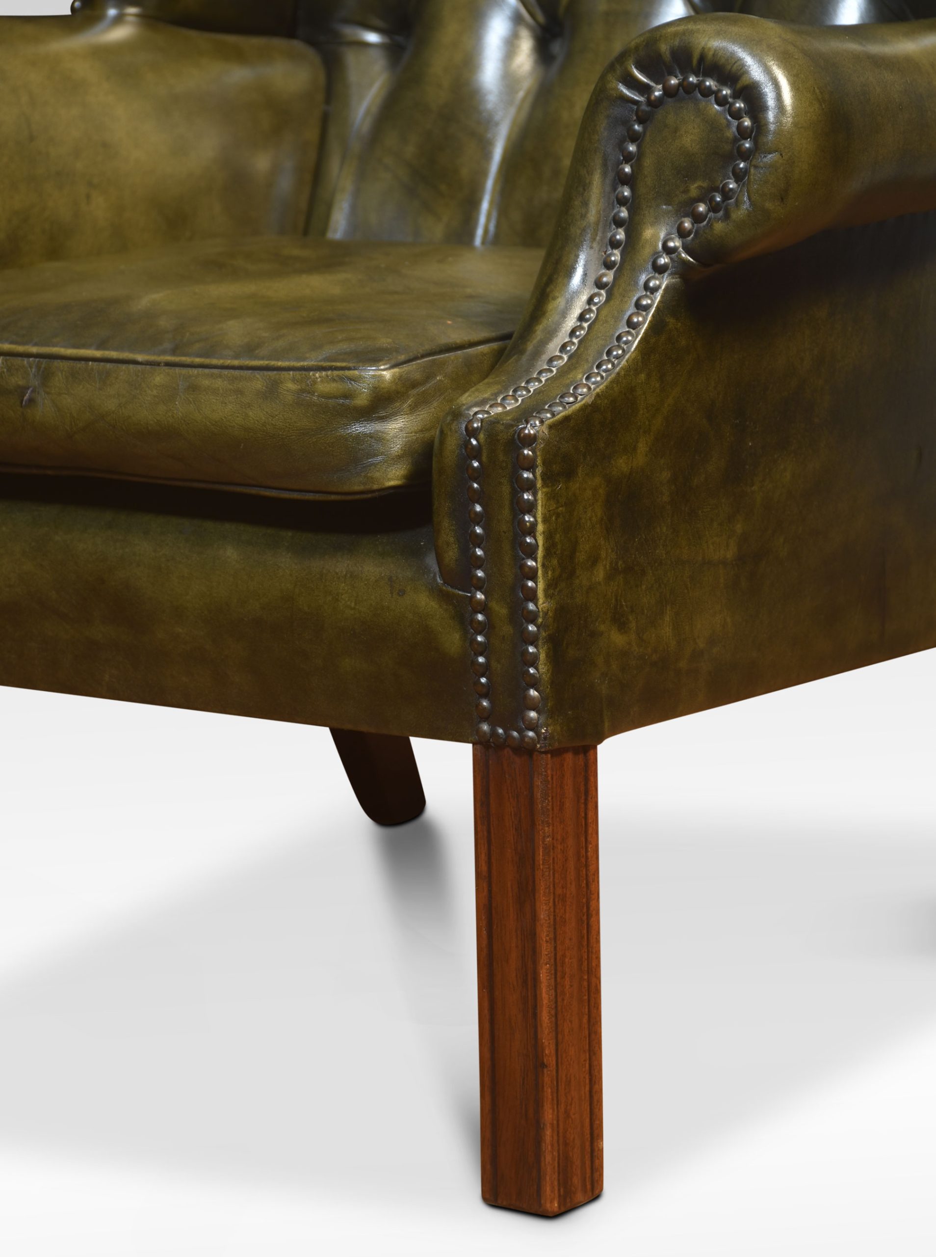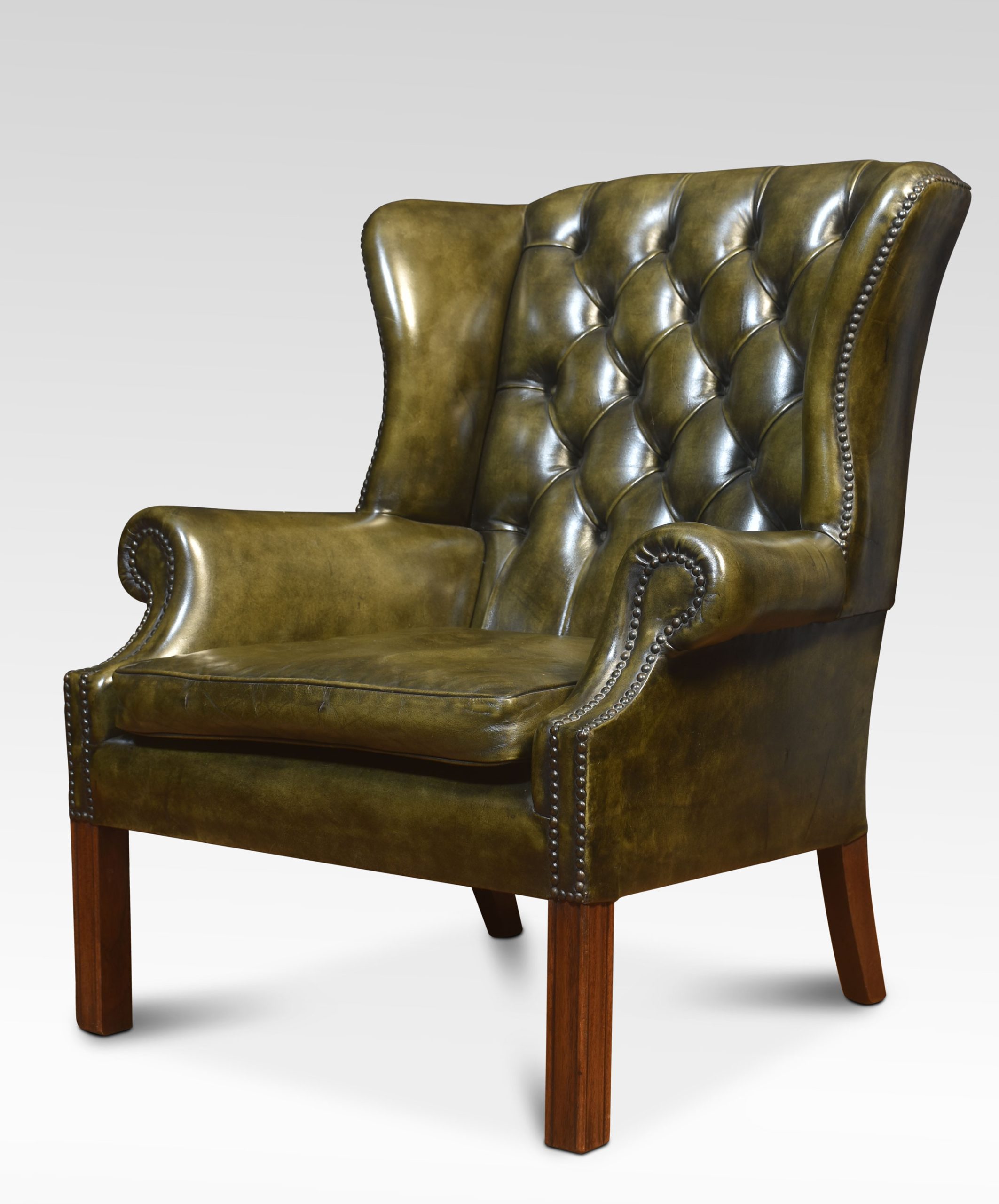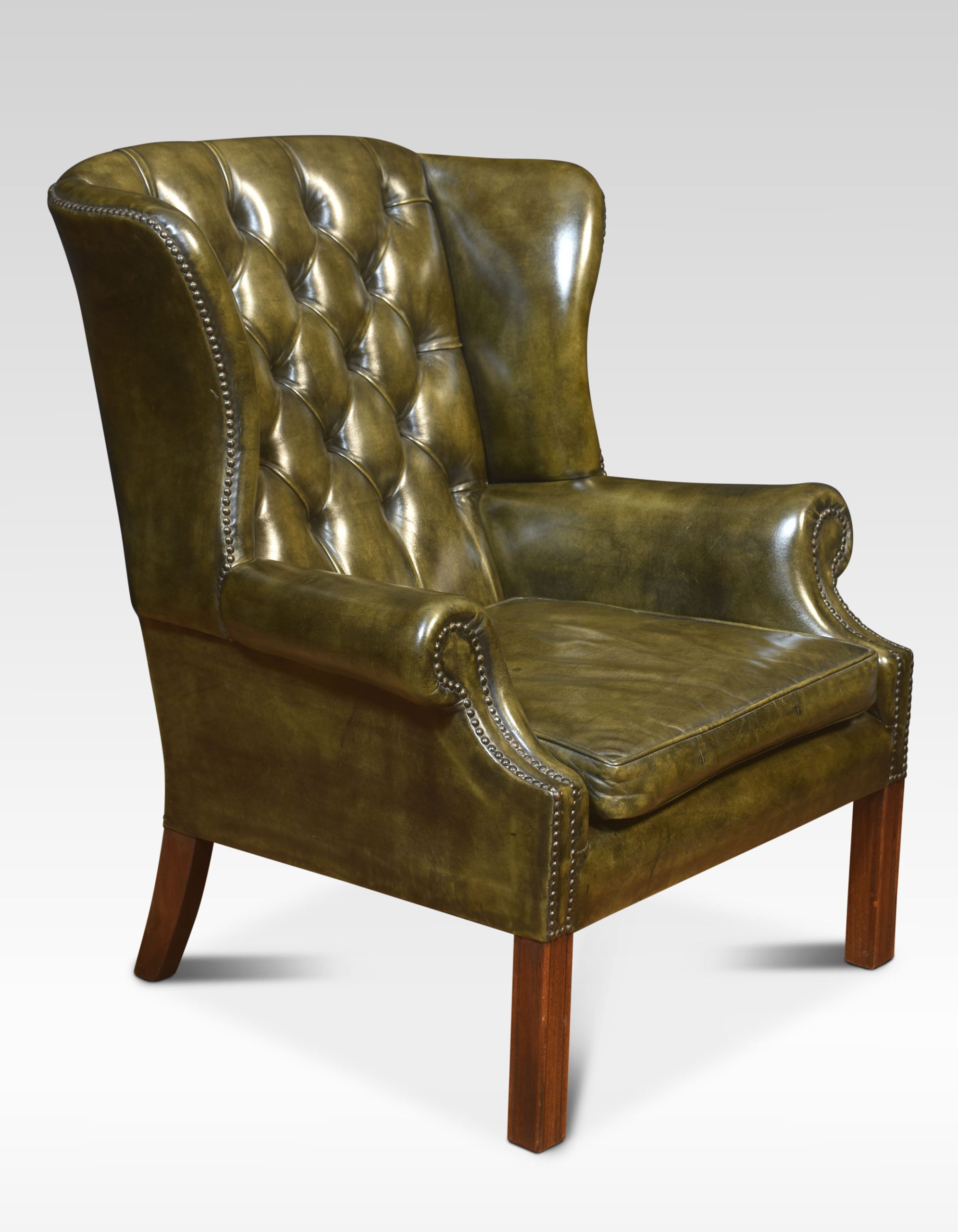 Mahogany framed wing armchair of generous proportions, the arched top above deep buttoned back, upholstered arms, and seat in brown leather. All raised up on square supports united by a stretcher
