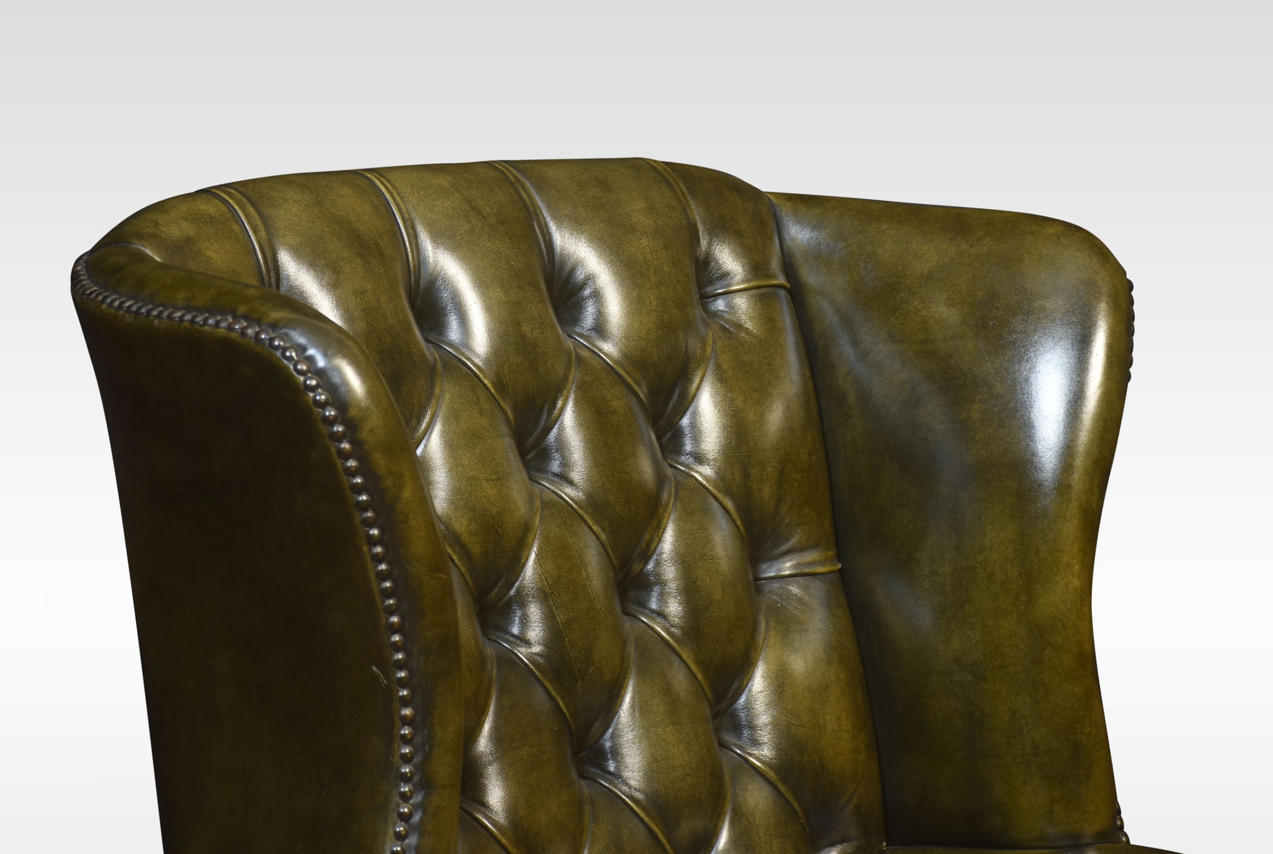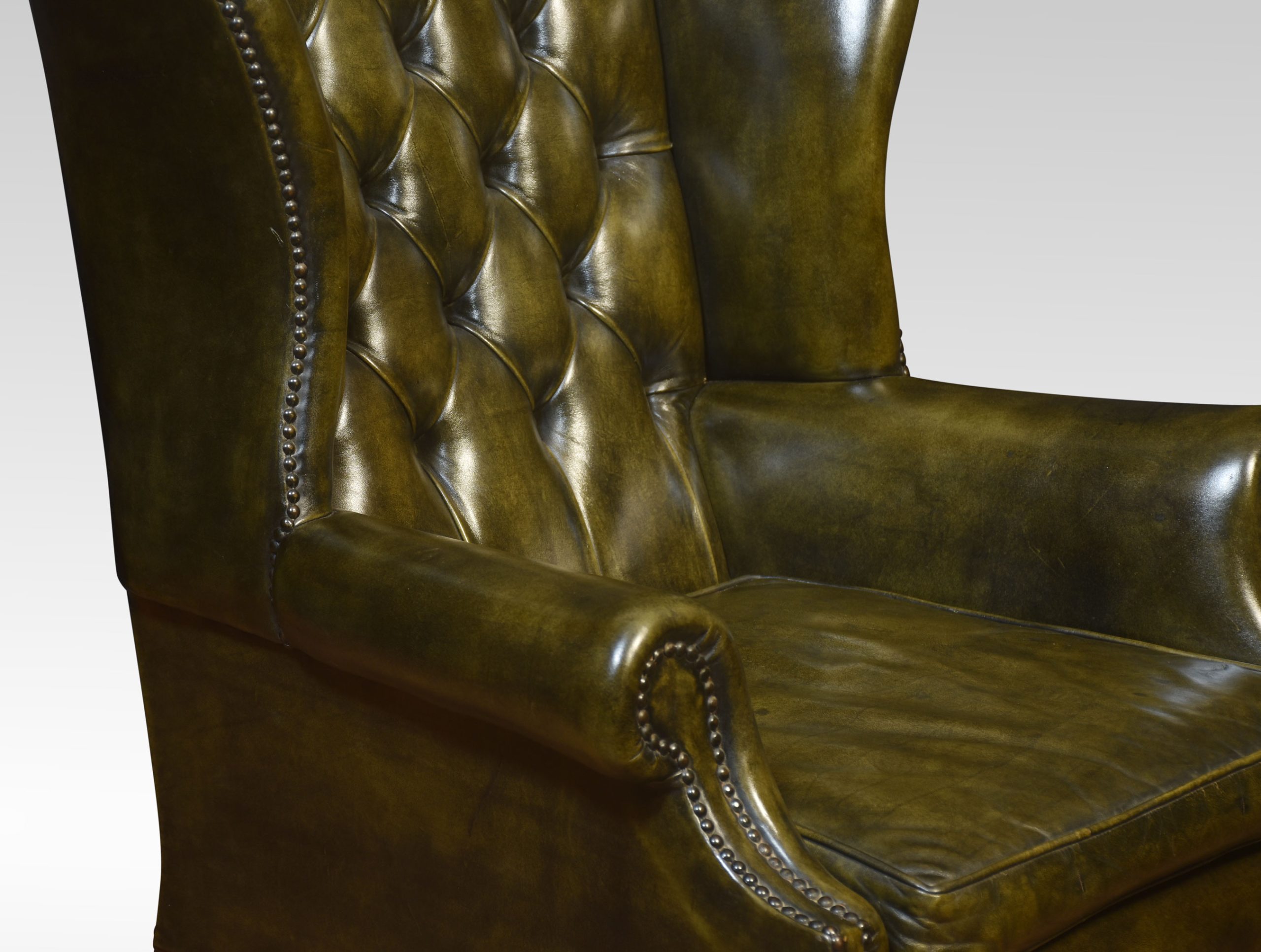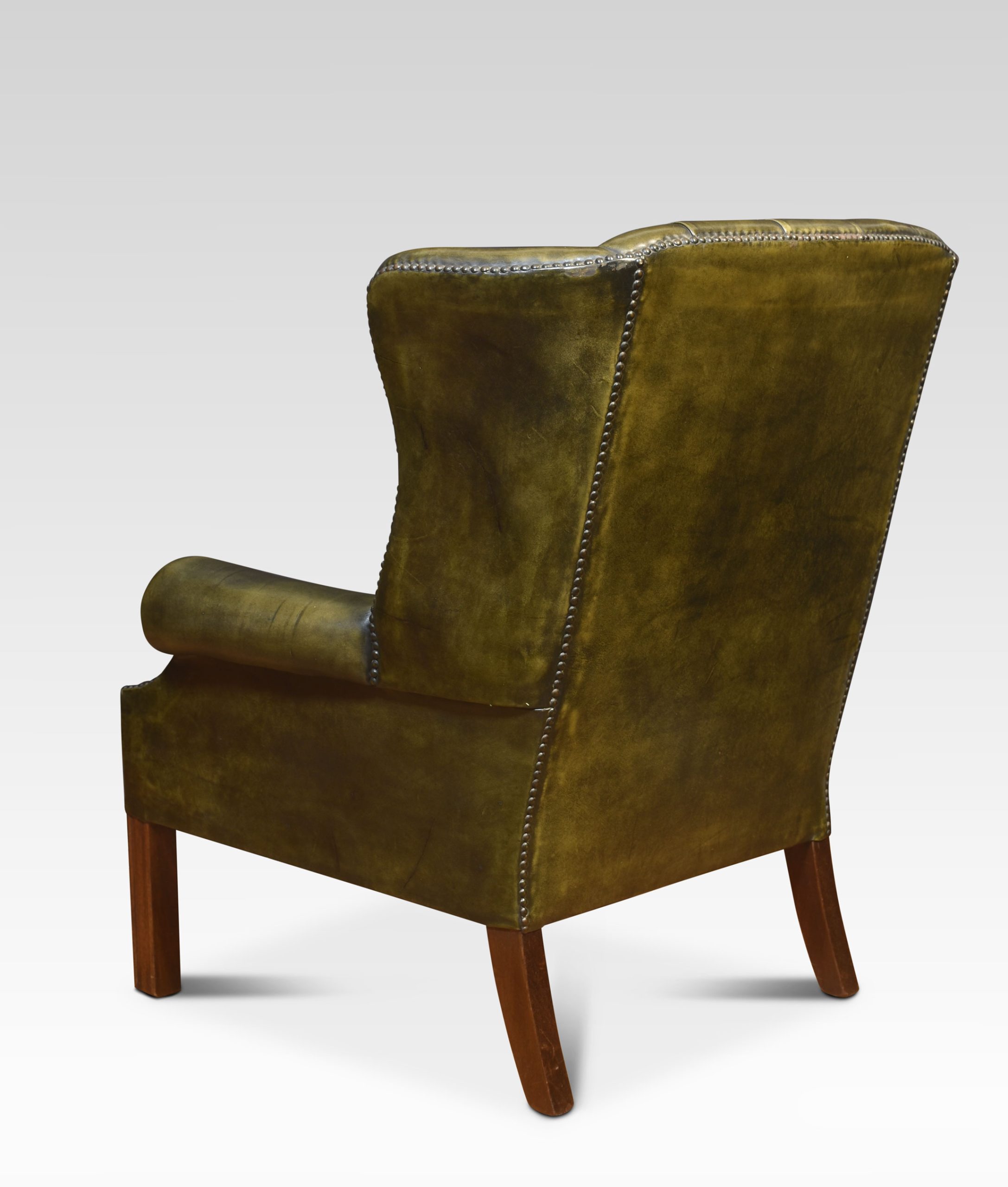 Mahogany framed wing armchair of generous proportions, the arched top above deep buttoned back, upholstered arms, and seat in brown leather. All raised up on square supports united by a stretcher