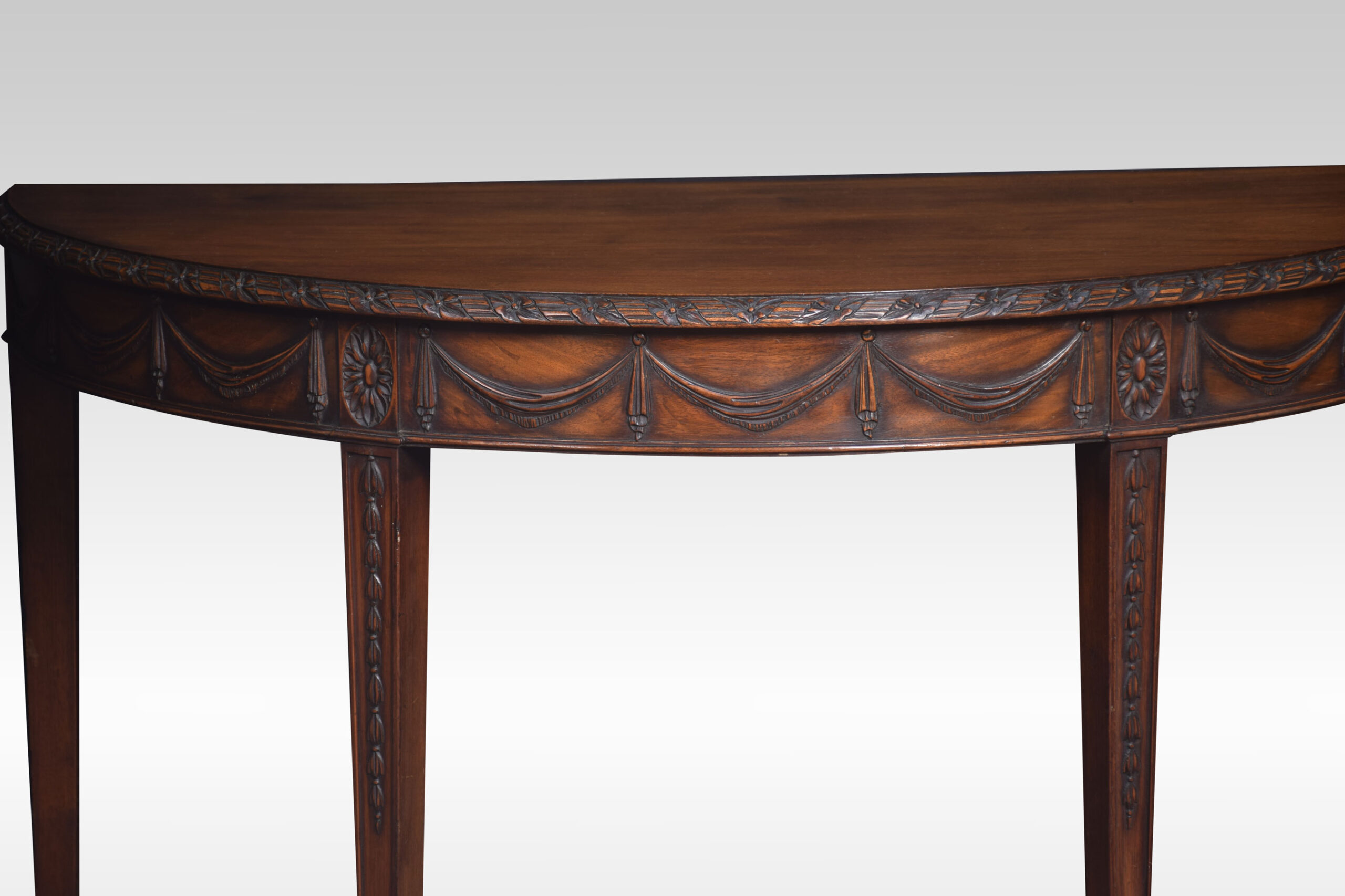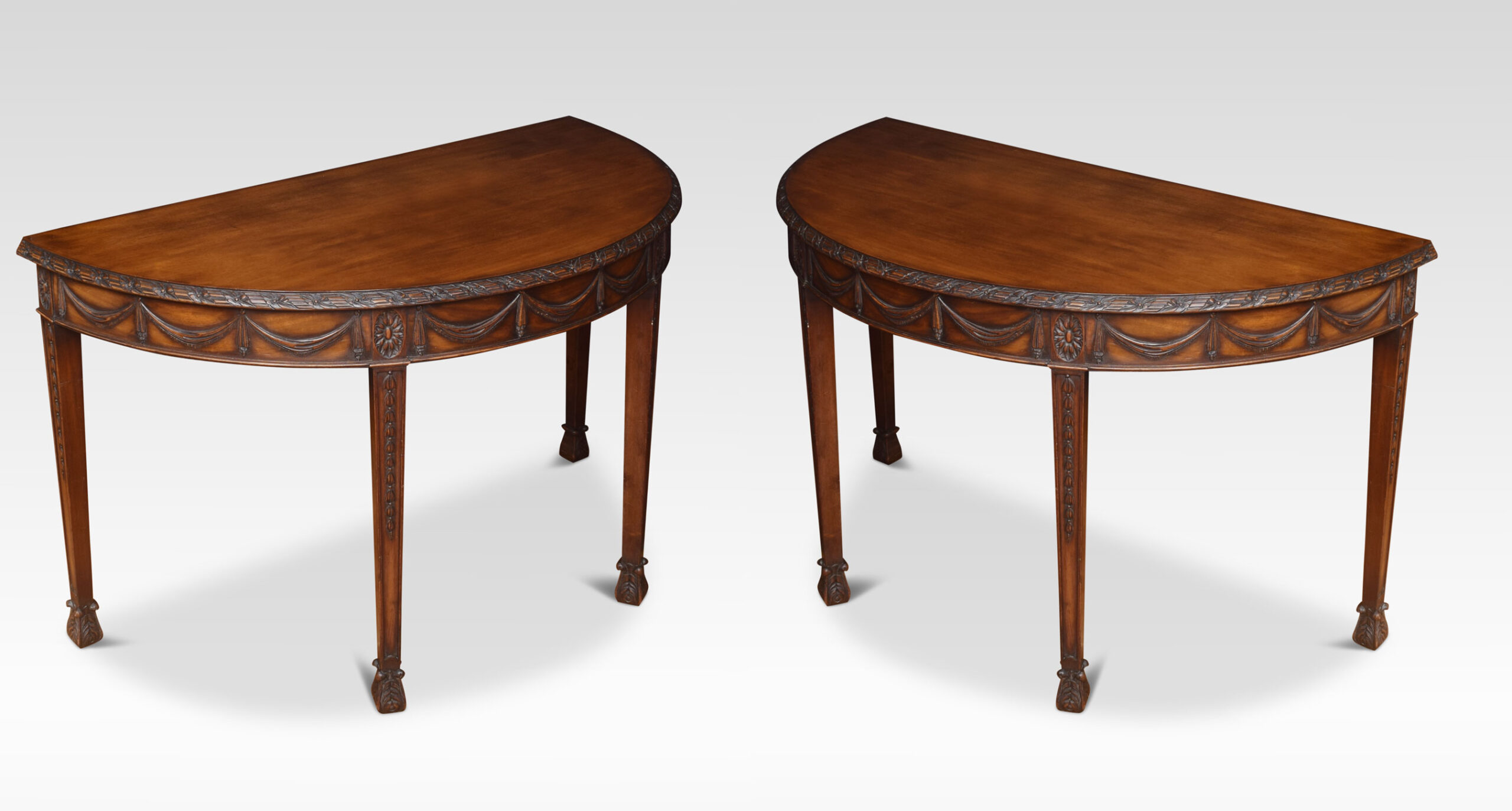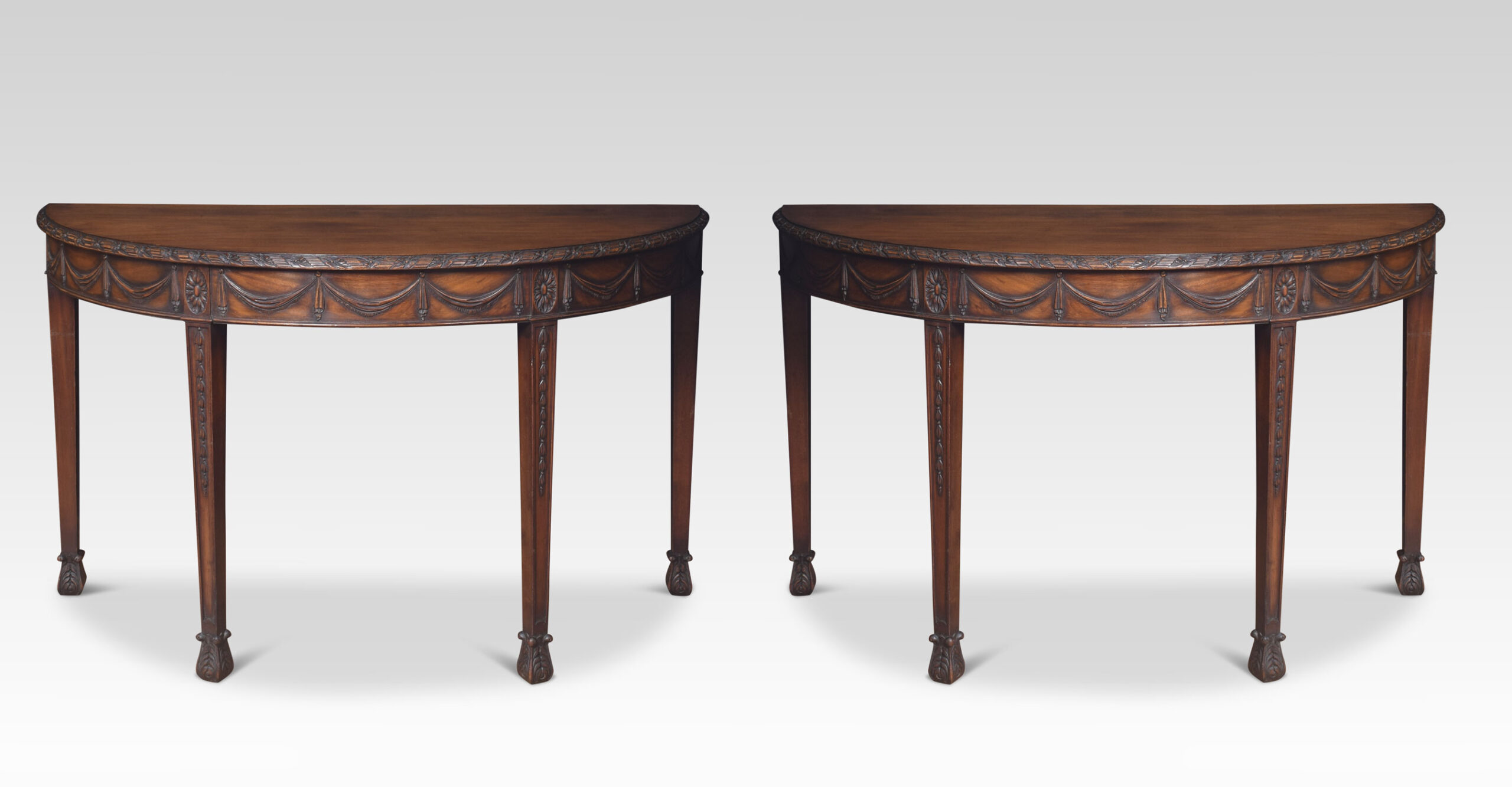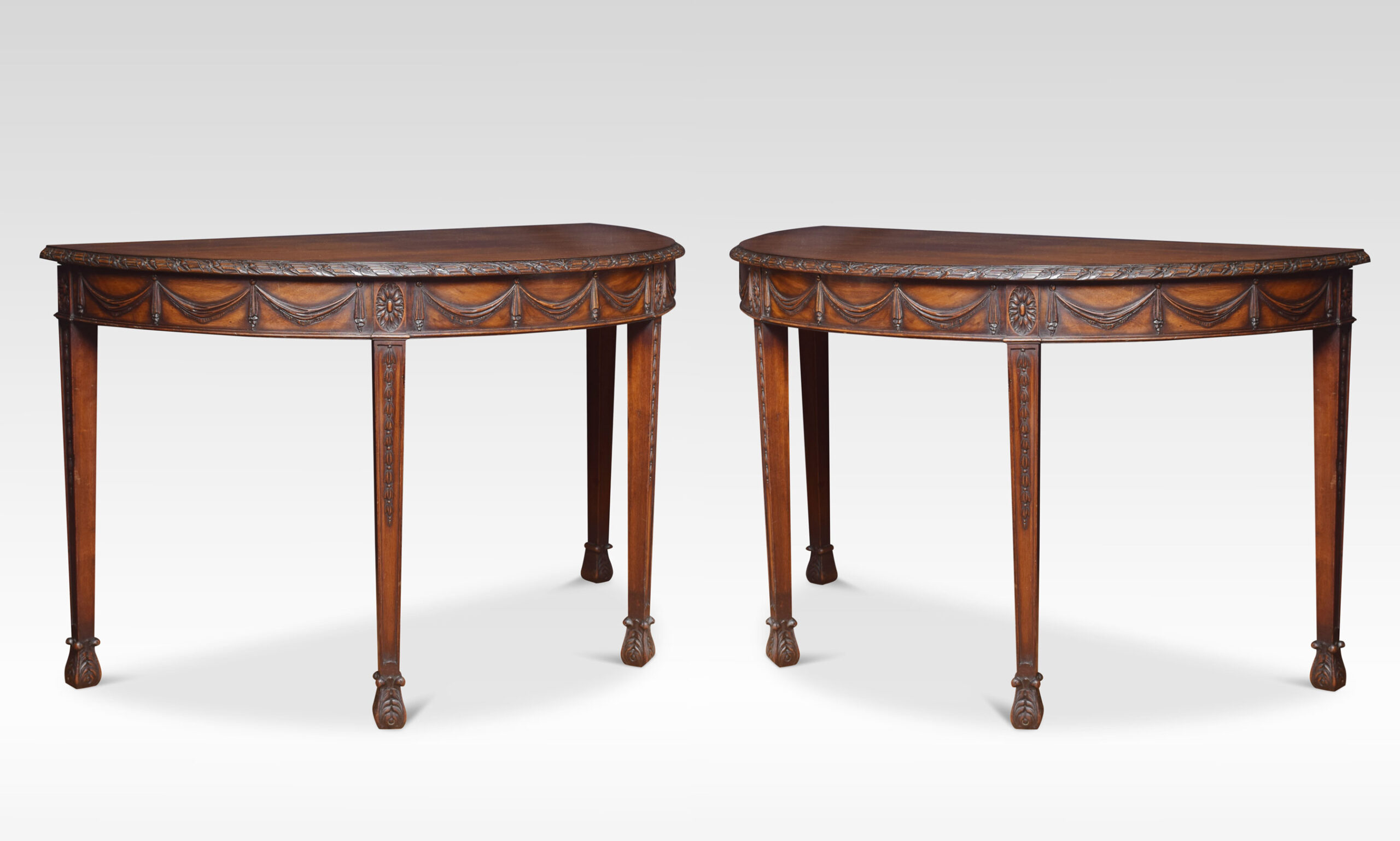 Pair of Adam Revival mahogany hall tables having demi-lune tops with foliate and reeded carved edge and garlanded frieze raised on tapered square section legs with bellflower trails and acanthus carved feet.
