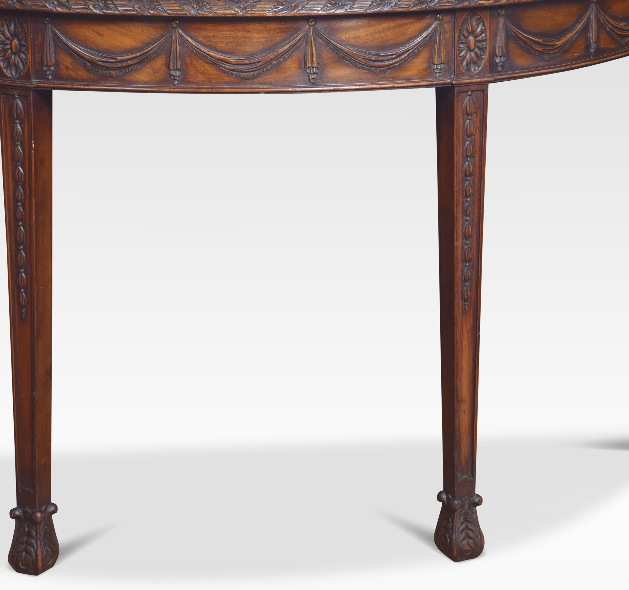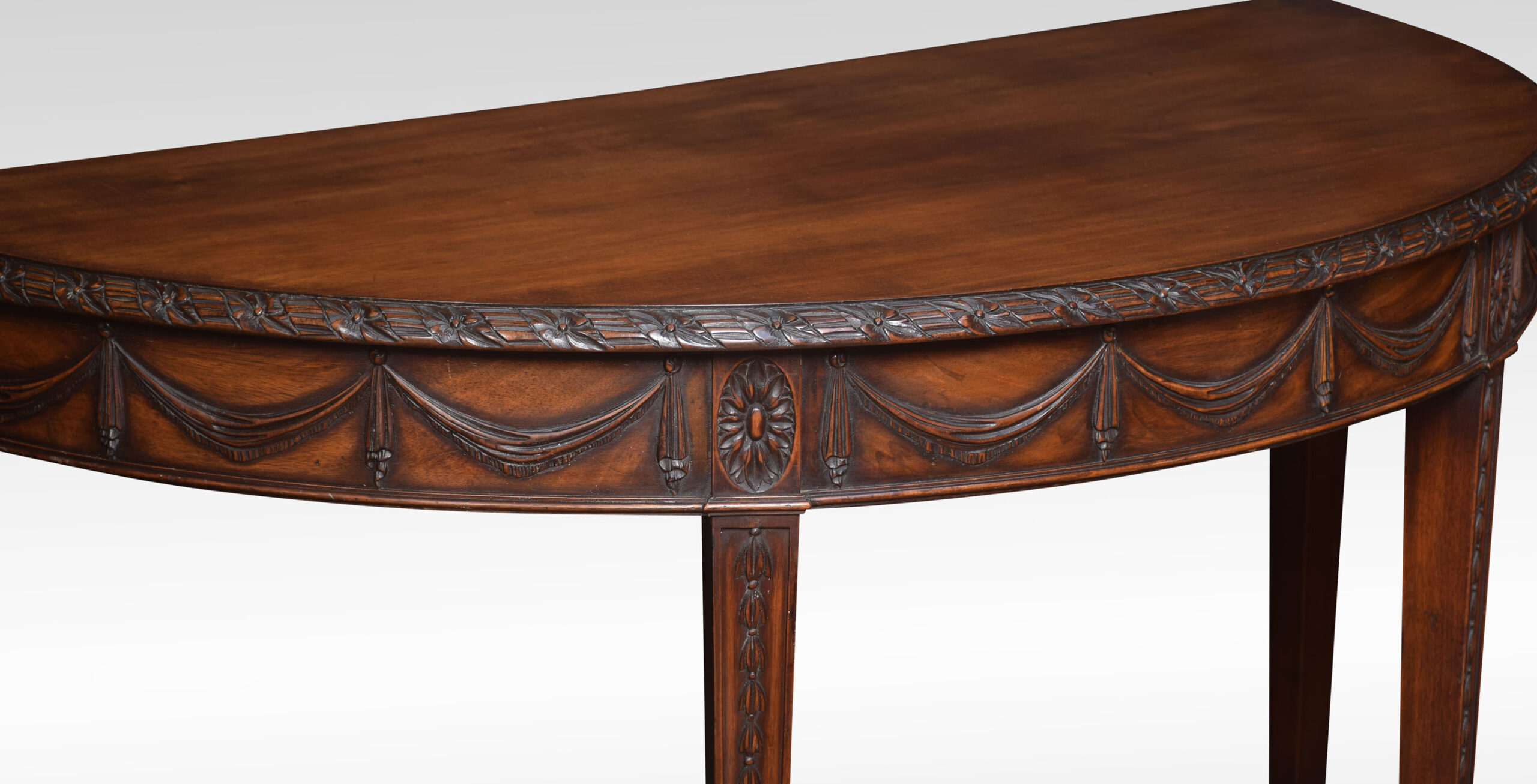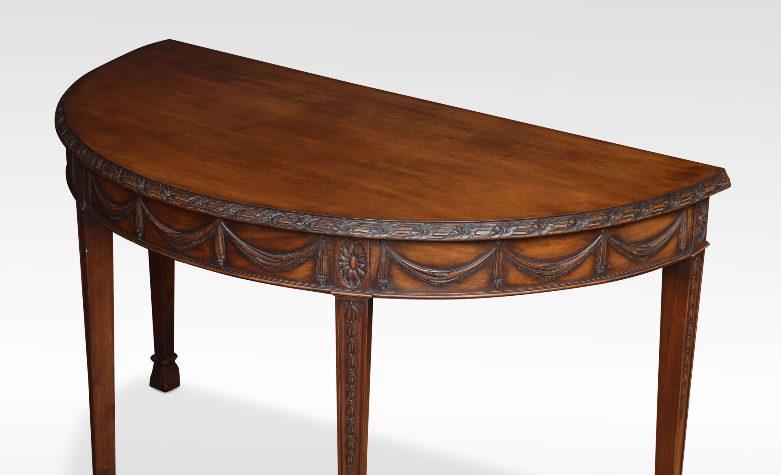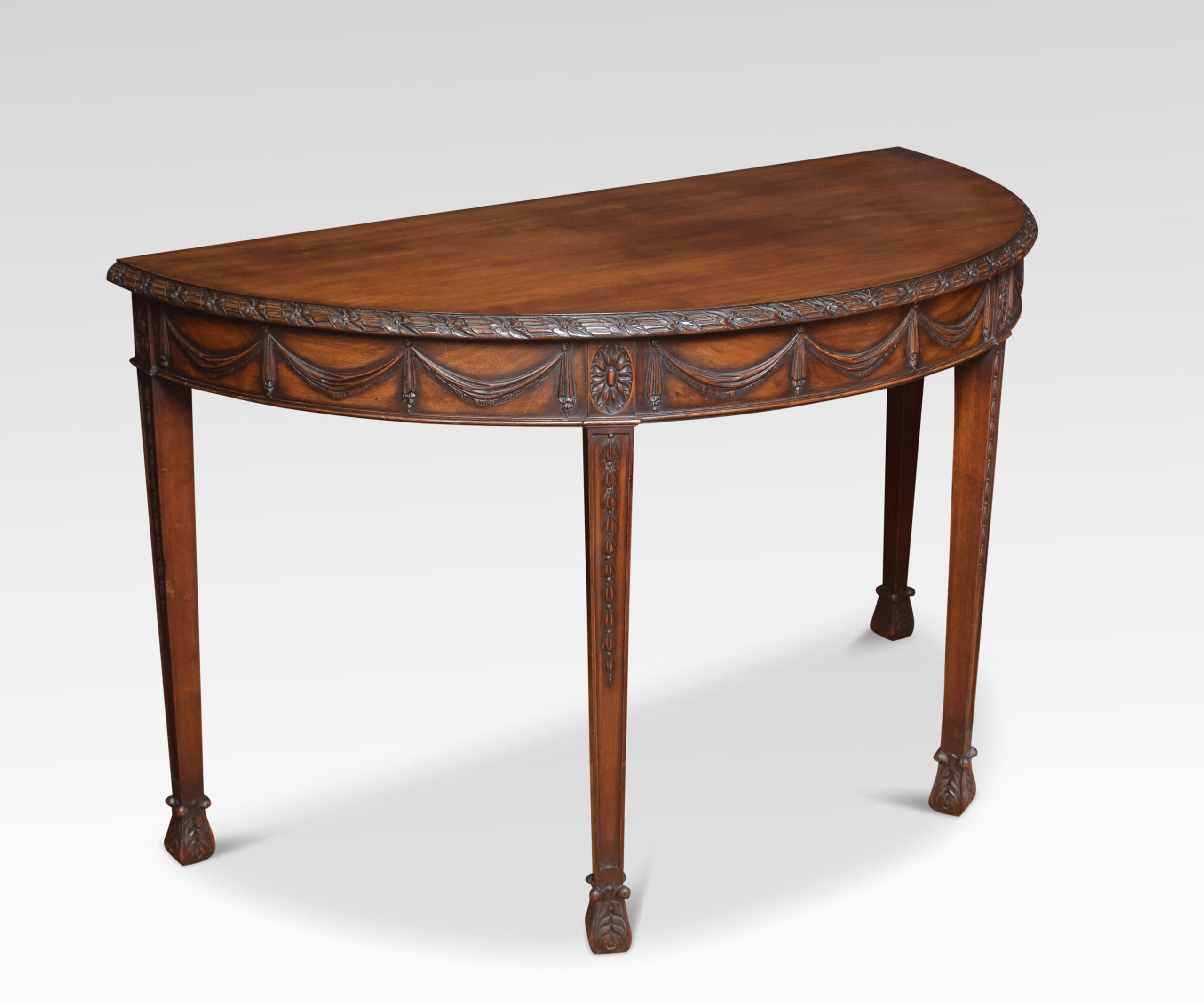 Pair of Adam Revival mahogany hall tables having demi-lune tops with foliate and reeded carved edge and garlanded frieze raised on tapered square section legs with bellflower trails and acanthus carved feet.