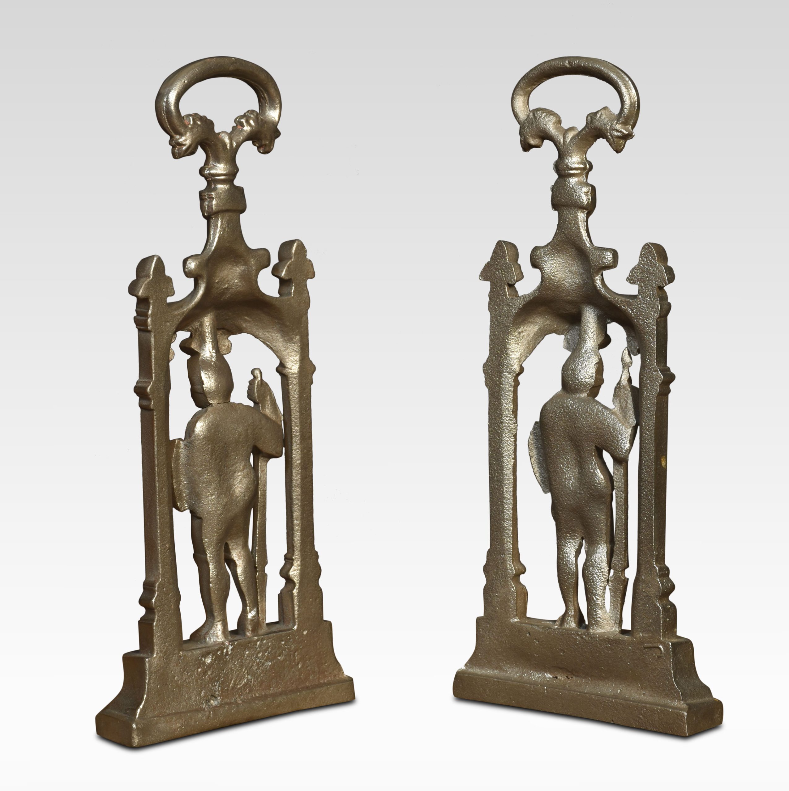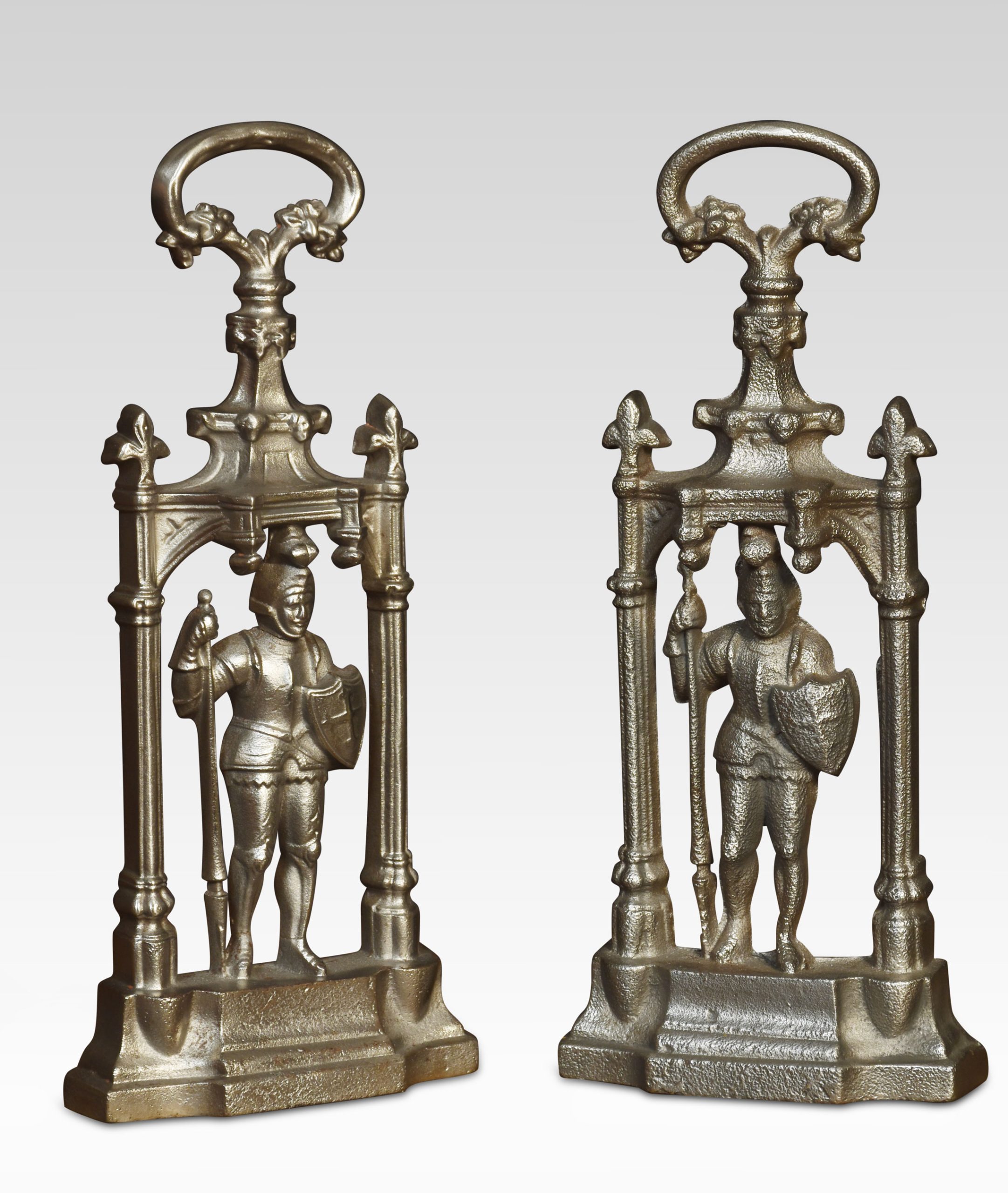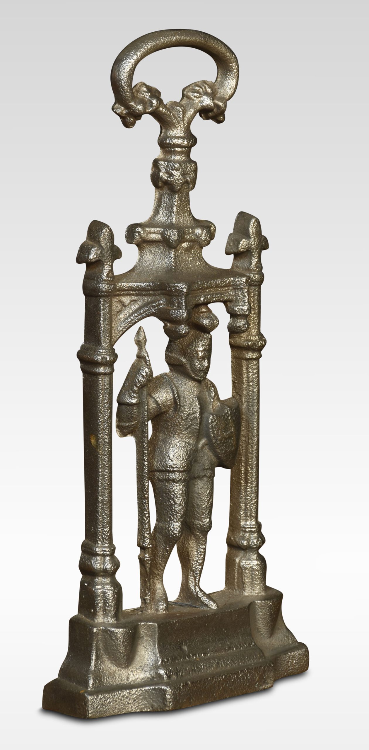Pair of 19th century cast iron door stops with shaped handles above a figural soldier raised up on a shaped base.