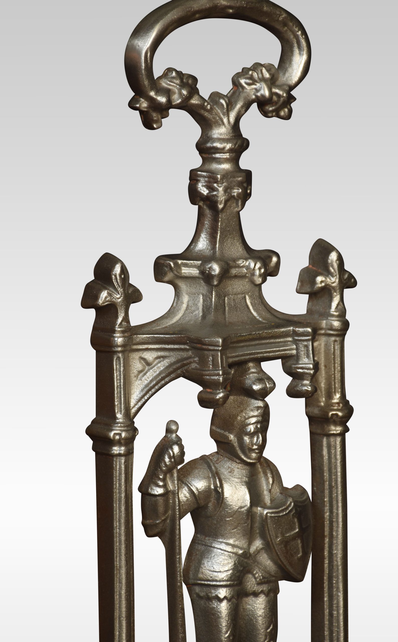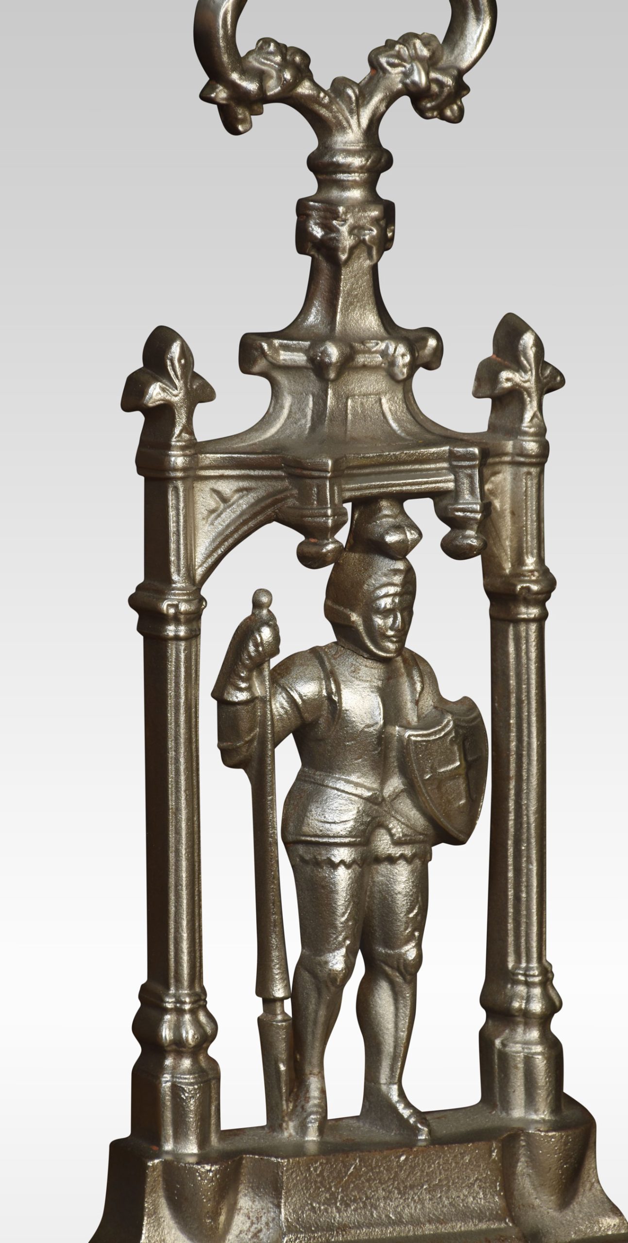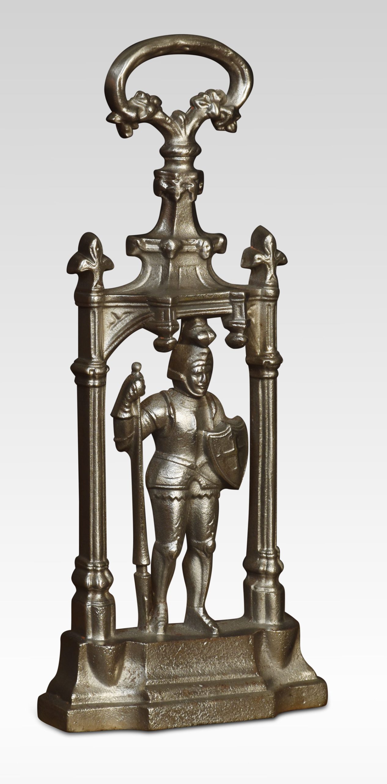Pair of 19th century cast iron door stops with shaped handles above a figural soldier raised up on a shaped base.