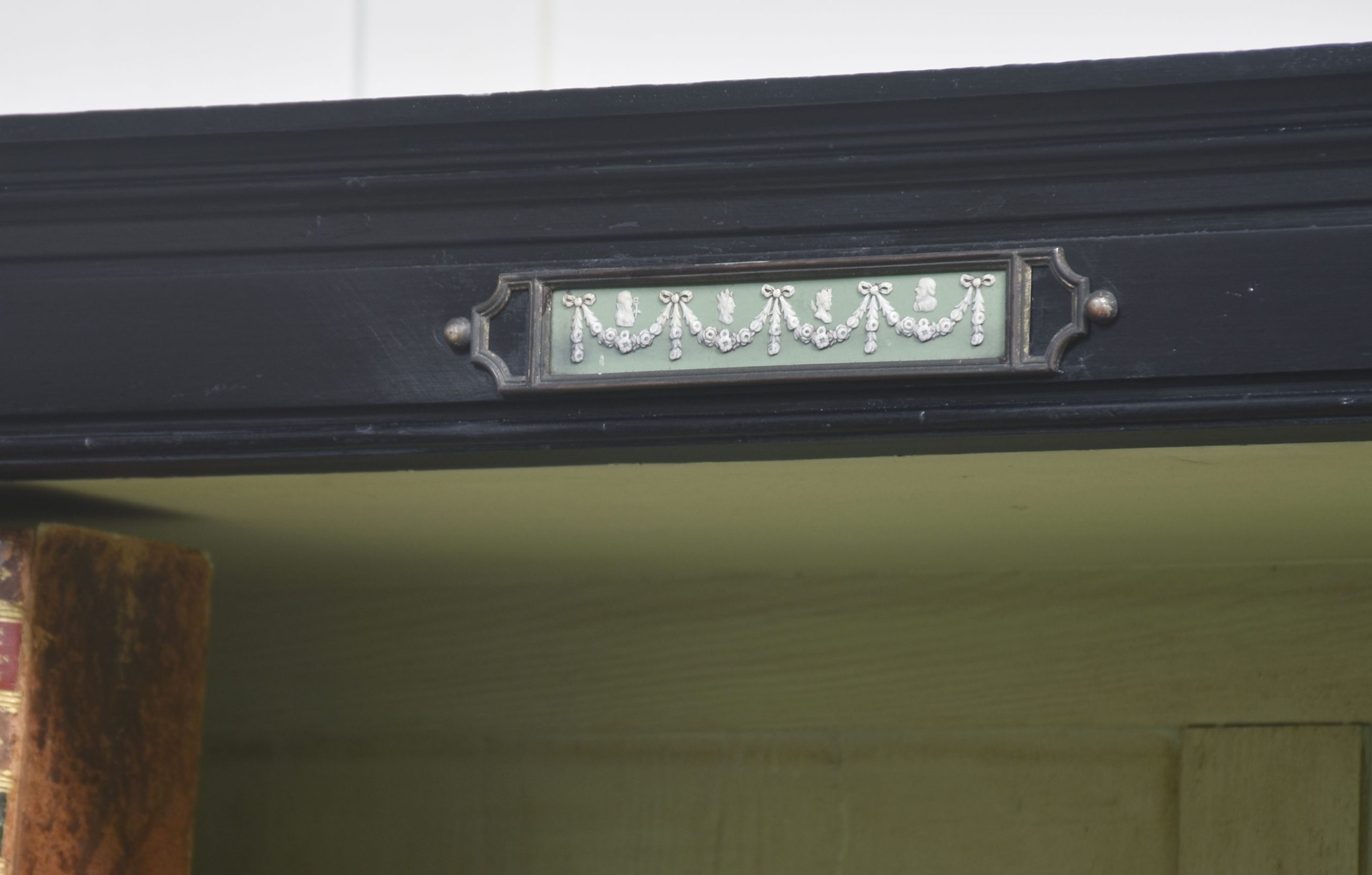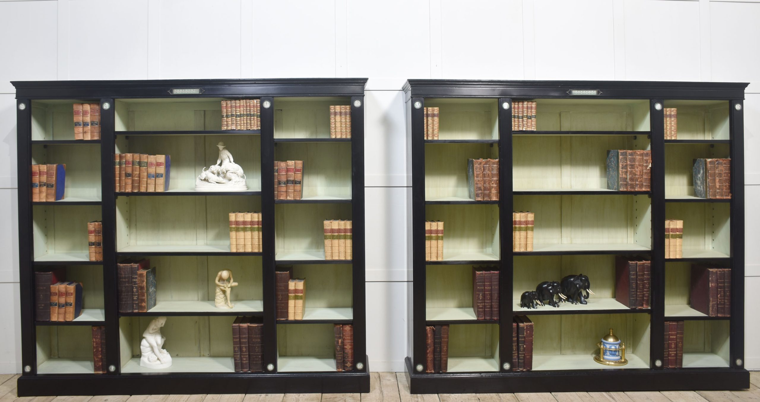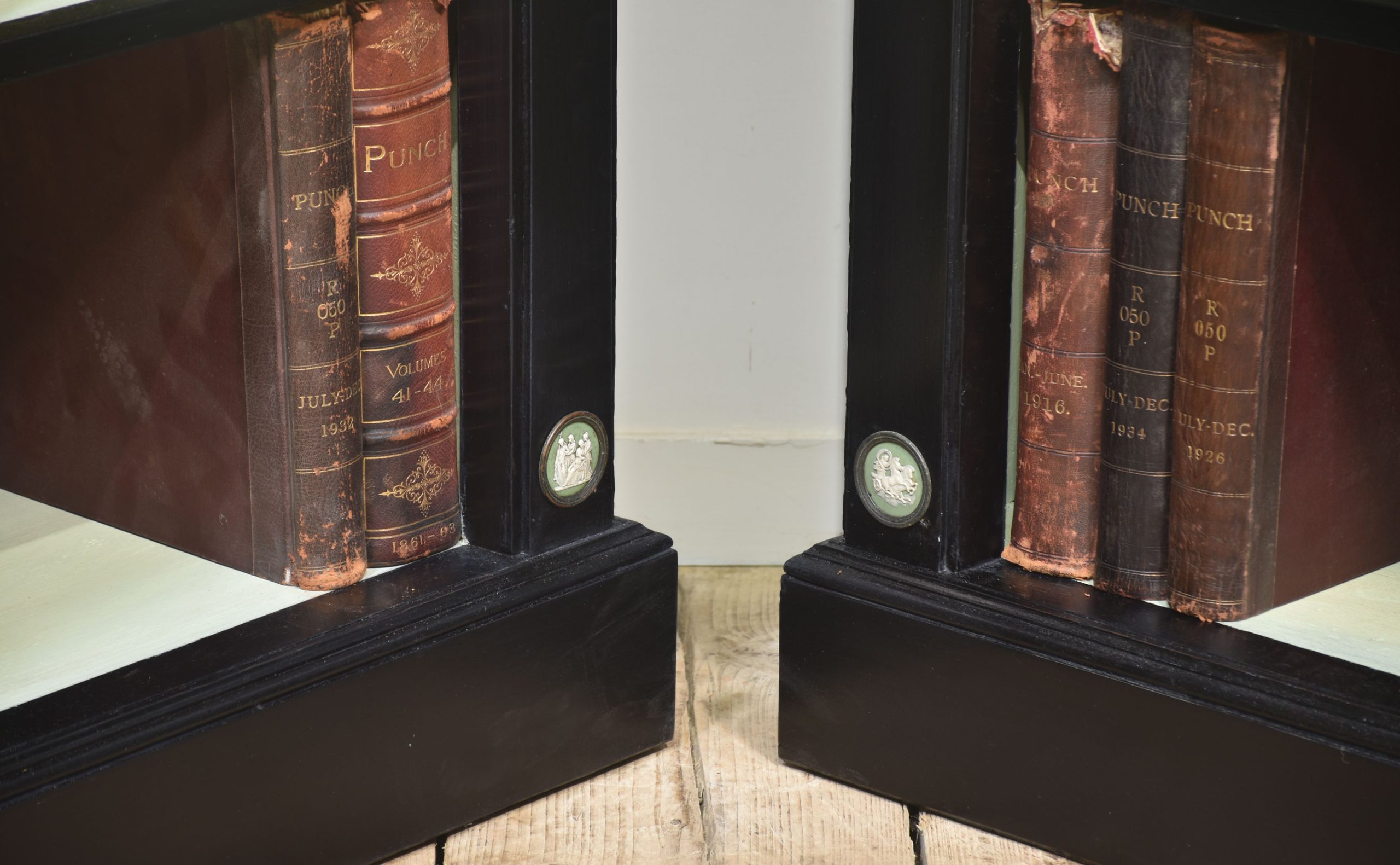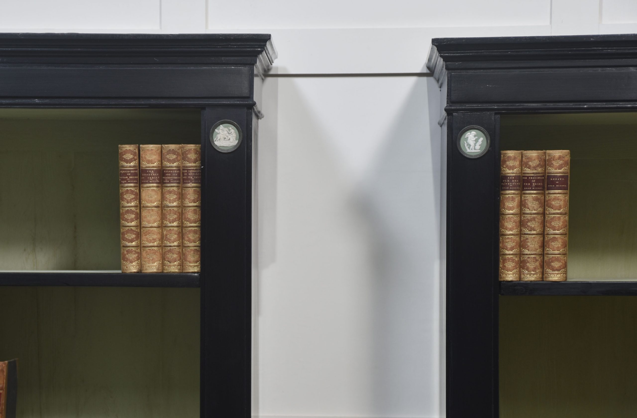 Pair of open bookcases of rectangular form, having moulded tops above three bays of adjustable shelves divided by columns with inset Wedgwood plaques. All raised on a plinth base.