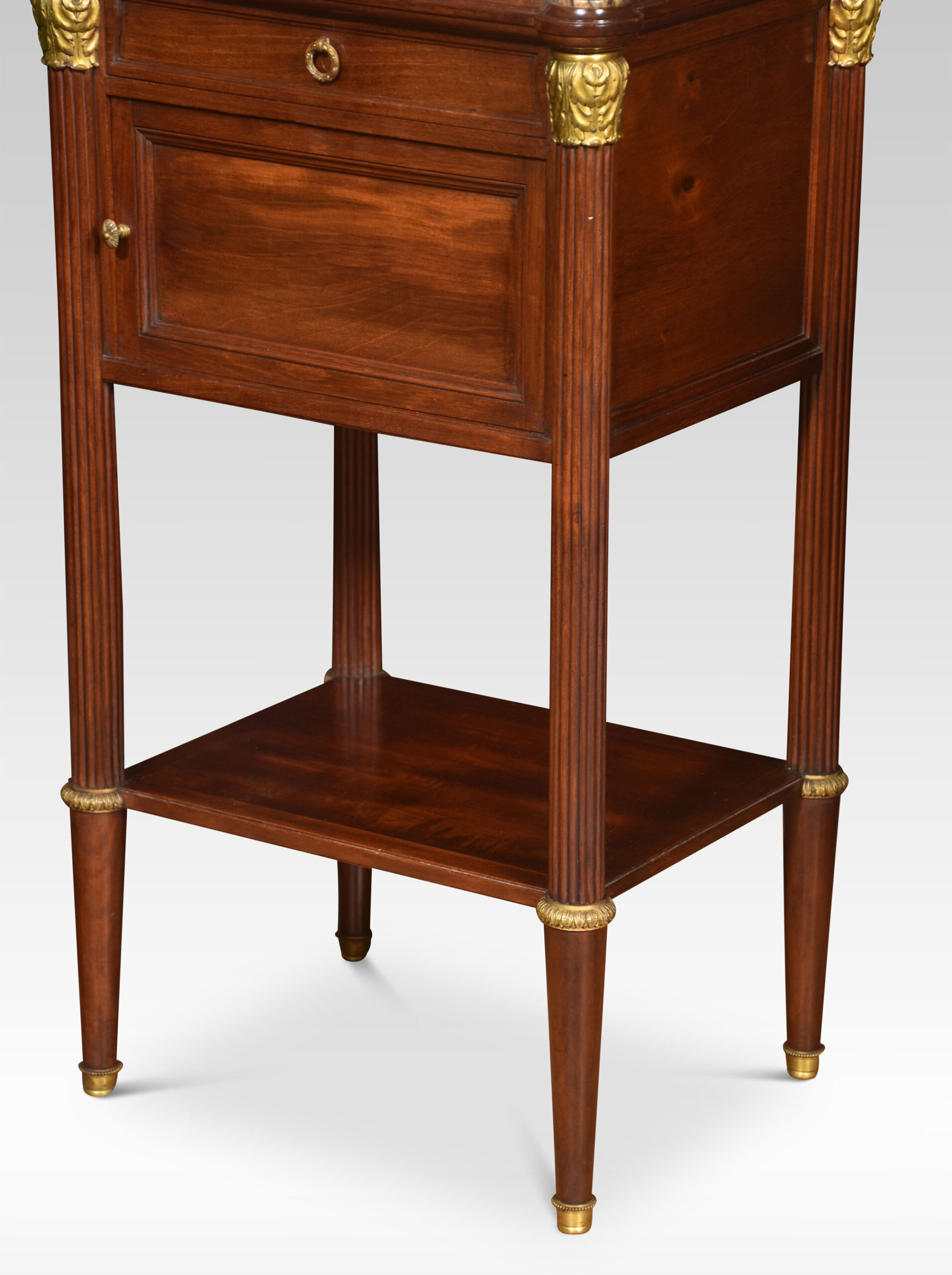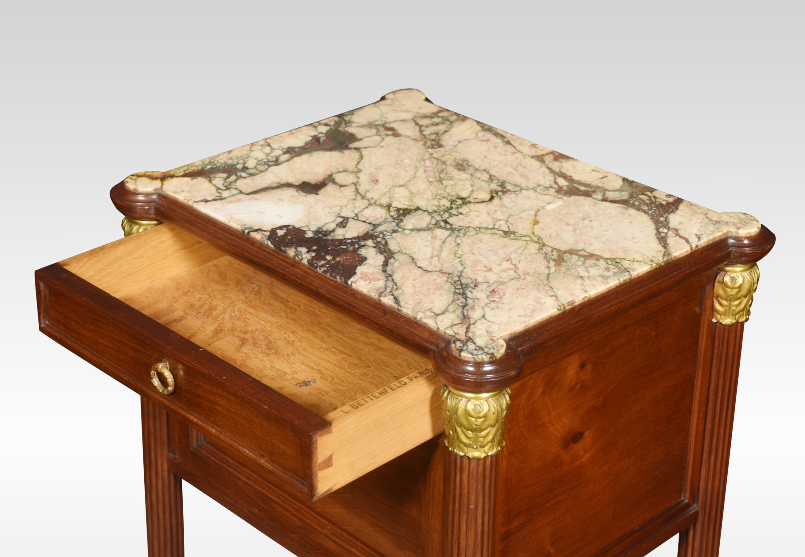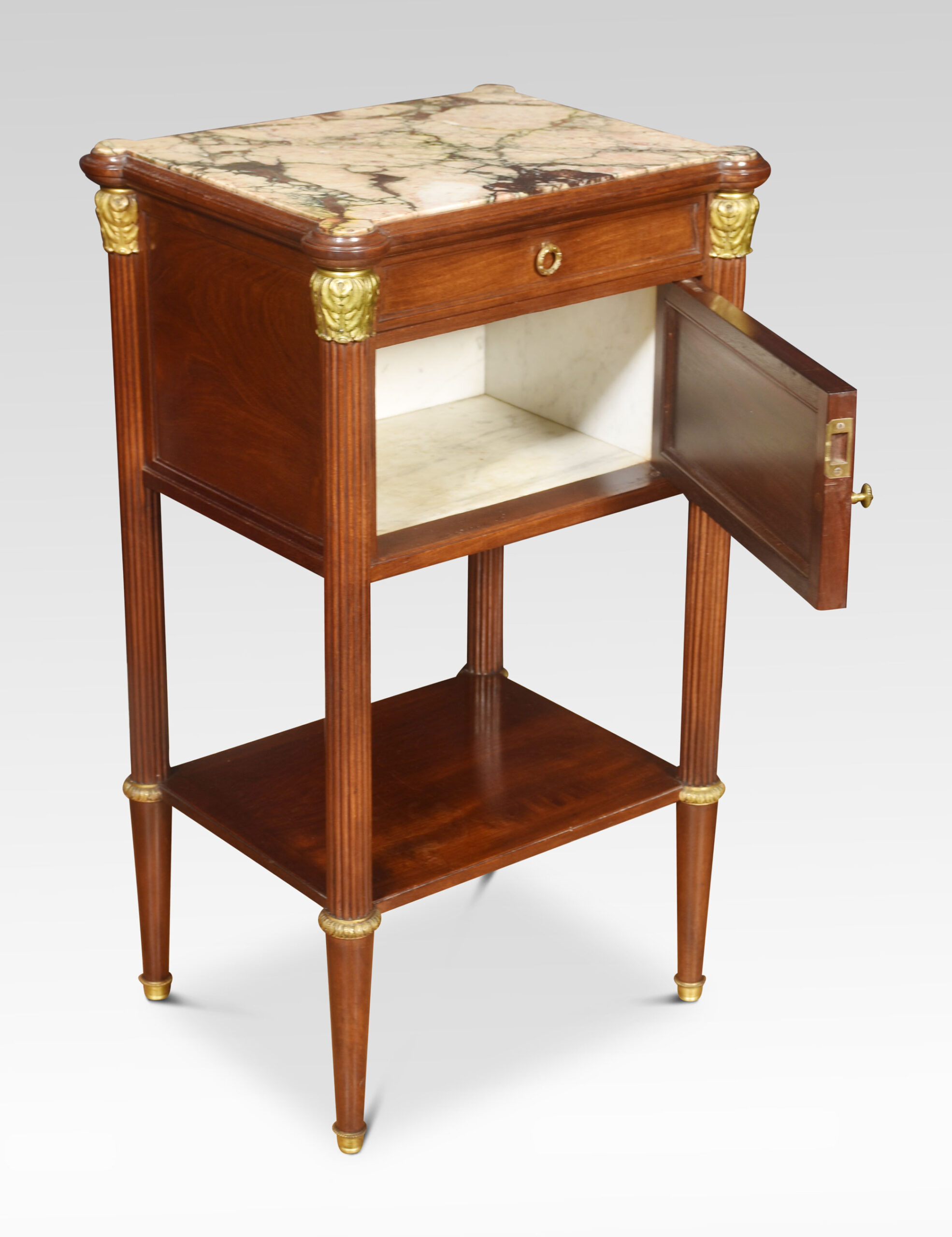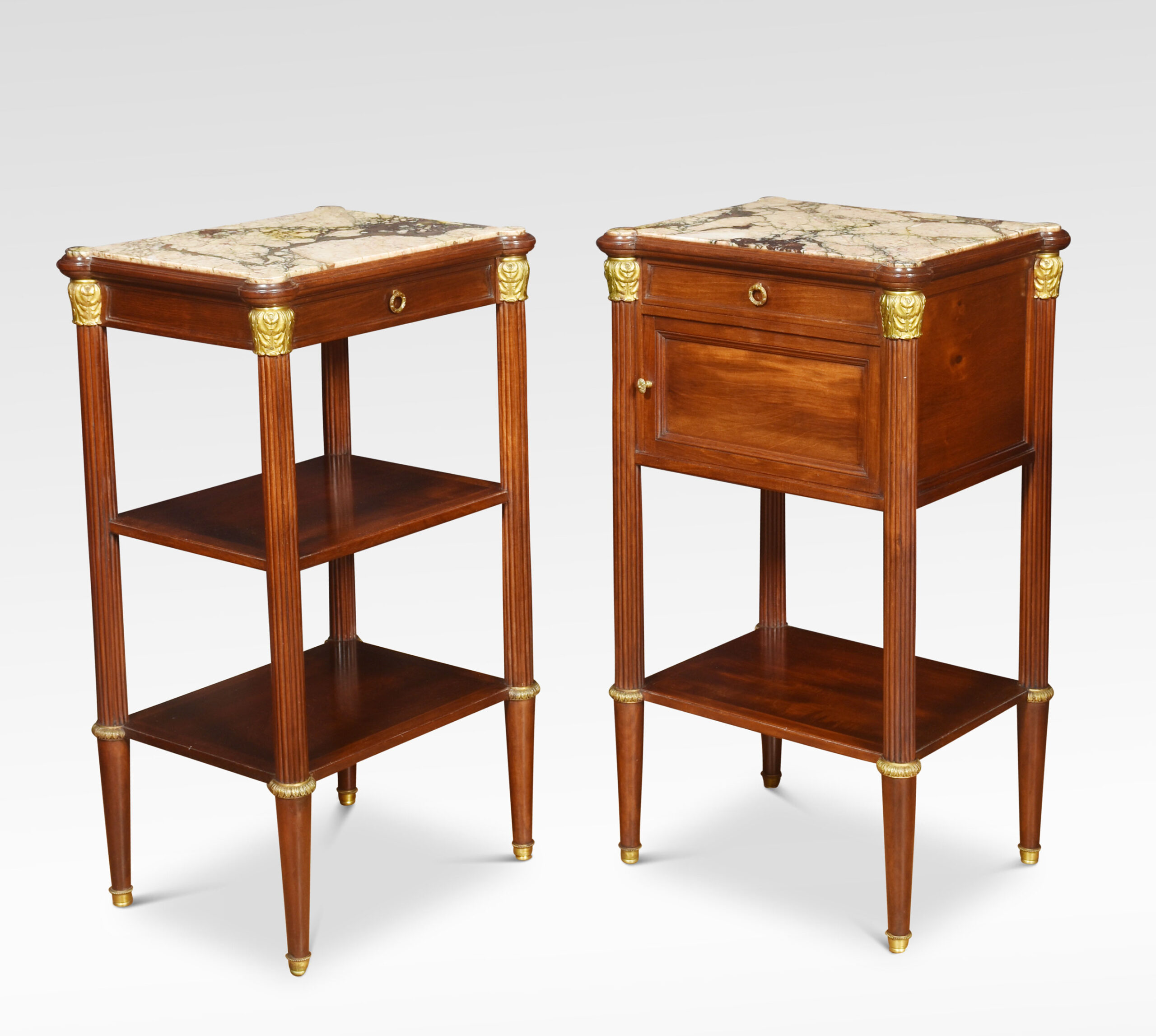Pair of Empire style nightstands, both having well-figured marble tops with rounded corners one stand fitted with a short drawer and cupboard below, the other with short drawer and shelving below. All raised up on tapering legs fitted with gilt metal mounts.