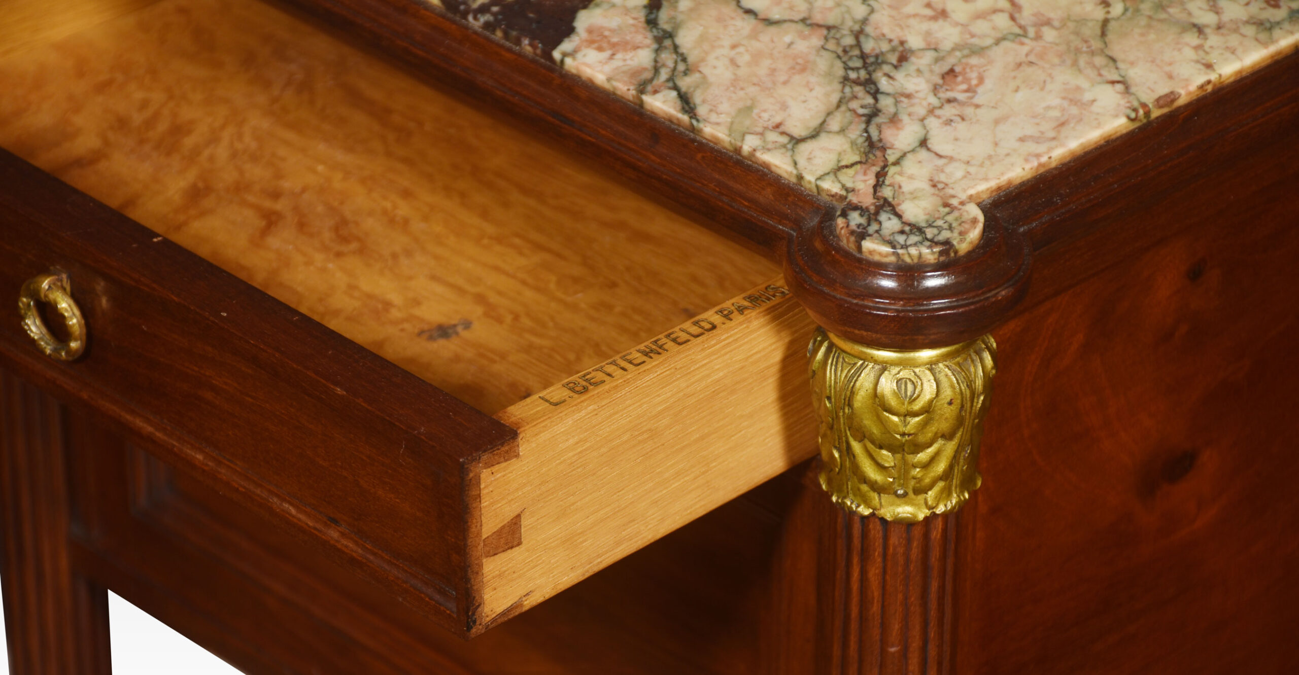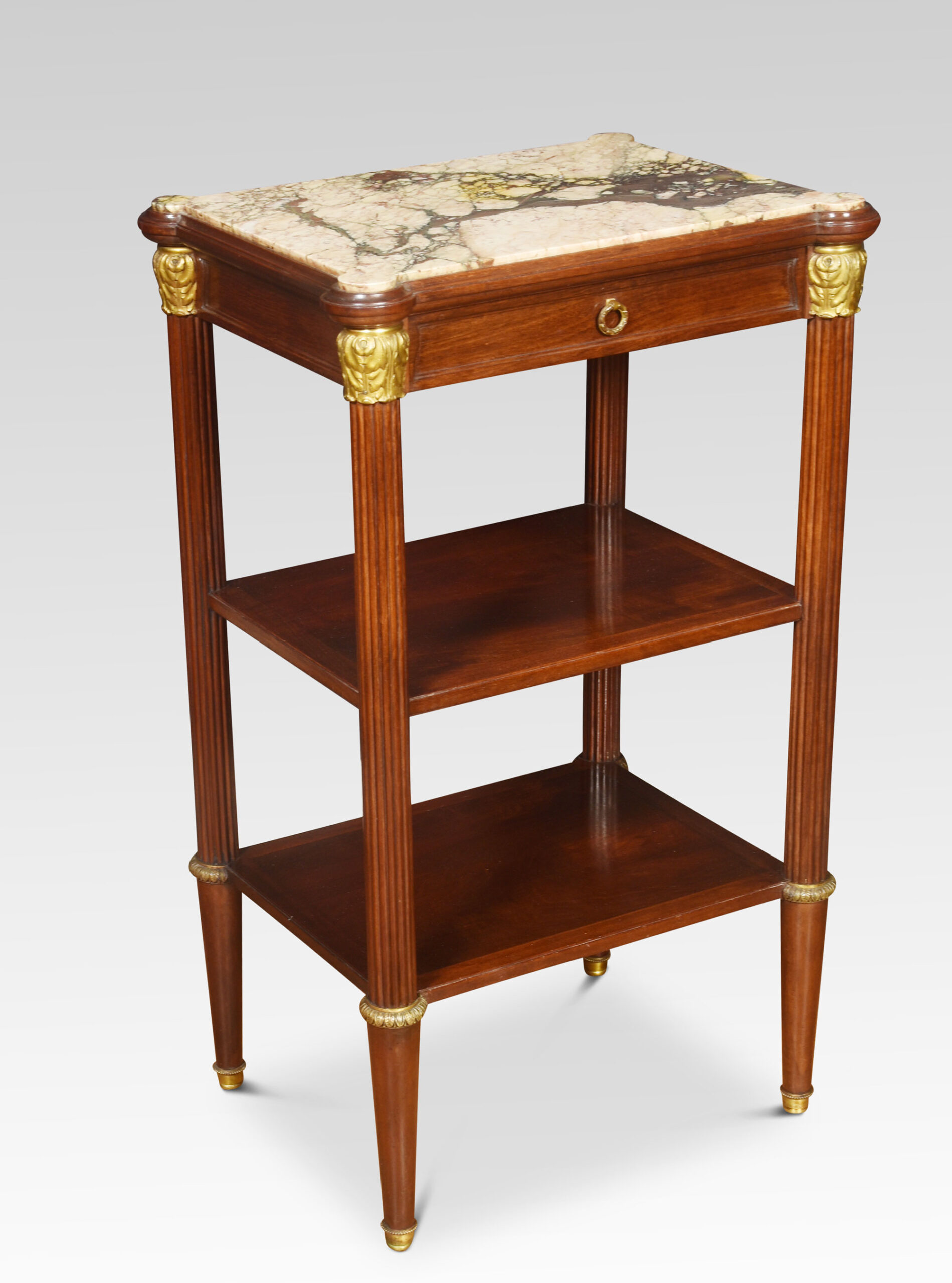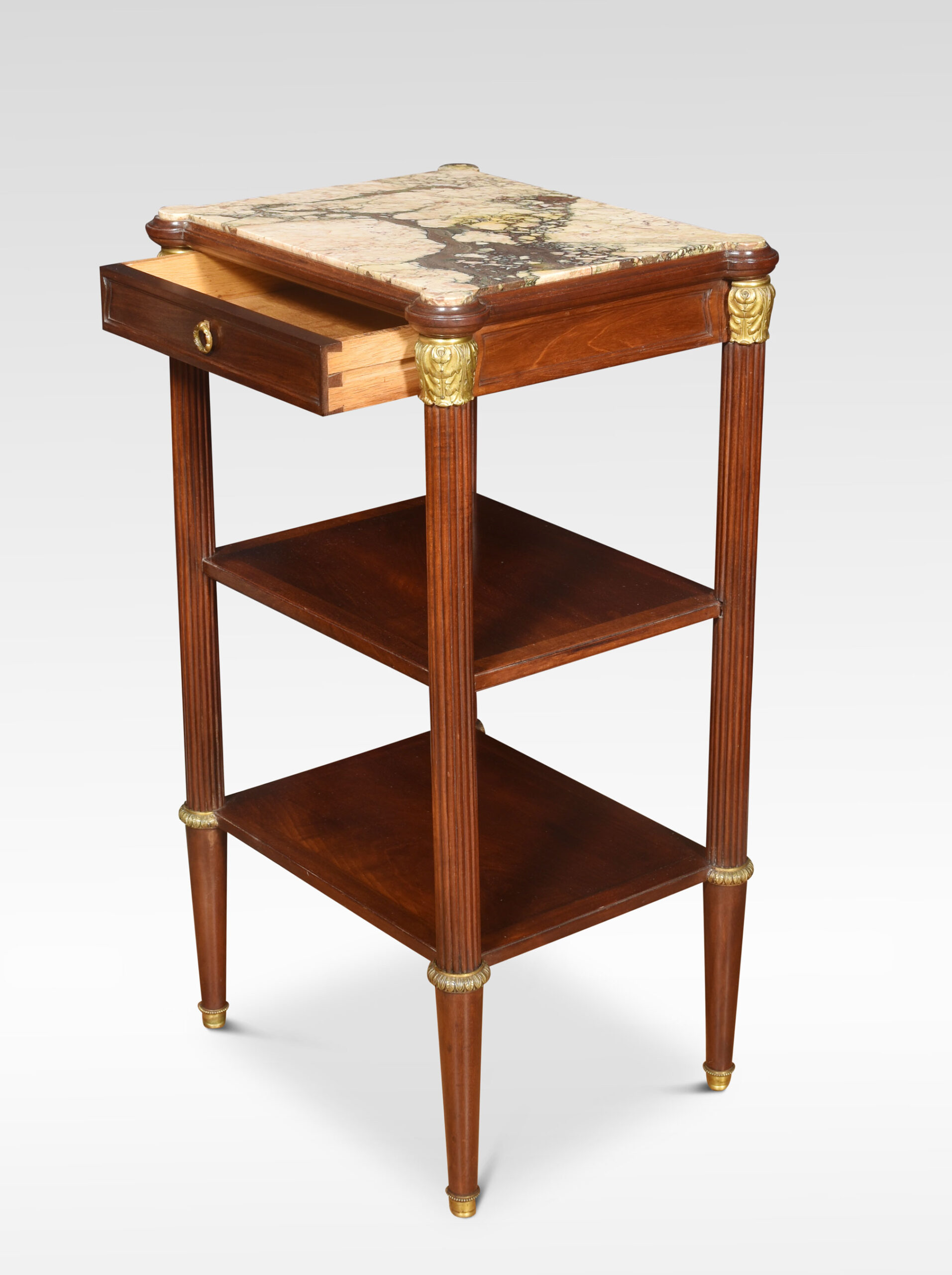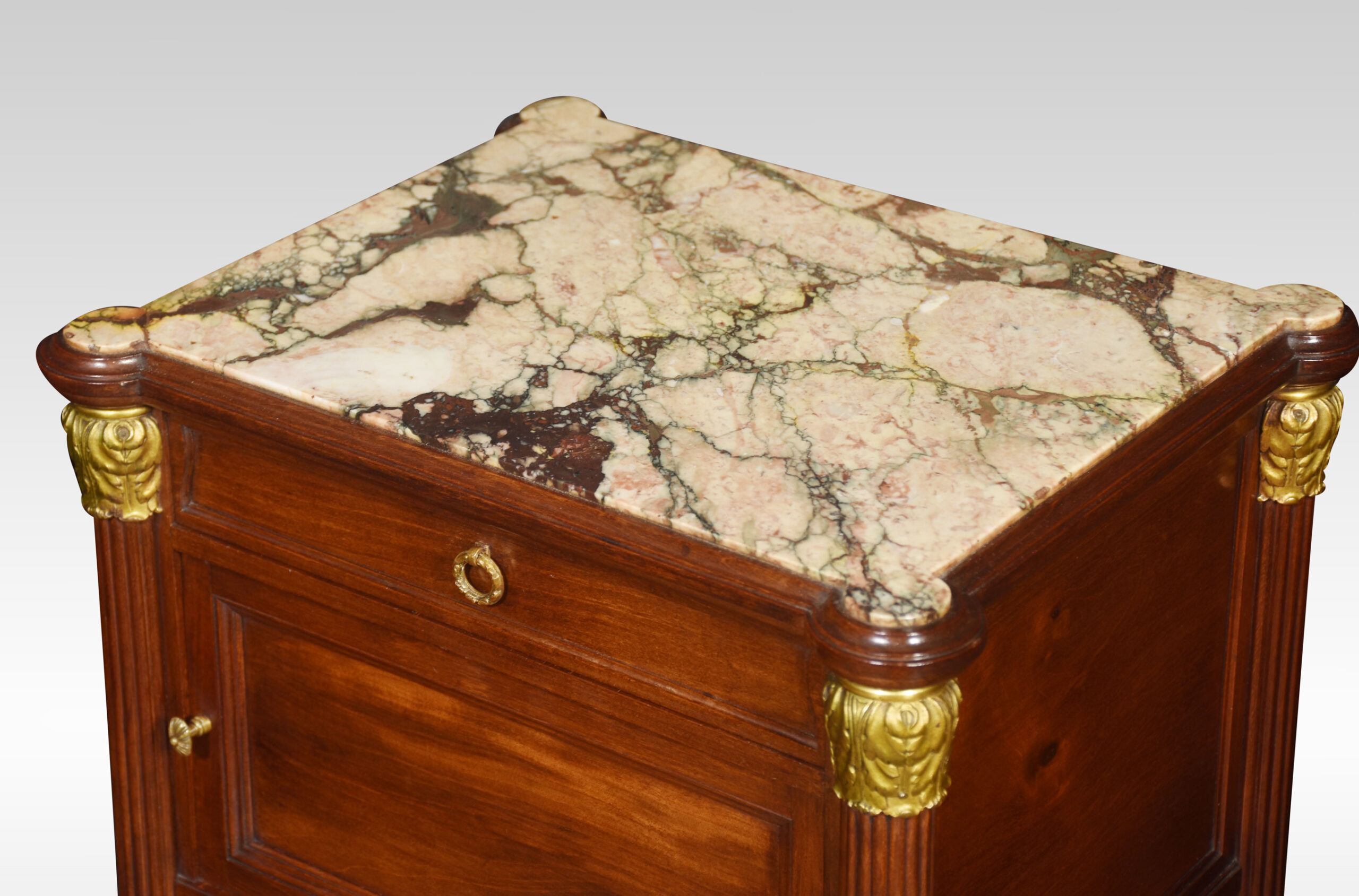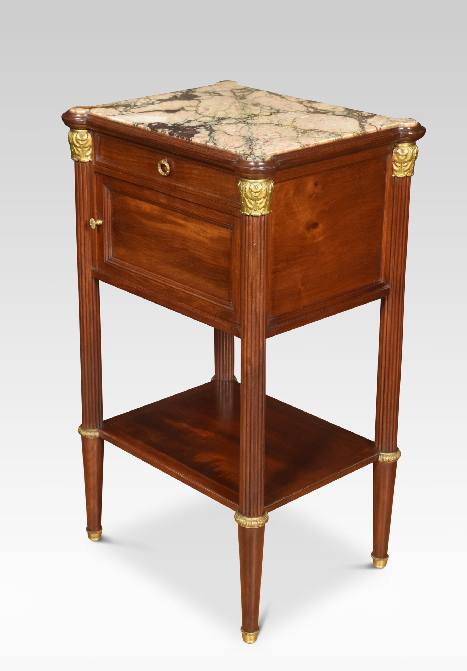 Pair of Empire style nightstands, both having well-figured marble tops with rounded corners one stand fitted with a short drawer and cupboard below, the other with short drawer and shelving below. All raised up on tapering legs fitted with gilt metal mounts.