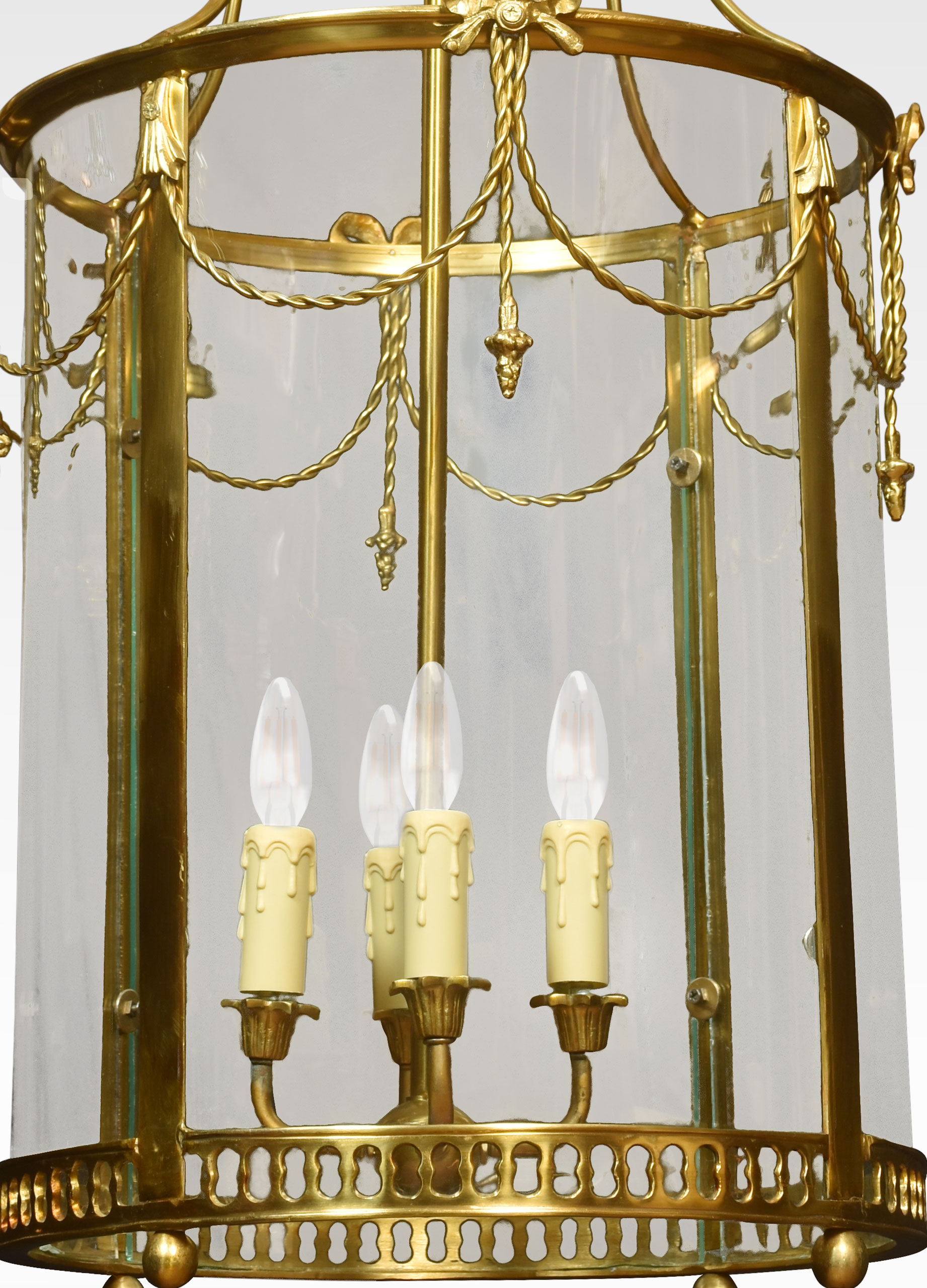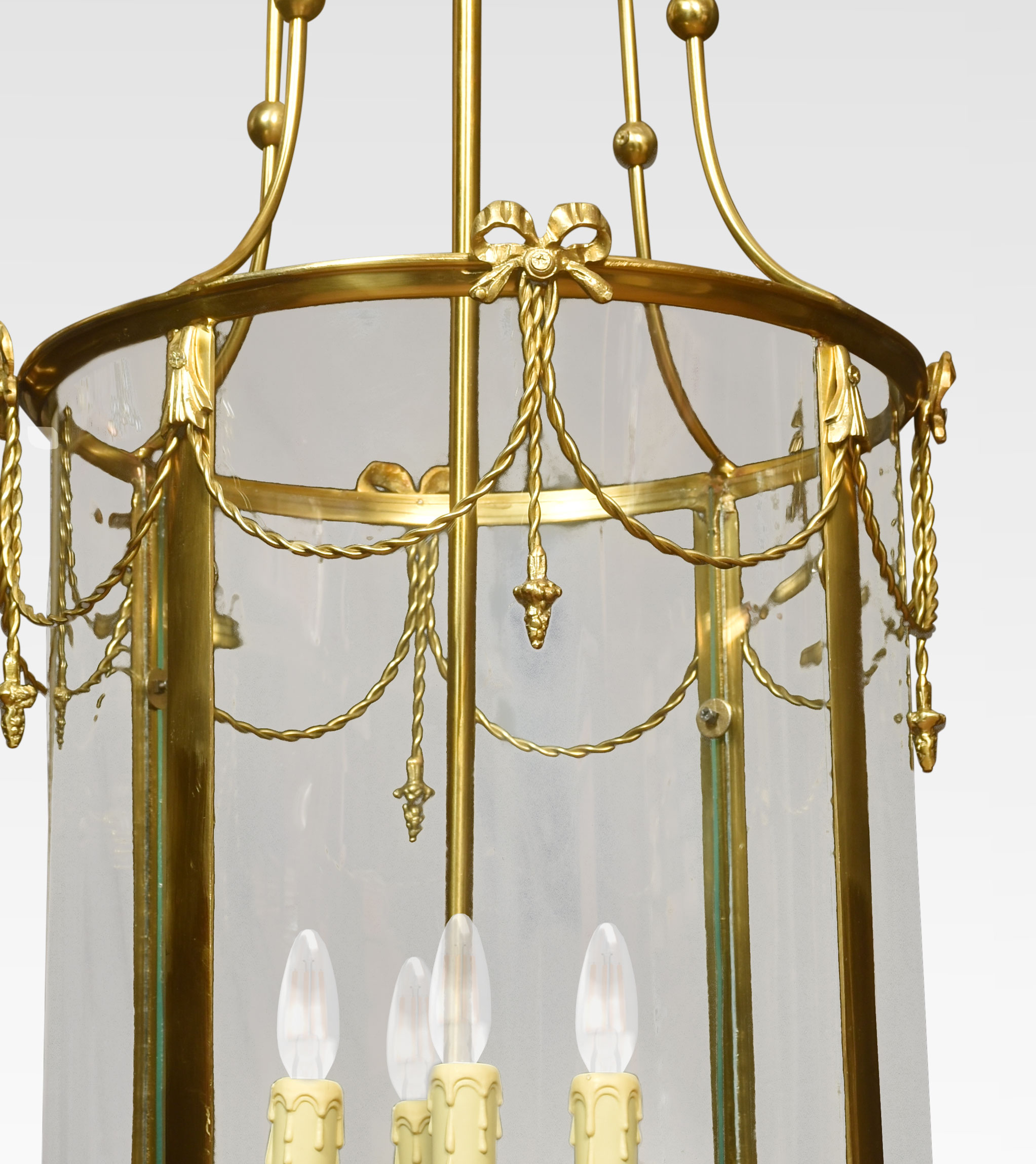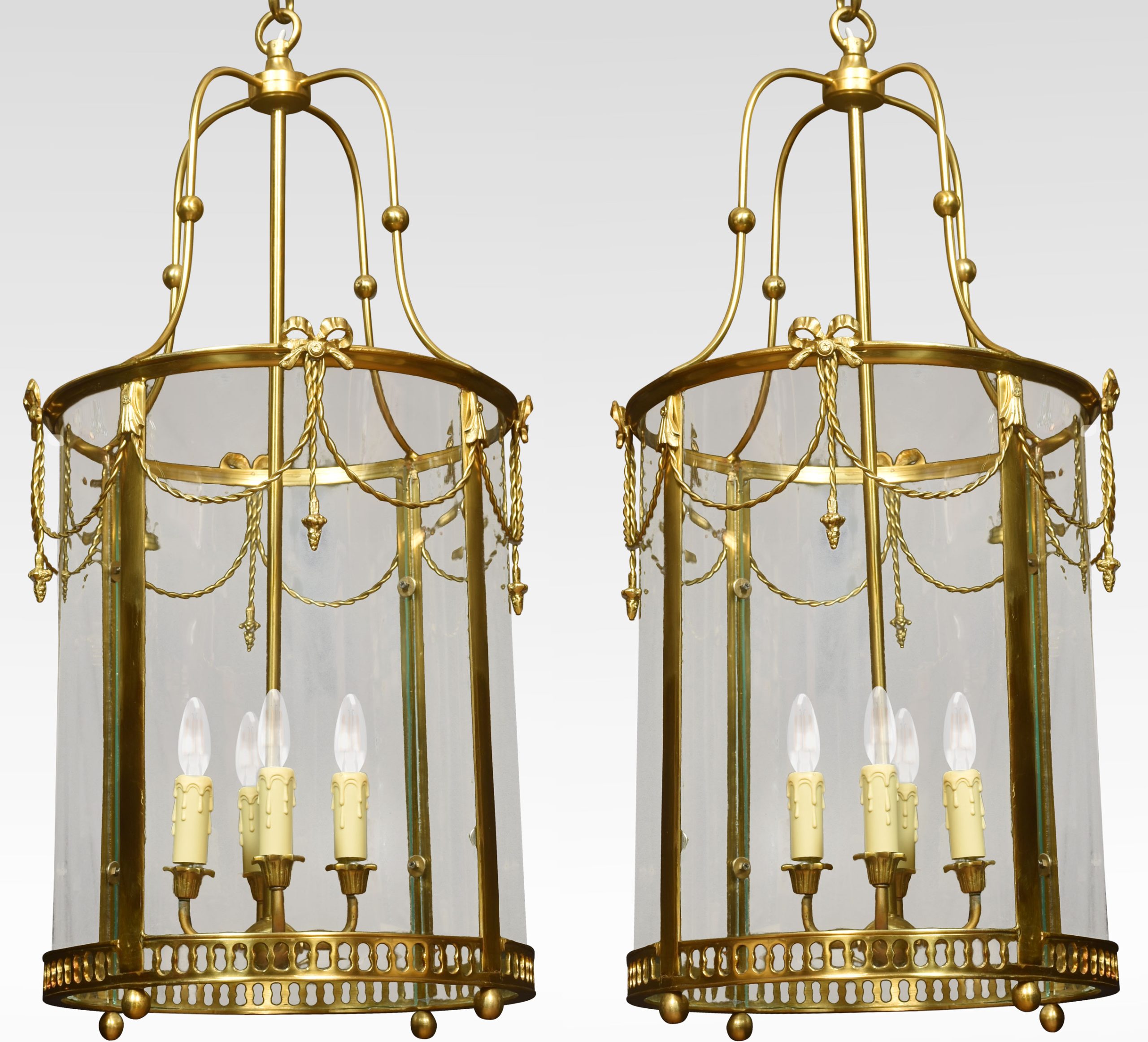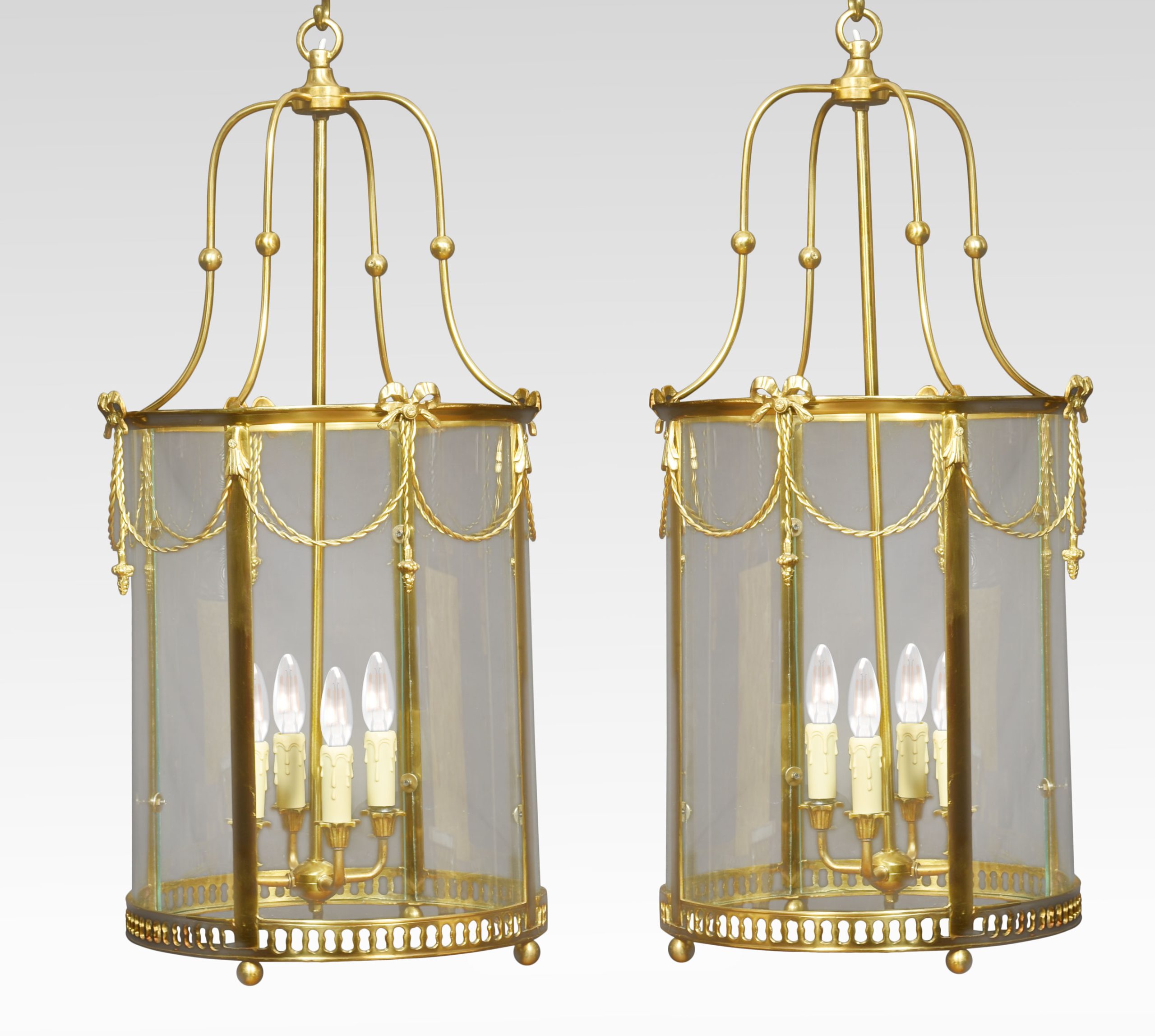 Pair of hall lanterns, the scrolling superstructure above a circular glazed body, with swag and bow decoration. enclosing a four-light electrolier. The lanterns have been rewired.