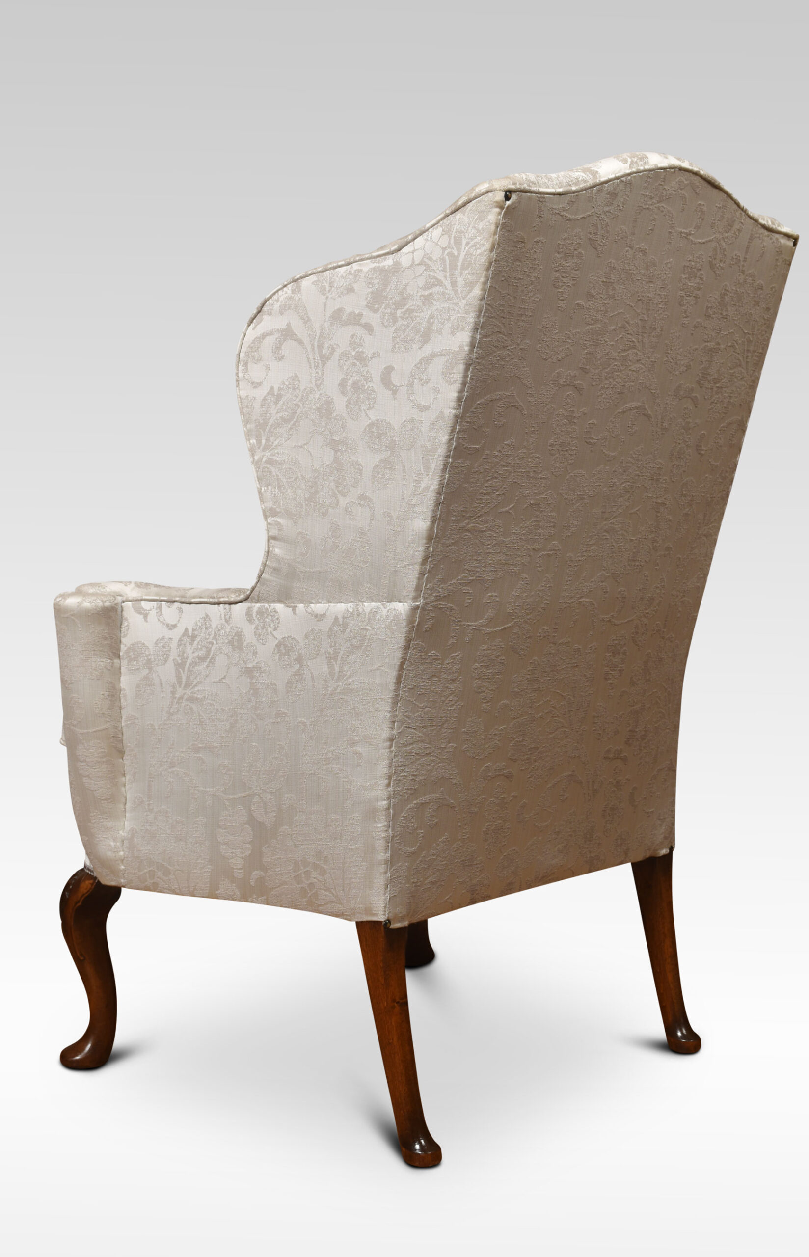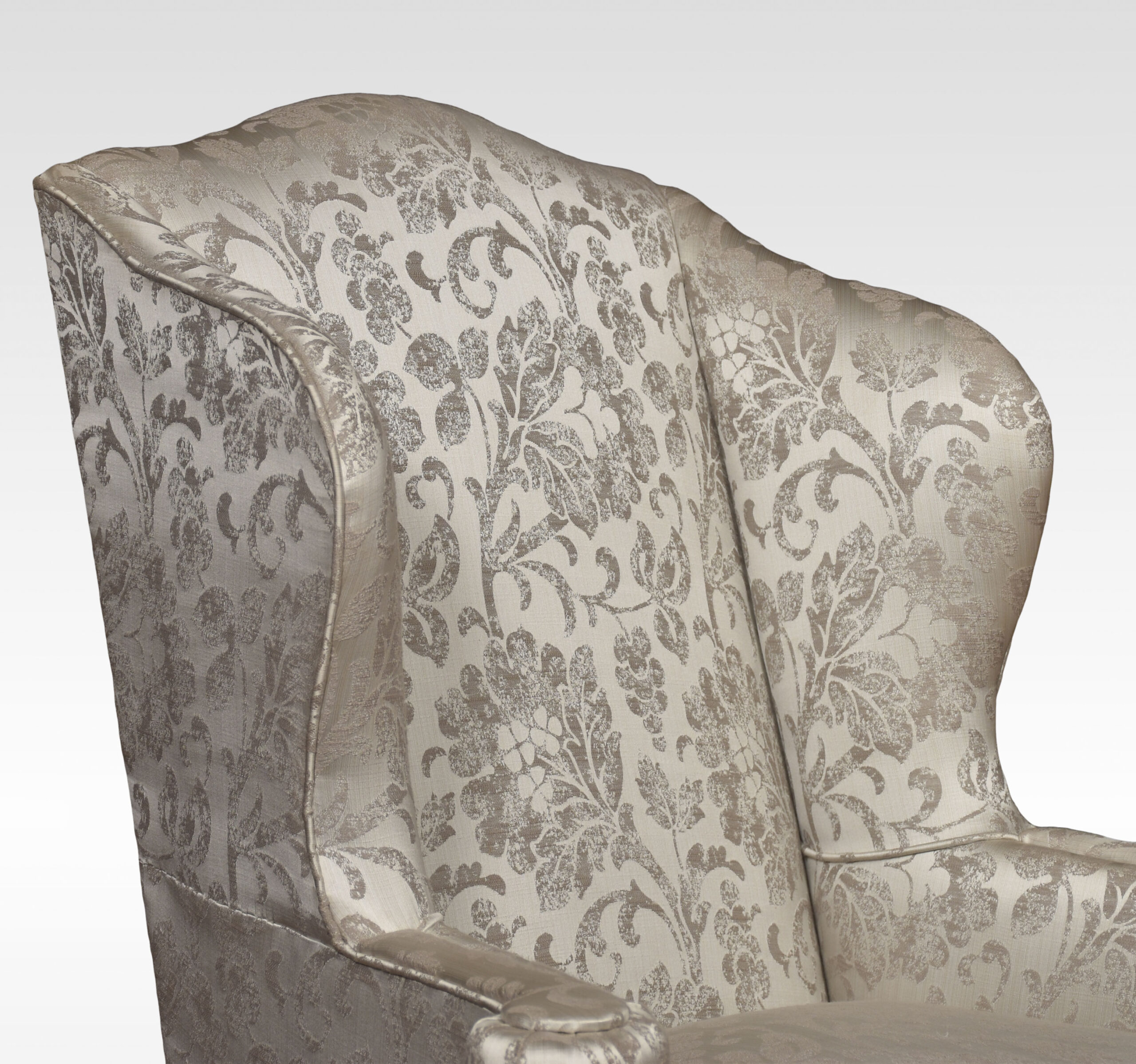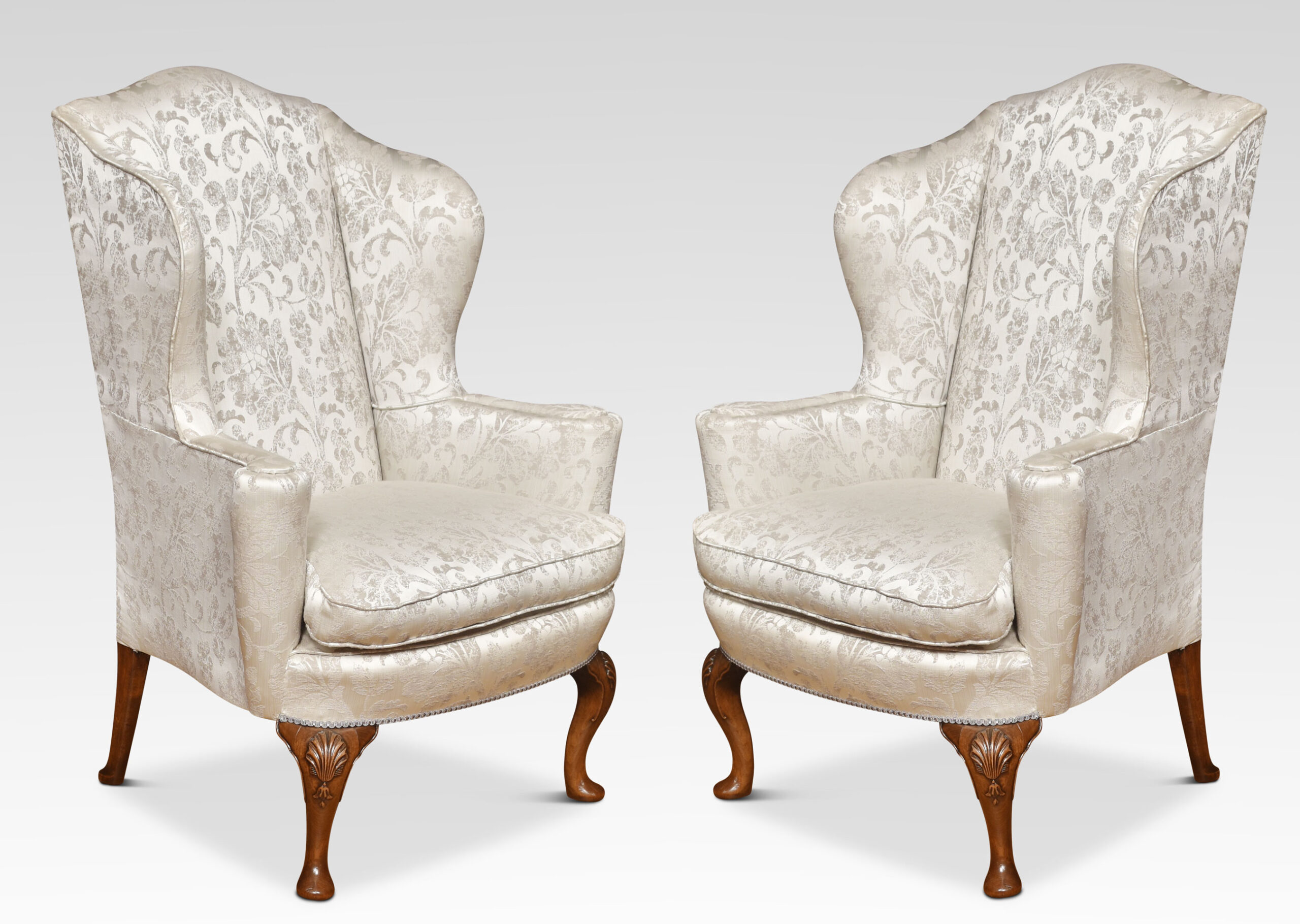 A pair of Georgian-style armchairs, the winged back, and upholstered seat, flaked by outswept arms. All raised up on shell capped cabriole front sports.