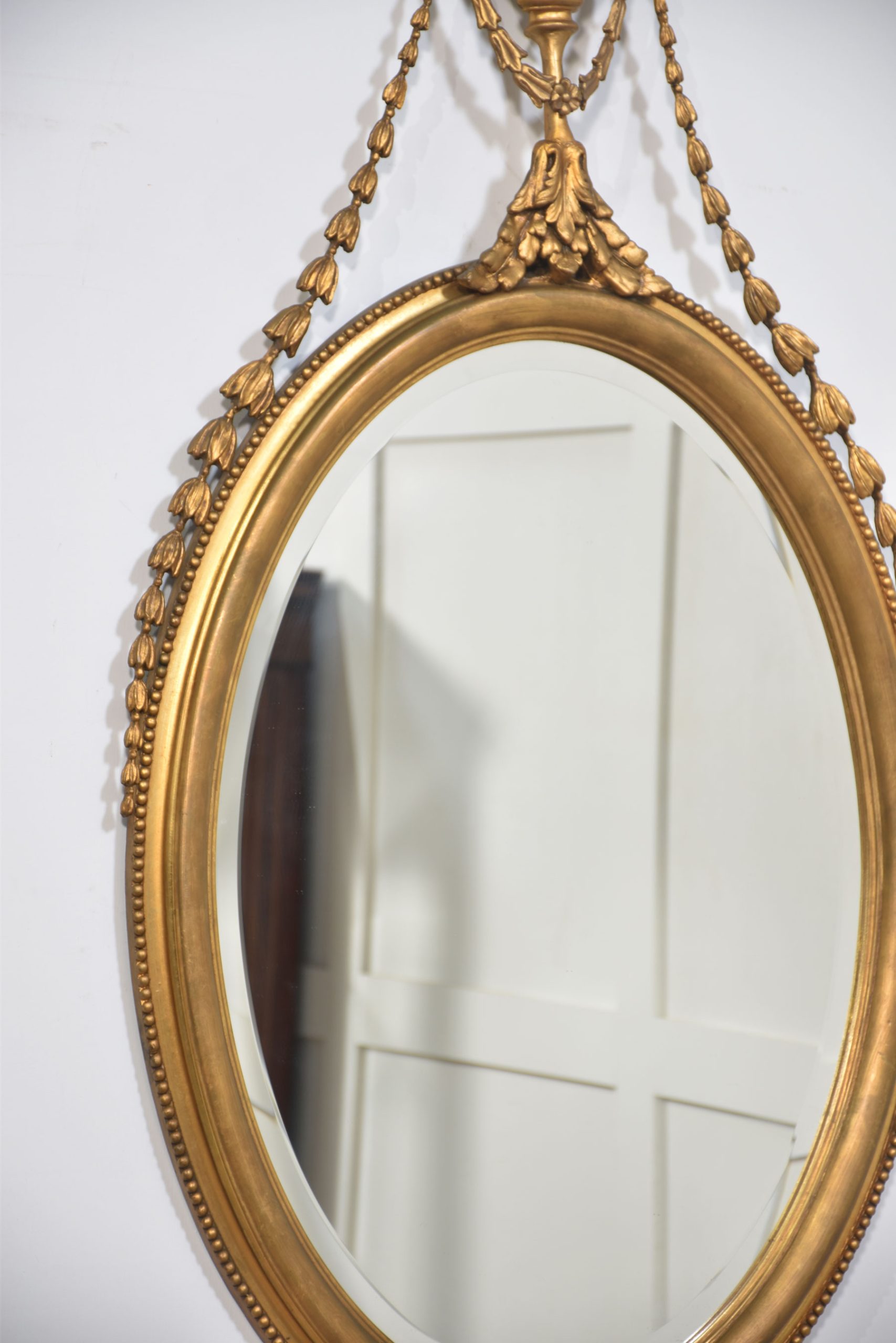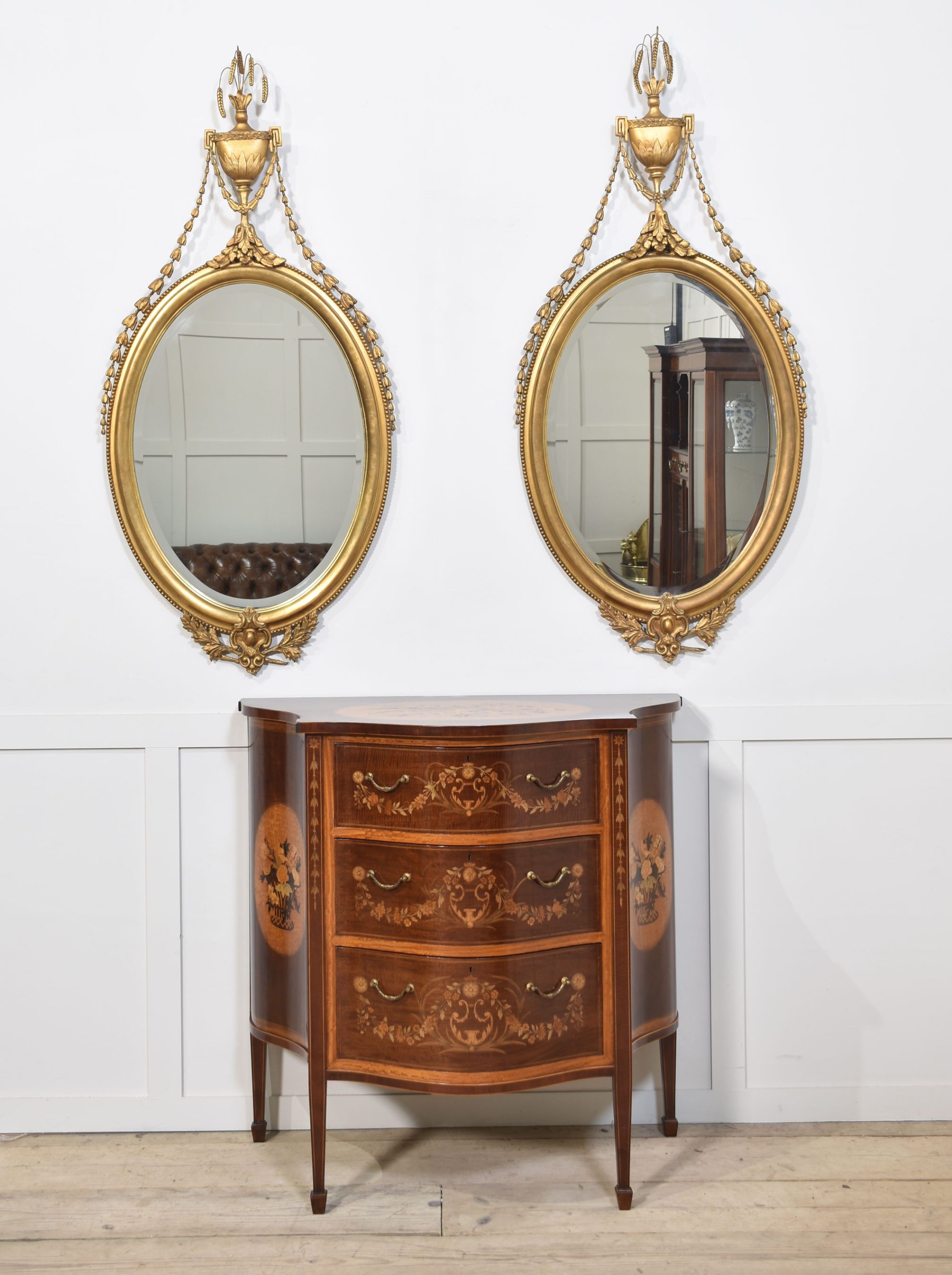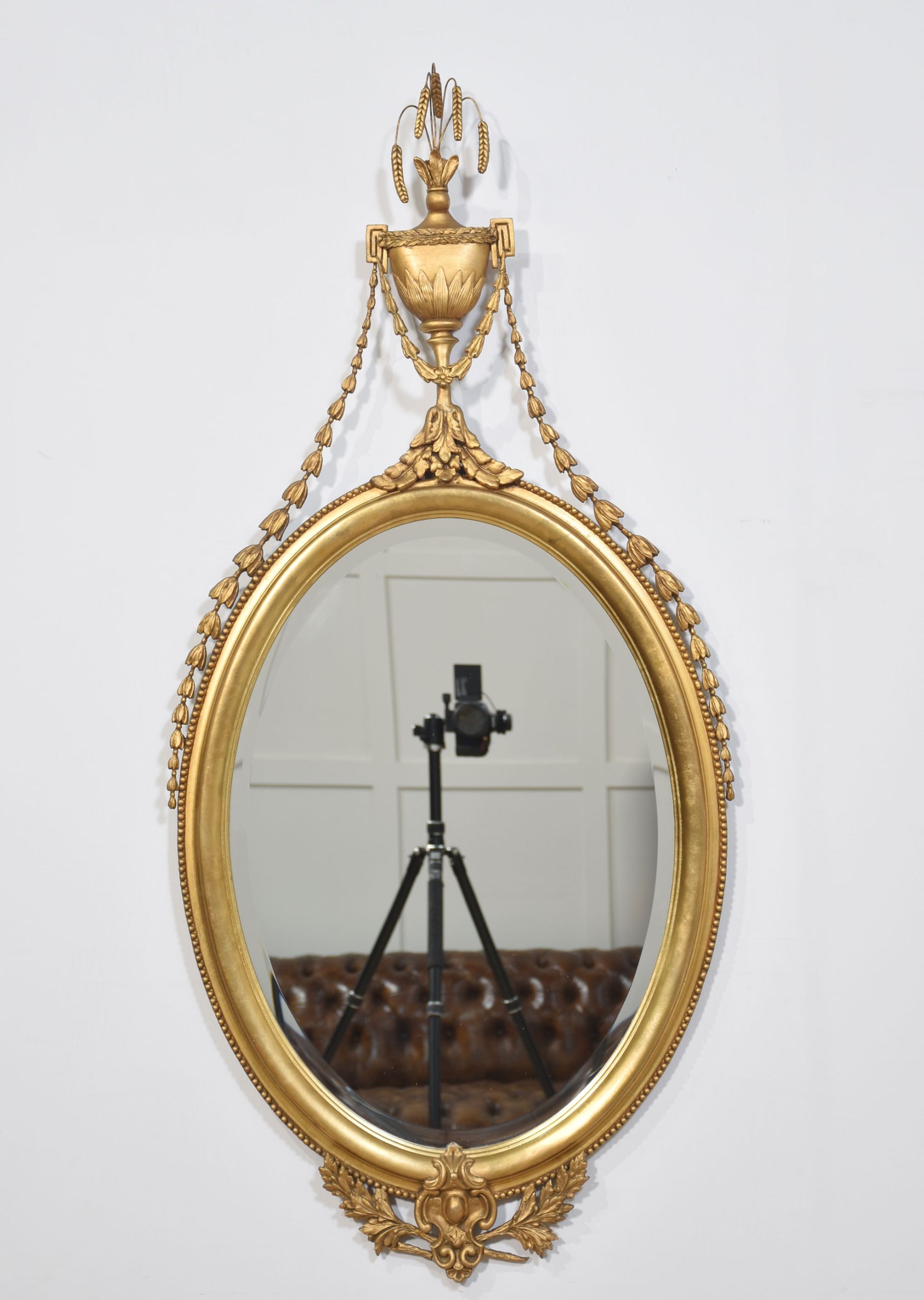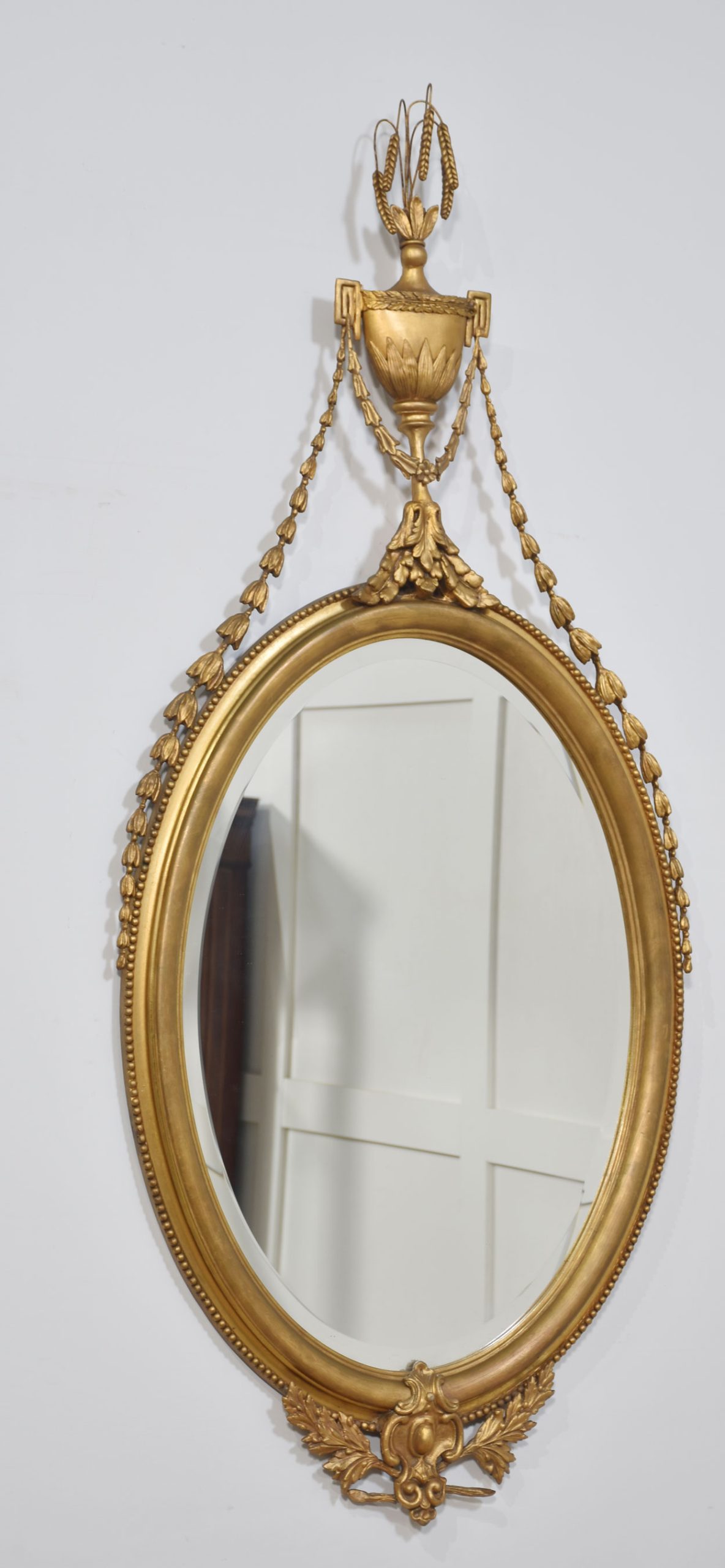 Pair of Georgian style wall mirrors, with catkin and urn pediment supporting the bell flower crestings. To the large central oval bevelled mirror plate above the foliated apron.