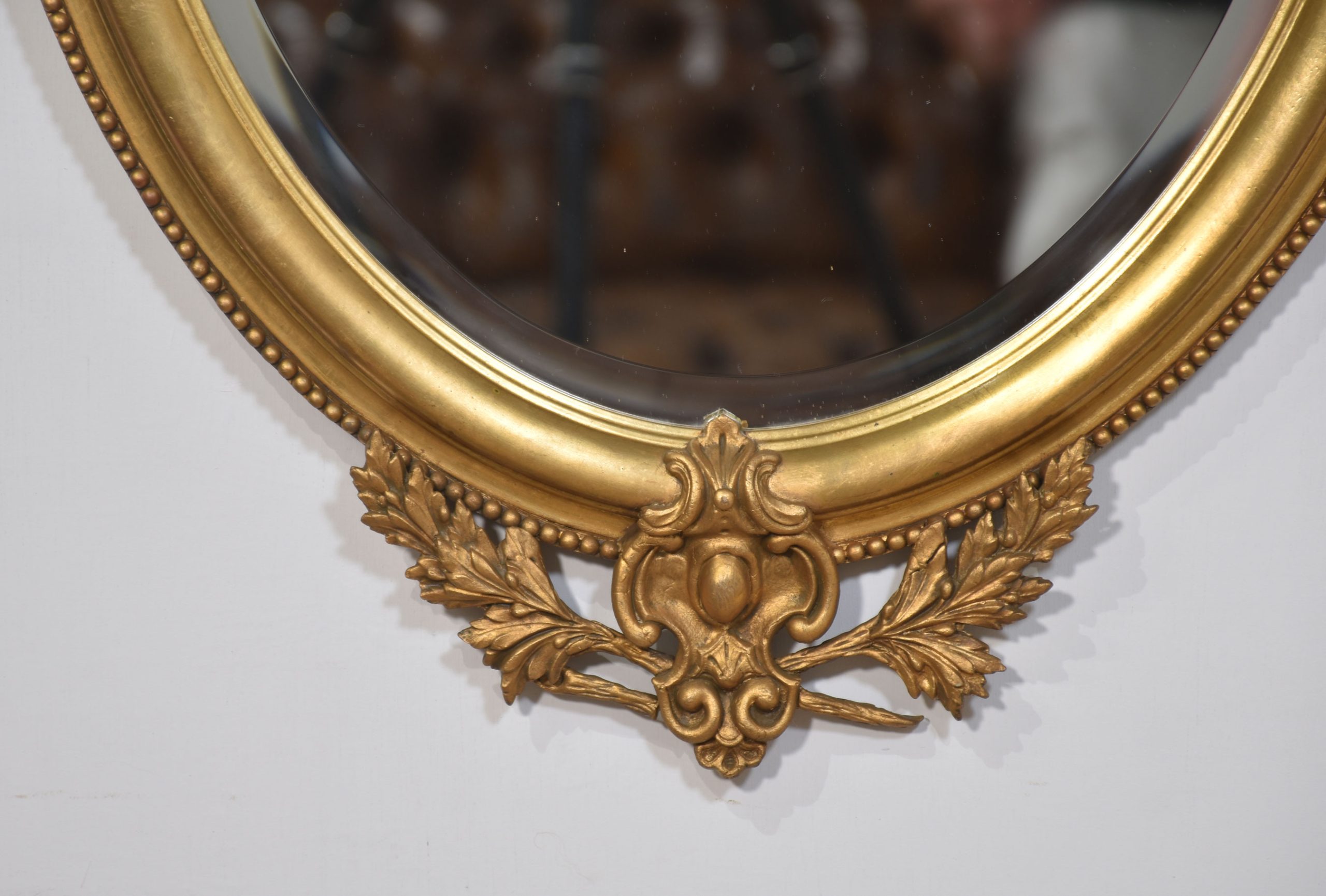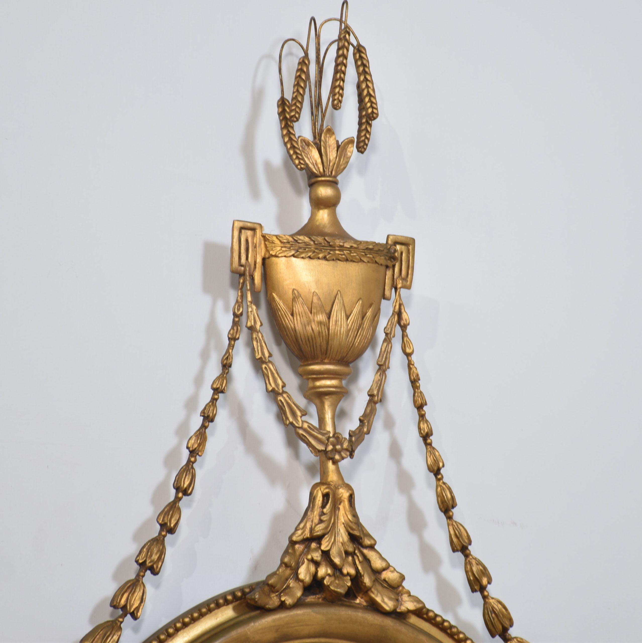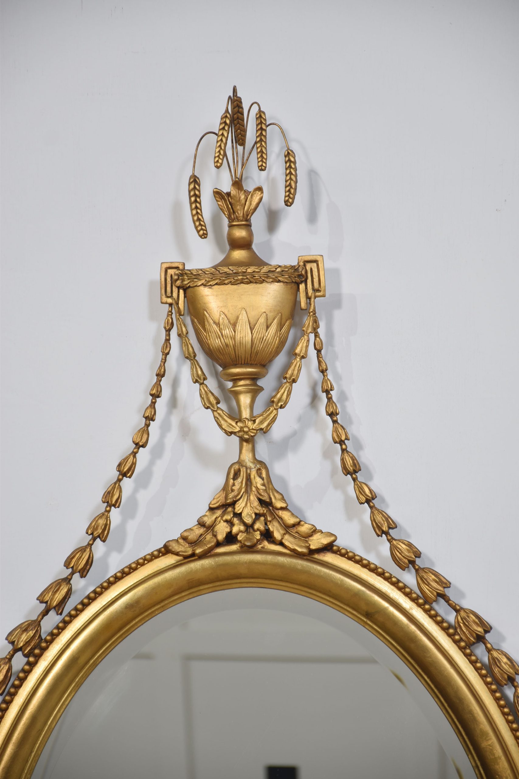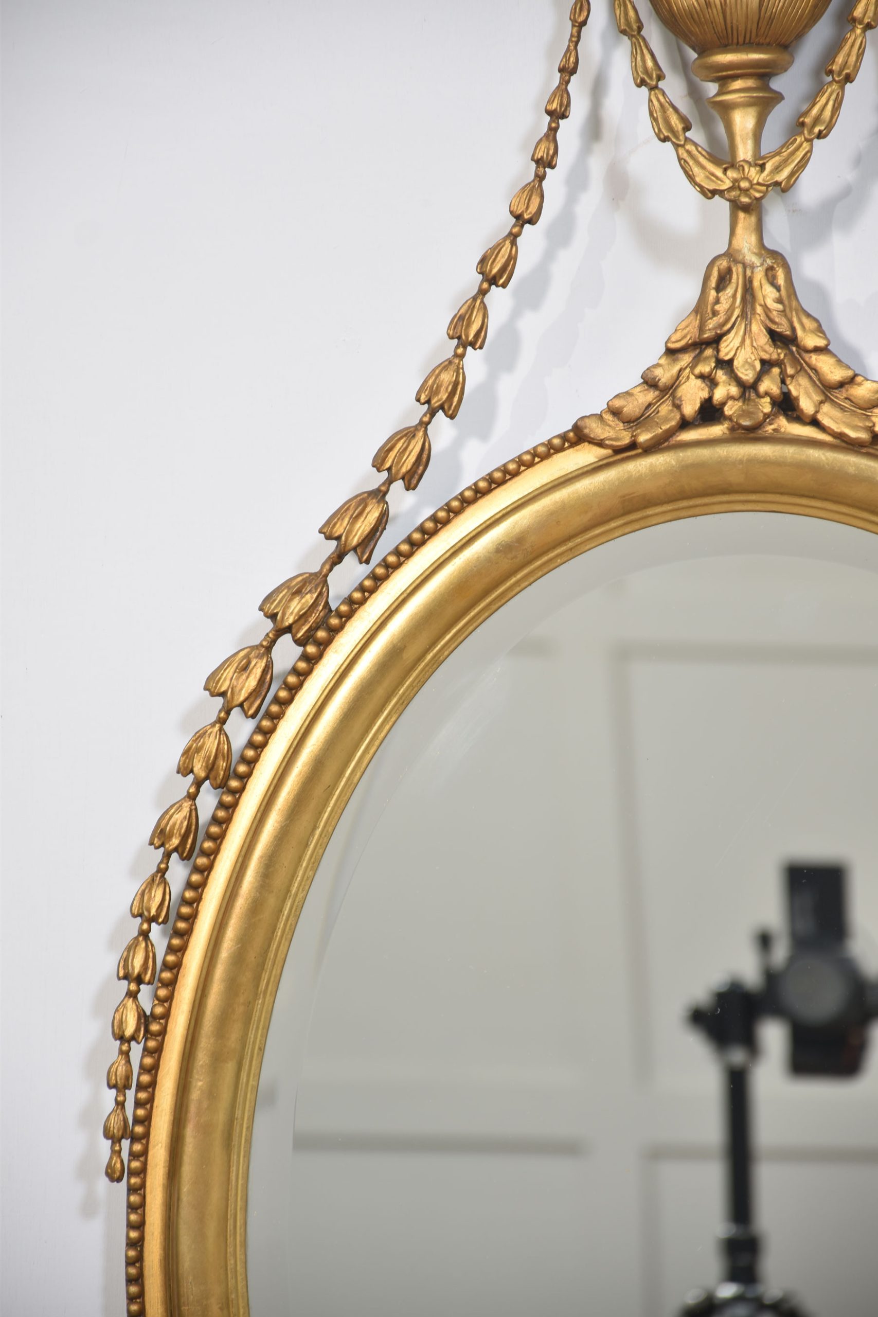 Pair of Georgian style wall mirrors, with catkin and urn pediment supporting the bell flower crestings. To the large central oval bevelled mirror plate above the foliated apron.