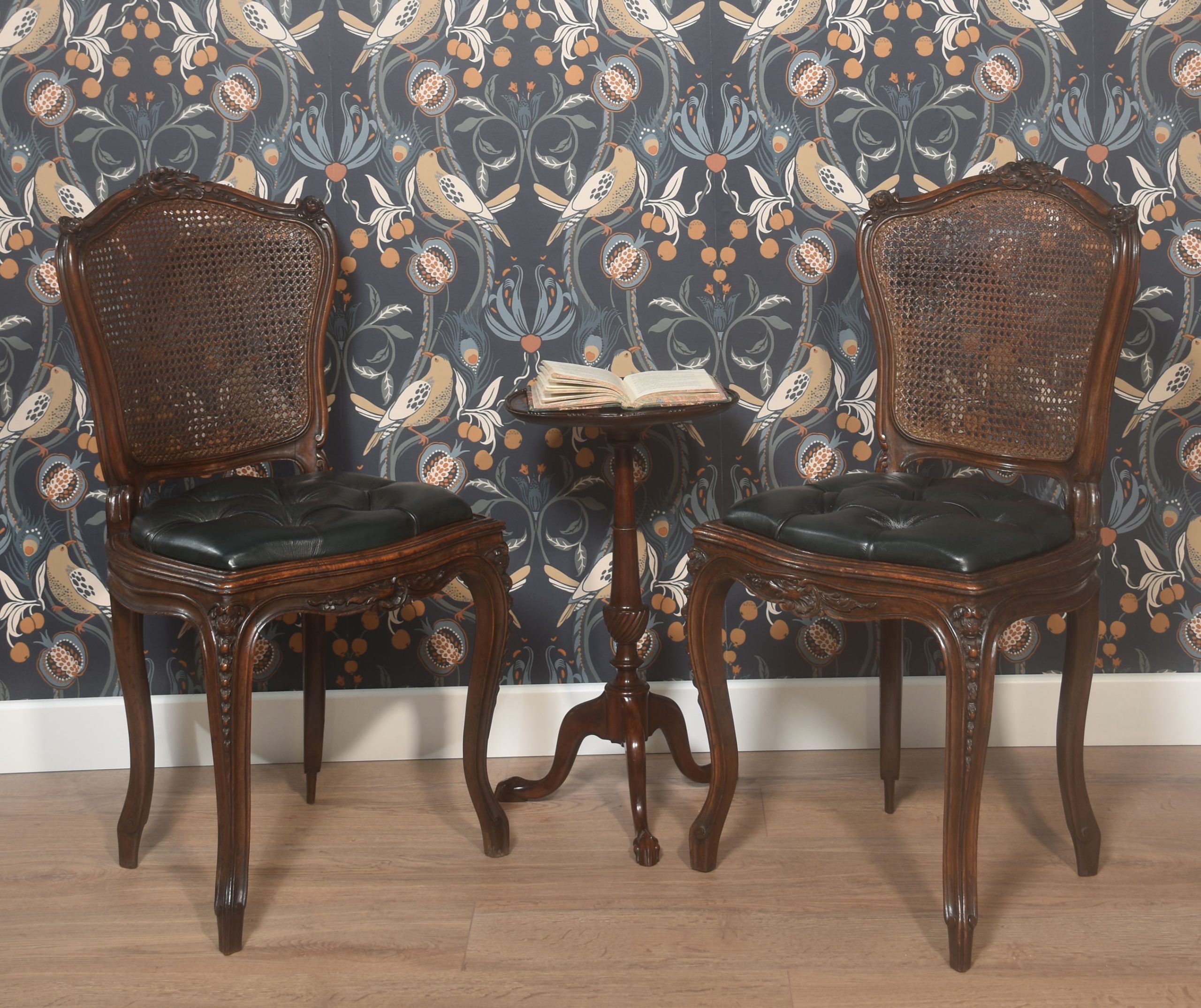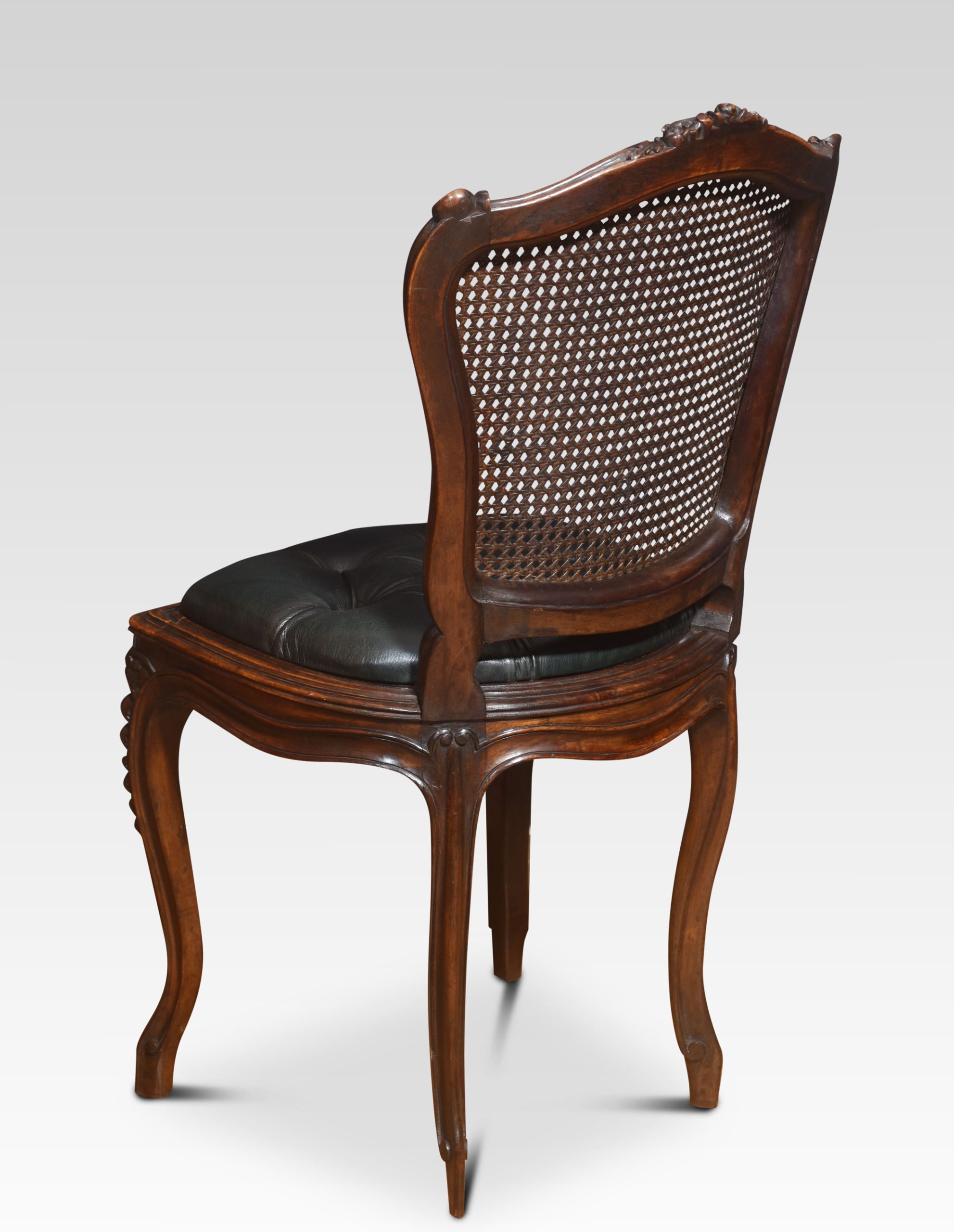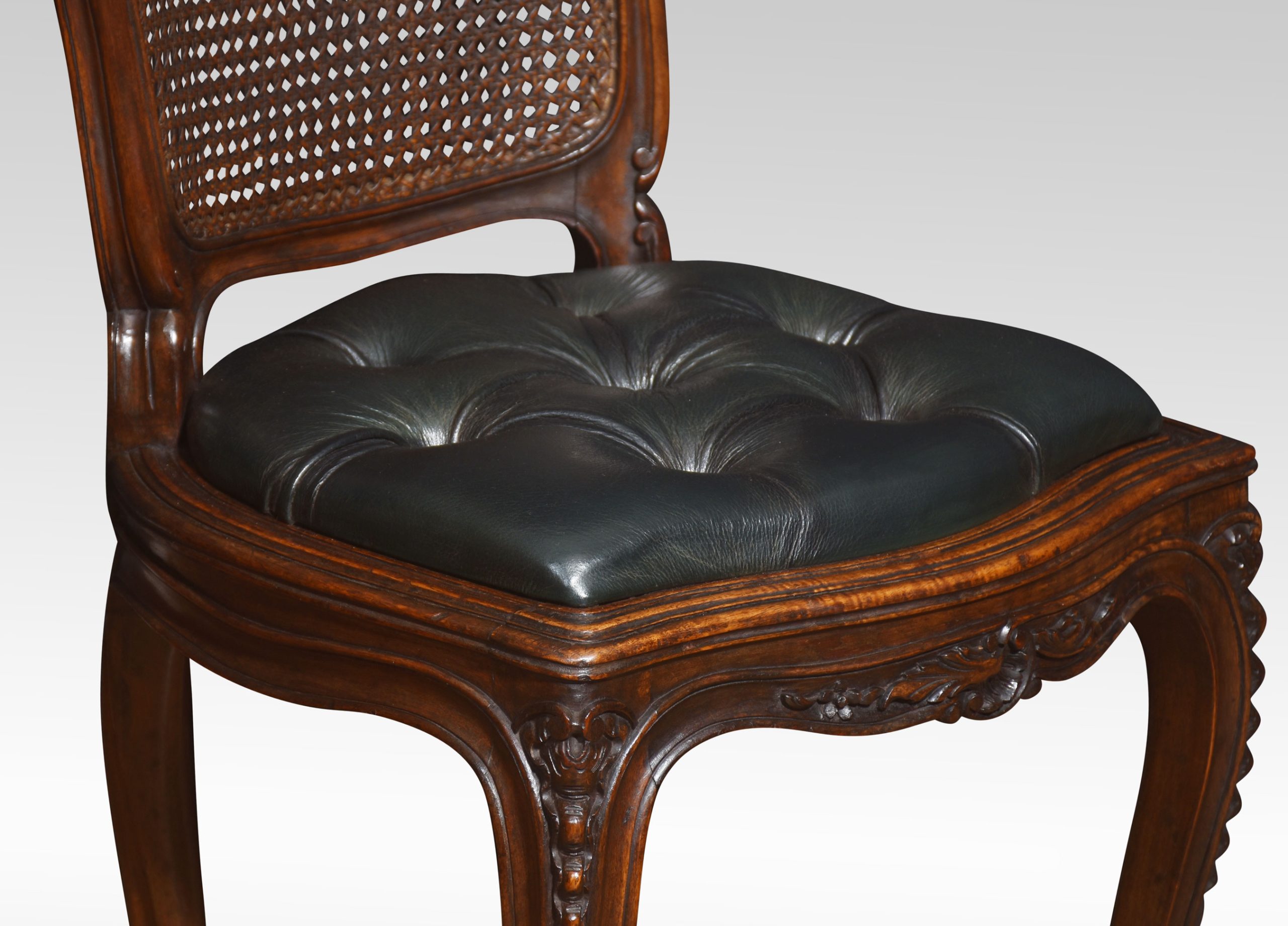 Pair of French Louis XV side chairs, the carved rail in the typical manner of the period, with detailed leaf motifs. to the canework back and deep buttoned leather seat. All raised up on four carved tapering cabriole legs