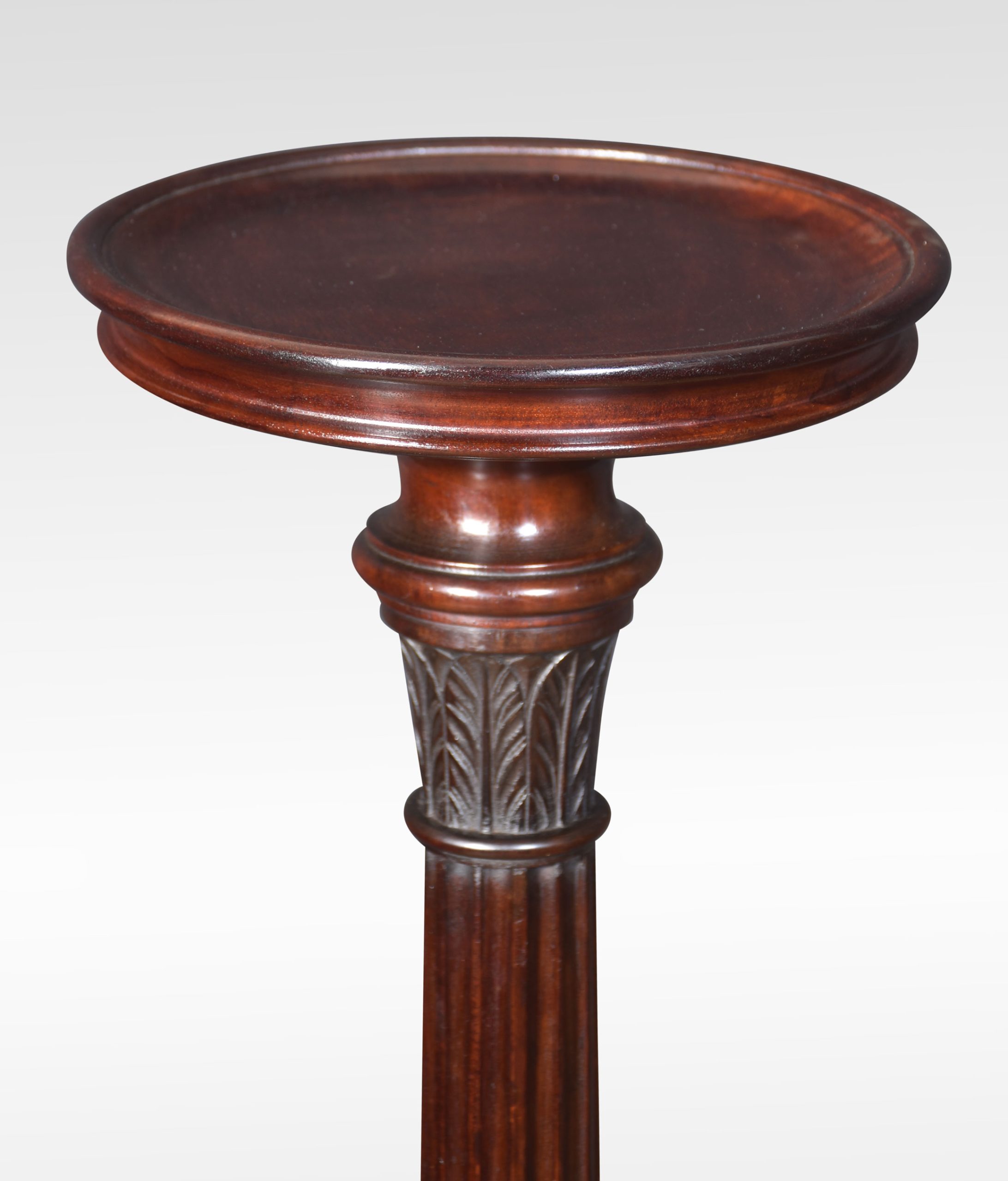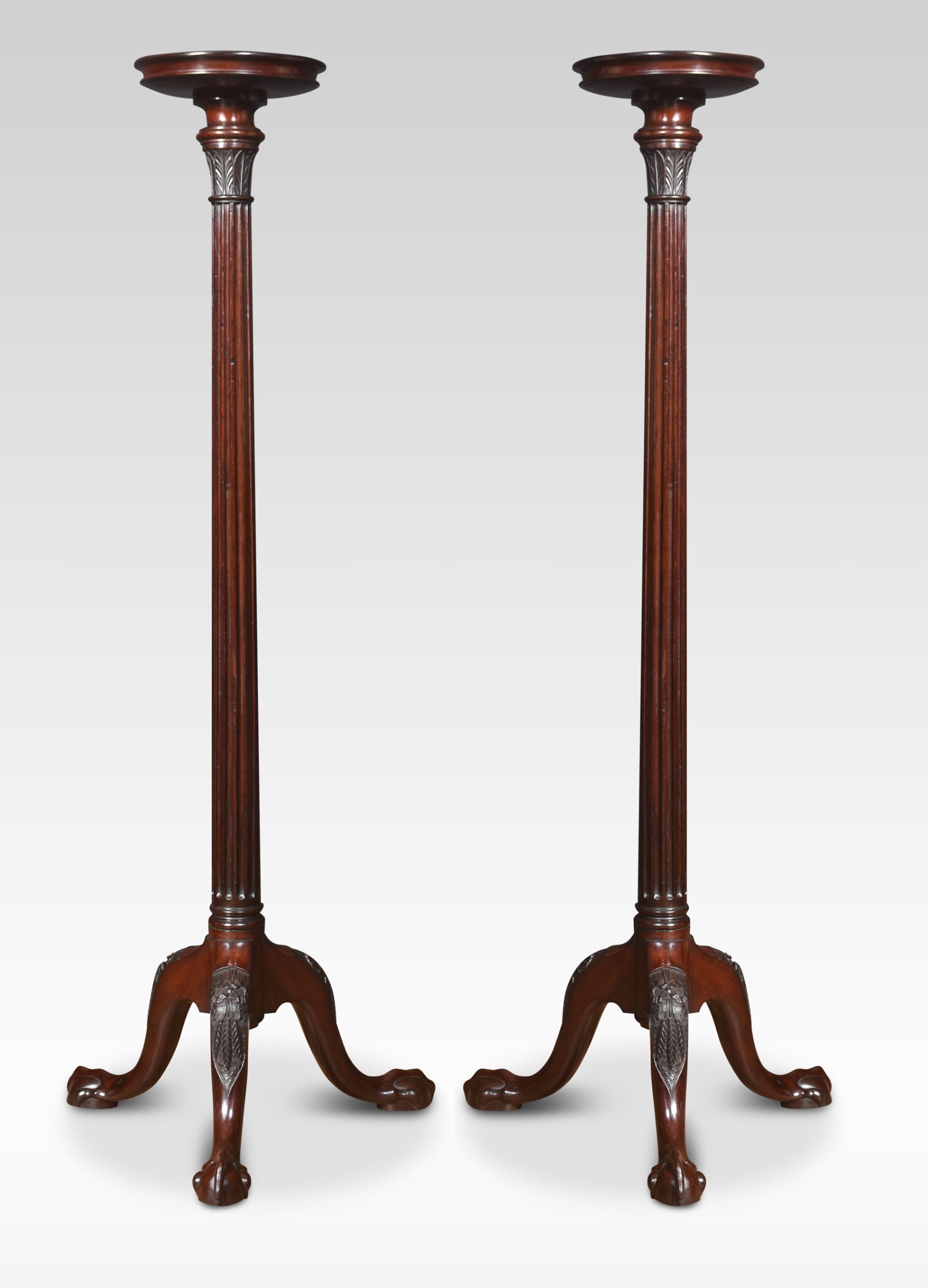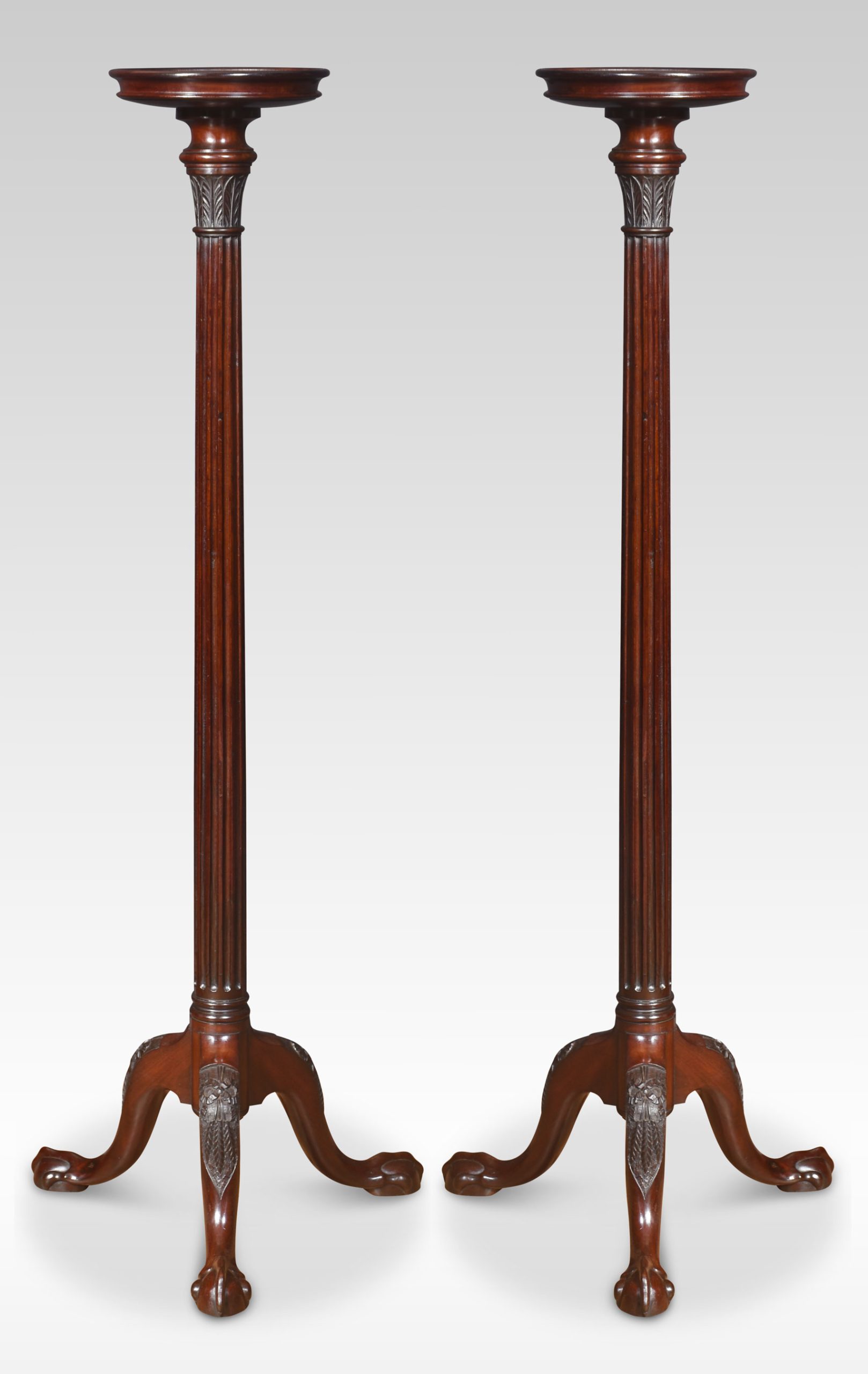 A pair of mahogany plant stands the circular tops above carved acanthus detail and reeded tapered column below, raised up on tripod base with cabriole legs and terminating in claw and ball feet.