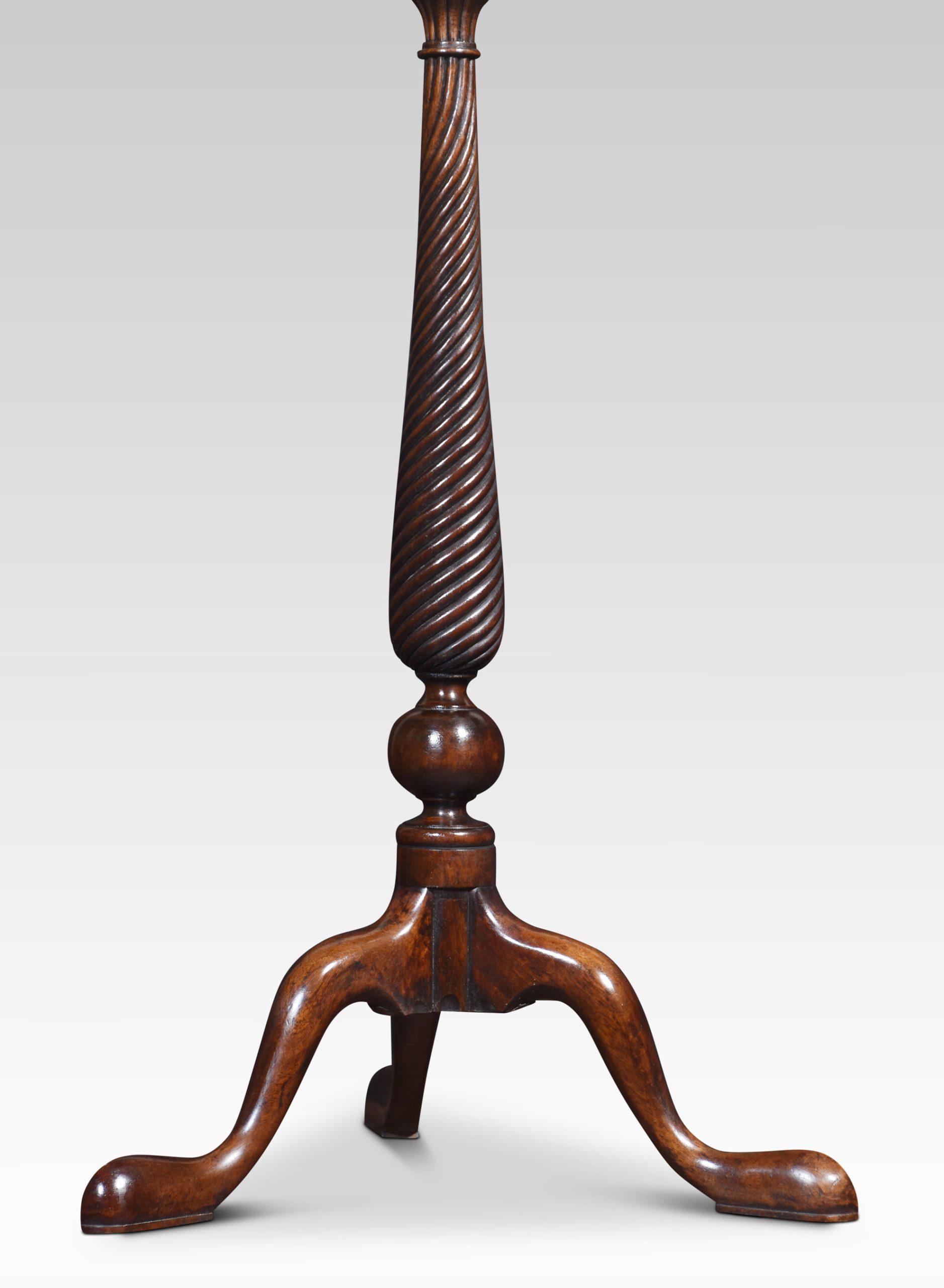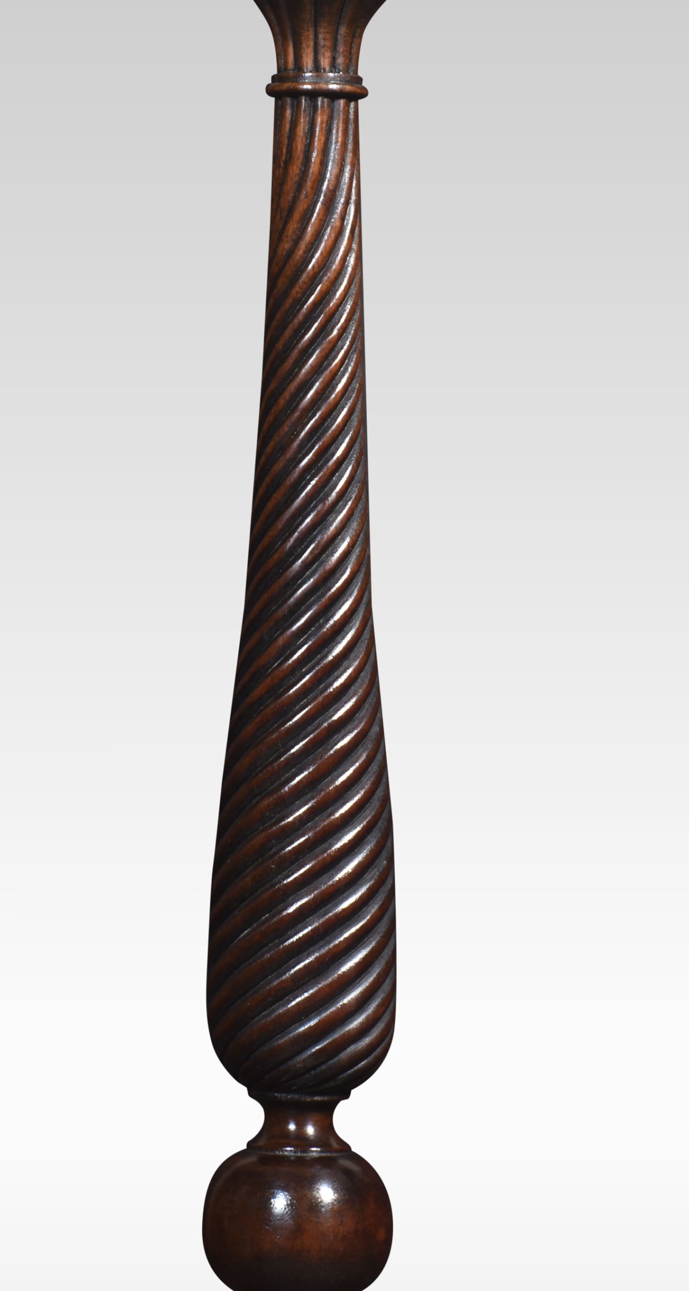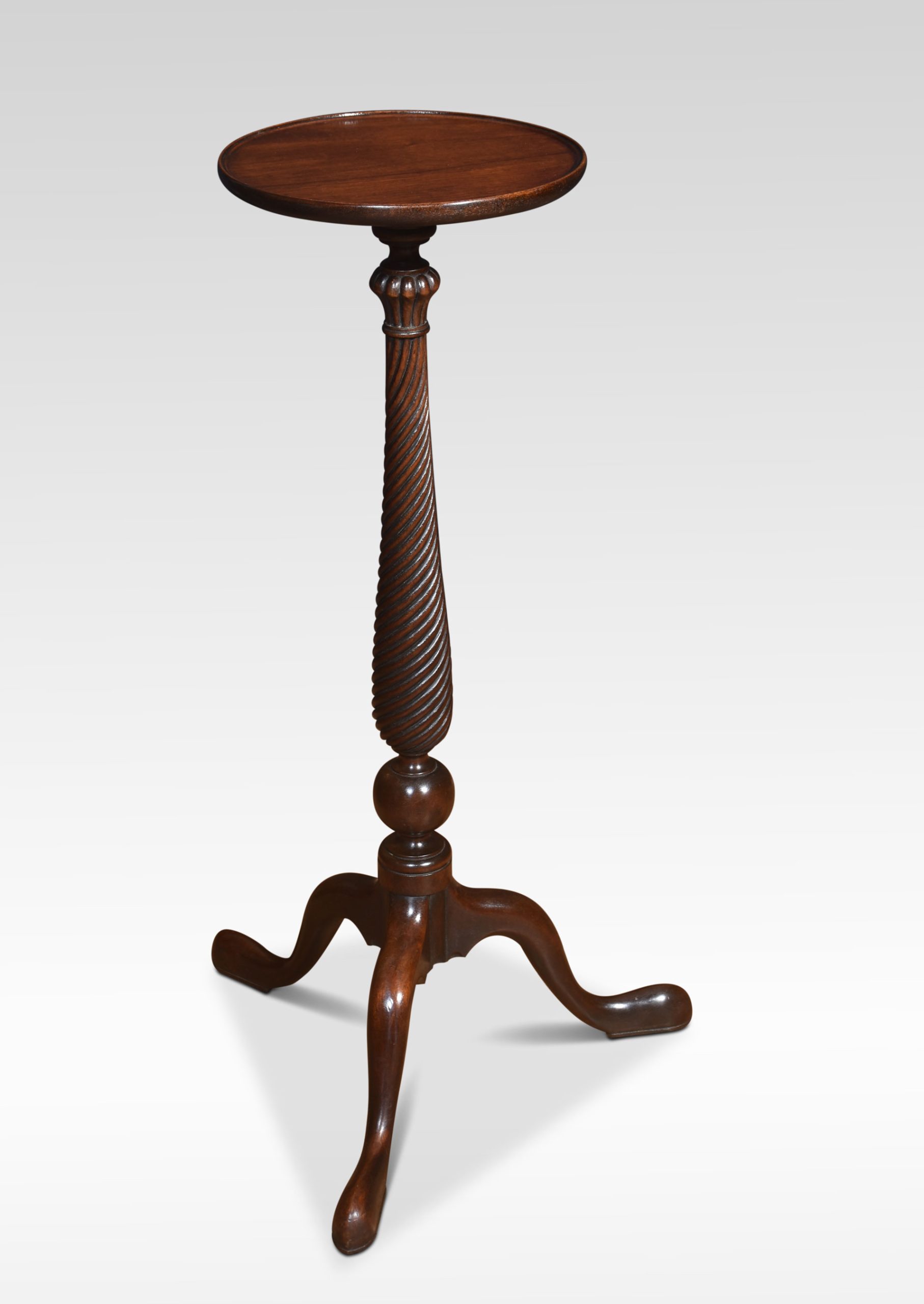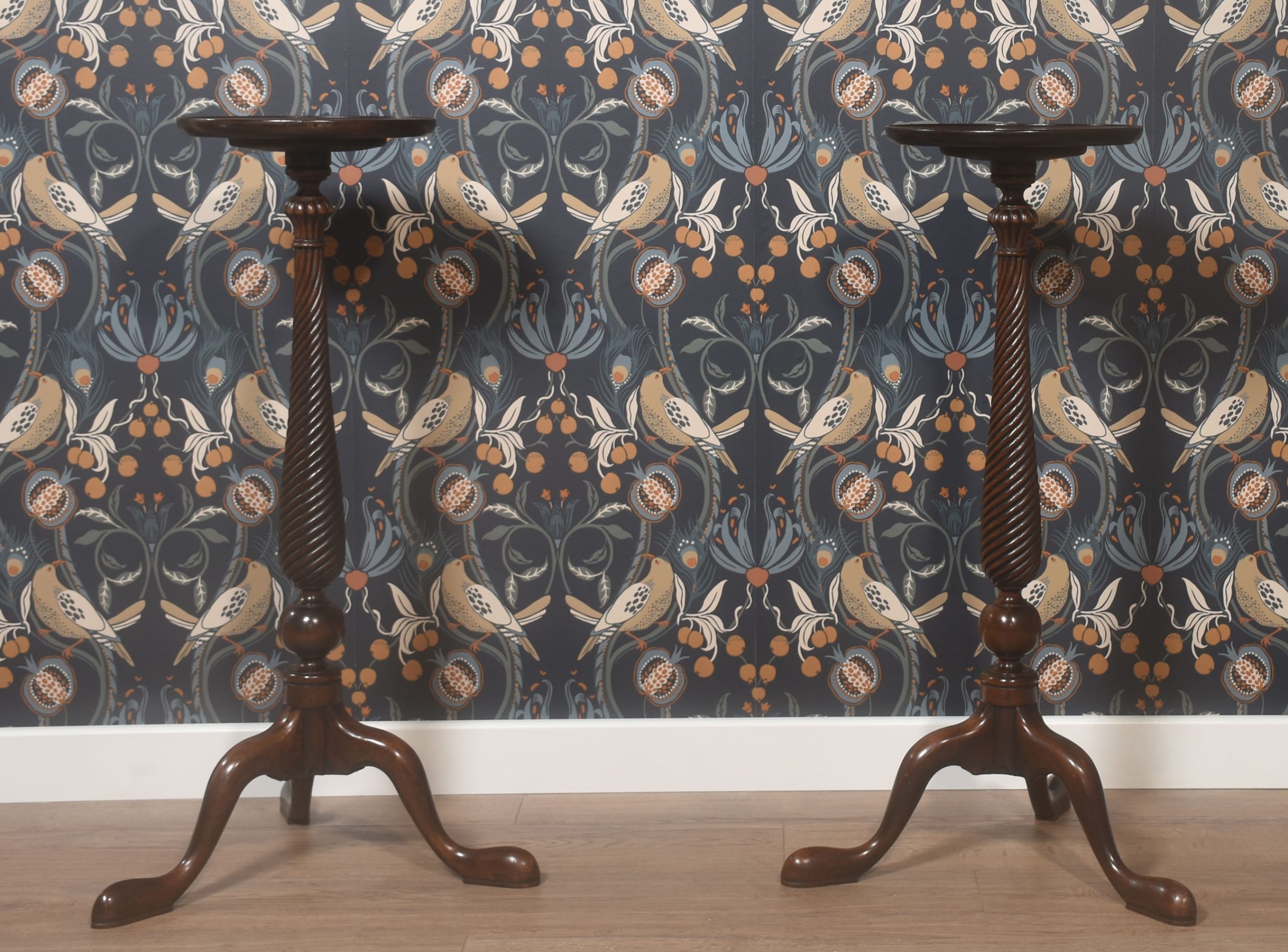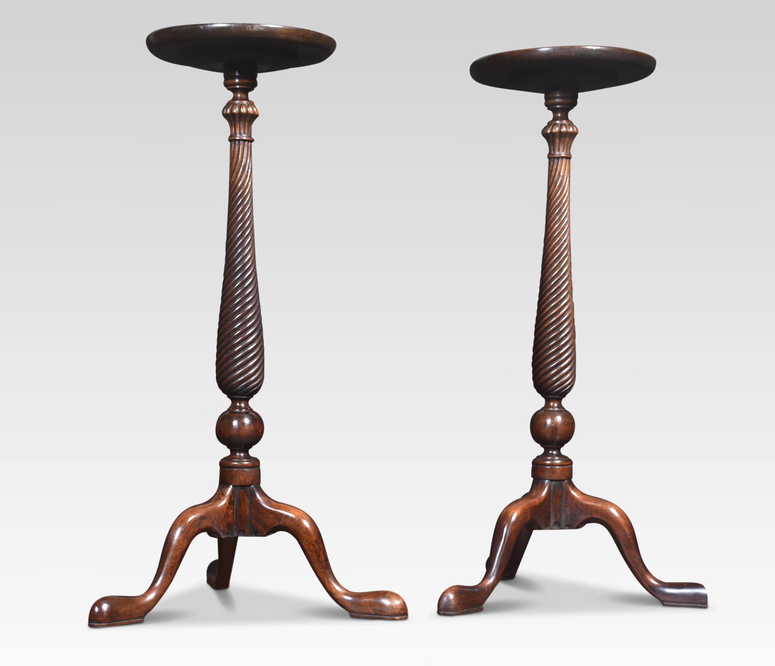 Pair of tall mahogany lamp tables, the circular tops above spiral carved columns, raised up on slender supports terminating in pad feet.