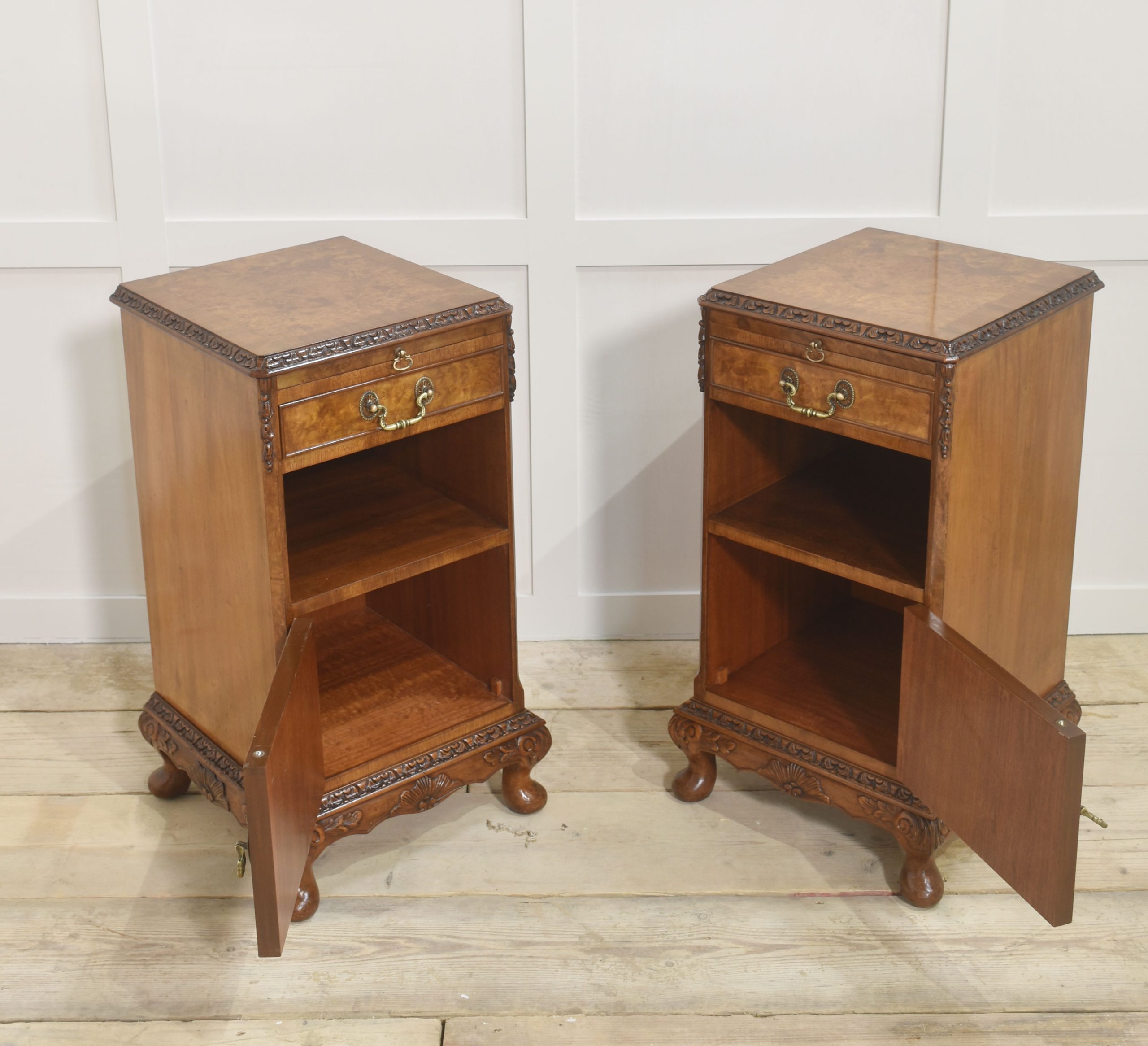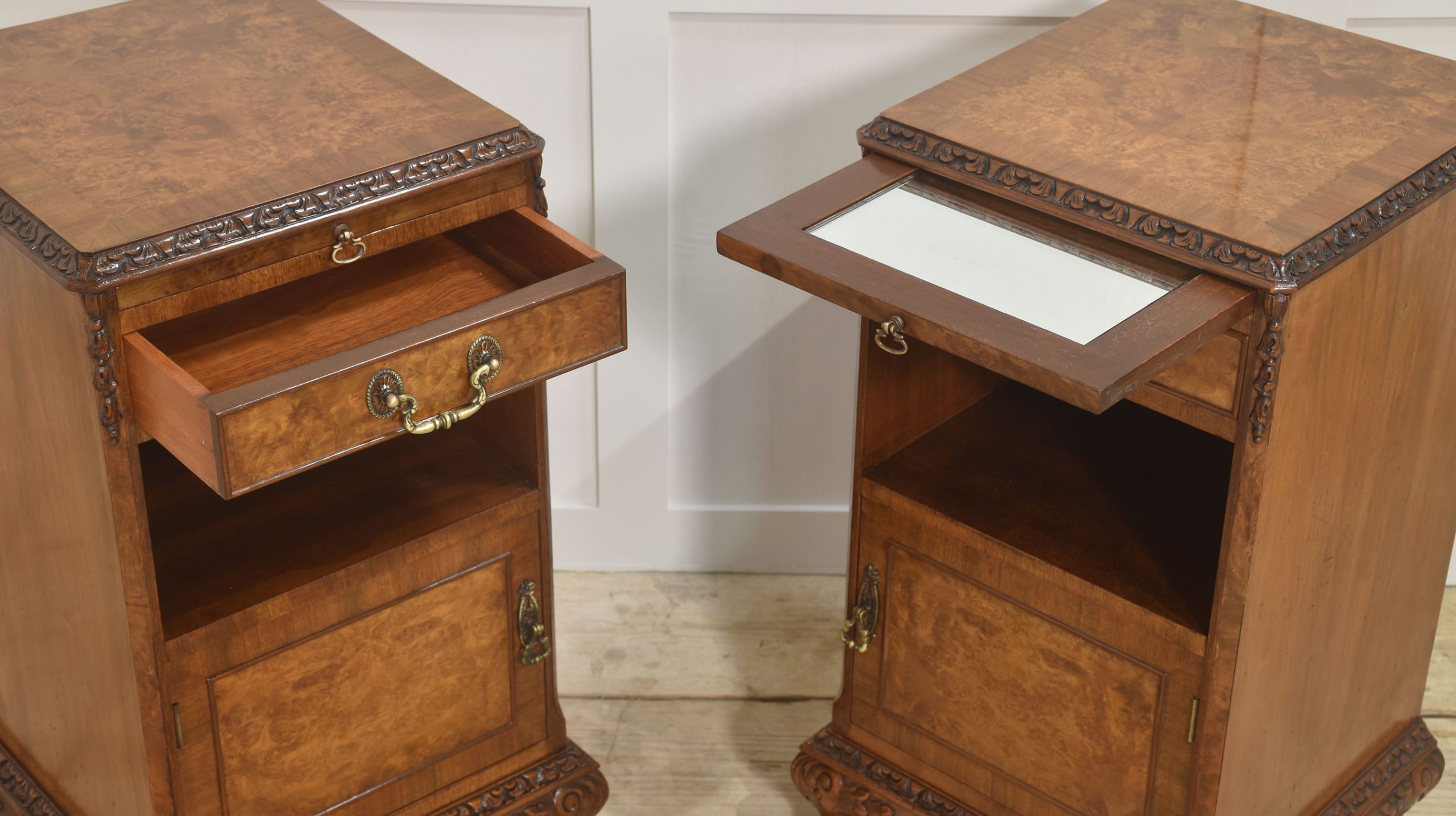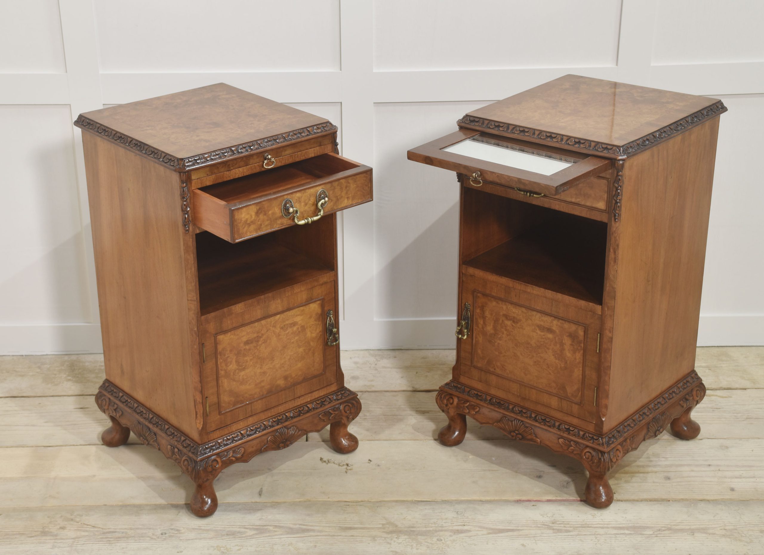 Pair of bedside cabinets, each having well-figured tops, to the carved moulded edge above pull-out mirrored slide and short drawer below. To the open recessed cupboard above a panelled door opening to reveal further storage space. All raised on short cabriole legs.