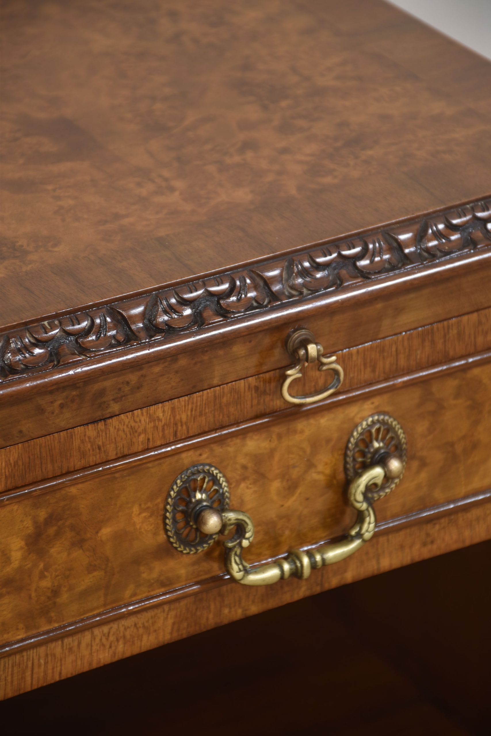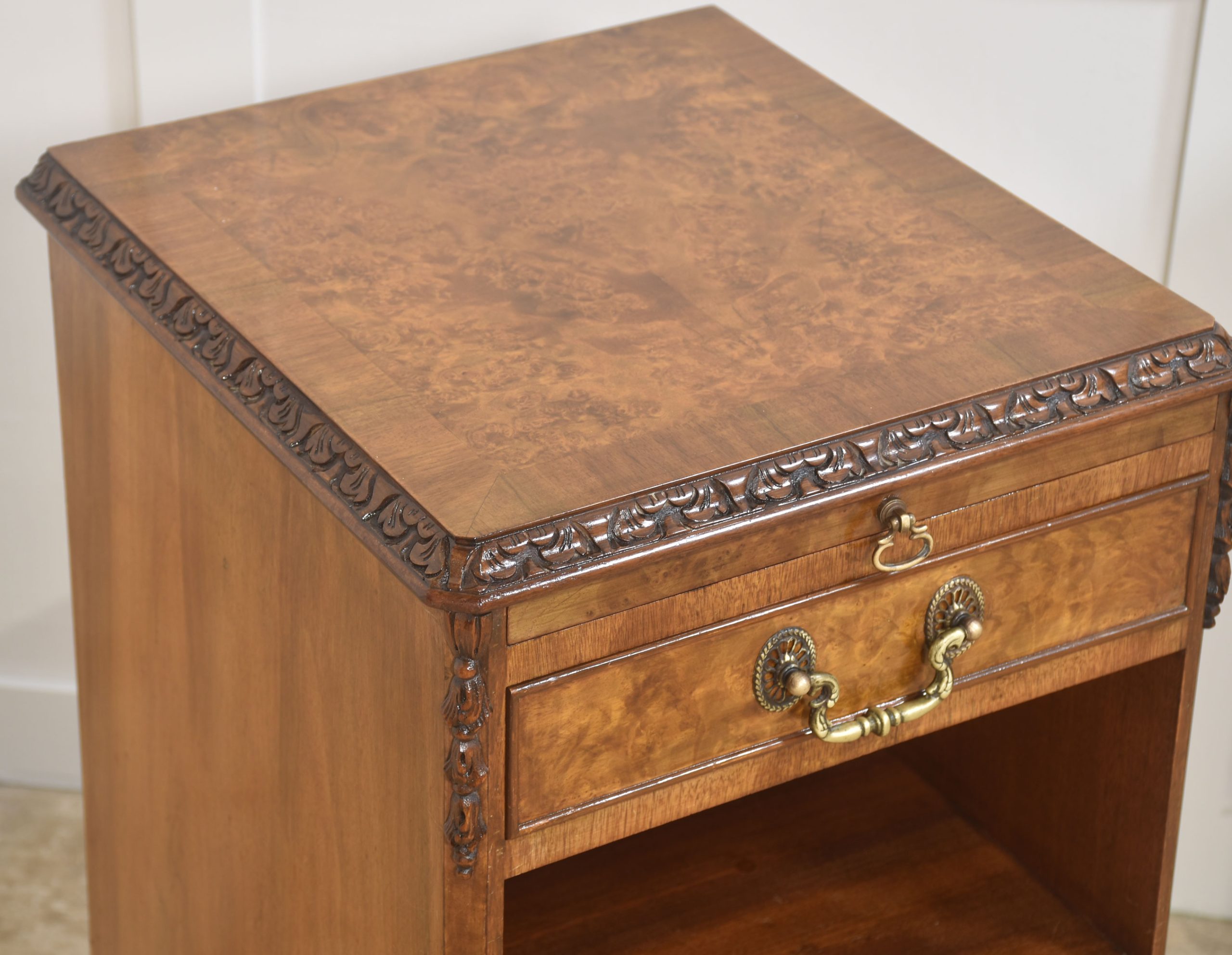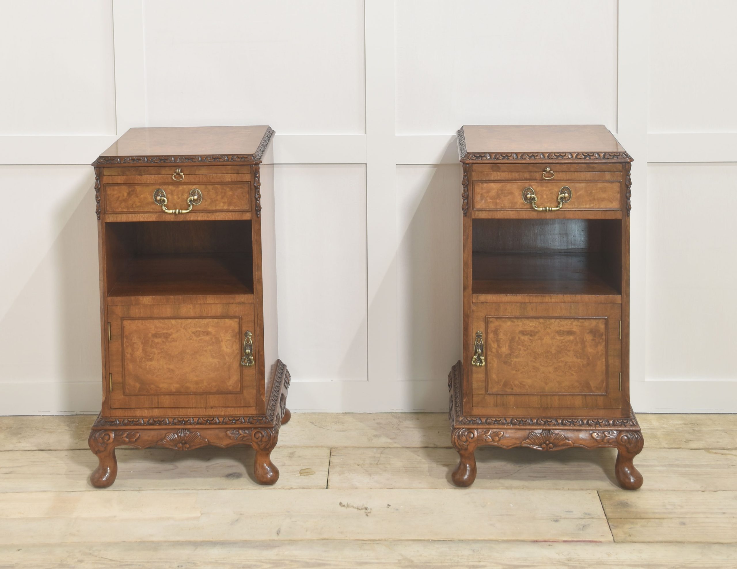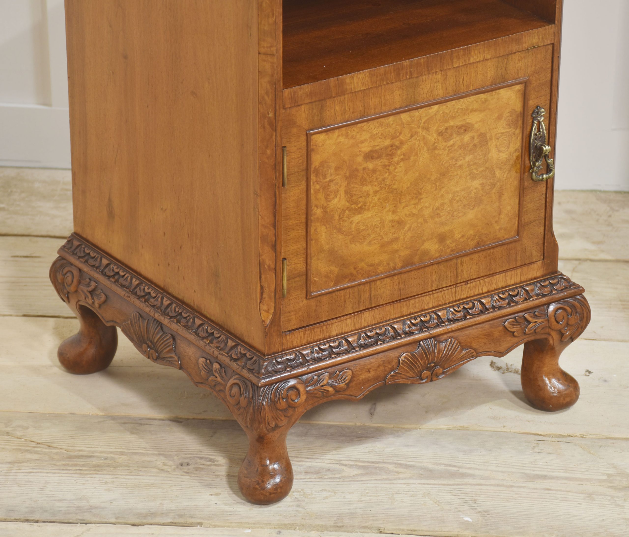 Pair of bedside cabinets, each having well-figured tops, to the carved moulded edge above pull-out mirrored slide and short drawer below. To the open recessed cupboard above a panelled door opening to reveal further storage space. All raised on short cabriole legs.