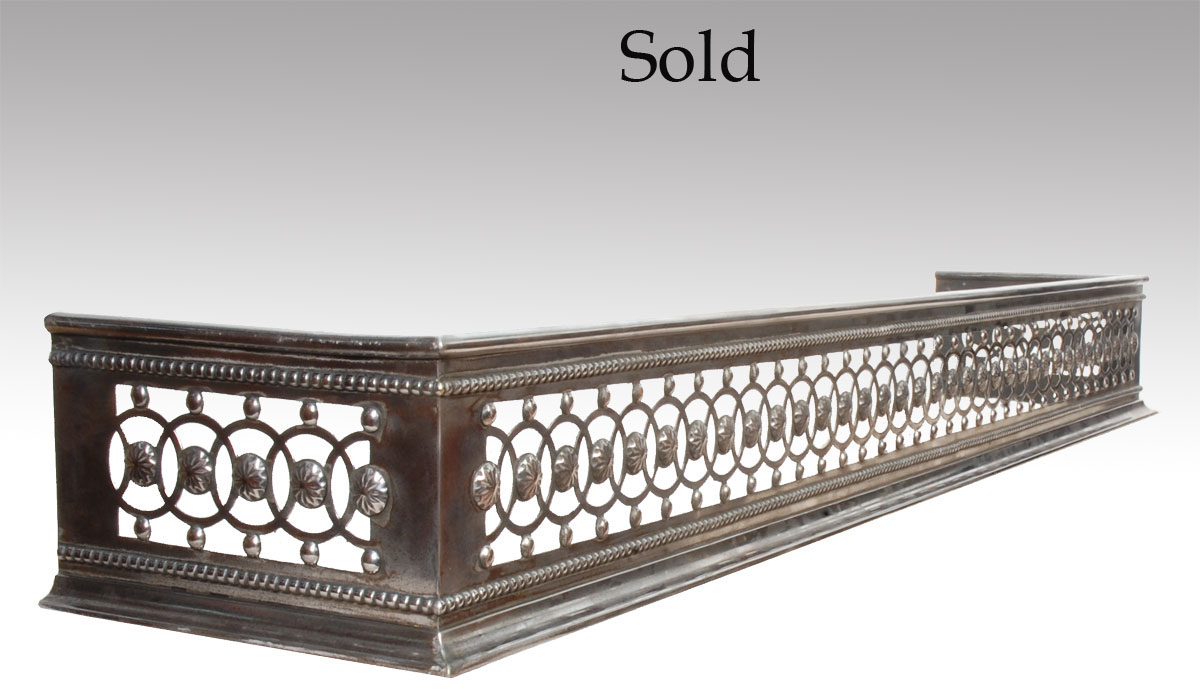 A regency Polished steel fender of rectangular form, pierced with bands of circles, set with formal bosses.