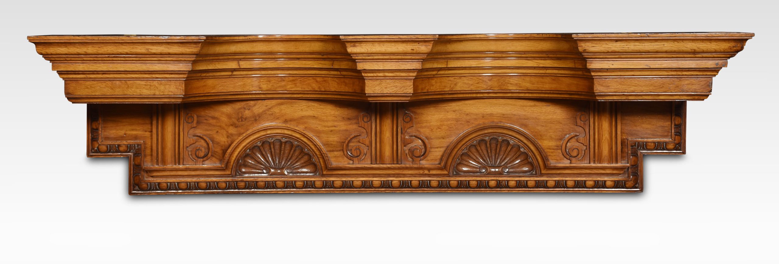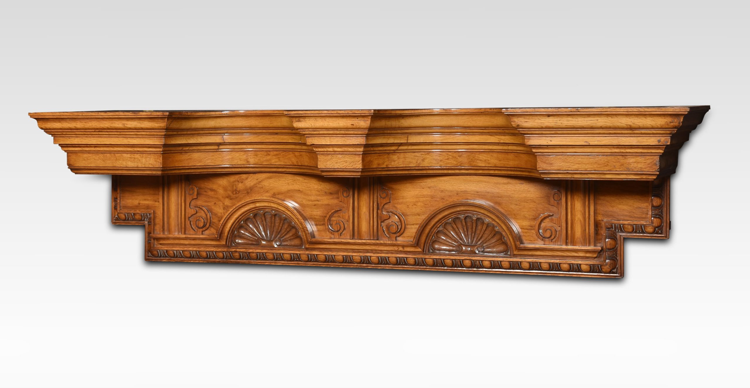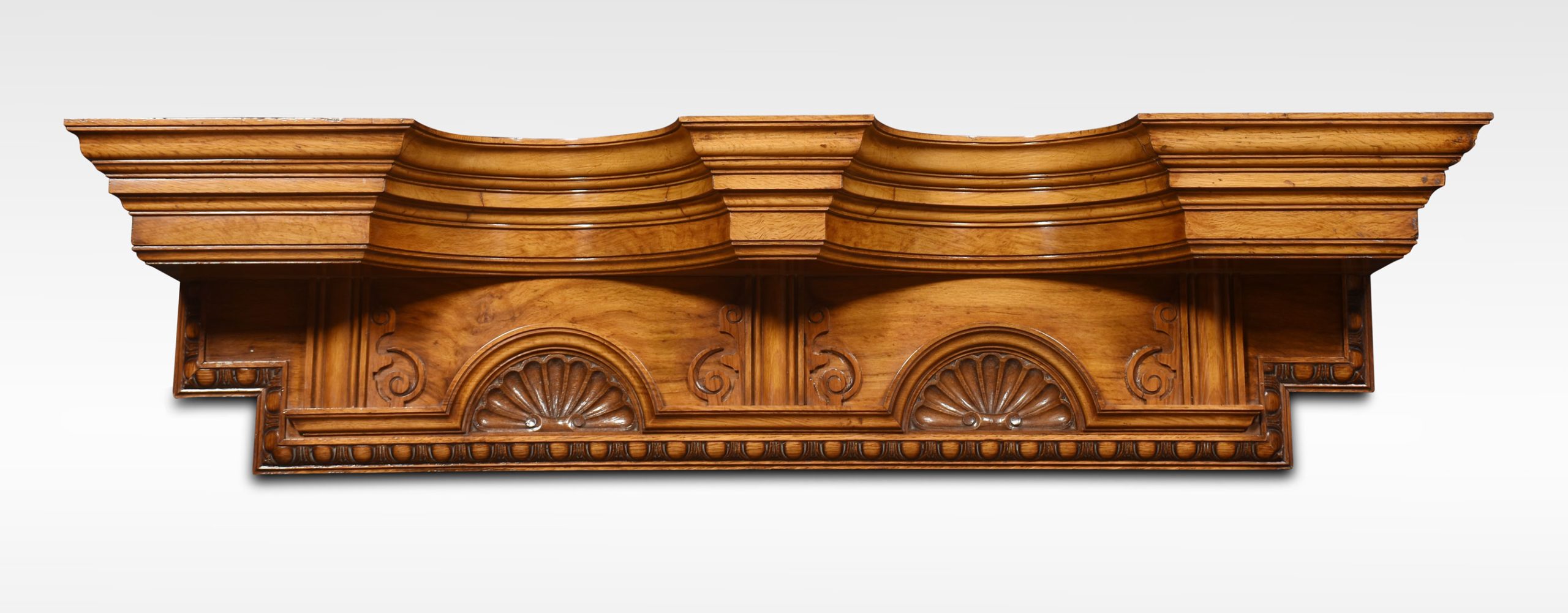 Pollard oak overdoor pediment the concaved top above shell carved cartouches flanked by scrolling decoration.