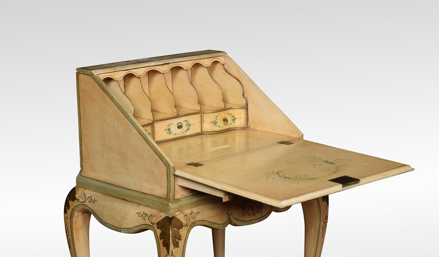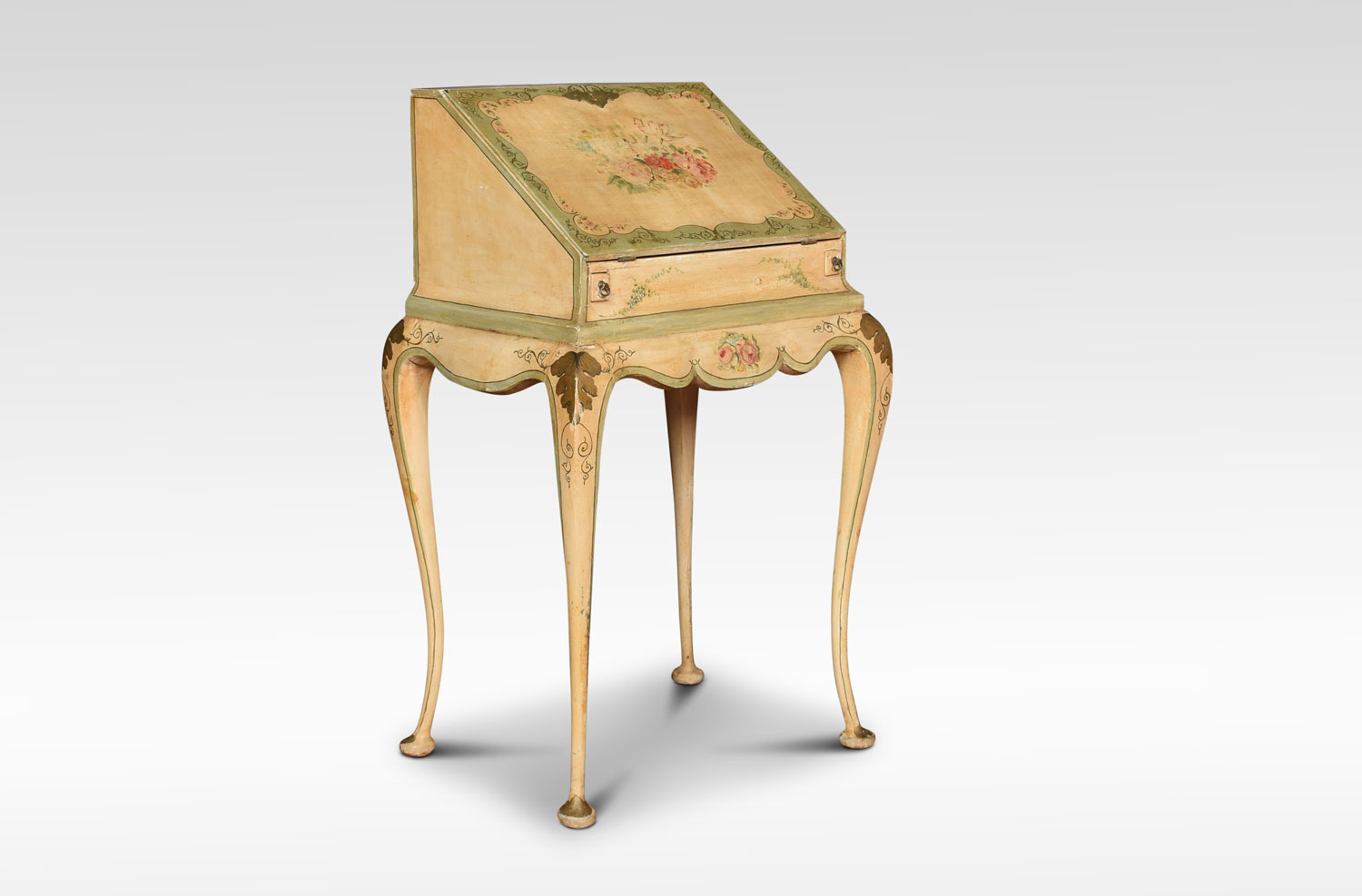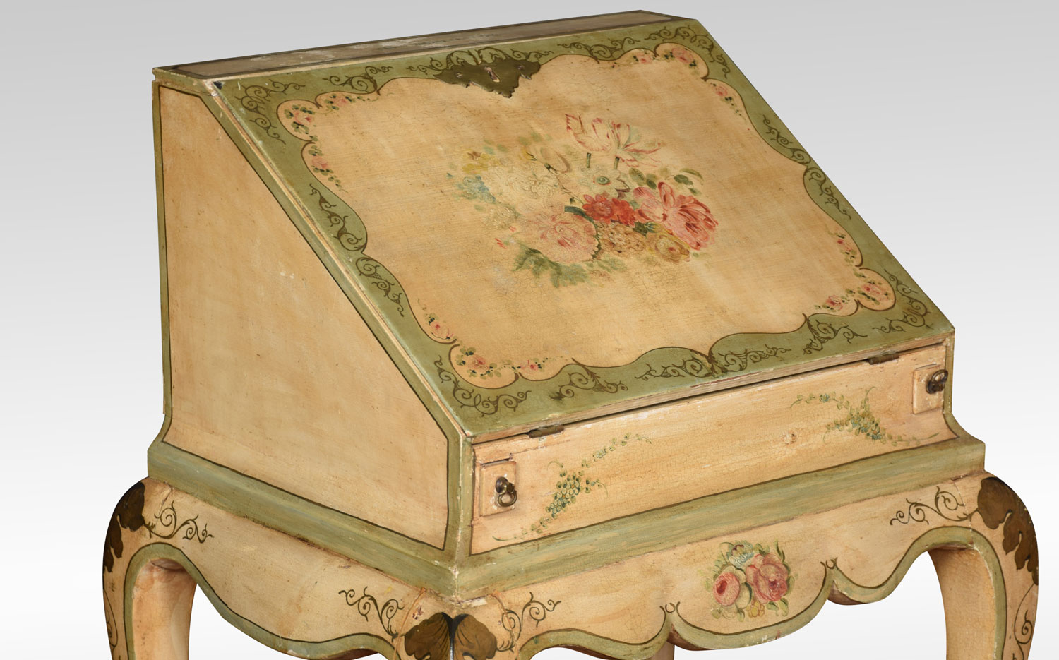 polychrome-decorated bureau of small proportions, in the Italian manner having a hinged fall enclosing pigeonholes and three short drawers behind a well with sliding cover. The flared shaped apron raised on four cabriole supports terminating in pad feet. Decorated all-over with floral sprays against a cream ground, with green borders.