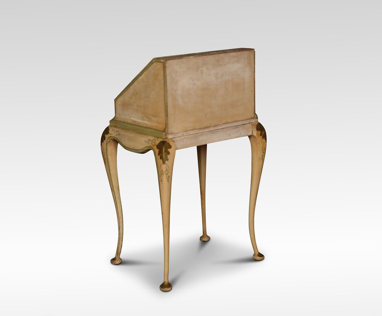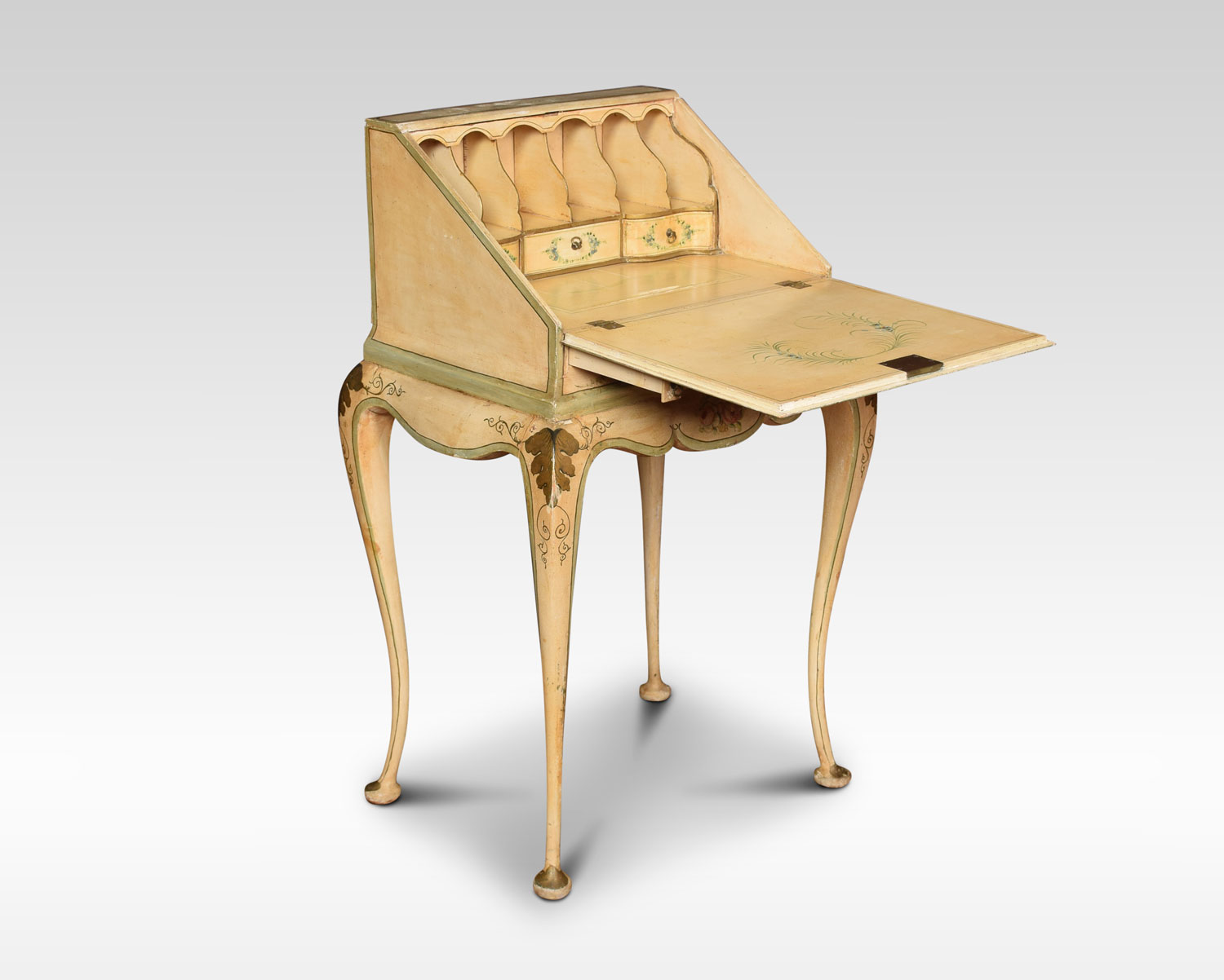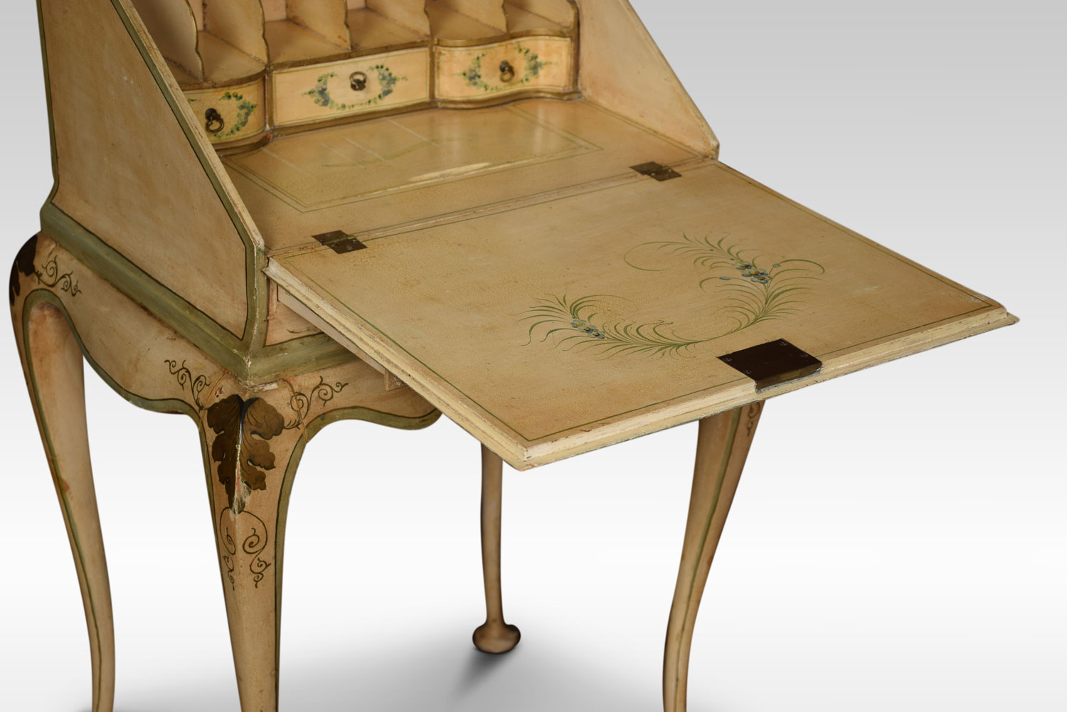 polychrome-decorated bureau of small proportions, in the Italian manner having a hinged fall enclosing pigeonholes and three short drawers behind a well with sliding cover. The flared shaped apron raised on four cabriole supports terminating in pad feet. Decorated all-over with floral sprays against a cream ground, with green borders.