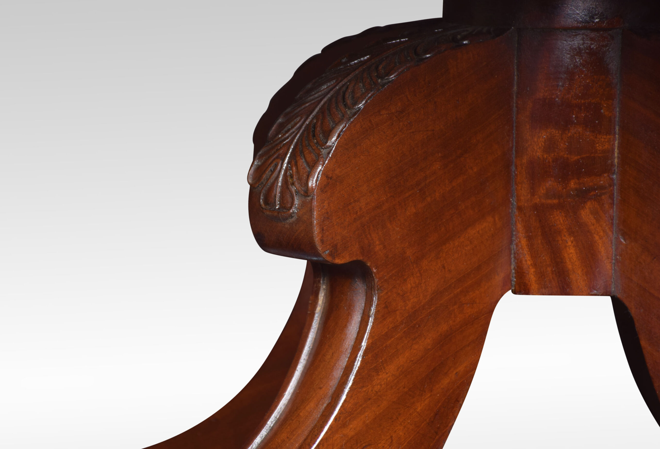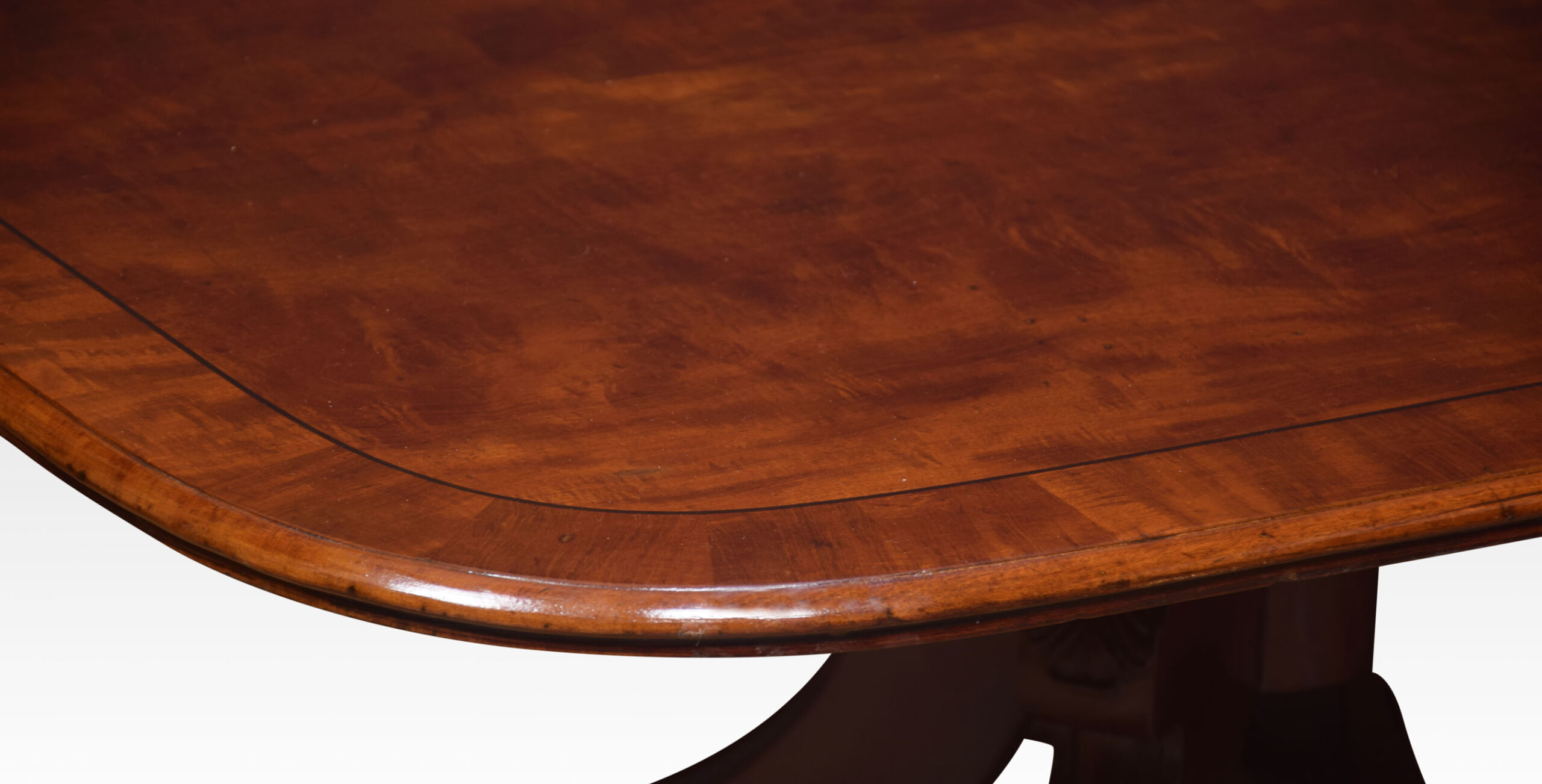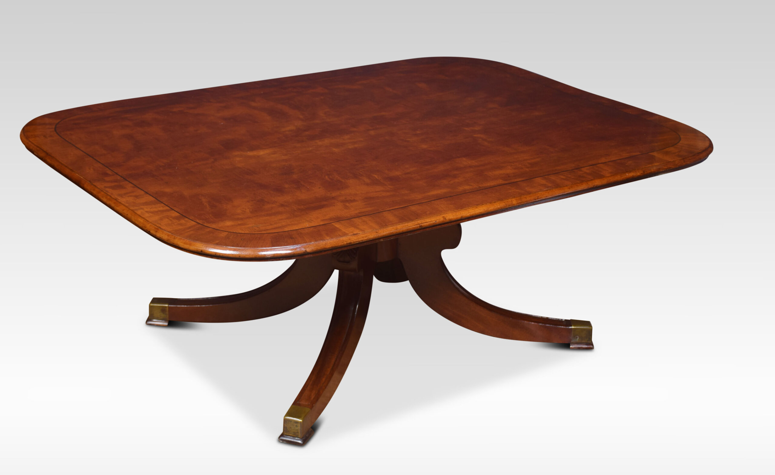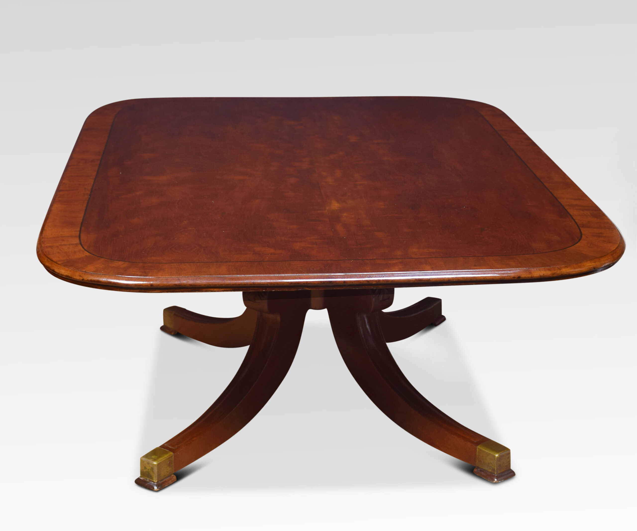 19th Century mahogany coffee table, the rectangular top and crossbanded edge enclosed by ebony stringing. Raised on a pedestal base and four outswept legs. This table has been reduced to coffee table height