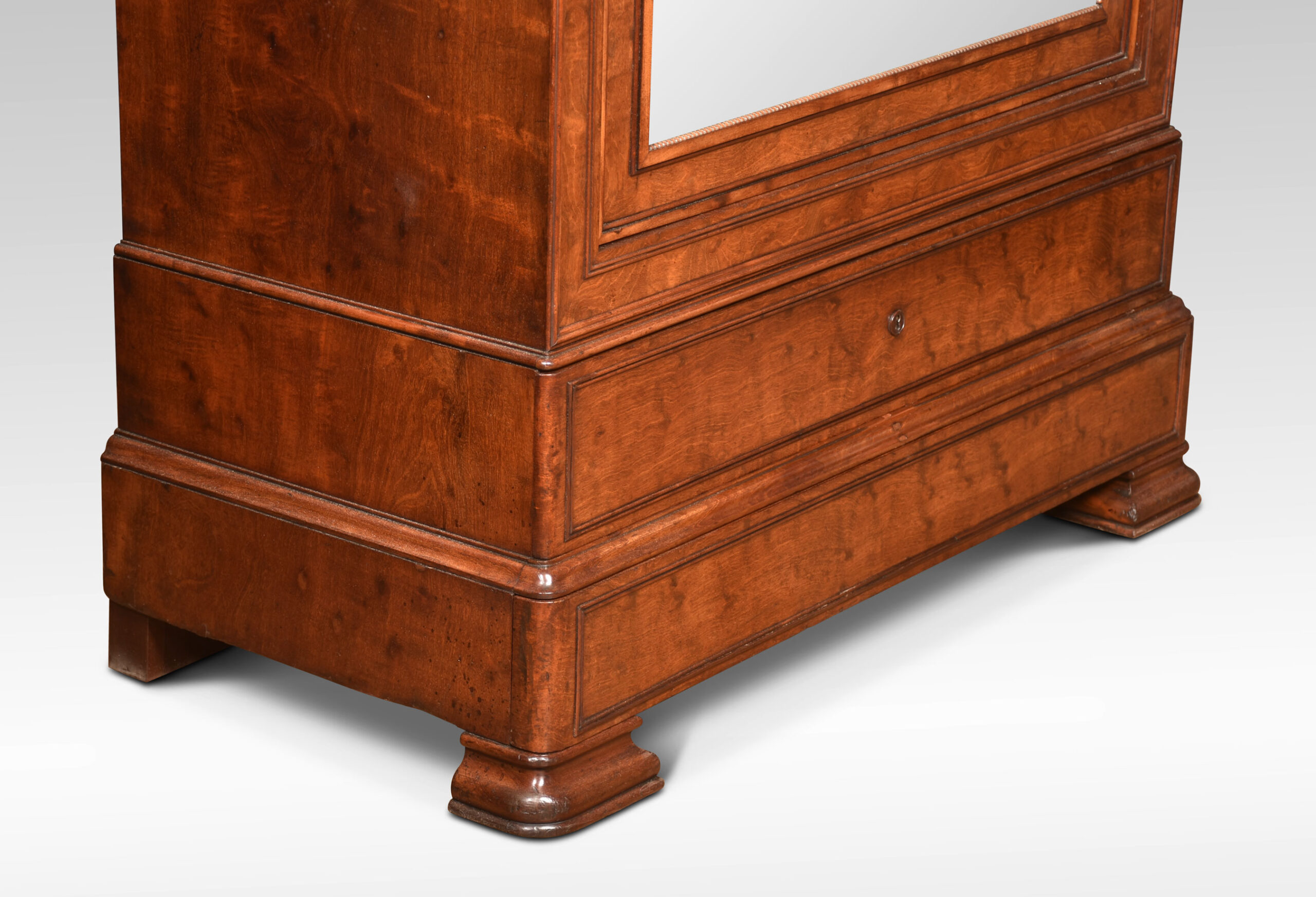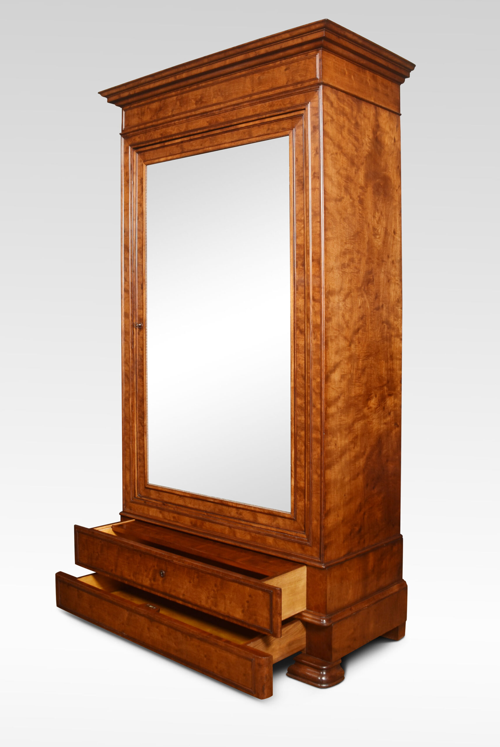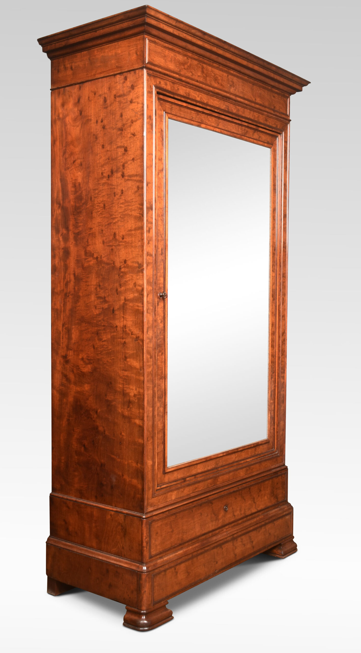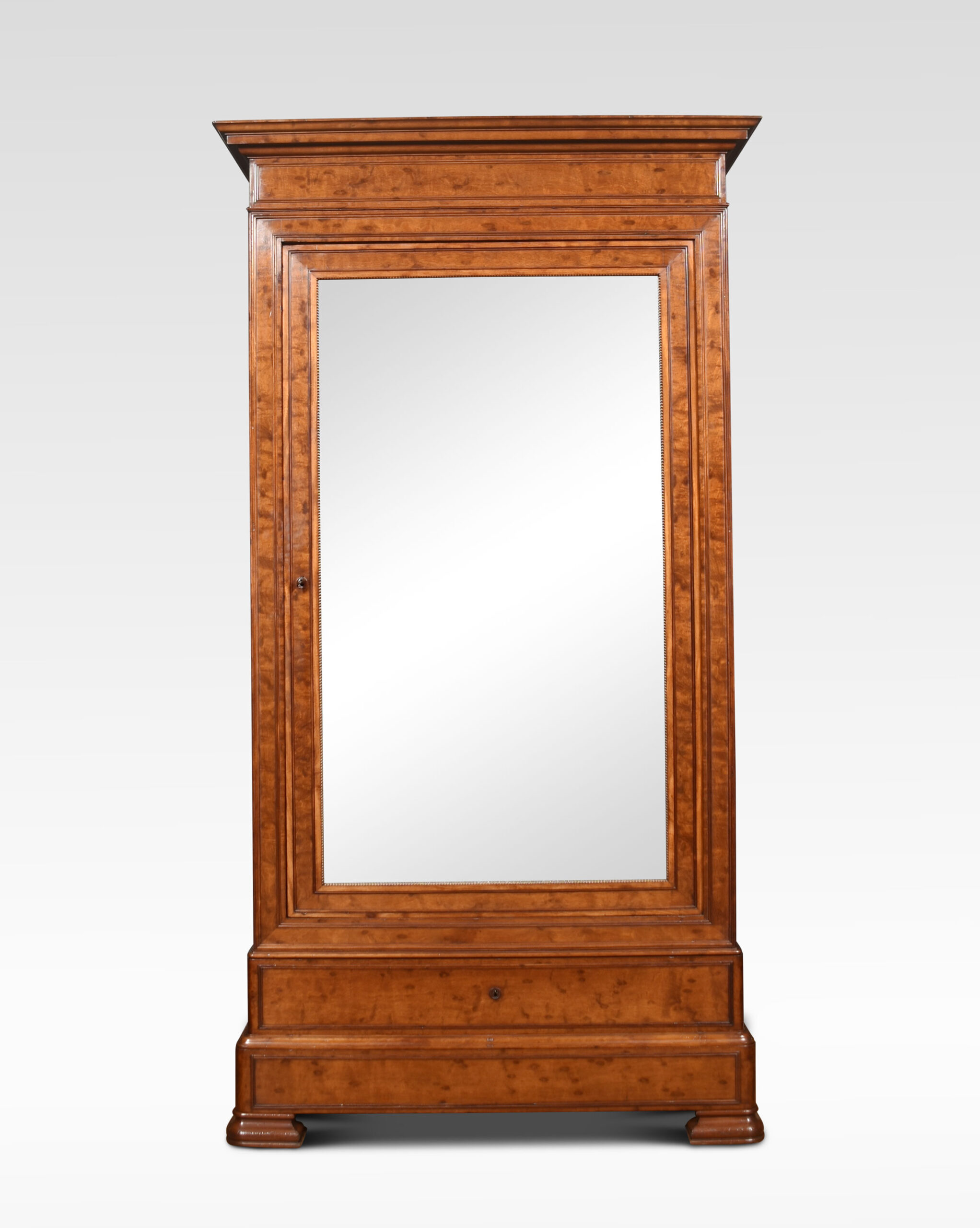 Mahogany gentleman’s wardrobe, the out-swept molded cornice above a large mirrored door enclosing a turned brass clothes hanging rail. Above one dressing drawer and further drawer below. All raised on steped feet.