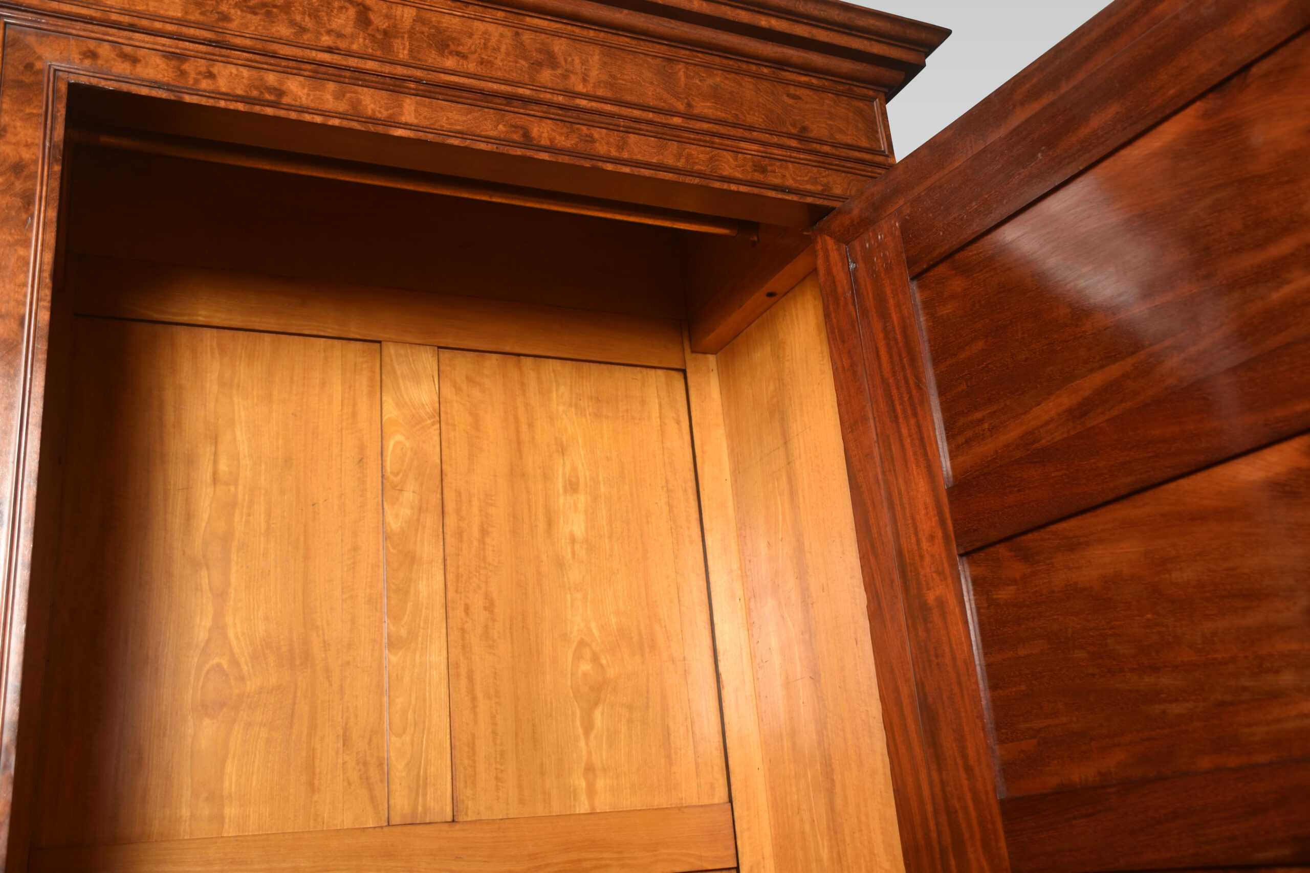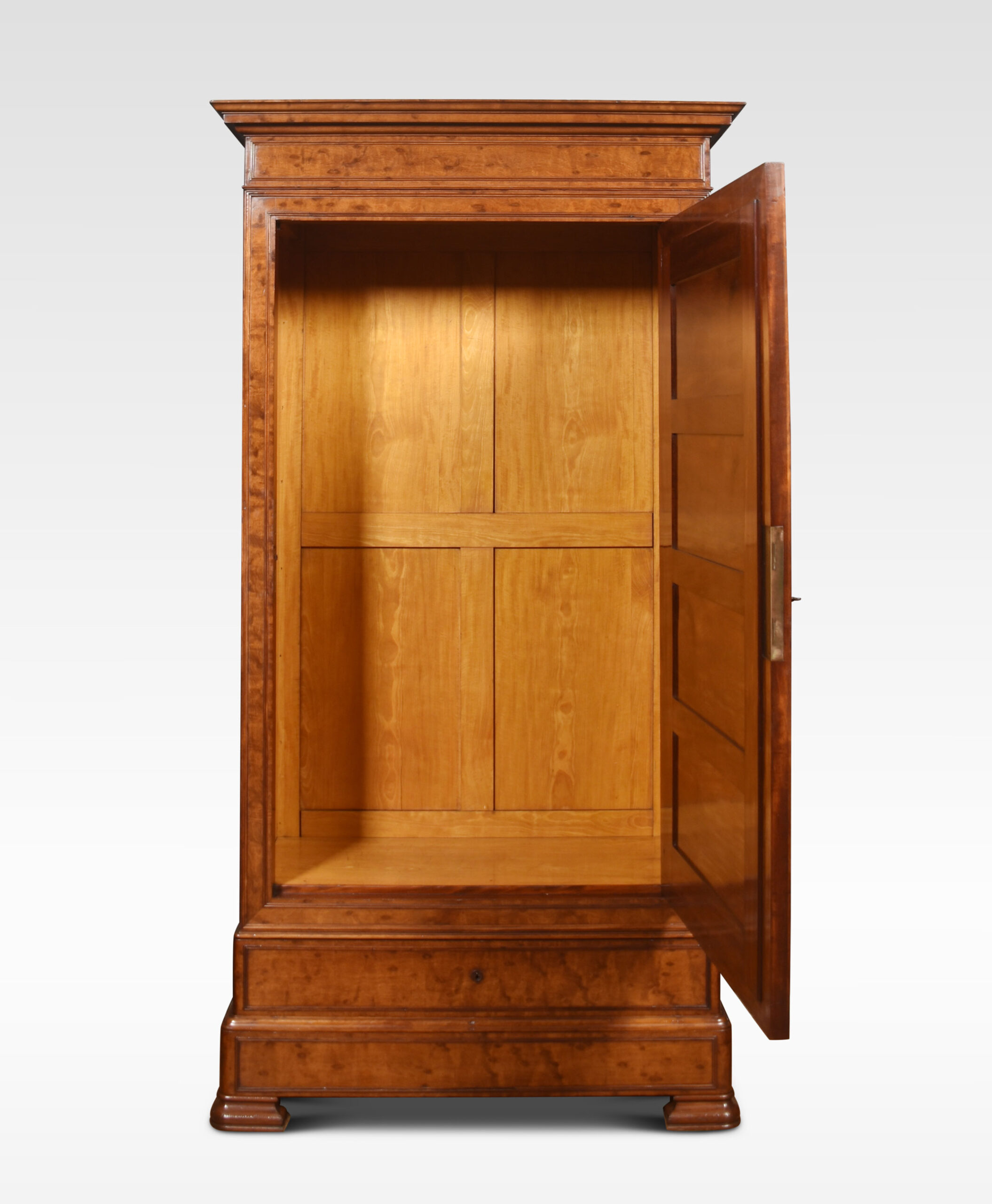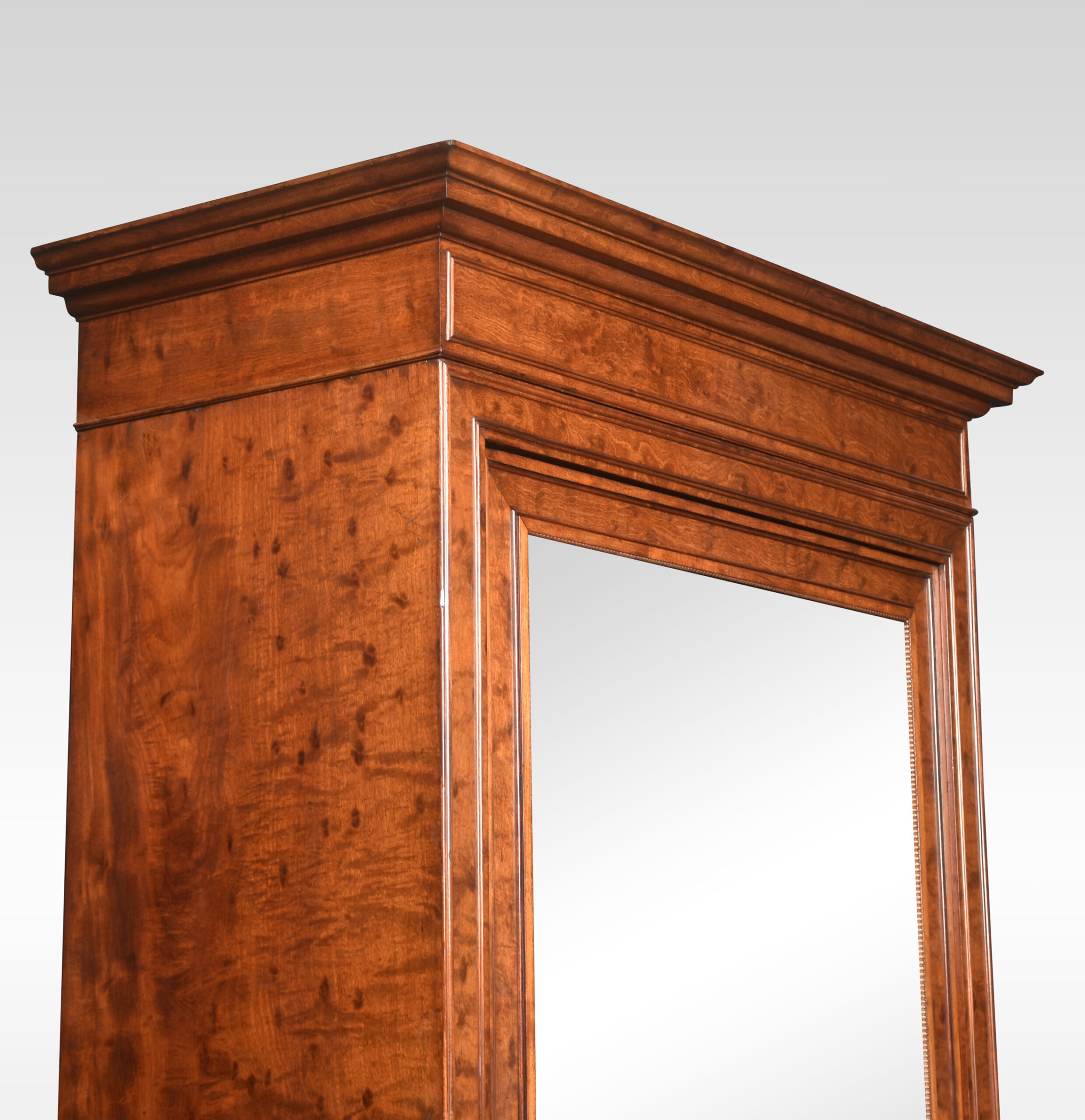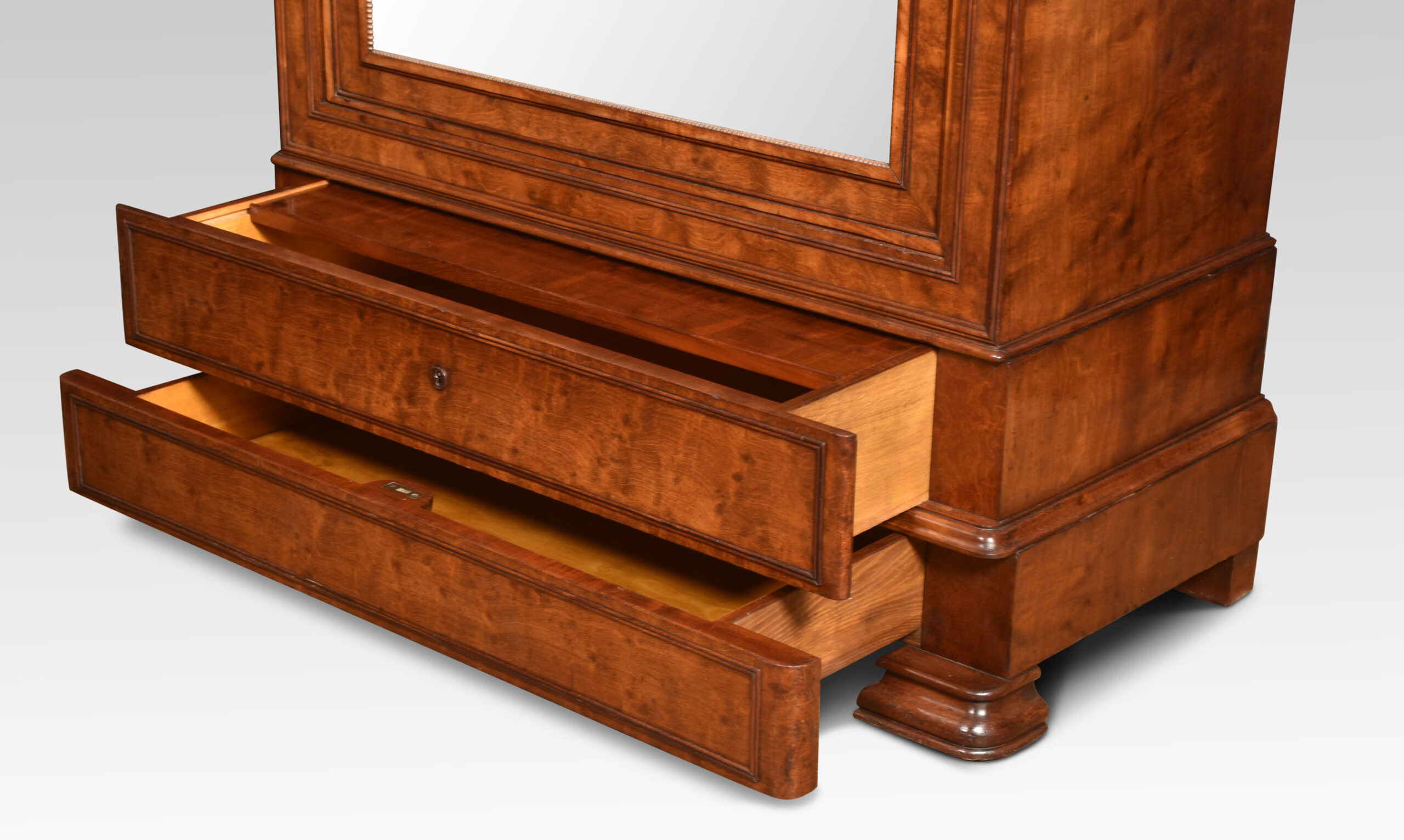 Mahogany gentleman’s wardrobe, the out-swept molded cornice above a large mirrored door enclosing a turned brass clothes hanging rail. Above one dressing drawer and further drawer below. All raised on steped feet.